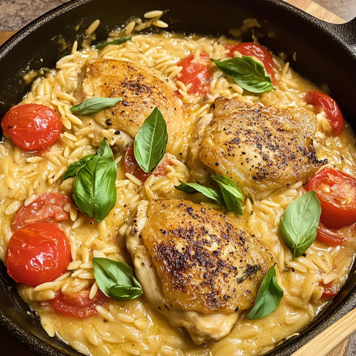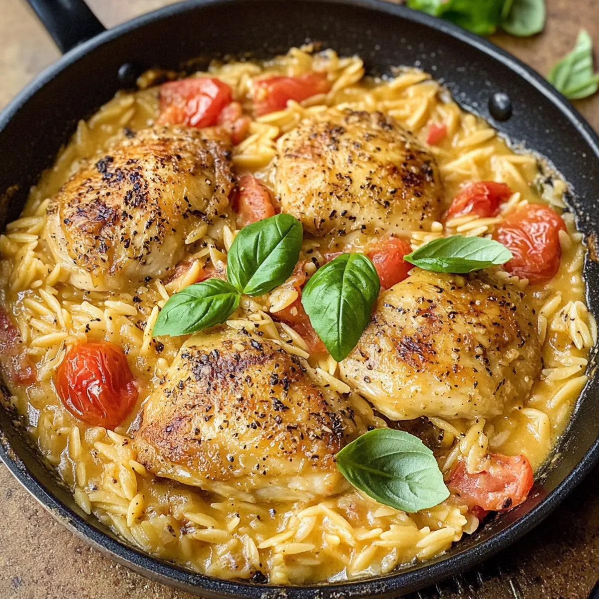 Wenn der Küchenwecker unbarmherzig tickt und sich die Hektik des Alltags bemerkbar macht, sehne ich mich nach einem Gericht, das schnell zubereitet werden kann, aber trotzdem das Gefühl von purem Wohlbefinden vermittelt. Genau das bietet mein 30 Minuten Ein-Pfannen-Hühnchen-Orzo mit Tomaten! Dieses köstliche Rezept vereint goldbraun gebratenes Hühnchen mit saftigen Tomaten und zartem Orzo in einer cremigen Sauce – alles wird in einer einzigen Pfanne zubereitet. Ideal für hektische Wochentage, lässt sich dieses schnelle Abendessen nicht nur wunderbar vorbereiten, sondern macht auch eine elegante Figur beim Abendessen mit Freunden. Wer könnte da schon widerstehen? Neugierig auf die Einfachheit und den Geschmack dieses Gerichts? Lass uns gemeinsam kochen!