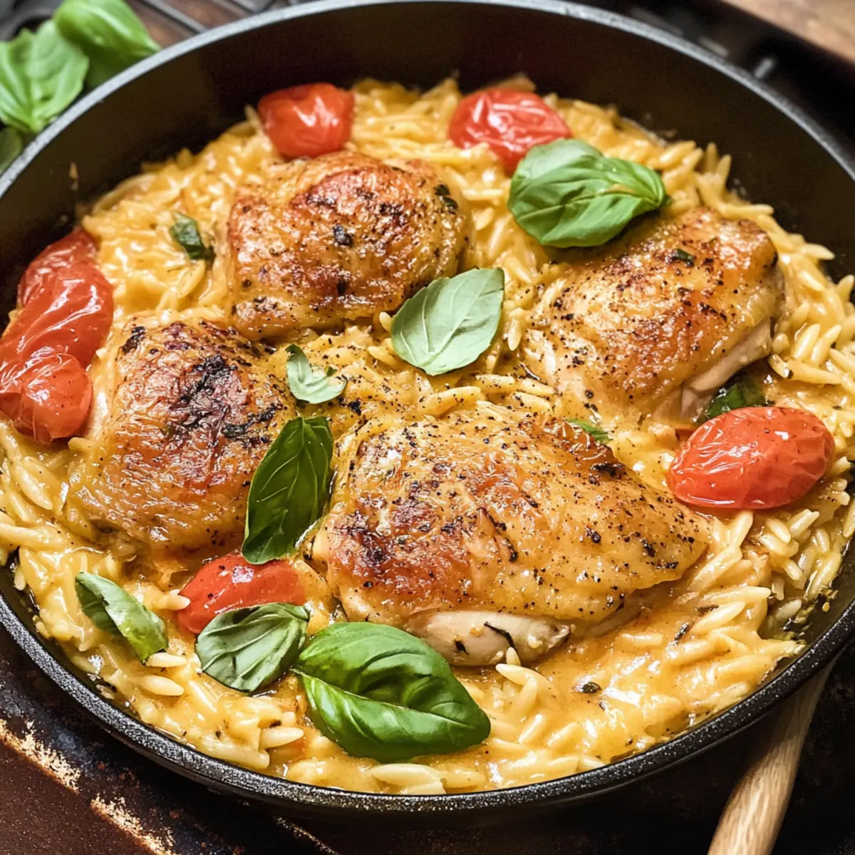 5. Lege die angebratenen Hühnchenschenkel mit der Hautseite nach oben wieder in die Pfanne. Decke die Pfanne ab und lasse das Gericht 18–22 Minuten kochen, wobei du gelegentlich umrührst, bis das Orzo zart ist und das Hühnchen eine innere Temperatur von 75°C erreicht hat.