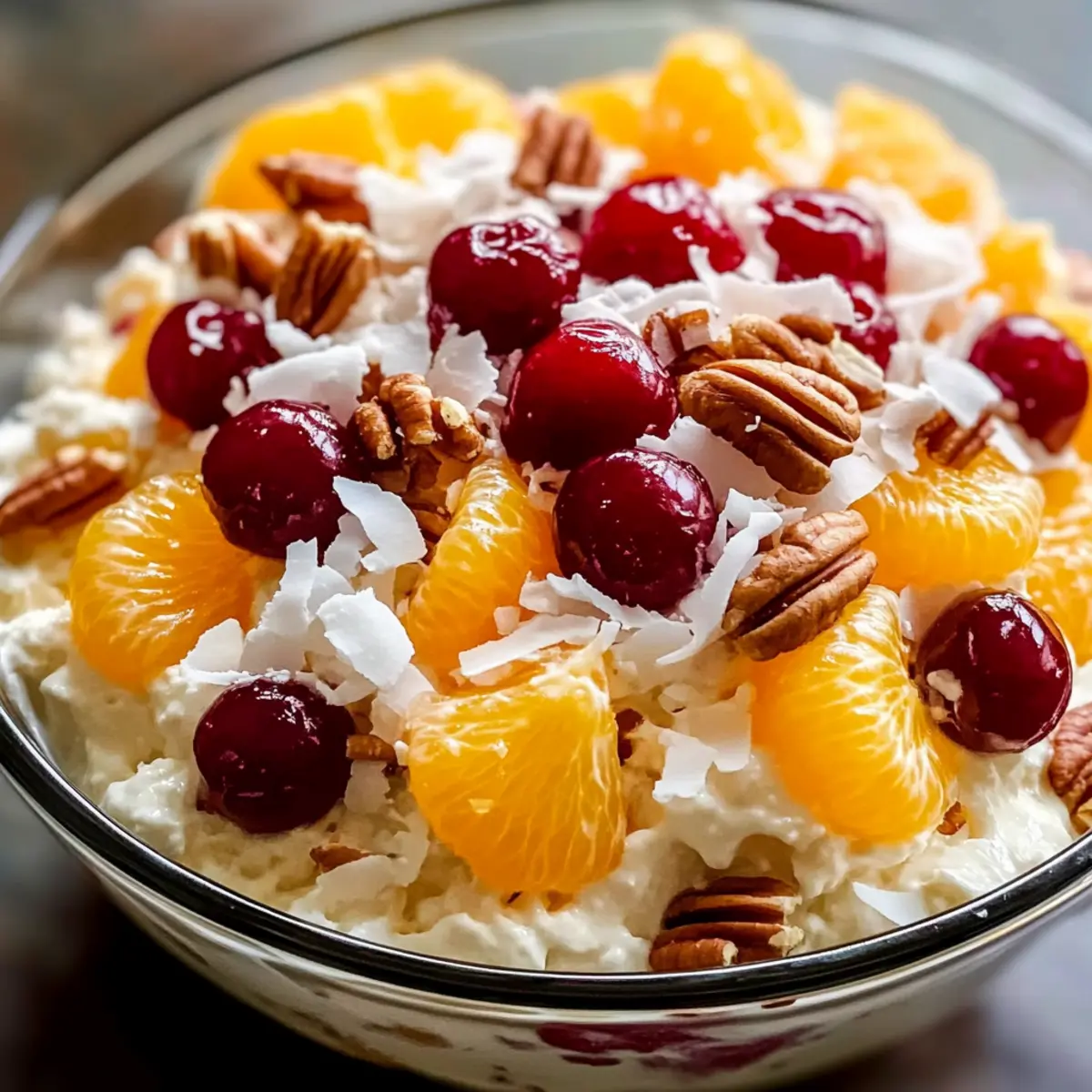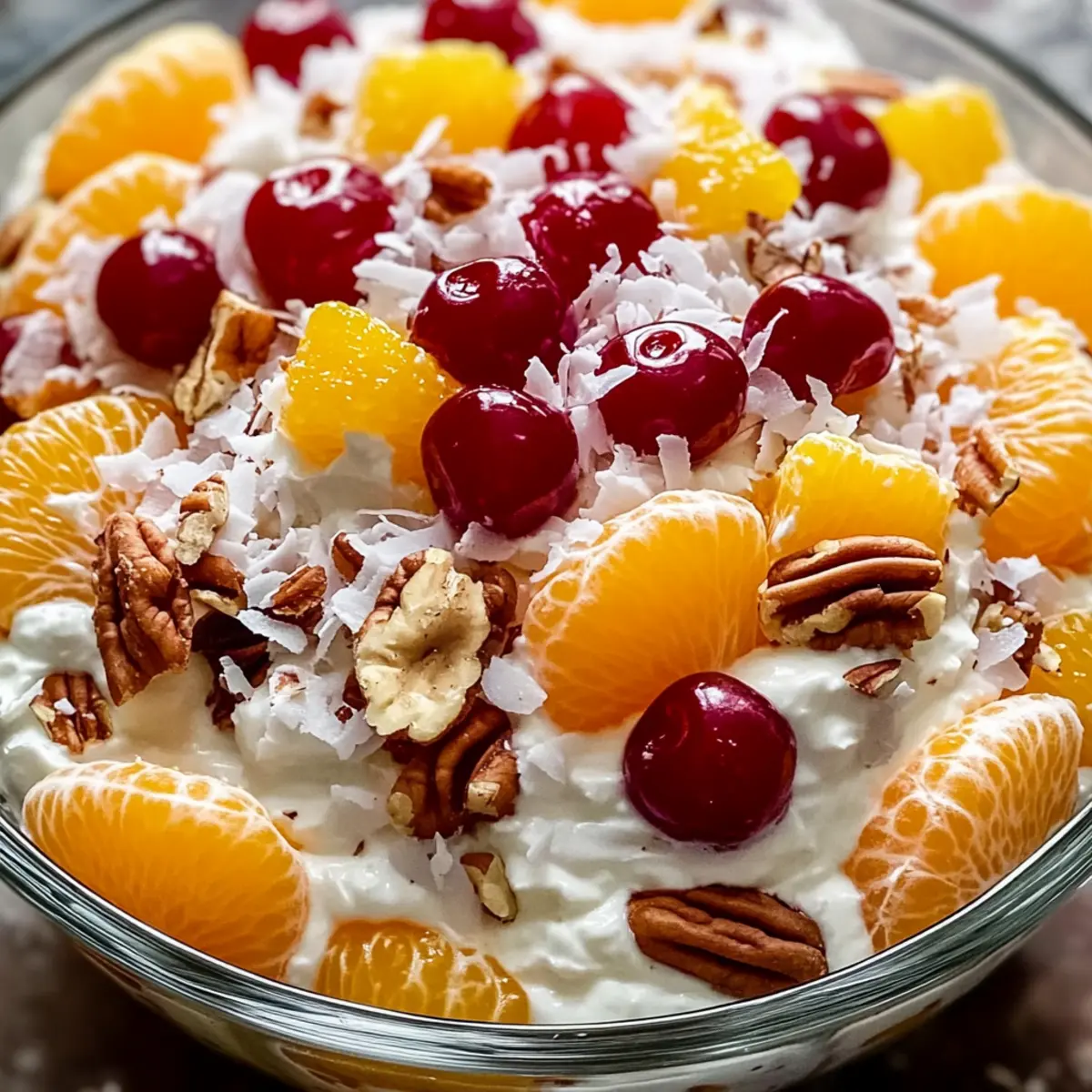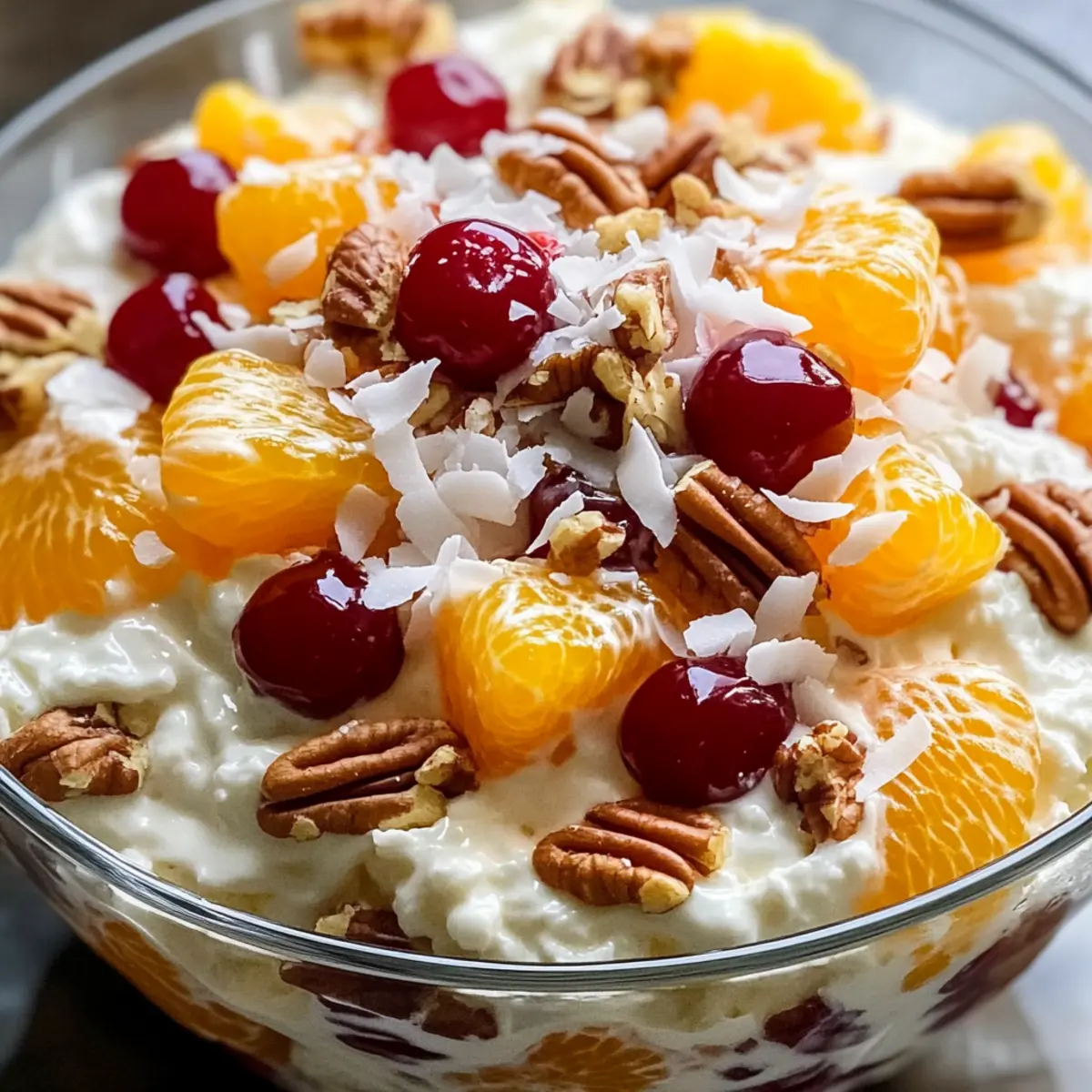 Als ich neulich auf einer sommerlichen Gartenparty stand, kam mir der verführerische Duft von frisch zubereitetem Ambrosia Salat entgegen. Diese pfiffige Mischung aus fruchtigen Mandarinen, einem Hauch von Ananas und einer cremigen Basis ist nicht nur ein wahrer Genuss für die Sinne – mein Ambrosia Salat Rezept ist auch unglaublich einfach zuzubereiten! Kein Kochen nötig, und dennoch bringt es den perfekten Komfort auf den Tisch, ideal für den nächsten Grillabend oder als süßer Abschluss eines festlichen Essens. Vielseitig veränderbar, kann man die Zutaten nach Lust und Laune anpassen, was diesen Salat zu einem echten Publikumsmagneten macht. Ich frage mich, welche Variante du ausprobieren wirst? Warum ist dieser Ambrosia Salat so besonders? Einfachheit: Die Zubereitung ist kinderleicht und benötigt keine Kochkünste, sodass jeder im Handumdrehen diesen köstlichen Salat zaubern kann. Fruchtige Frische: Mit saftigen Mandarinen und süßen Ananasstücken bringt dieser Salat eine erfrischende Note auf den Tisch, die jedem Gericht den letzten Schliff verleiht. Kreative Anpassungsmöglichkeiten: Ob vegan oder mit extra Nüssen, du kannst das Rezept ganz nach deinem Geschmack gestalten und sogar nach Belieben variieren. Perfekte Konsistenz: Die Kombination aus cremiger Joghurtbasis und knackigen Früchten sorgt für ein harmonisches Geschmackserlebnis, das förmlich auf der Zunge zergeht. Publikumsmagnet: Egal ob Gartenparty oder festliches Essen, dieser Ambrosia Salat ist immer ein Hit und zieht alle Blicke auf sich! Ambrosia Salat Zutaten • Entdecke die frischen und köstlichen Zutaten für deinen Ambrosia Salat! Für den Salat Mandarinen – sorgen für eine süße und saftige Note, perfekt um den Salat aufzupeppen. Ananasstücke – bringen tropische Frische; frische Ananas ist ein toller Ersatz, wenn vorhanden. Mini-Marshmallows – fügen eine süße, weiche Textur hinzu, können aber für eine leichtere Variante weggelassen werden. Kokosraspeln – sorgen für einen herrlich chewy Biss; ersetze sie durch gehackte Nüsse für zusätzlichen Crunch. Für die cremige Basis Saure Sahne – verleiht eine schöne, tangige Cremigkeit; kann durch griechischen Joghurt für eine leichtere Version ersetzt werden. Joghurt – sorgt für eine frische, cremige Konsistenz und bietet eine großartige Möglichkeit, das Rezept anzupassen. Vanilleextrakt – gibt dem Salat eine wunderbare, aromatische Tiefe, die die Frucht noch besser zur Geltung bringt. Für die Garnitur (optional) Gehackte Nüsse – fügen einen nussigen Crunch hinzu; können weggelassen oder durch Mandeln ersetzt werden, falls Allergien bestehen. Entdecke die verschiedenen Möglichkeiten, deinen Ambrosia Salat zu individualisieren und bringe frische, köstliche Aromen auf den Tisch! Schritt-für-Schritt-Anleitung für Ambrosia Salat Rezept Step 1: Früchte vorbereiten In einer großen Schüssel die abgetropften Mandarinen, Ananasstücke, Mini-Marshmallows und Kokosraspeln vorsichtig vermengen. Achte darauf, dass die Früchte gleichmäßig verteilt sind, um eine harmonische Mischung zu erhalten. Diese bunte Kombination sorgt dafür, dass der Ambrosia Salat schon beim Mischen großartig aussieht und die Vorfreude auf den Genuss steigert. Step 2: Cremige Basis herstellen In einer separaten Schüssel die saure Sahne mit dem Joghurt und dem Vanilleextrakt gründlich vermischen. Rühre die Mischung mit einem Schneebesen oder einem Löffel, bis sie glatt und cremig ist. Diese Basis ist das Herzstück deines Ambrosia Salats und sorgt für die perfekte Konsistenz, die die Früchte miteinander verbindet. Step 3: Zutaten kombinieren Die vorbereitete Joghurtmischung vorsichtig zu den Früchten und Marshmallows in die große Schüssel geben. Mit einem Gummispatel unterheben, bis alle Zutaten gleichmäßig mit der cremigen Mischung bedeckt sind. Achte darauf, dass die Früchte nicht zerdrückt werden, um die frische Textur des Ambrosia Salats zu bewahren. Step 4: Optional Nüsse hinzufügen Falls gewünscht, gehackte Nüsse wie Walnüsse oder Mandeln zu der Salatmischung hinzufügen. Diese verleihen dem Salat nicht nur zusätzlichen Crunch, sondern auch eine nussige Note. Sanft unterheben, um ein harmonisches Geschmackserlebnis zu schaffen, das dein Ambrosia Salat Rezept weiter bereichert. Step 5: Kühlen vor dem Servieren Den Ambrosia Salat abdecken und für mindestens 1 Stunde, idealerweise über Nacht, in den Kühlschrank stellen. Dies ermöglicht den Aromen, sich zu vereinen und die Textur zu festigen. Vor dem Servieren wird der Salat wunderbar frisch und kühl sein, perfekt für einen erfrischenden Genuss! Vorbereiten des Ambrosia Salat Rezept Du kannst für dein Ambrosia Salat Rezept jede Menge Zeit sparen, indem du die Zutaten im Voraus vorbereitest. Die Mandarinen und Ananas können bis 3 Tage vor dem Servieren abgetropft und in einem luftdichten Behälter im Kühlschrank aufbewahrt werden. Die cremige Mischung aus saurer Sahne und Joghurt kann ebenfalls bis 24 Stunden vorher zubereitet und bis zum Zusammenführen der Zutaten kühl gelagert werden. Achte darauf, die Früchte gut trocken zu tupfen, um die Qualität des Salats zu gewährleisten, da überschüssige Flüssigkeit die Cremigkeit beeinträchtigen kann. Zum Schluss musst du nur noch alles vorsichtig kombinieren und für mindestens 1 Stunde in den Kühlschrank stellen, um die Aromen zu vereinen – so hast du im Handumdrehen einen erfrischenden Genuss, bereit für jede Gelegenheit! Aufbewahrungstipps für Ambrosia Salat Zimmertemperatur: Optimal ist es, den Ambrosia Salat nicht bei Zimmertemperatur zu lassen, da er schnell verderben kann. Kühlschrank: Bewahre die Reste in einem luftdichten Behälter im Kühlschrank für bis zu 3 Tage auf. Vor dem Servieren einfach vorsichtig umrühren. Einfrieren: Es wird nicht empfohlen, Ambrosia Salat einzufrieren, da sich die Textur der Früchte und der Creme beim Auftauen verändert. Vorbereitung: Bereite den Salat vor dem Serviere