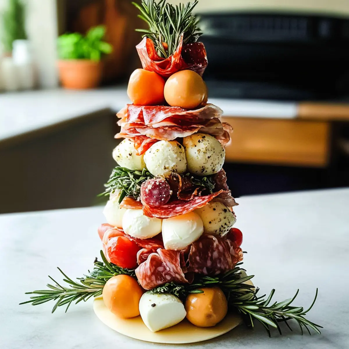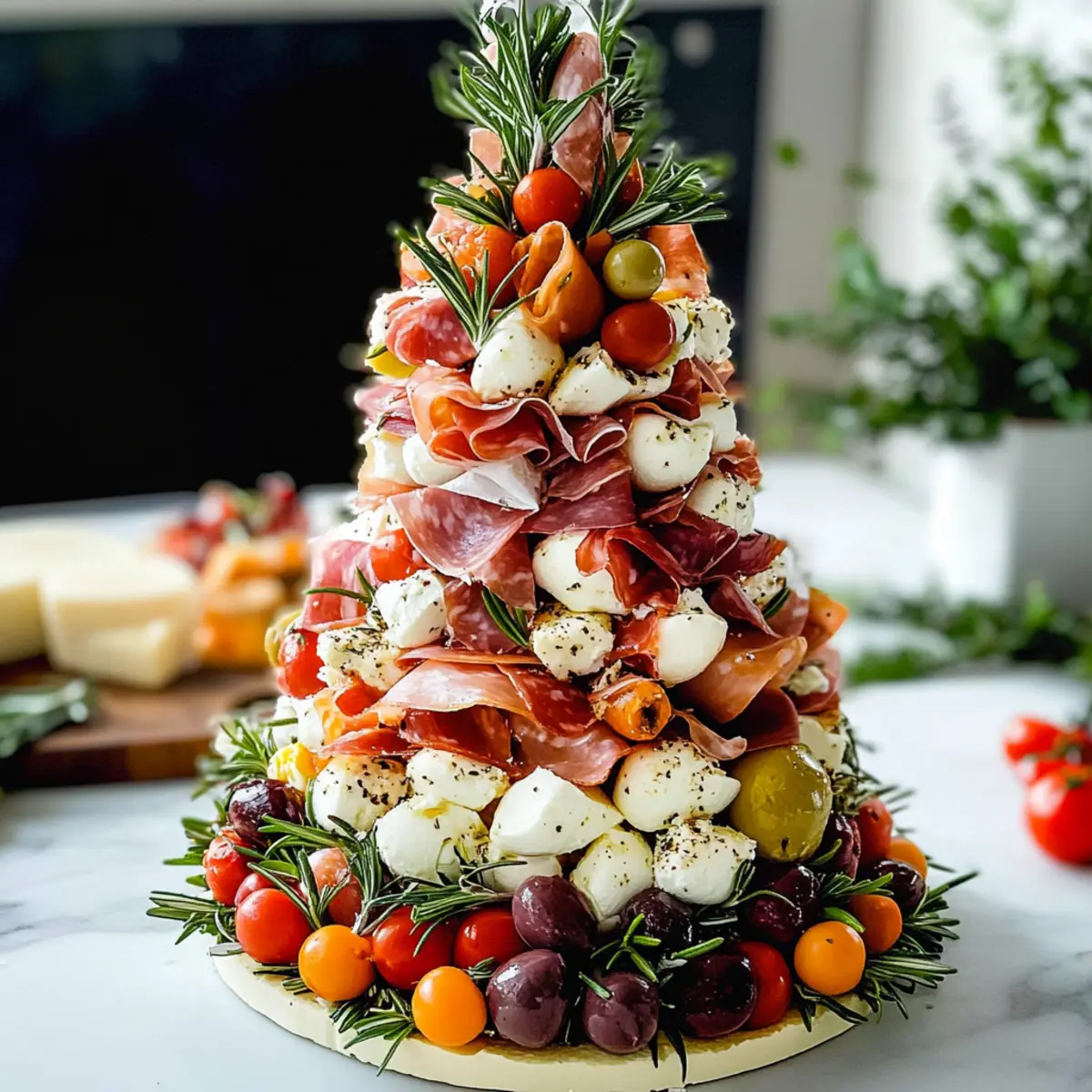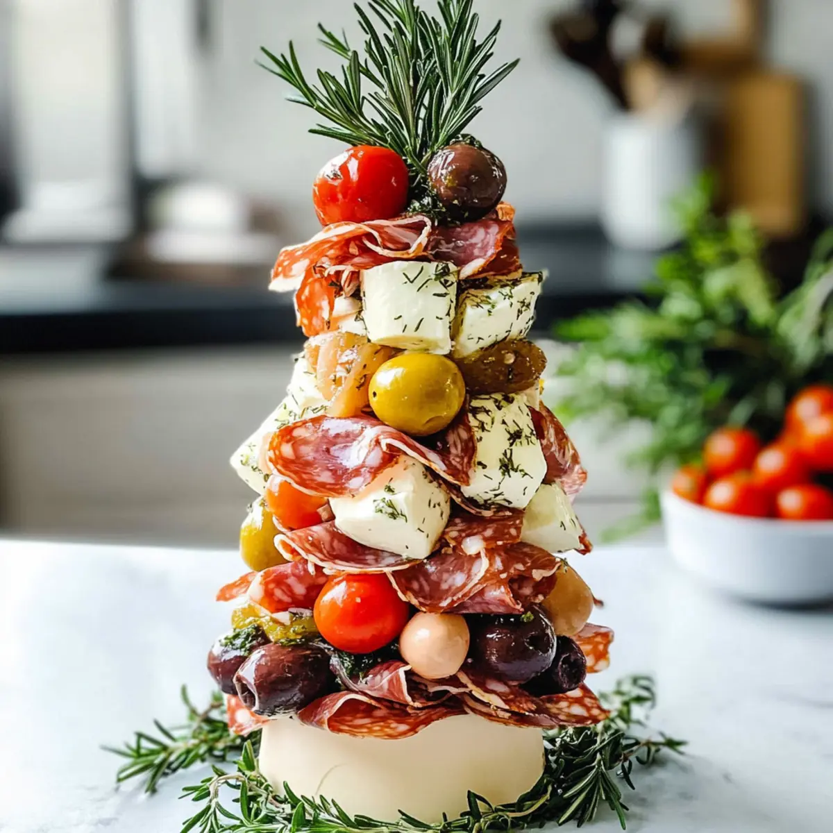 Hast du dich jemals in einen greifbaren Traum aus mediterranen Aromen und Farben verloren? Der Antipasti Turm bringt genau diesen Zauber auf den Tisch! Diese festliche Appetizer-Kreation ist nicht nur ein echter Hingucker, sondern auch eine köstliche Auswahl an verschiedenen Texturen, die sowohl Herz als auch Magen erfreuen. Von cremigen Käsesorten über saftige Tomaten bis hin zu würzigen Oliven – dieser turmförmige Genuss ist perfekt für deine nächsten Feiertagsversammlungen oder Buffets. Schnell zubereitet und ein absoluter Publikumsmagnet, wird dein Antipasti Turm alle Blicke auf sich ziehen und die Gespräche anregen. Welche Zutaten würdest du als erstes hinzufügen, um deine persönliche Note einzubringen? Warum ist der Antipasti Turm einzigartig? Atemberaubende Präsentation: Der Antipasti Turm ist nicht nur lecker, sondern auch ein optisches Highlight auf jedem Tisch. Vielfältige Aromen kommen zusammen – von dem milden Käse bis hin zu den würzigen Oliven, ist jede Schicht ein Geschmackserlebnis. Einfach zuzubereiten: Mit wenigen Handgriffen und ohne komplizierte Techniken kannst du dieses Meisterwerk kreieren. Genuss für alle: Er kann mühelos an persönliche Vorlieben angepasst werden, sodass jeder in den Genuss kommt. Perfekt für Feste: Ob zu Feiertagen oder einfach nur so – dieser Turm wird garantiert zum Gesprächsthema! Probiere es aus und überzeuge dich selbst von den Möglichkeiten, die dir das Antipasti Turm Rezept bietet! Antipasti Turm Zutaten • Bereite deinen Antipasti Turm mit diesen köstlichen Zutaten vor! Für die Basis Mini Mozzarella – sorgt für Cremigkeit und milden Geschmack; ersetze sie für ähnliche Textur durch Bocconcini. Parmaschinken – fügt eine reiche, salzige Note hinzu; Prosciutto kann einen ähnlichen Geschmack bieten. Salami – bringt eine würzige Note; tausche sie gegen Chorizo für einen rauchigeren Geschmack. Käsewürfel (Cheese Cubes) – steuert Textur und Reichhaltigkeit bei; festem Käse wie Cheddar kann alternativ verwendet werden. Fetawürfel – verleiht einen pikanten Biss; Tofu ist eine großartige vegane Alternative. Für die Frische Weintrauben (Grapes) – bringen Süße und Frische mit; du kannst auch Kirschtomaten als herzhafte Variante nutzen. Oliven (Olives) – sorgen für einen salzigen Geschmack; Pickles sind eine schmackhafte Ersatzoption. Cocktailtomaten – bringen Saftigkeit und Farbe; halbe Kirschtomaten sind eine ähnliche Option. Rosmarinzweige – fügen Aroma und einen festlichen Touch hinzu; Thymian ist eine gute Alternative für einen anderen Kräutergeschmack. Viel Spaß beim Zubereiten deines Antipasti Turms! Step-by-Step Instructions for Antipasti Turm Step 1: Styroporkegel Vorbereiten Deinen Antipasti Turm beginnst du, indem du einen Styroporkegel mit Backpapier umwickelst. Achte darauf, dass das Papier gut anliegt und befestige es mit Zahnstochern, um eine saubere Oberfläche zu erzielen. Dies gewährleistet nicht nur die Hygiene, sondern bildet auch die Grundlage für deine köstliche Kreation. Step 2: Zahnstochern Einstechen Jetzt fügst du die Zahnstochern in den Kegel ein – gleichmäßig verteilt und in einem Abstand von etwa 2-3 cm. Diese Zahnstochern werden später die köstlichen Zutaten halten, also achte darauf, dass sie stabil im Styropor stecken. Das Vorbereiten dieser Basis sorgt für ein ansprechendes und strukturiertes Design deines Antipasti Turms. Step 3: Zutaten Aufspießen Beginne damit, die ausgewählten Zutaten wie Mini Mozzarella, Parmaschinken und Salami auf die Zahnstochern zu stecken. Fülle den Kegel nach und nach, indem du die Zutaten so anordnest, dass sie farbenfroh und abwechslungsreich sind. Achte darauf, die schmackhaften Elemente eng zu belegen, um einen vollmundigen Geschmack zu garantieren. Step 4: Lücken Füllen Nachdem du die großen Zutaten platziert hast, ist es Zeit, die kleinen Lücken mit weiteren Zutaten zu füllen. Nutze Fetawürfel, Weintrauben oder Oliven, um deinem Antipasti Turm eine spannende Textur und interessante Aromen zu verleihen. Dies sorgt für einen bunten, ansprechenden Blick und verbessert den Gesamteindruck. Step 5: Dekorieren mit Rosmarin Verleihe deinem Antipasti Turm eine festliche Note, indem du frische Rosmarinzweige an der Spitze oder zwischen den Schichten platzierst. Diese Kräuter fügen nicht nur ein toll aussehendes Element hinzu, sondern auch ein köstliches Aroma. Lass deiner Kreativität freien Lauf und achte darauf, dass der Turm ansprechend aussieht. Step 6: Krönung mit einem dekorativen Element Um den Antipasti Turm zu vollenden, gestalte eine dekorative Spitze mit einem kleinen Toaststern oder Käse. Dies wird nicht nur als schöner Abschluss dienen, sondern auch den Höhepunkt deiner kulinarischen Kreation betonen. Achte darauf, dass alles gut ausbalanciert ist und ansprechend aussieht, bevor du ihn servierst. Expertentipps für den Antipasti Turm Hygiene beachten: Stelle sicher, dass der Styroporkegel vollständig mit Backpapier bedeckt ist, um Lebensmittelkontakt und Hygiene zu gewährleisten. Farbenfrohe Auswahl: Verwende eine Vielzahl von farbigen Zutaten, um einen visual ansprechenden Antipasti Turm zu kreieren, der Gäste begeistert. Zahnstocherdimensionen: Achte darauf, die Zahnstochern in angemessener Länge zu wählen – sie sollten nicht über den Turm hinausragen, um Verletzungen zu vermeiden. Vorbereitung: Bereite die Zutaten einen Tag im Voraus vor, um die Montage am servierenden Tag zu erleichtern und das beste Ergebnis zu erzielen. Variationen nutzen: Experimentiere mit verschiedenen Fleischsorten und vegetarischen Alternativen, um deinen Antipasti Turm individuell und abwechslungsreich zu gestalten. Antipasti Turm im Voraus zubereiten Der Antipasti Turm eignet sich hervorragend für die Vorbereitung, um dir an hektischen Tagen Zeit zu sparen! Du kannst die einzelnen Zutaten wie Mini Mozzarella, Parmaschinken und Salami bis zu 3 Tage im Voraus schneiden und in luftdichten Behältern im