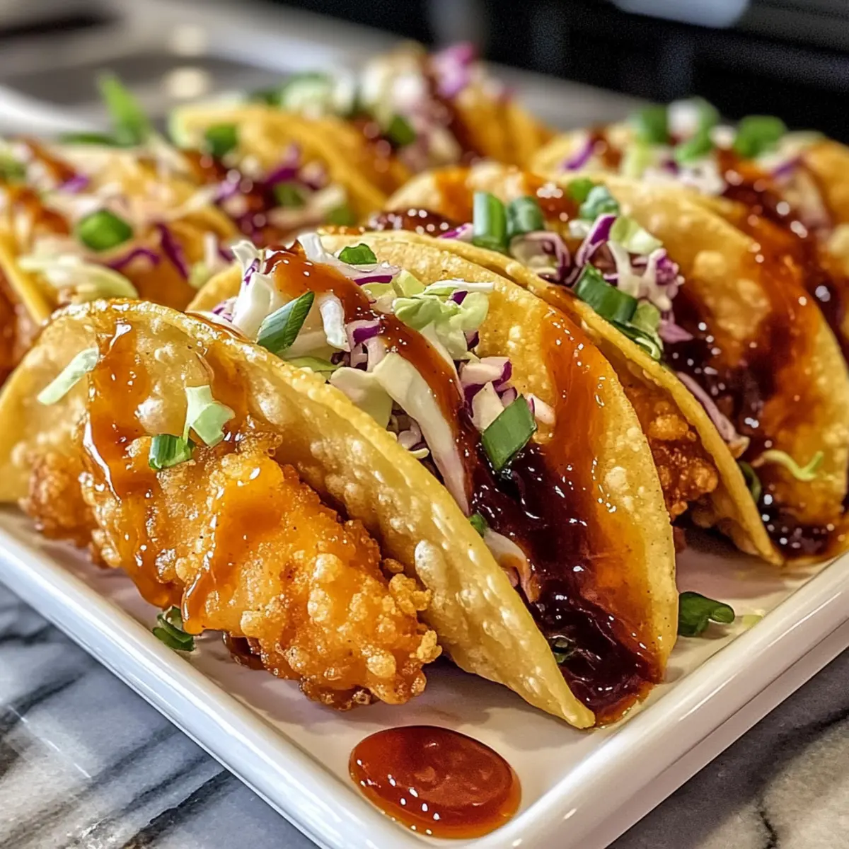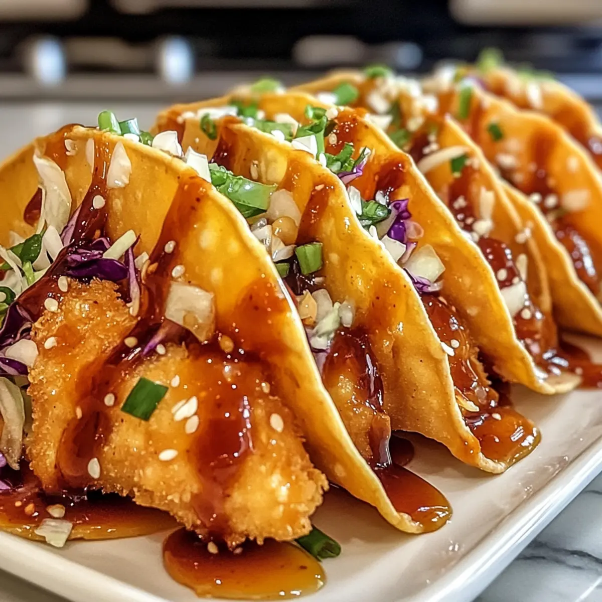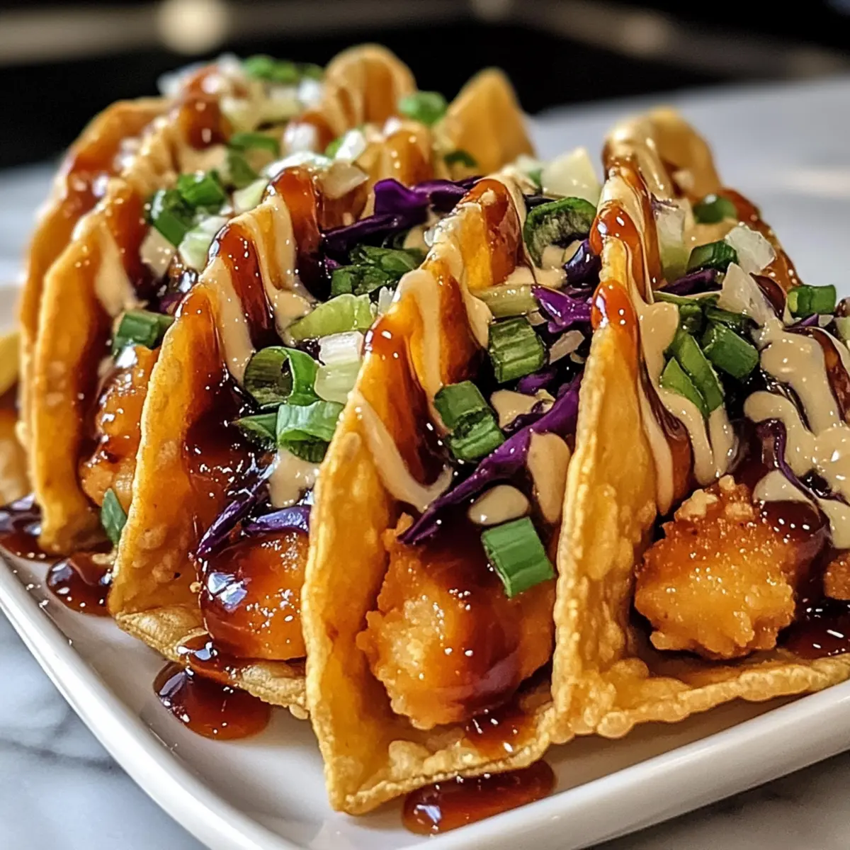 In einem kleinen Bistro hörte ich, wie ein Paar begeistert über ihre neuesten kulinarischen Entdeckungen plauderte: „Hast du schon die Äpfelbee’s Hähnchen Wonton Tacos probiert? Die sind einfach unglaublich!“ Solche Gerichte vermischen das Beste aus verschiedenen Küchen und zaubern eine Geschmacksexplosion auf den Tisch. In meinem neuesten Rezept für crispy Äpfelbee’s Hähnchen Wonton Tacos findest du die perfekte Kombination aus zartem, hoisin-glasiertem Hähnchen und knusprigen Wonton-Schalen, die mit einer frischen, knackigen Coleslaw ergänzt werden. Diese Tacos sind nicht nur ein absoluter Hingucker, sondern auch ein schnelles und einfaches Gericht für den Feierabend, das selbst Gäste in Staunen versetzt. Überzeugt? Lass uns gemeinsam entdecken, wie einfach es ist, dieses asiatische Fusion-Highlight zuzubereiten! Warum werden diese Tacos dein Favorit? Vielfalt der Aromen: Die Kombination aus hoisin-glasiertem Hähnchen und süß-saurer Chili-Soße sorgt für ein Geschmackserlebnis, das jeden Bissen zu einem Fest macht. Kross und Knackig: Die krossen Wonton-Schalen bieten eine perfekte Textur, die ideal mit der weichen Füllung harmoniert. Einfache Zubereitung: Dank einfacher Zutaten und unkomplizierter Zubereitung kannst du diese Tacos im Handumdrehen zaubern, perfekt für stressige Wochentage. Anpassungsfähig: Egal, ob du Hähnchen, Tofu oder Gemüse verwenden möchtest – dieses Rezept erlaubt dir, kreativ zu sein und deinen Vorlieben zu folgen! Beeindruckend im Aussehen: Diese Taco-Kreation ist nicht nur köstlich, sondern auch ein absoluter Hingucker auf jedem Tisch. Überrasch deine Gäste mit einem Gericht, das geschmacklich und optisch begeistert! Äpfelbee’s Hähnchen Wonton Tacos Zutaten • Für die Wontons: Wonton-Blätter – Sie bilden die knusprigen Taco-Schalen; du kannst auch kleine Tortillas als Ersatz verwenden. Sesamöl – Fügt Reichtum hinzu und hebt den Geschmack; kann im Notfall durch Pflanzenöl ersetzt werden. • Für die Füllung: Hähnchenbrust (fein gewürfelt) – sorgt für Protein und Textur; vorgekochtes Hähnchen macht die Zubereitung noch schneller. Hoisin-Sauce – verleiht dem Hähnchen eine süße und herzhafte Glasur. Sojasauce – verstärkt den Umami-Geschmack; achte auf die Menge für eine perfekte Balance. Gehackter Knoblauch und frischer Ingwer – sind für die Geschmacksvielfalt unerlässlich; du kannst auch Pulver verwenden, wenn keine frischen Zutaten zur Hand sind. • Für den Slaw: Coleslaw-Mischung – bringt Crunch und Frische; alternativ kannst du auch gehackten Weißkohl und Karotten verwenden. Frühlingszwiebeln – bieten ein mildes Zwiebelaroma und dienen als Garnitur. Reisessig & Honig – sorgen für die perfekte Balance zwischen Säure und Süße im Slaw. • Für das Finish: Süß-Chili-Sauce – fügt eine süß-scharfe Note hinzu, die das Gericht perfekt abrundet; passe die Menge deinem persönlichen Geschmack an. Koriander und geröstete Sesamsamen – für die Garnitur, die sowohl Geschmack als auch visuelle Attraktivität bietet. Diese Zutaten werden gemeinsam ein unvergessliches Geschmackserlebnis schaffen und deine Liebe für das Äpfelbee’s Hähnchen Wonton Tacos Rezept neu entfachen! Schritt-für-Schritt-Anleitung für die Krosse Äpfelbee’s Hähnchen Wonton Tacos Rezept Step 1: Wonton-Schalen vorbereiten Heize den Ofen auf 190°C vor. Sprühe eine Muffinform leicht mit Kochspray ein und lege die Wonton-Blätter über die umgedrehten Muffin-Becher. Backe die Wonton-Schalen für 5-7 Minuten, bis sie goldbraun und knusprig sind. Achte darauf, dass sie schön aufgebläht sind und eine goldene Farbe annehmen. Step 2: Hähnchen füllen Erhitze in einer großen Pfanne das Sesamöl bei mittlerer bis hoher Hitze. Gib das gewürfelte Hähnchen dazu und brate es für 3-4 Minuten, bis es gar ist und nicht mehr rosa aussieht. Füge Hoisin-Sauce, Sojasauce, gehackten Knoblauch und frischen Ingwer hinzu, und koche alles weitere 2-3 Minuten, damit das Hähnchen gut glasiert ist. Step 3: Slaw zubereiten In einer Schüssel vermische die Coleslaw-Mischung mit gehackten Frühlingszwiebeln. Beträufle die Mischung mit Sesamöl, Reisessig und Honig und mische alles gut durch. Achte darauf, dass der Slaw gleichmäßig mit dem Dressing bedeckt ist, um einen erfrischenden Geschmack zu erzielen. Step 4: Tacos zusammenstellen Fülle jede knusprige Wonton-Schale großzügig mit dem hoisin-glasierten Hähnchen. Staple dann die vorbereitete Coleslaw-Mischung darauf, sodass die Tacos gut gefüllt aussehen und ihre Füllung hübsch präsentieren. Step 5: Fertigstellen und servieren Träufle die Süß-Chili-Sauce über die gefüllten Tacos, entsprechend deinem persönlichen Geschmack. Garniere die Tacos mit frischem Koriander und gerösteten Sesamsamen für zusätzlichen Geschmack und visuelle Attraktivität. Serviere die krossen Äpfelbee’s Hähnchen Wonton Tacos sofort, um die beste Textur zu gewährleisten. Lagerungstipps für Äpfelbee’s Hähnchen Wonton Tacos Zimmertemperatur:: Die Wonton-Schalen sollten sofort nach der Zubereitung genossen werden, da sie am besten frisch und knusprig schmecken. Kühlschrank:: Fülle den Slaw und das Hähnchen in separate, luftdichte Behälter und lagere sie bis zu 3 Tage im Kühlschrank. Die Wonton-Schalen sollten erst kurz vor dem Servieren gefüllt werden. Gefrierschrank:: Du kannst die ungefüllten Wonton-Schalen für bis zu 1 Monat in einem luftdichten Behälter einfrieren. Achte darauf, sie gut zu verpacken, um Gefrierbrand zu vermeiden. Wiedererwärmung:: Wenn du das Hähnchen aufwärmst, tu dies sanft in einer Pfanne bei niedriger Hitze, damit es saftig bleibt. Fülle die Wonton-Schalen erst kurz vor dem servieren, um die perfekte Textur zu gewährleisten. Expertentipps für Äpfelbee’s Hähnchen Wonton Tacos Die perfekten Wonton-Schalen: Achte darauf, die Wonton-Blätter nicht zu überbacken, da sie sonst zu hart werden. Beobachte die Farbe und forme sie schön gew