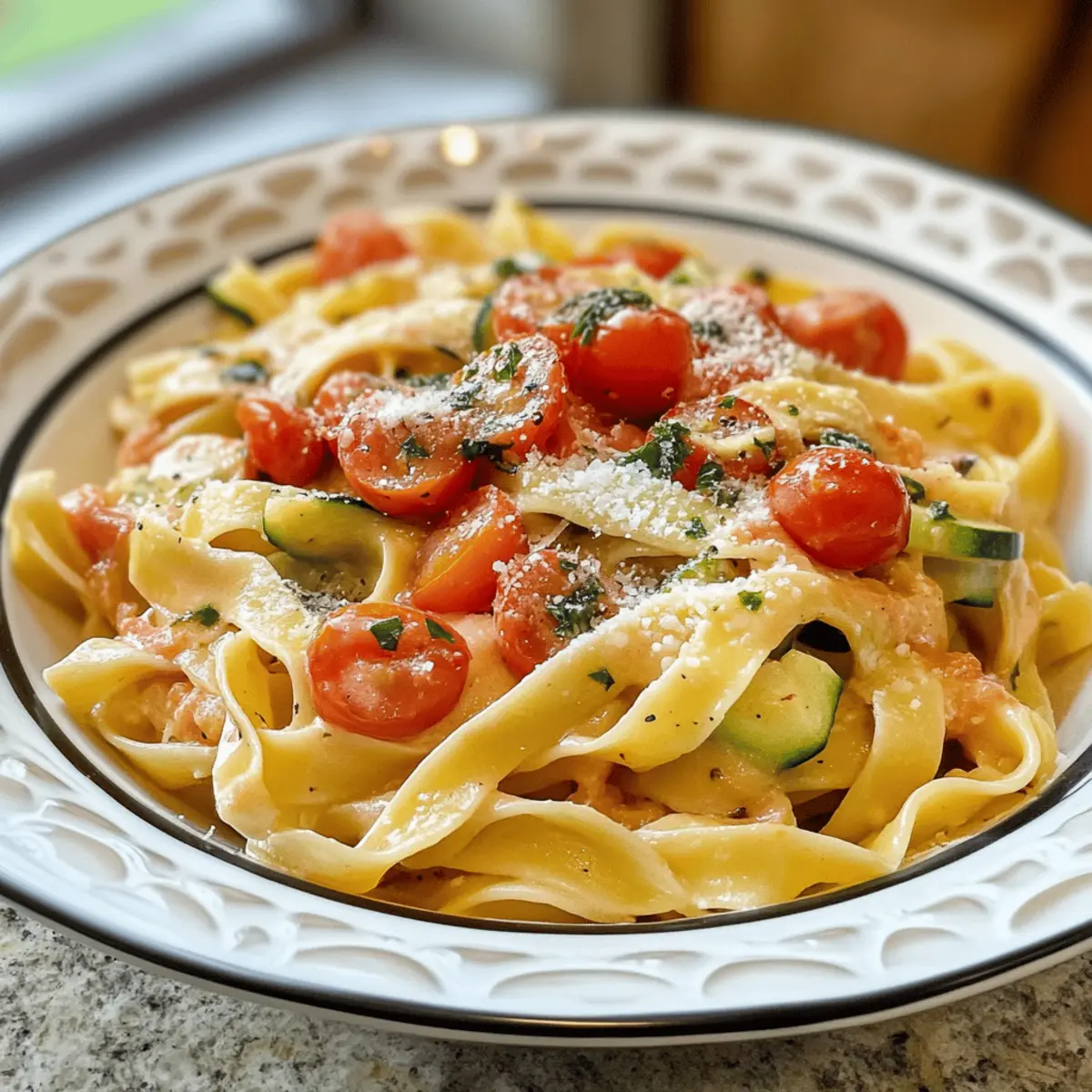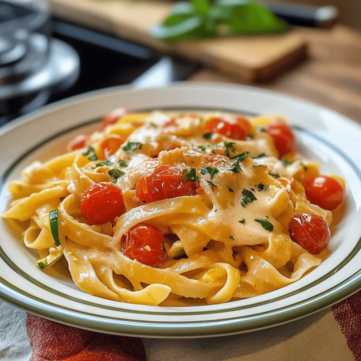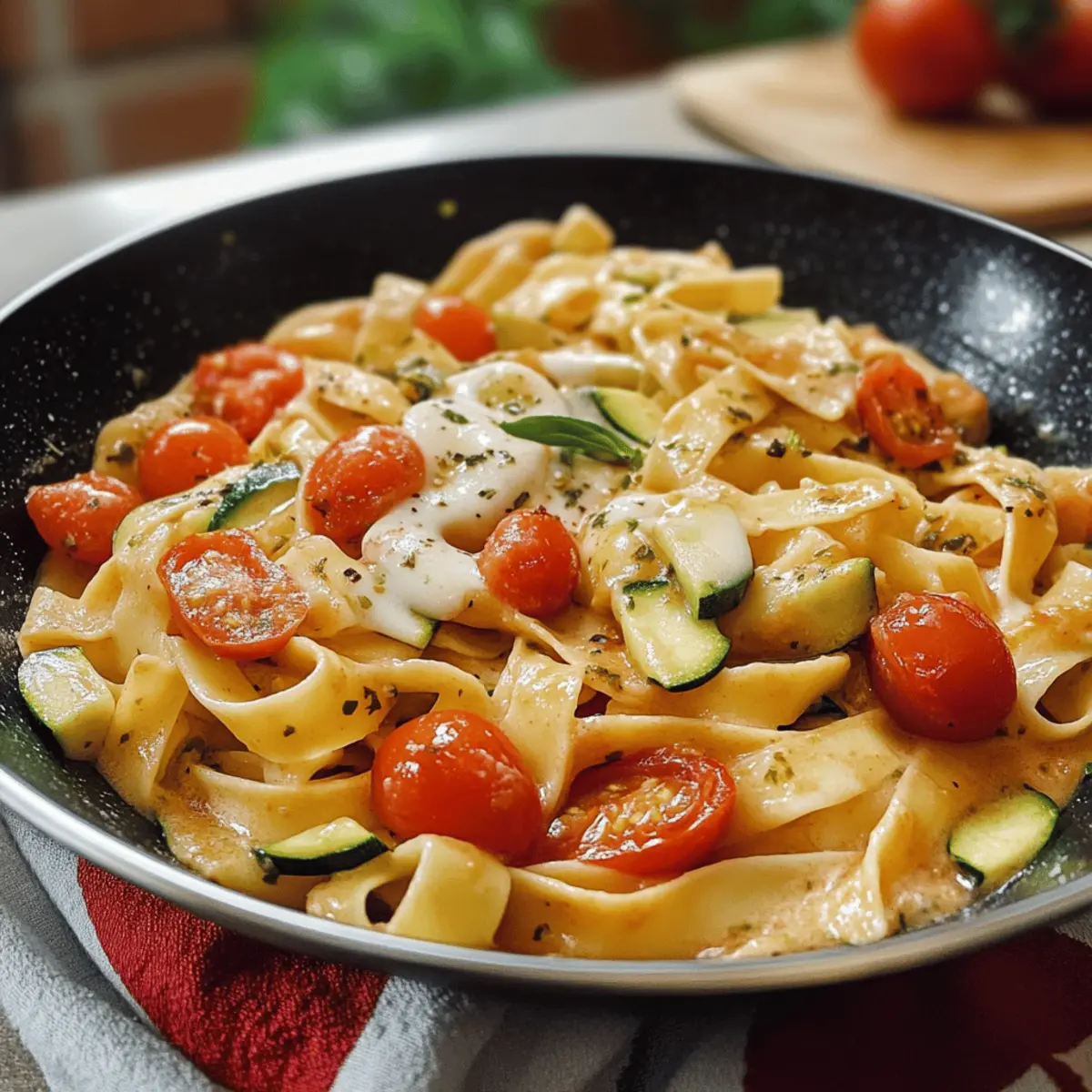 Ein sanfter Duft von gebratenem Knoblauch und frischem Gemüse schwebt durch die Küche und erinnert mich an Sommerabende, als unsere Familie um den Esstisch versammelt war. Wenn du nach einem schnellen und dennoch köstlichen Rezept suchst, das alle an deiner Tischrunde begeistert, dann sind diese Bandnudeln mit Zucchini-Tomaten-Sauce genau das Richtige für dich! Dieses vegetarische Gericht vereint die frischen Aromen von knackiger Zucchini und süßen Mini-Tomaten zu einer samtigen Sauce, die sowohl Kinder als auch Erwachsene anspricht. Mit der blitzschnellen Zubereitung ist es der perfekte Alltagsheld für Familien, die sich eine gesunde Mahlzeit wünschen, aber keine Zeit mit aufwändigen Rezepten verlieren wollen. Neugierig, wie du diese einfache Köstlichkeit selbst zaubern kannst? Lass uns gleich starten! Warum wird dieses Rezept geliebt? Schnelligkeit: Die Zubereitung dauert nur etwa 20 Minuten, perfekt für hektische Wochentage. Frische Aromen: Knackige Zucchini und süße Mini-Tomaten sorgen für eine frische Geschmacksexplosion. Familienfreundlich: Dieses Gericht begeistert die ganze Familie, selbst die wählerischsten Esser! Vielseitigkeit: Du kannst das Rezept nach Belieben anpassen – ob mit extragemüse wie Mini Quiches Mit Gemüse oder proteinreichen Zutaten wie Hähnchen. Gesunde Wahl: Nährstoffreich und ohne künstliche Zusätze ist es ideal für eine ausgewogene Ernährung. Einfaches Rezept: Mit nur wenigen Zutaten zauberst du ein köstliches Gericht, das immer gelingt! Bandnudeln mit Zucchini-Tomaten-Sauce Zutaten Für die Sauce Zucchini – Verleiht eine milde Note und zarte Textur. Du kannst auch gelbe Zucchini verwenden, wenn du eine andere Geschmacksrichtung möchtest. Mini-Tomaten – Fügen natürliche Süße und Säure hinzu. Falls sie nicht verfügbar sind, kannst du auch normale Tomaten nehmen. Knoblauch – Verstärkt das Geschmackserlebnis. Frischer Knoblauch empfiehlt sich immer für den besten Geschmack. Passierte Tomaten – Bilden die reichhaltige Basis der Sauce, die Tiefe und Geschmack bringt. Gemüsebrühpulver – Sorgt für Umami und rundet das Aroma ab. Achte darauf, die Würze zu justieren, wenn du eine andere Brühe verwendest. Frischkäse – Macht die Sauce schön cremig. Mascarpone kann ebenfalls eine gute Alternative sein. Olivenöl – Ideal zum Anbraten und gibt zusätzlich Geschmack. Für die Pasta Bandnudeln – Die Hauptquelle für Kohlenhydrate in diesem Gericht. Du kannst auch andere Pasta wie Penne oder Spaghetti verwenden, wenn dir das lieber ist. Für das Topping Ziegenkäse – Verleiht einen pikanten Geschmack und eine cremige Konsistenz. Alternativ kannst du Gouda oder Parmesan verwenden, wenn du einen milden Geschmack bevorzugst. Schritt-für-Schritt-Anleitung für Bandnudeln mit Zucchini-Tomaten-Sauce Step 1: Bandnudeln kochen Koche die Bandnudeln in einem großen Topf mit kochendem, gesalzenem Wasser gemäß der Verpackungsanweisung, bis sie al dente sind – etwa 8-10 Minuten. Rühre gelegentlich um, damit sie nicht zusammenkleben. Nachdem sie fertig sind, gieße die Nudeln in ein Sieb ab und stelle sie beiseite, während du die Sauce zubereitest. Step 2: Knoblauch anbraten Erhitze in einer großen Pfanne bei mittlerer Hitze 2 Esslöffel Olivenöl. Füge den fein gehackten Knoblauch hinzu und brate ihn für etwa 1 Minute an, bis er duftet und leicht goldbraun ist. Achte darauf, dass er nicht verbrennt, da er sonst bitter wird. Diese Basis sorgt für den herzhafte Geschmack der Bandnudeln mit Zucchini-Tomaten-Sauce. Step 3: Zucchini anbraten Jetzt gib die in kleine Stücke geschnittene Zucchini in die Pfanne und brate sie unter gelegentlichem Rühren für ca. 3-5 Minuten, bis sie leicht weich geworden und leicht gebräunt sind. Die Zucchini sollte noch etwas Biss haben. Dies gibt der Sauce eine angenehme Textur und Frische. Step 4: Mini-Tomaten hinzufügen Füge die halbierten Mini-Tomaten zur Zucchini in die Pfanne hinzu und koche sie für weitere 2 Minuten, bis sie anfangen, aufzuplatzen und ihren Saft freizusetzen. Die Tomaten verleihen der Sauce eine süße Note und eine schöne Farbe, die perfekt zu den Bandnudeln passt. Step 5: Soße zubereiten Gieße nun die passierten Tomaten und das Gemüsebrühpulver in die Pfanne. Rühre alles gut durch und lass die Mischung bei schwacher Hitze für etwa 5 Minuten köcheln, bis sich die Aromen vereinen und die Sauce leicht eindickt. Überprüfe das Aroma und passe es gegebenenfalls mit etwas Salz und Pfeffer an. Step 6: Frischkäse einrühren Nehme die Pfanne vom Herd und füge den Frischkäse hinzu. Rühre ihn ein, bis er vollständig geschmolzen und in die Sauce integriert ist. Diese cremige Note macht die Bandnudeln mit Zucchini-Tomaten-Sauce besonders verführerisch und schmackhaft. Step 7: Pasta einmischen Gib die abgetropften Bandnudeln direkt in die Pfanne mit der Sauce und vermische alles gut, bis die Pasta gleichmäßig mit der Sauce bedeckt ist. Lasse die Mischung kurz auf niedriger Hitze stehen, sodass die Nudeln die Aromen aufnehmen können – etwa 1-2 Minuten. Step 8: Anrichten und servieren Serviere die Bandnudeln mit Zucchini-Tomaten-Sauce auf Tellern und streue den zerbröselten Ziegenkäse großzügig darüber. Optional kannst du frische Kräuter wie Basilikum oder Petersilie hinzufügen. Die Kombination aus cremiger Sauce und frischem Gemüse macht dieses Gericht zu einem wahren Genuss. Vorbereitung für Bandnudeln mit Zucchini-Tomaten-Sauce Diese Bandnudeln mit Zucchini-Tomaten-Sauce sind ideal für die Vorausplanung! Du kannst die Zucchini und die Mini-Tomaten bis zu 3 Tage im Voraus schneiden und im Kühlschrank aufbewahren, um sie frisch zu halten und das Vorbereiten zu erleichtern. Auch die Soße kann bereits vorbereitet und in einem luftdichten Behälter für bis zu 24 Stunden im Voraus gekocht werden – einfach bei Bedarf aufwärmen. Um die Qualität zu erhalten, achte darauf, die Zucchini nicht zu lange zu garen, sodass sie ihren Biss behalten. Wenn d