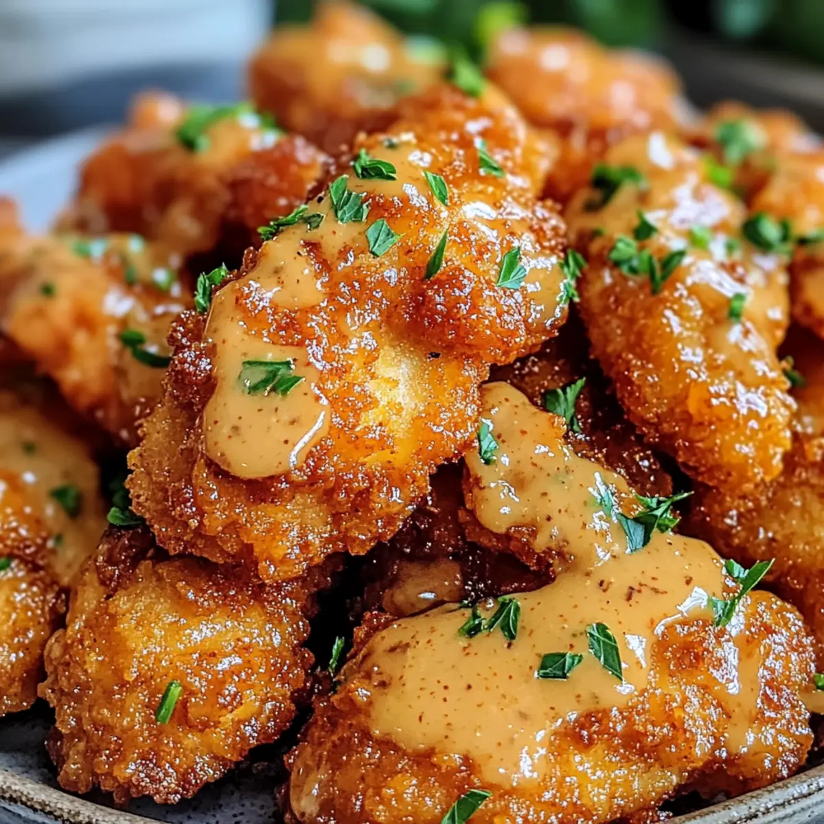 5. Mixen und servieren: Gib die frisch frittierten Hühnchenstücke in die Schüssel mit der Bang Bang Sauce und garniere es mit frischer, gehackter Petersilie.