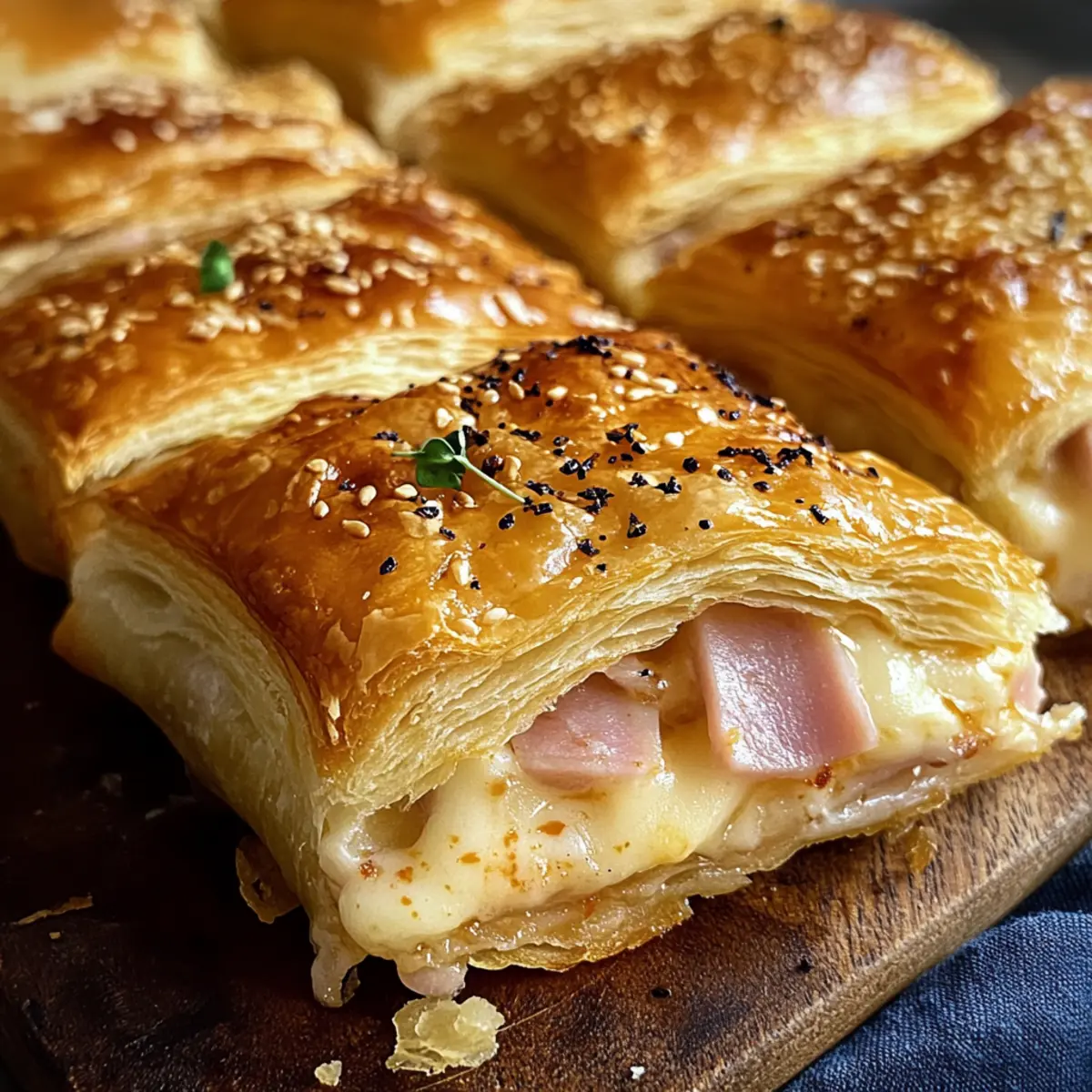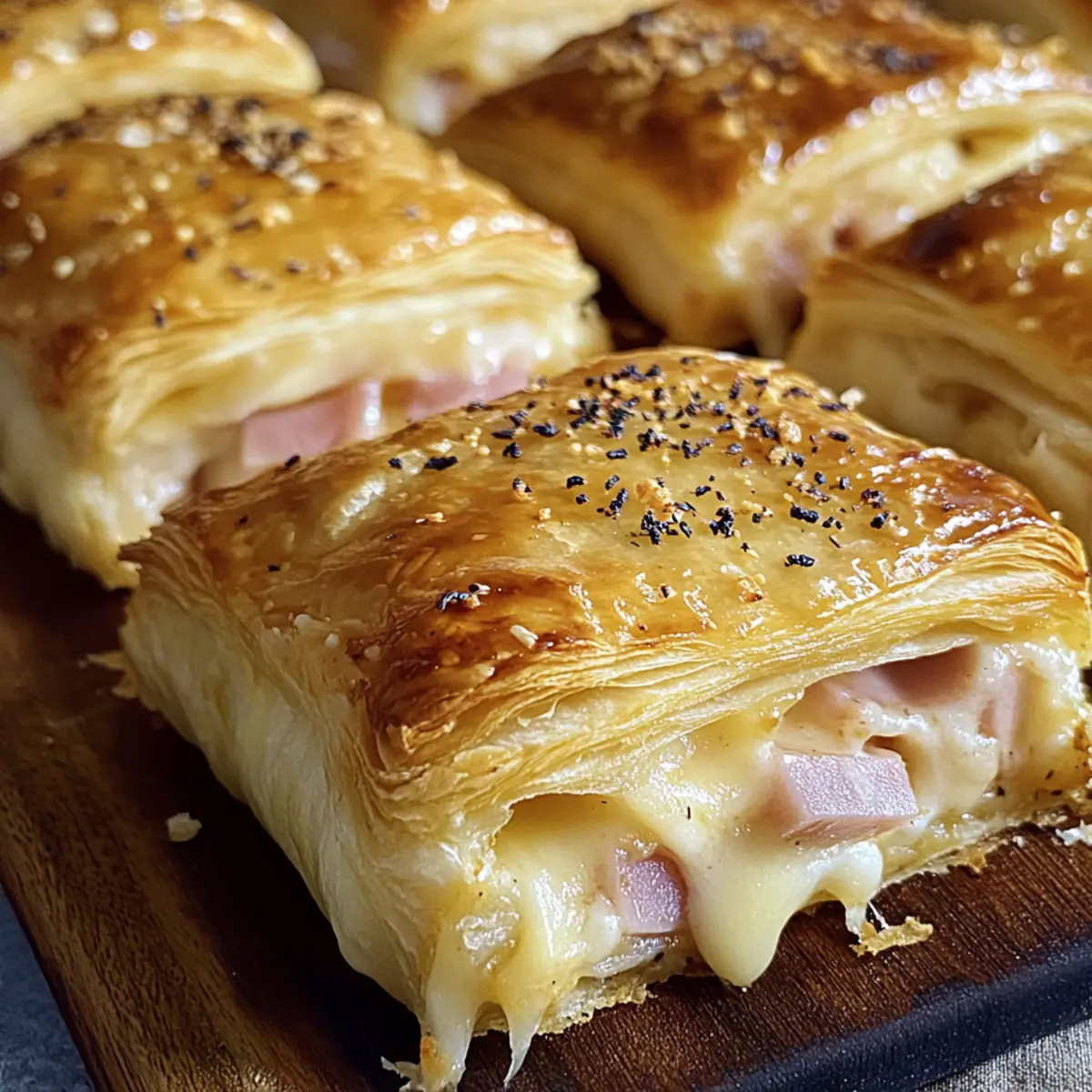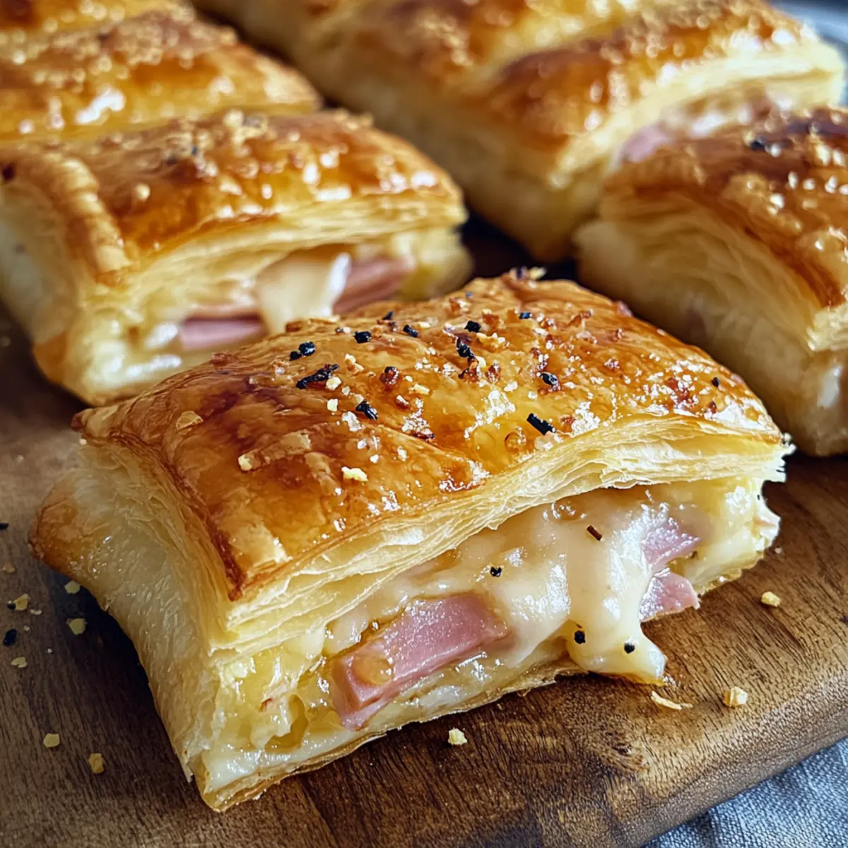 Die Küche ist ein magischer Ort, wo einfache Zutaten sich in wahre Genussmomente verwandeln können. Heute lade ich dich ein, mit mir eine köstliche Reise in die Welt der Blätterteig gefüllt mit Schinken und Käse zu unternehmen. Diese leckeren Häppchen sind nicht nur traumhaft knusprig und aromatisch, sie sind auch extrem vielseitig und schnell zubereitet. Perfekt für gesellige Abende mit Freunden, als herzhafter Snack für die Familie oder als improvisierte Mahlzeit, wenn der Hunger ruft. Was ich an diesem Rezept besonders schätze, ist die Möglichkeit, es ganz nach deinem Geschmack anzupassen – Experimentiere mit verschiedenen Käsesorten oder probiere eine vegetarische Variante aus! Bist du bereit, deine eigene Füllung zu kreieren und alle mit diesen kleinen Köstlichkeiten zu überraschen? Warum wirst du dieses Rezept lieben? Einfachheit: Die Zubereitung erfordert keine komplizierten Techniken – perfekt für Anfänger! Vielseitigkeit: Du kannst die Füllung nach Belieben anpassen und verschiedene Käsesorten sowie Kräuter ausprobieren. Schnell zubereitet: In nur 20 Minuten hast du köstliche Snacks, die jeden Hunger stillen. Schmackhaft und anziehend: Das perfekte Zusammenspiel aus knusprigem Blätterteig und einer cremigen Füllung begeistert garantiert alle Gäste. Ideale Appetizer: Egal ob für Partys oder entspannte Abende – diese Häppchen finden immer ihren Platz auf dem Tisch! Wenn du noch mehr über Variationen erfahren möchtest, schau dir unsere Ideen zu Variationen an! Blätterteig gefüllt mit Schinken und Käse Zutaten • Für den Blätterteig Blätterteig – Verwende hochwertigen Blätterteig für die beste Knusprigkeit. • Für die Füllung Schinken – Sorgt für einen herzhaften Geschmack. Du kannst ihn durch geräucherten Schinken ersetzen oder weglassen, um eine vegetarische Version zu machen. Käse – Schmilzt und macht die Füllung cremig. Gouda ist mild, während Emmental oder Cheddar für mehr Geschmack sorgen. Mische verschiedene Käsesorten für extra Aroma. Frischkäse oder Aufstrich – Bindet die Füllung und sorgt für Feuchtigkeit. Verwende aromatisierten Frischkäse oder Kräuteraufstrich, um den Geschmack zu intensivieren. Mit diesen köstlichen Zutaten wirst du deinen Gästen die perfekte Portion Blätterteig gefüllt mit Schinken und Käse präsentieren! Schritt-für-Schritt-Anleitung für Blätterteig gefüllt mit Schinken und Käse Schritt 1: Füllung vorbereiten In einer Schüssel den klein geschnittenen Schinken, den geriebenen Käse und den Frischkäse gut vermengen, bis alles gleichmäßig verteilt ist. Diese cremige Mischung sollte gut zusammenhalten und die Aromen vermischen sich harmonisch. Du kannst diese Schritt auch eine halbe Stunde vorher machen, damit die Aromen intensiver werden. Schritt 2: Blätterteig ausrollen Den Blätterteig auf eine bemehlte Arbeitsfläche legen und mit einem Nudelholz auf die gewünschte Dicke ausrollen, etwa 3-5 mm. Achte darauf, dass der Teig nicht kleben bleibt. Bereite dich darauf vor, dass der Teig beim Backen schön aufgeht und knusprig wird, was perfekt für unsere Blätterteig gefüllt mit Schinken und Käse ist. Schritt 3: Teig schneiden und füllen Den ausgerollten Blätterteig in quadratische Stücke schneiden, etwa 10×10 cm groß. In die Mitte jedes Stücks einen großen Löffel der Füllungsmixture geben. Achte darauf, nicht zu viel zu verwenden, damit der Teig sich gut schließen lässt. Schritt 4: Taschen verschließen Die Teigstücke über die Füllung klappen und die Ränder gut andrücken, um die Taschen zu versiegeln. Verwende eine Gabel, um die Ränder zusätzlich zu drücken und ein hübsches Muster zu erzeugen. Leichte Einschnitte auf der Oberseite der Taschen helfen, Dampf entweichen zu lassen, sodass sie gleichmäßig backen. Schritt 5: Backen Den Ofen auf 200°C (390°F) vorheizen und ein Backblech mit Backpapier auslegen. Die gefüllten Blätterteigtaschen auf das Blech legen und für 15-20 Minuten goldbraun backen. Du weißt, dass sie fertig sind, wenn der Teig schön aufgebläht und knusprig aussieht. Schritt 6: Servieren Die Blätterteigtaschen aus dem Ofen nehmen und einige Minuten abkühlen lassen, bevor du sie warm servierst. Sie sind eine perfekte Vorspeise oder ein Snack für jede Gelegenheit und du wirst sehen, wie sehr die Menschen diese knusprigen Leckereien lieben! Expertentipps für Blätterteig gefüllt mit Schinken und Käse Kalt arbeiten: Stelle sicher, dass der Blätterteig kalt ist, bevor du ihn ausrollst, damit er beim Backen schön aufgeht. Backzeit im Auge behalten: Achte darauf, die Backzeit nicht zu überschreiten, um ein Überbraunen der Blätterteig gefüllt mit Schinken und Käse zu vermeiden. Füllung variieren: Experimentiere mit verschiedenen Kräutern oder Gewürzen in der Füllung, um neue Geschmäcker zu entdecken. Dampf ablassen: Vergiss nicht, kleine Einschnitte auf der Oberseite der Taschen zu machen, damit der Dampf entweichen kann. Vorbereitung für Partys: Bereite die gefüllten Taschen im Voraus vor und tiefkühle sie, um sie bei Bedarf frisch zu backen. Was passt zu Blätterteig gefüllt mit Schinken und Käse? Diese köstlichen Häppchen sind ideal für gesellige Abende oder als Snack für zwischendurch. Frischer grüner Salat: Ein knackiger Salat mit einem leichten Dressing bringt Frische und Balance zu den herzhaften Füllungen. Aioli-Dip: Dieser cremige Dip ergänzt die knusprige Textur perfekt und verleiht den Blätterteigtaschen einen zusätzlichen Geschmackskick. Süß-sauer eingelegte Gurken: Diese pikante Beilage bietet eine schöne Geschmacksbalance und fördert den Appetit auf mehr. Glas Weißwein: Ein kühler Sauvignon Blanc harmoniert wunderbar mit dem salzigen Schinken und der cremigen Käsefüllung. Chili-Öl: Ein paar Tropfen darüber bringen eine angenehme Schärfe ins Spiel und machen die Blätterteig gefüllt mit Schinken und Käse zu einem aufregenden Geschmackserlebnis. Hummus: Diese cremige, würzige Pas