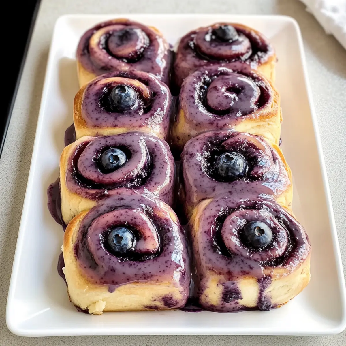8. Lasse die frisch gebackenen Blaubeer Zimtschnecken für einige Minuten abkühlen, bevor du die Glasur darüber träufelst.