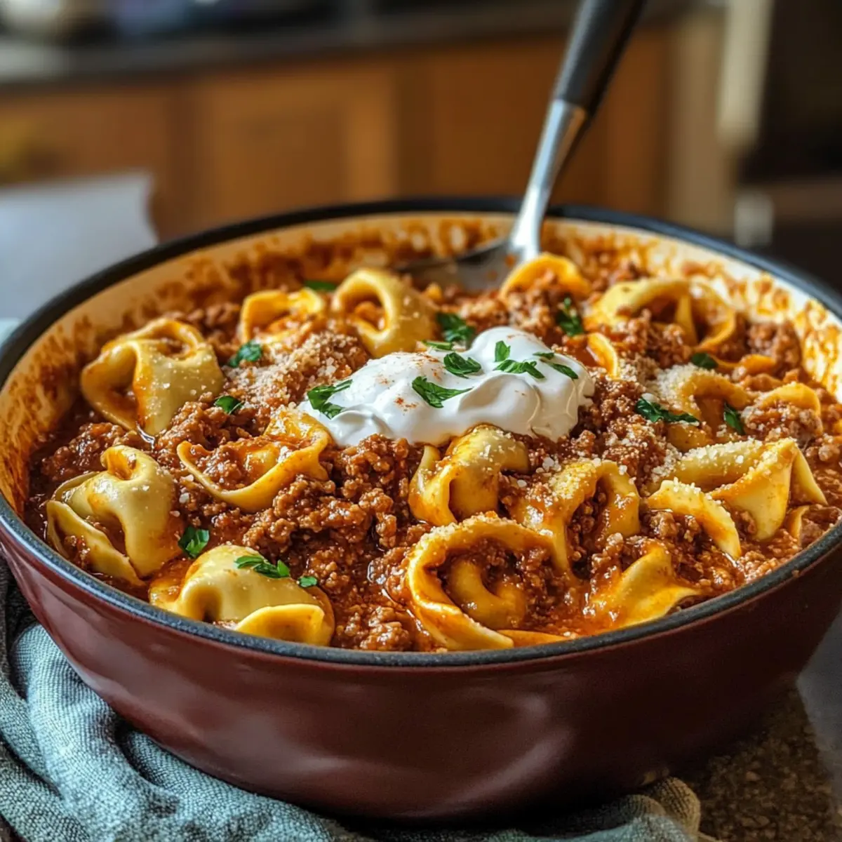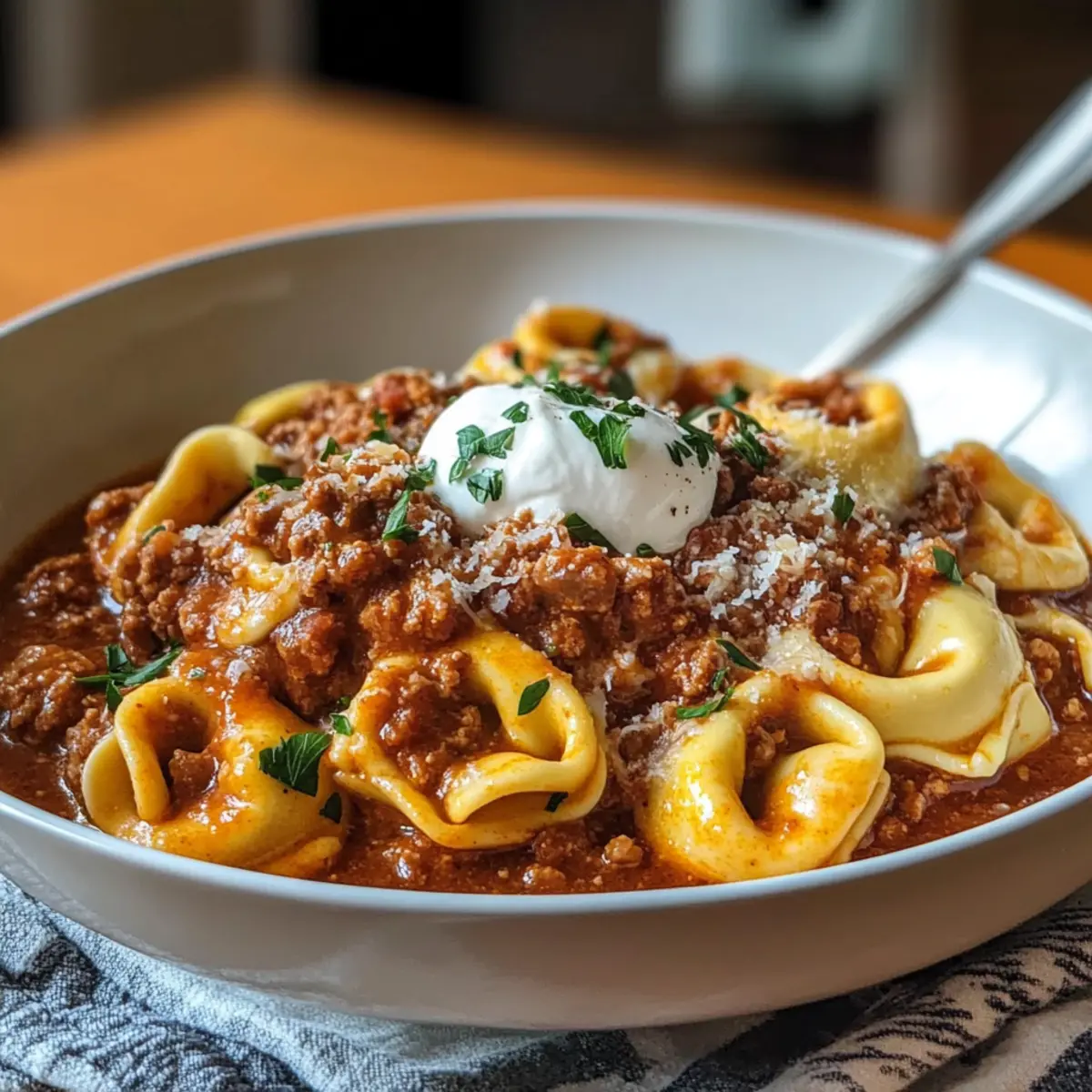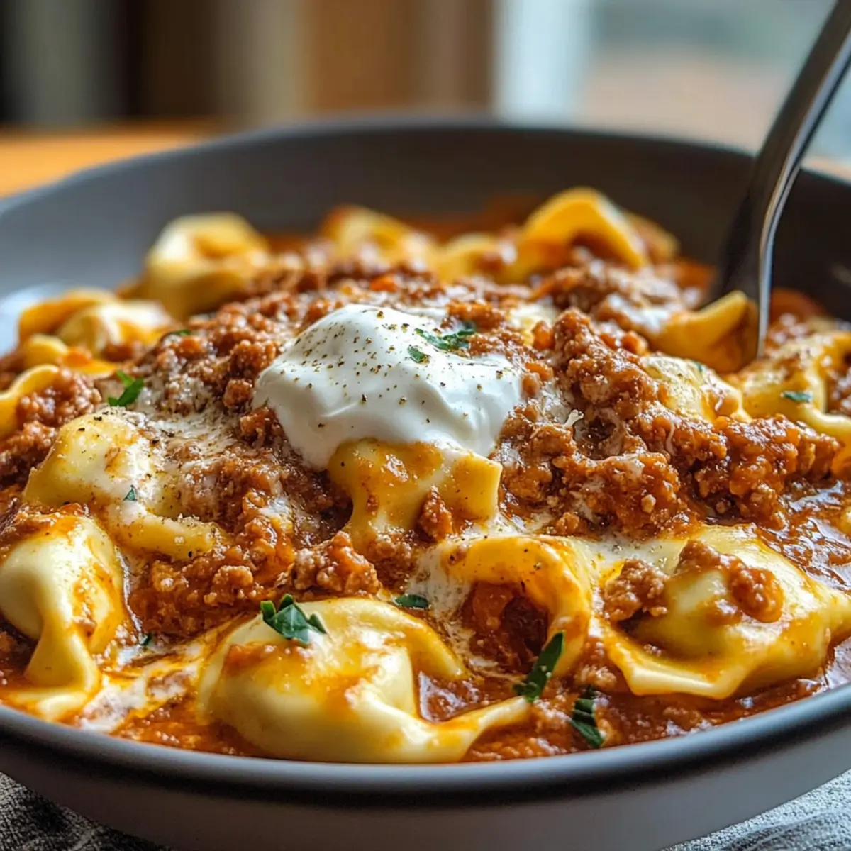 Es war einer dieser stressigen Abende, als der Kühlschrank leer und die Ideen für das Abendessen ausgegangen waren. Alle, die je in der gleichen Situation waren, wissen, wie verzweifelt man nach einer schnellen und schmackhaften Lösung sucht. Genau dann kommt das Rezept für Blitz-Tortellini mit Hackfleischsauce ins Spiel! Diese köstliche Kombination bietet nicht nur eine unverwechselbare Geschmacksexplosion, sondern lässt sich auch im Handumdrehen zubereiten – perfekt für hektische Wochentage. Mit minimalem Aufwand verwandelst du frische Tortellini und eine herzhafte Hackfleischsauce in ein luxuriöses Gericht, das die ganze Familie begeistern wird. Und das Beste daran? Du kannst die Tortellini je nach Lust und Laune mit verschiedenen Füllungen variieren! Bist du bereit, dieses blitzschnelle italienische Gericht zu zaubern? Warum sind diese Blitz-Tortellini so besonders? Schnelligkeit: Dieses Rezept ist für alle geeignet, die in der Küche wenig Zeit haben, aber trotzdem nicht auf Genuss verzichten möchten. In weniger als 30 Minuten kannst du ein köstliches Abendessen auf den Tisch bringen! Reichhaltige Aromen: Die Kombination aus Rinderhackfleisch und passierten Tomaten sorgt für einen intensiven, herzhaften Geschmack, der jeden Bissen zum Erlebnis macht. Vielseitigkeit: Du kannst die Tortellini-Füllung ganz nach deinem Geschmack anpassen, egal ob mit Ricotta und Spinat oder zarten Pilzen. Familientauglich: Dieses Gericht ist ein echter Crowd-Pleaser! Die ganze Familie wird es lieben, und auch wählerische Esser kommen auf ihre Kosten. Praktische Vorbereitung: Du kannst die Hackfleischsauce im Voraus zubereiten und sie in der Woche einfach aufwärmen – so sparst du an stressigen Abenden wertvolle Zeit! Blitz-Tortellini Zutaten Für die Hackfleischsauce • Rinderhackfleisch – Sorgt für einen reichhaltigen, herzhaften Geschmack; wähle 15-20% Fettgehalt für zusätzliche Tiefe. • Zwiebel – Essentiell für eine aromatische Geschmacksbasis; fein würfeln für gleichmäßiges Garen. • Knoblauch – Fügt einen frischen Kick hinzu; verwende frisch gehackte Zehen. • Passierte Tomaten – Bildet die Sauce mit milder Säure; kann durch gehackte Tomaten ersetzt werden. • Gemüsebrühe – Sorgt für Tiefe und Feuchtigkeit; jede Gemüse- oder Hühnerbrühe funktioniert gut. • Olivenöl – Wird zum Anbraten von Fleisch und Gemüse verwendet; extra natives Öl bringt zusätzlichen Geschmack. • Getrockneter Oregano & Basilikum – Versorgt mit klassischem italienischen Aroma; frische Kräuter können nach dem Kochen zur Garnierung verwendet werden. Für die Tortellini • Frische Tortellini – Schnell garend; wähle aus verschiedenen Füllungen wie Käse, Fleisch oder Gemüse. Für den Belag • Geriebener Käse (z.B. Mozzarella, Gouda) – Ideal zum Schmelzen und sorgt für eine cremige Kruste. • Schmand oder Sauerrahm – Fügt Cremigkeit und einen säuerlichen Kontrast zur reichhaltigen Sauce hinzu; Menge nach Geschmack anpassen. • Frische Petersilie – Verbessert die Garnierung, die Frische und die visuelle Anziehungskraft. Küche schnell und einfach mit diesen Blitz-Tortellini mit Hackfleischsauce! Schritt-für-Schritt-Anleitung für Blitz-Tortellini mit Hackfleischsauce Step 1: Öl erhitzen Erhitze in einer großen Pfanne bei mittelhoher Hitze etwa 2 Esslöffel Olivenöl, bis es heiß ist. Achte darauf, dass das Öl leicht zu glänzen beginnt, bevor du das Rinderhackfleisch hinzufügst. Dies sorgt dafür, dass das Fleisch gleichmäßig bräunt und einen köstlichen Röstaroma entwickelt. Step 2: Rinderhackfleisch anbraten Gib das Rinderhackfleisch in die heiße Pfanne und zerdrücke es mit einem Kochlöffel, sodass es gleichmäßig verteilt ist. Lasse das Fleisch 5-7 Minuten braten, bis es eine tiefbräunliche Farbe annimmt. Vermeide es, das Fleisch während dieser Zeit umzurühren, damit es schön bräunt. Step 3: Zwiebeln und Knoblauch hinzugeben Füge nun die fein gewürfelte Zwiebel und den frisch gehackten Knoblauch zum angebratenen Hackfleisch hinzu. Koche die Mischung weitere 3-4 Minuten, bis die Zwiebeln weich und glasig sind. Rühre gelegentlich um, um sicherzustellen, dass der Knoblauch nicht anbrennt. Step 4: Pfanne ablöschen Gieße etwa 200 ml Gemüsebrühe in die Pfanne, um den Boden abzulöschen. Kratze mit einem Holzlöffel alle leckeren angebratenen Stücke vom Pfannenboden, um den vollen Geschmack in der Sauce zu erhalten. Lasse die Brühe kurz aufkochen. Step 5: Tomaten und Gewürze hinzufügen Rühre 400 g passierte Tomaten sowie 1 Teelöffel getrockneten Oregano und Basilikum in die Pfanne. Lasse die Sauce auf niedriger Hitze für 10-15 Minuten köcheln, bis sie dicklich wird und die Aromen sich gut vermengen. Rühre zwischendurch um und achte auf eine schöne, sämige Konsistenz. Step 6: Tortellini kochen Bereite die frischen Tortellini gemäß den Anweisungen auf der Verpackung zu, normalerweise sind es etwa 2-3 Minuten bis sie al dente sind. Fülle einen großen Topf mit Wasser, bringe es zum Kochen und gib die Tortellini vorsichtig hinein. Achte darauf, sie nicht zu lange zu kochen, um die perfekte Textur zu erhalten. Step 7: Tortellini mit Sauce vermengen Sobald die Tortellini fertig sind, hebe sie vorsichtig mit einer Schaumkelle aus dem Wasser und gib sie direkt in die Pfanne zur Hackfleischsauce. Mische alles gut durch, damit die Tortellini gleichmäßig mit der Sauce bedeckt sind und die köstlichen Aromen aufnehmen. Step 8: Käse schmelzen Bestreue die Pasta mit geriebenem Käse, wie Mozzarella oder Gouda, und decke die Pfanne leicht ab. Lass den Käse für etwa 2-3 Minuten schmelzen, während die restliche Wärme der Sauce ihn weich macht. Achte darauf, dass der Käse nicht zu stark bräunt. Step 9: Servieren und Garnieren Richte die Blitz-Tortellini mit Hackfleischsauce auf Tellern an und füge einen Klecks Schmand oder Sauerrahm obenauf hinzu. Garniere alles mit frischer, gehackter Petersilie für zusätzlichen Geschmac