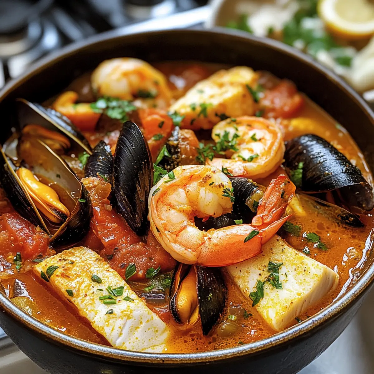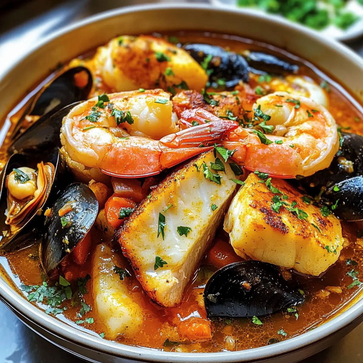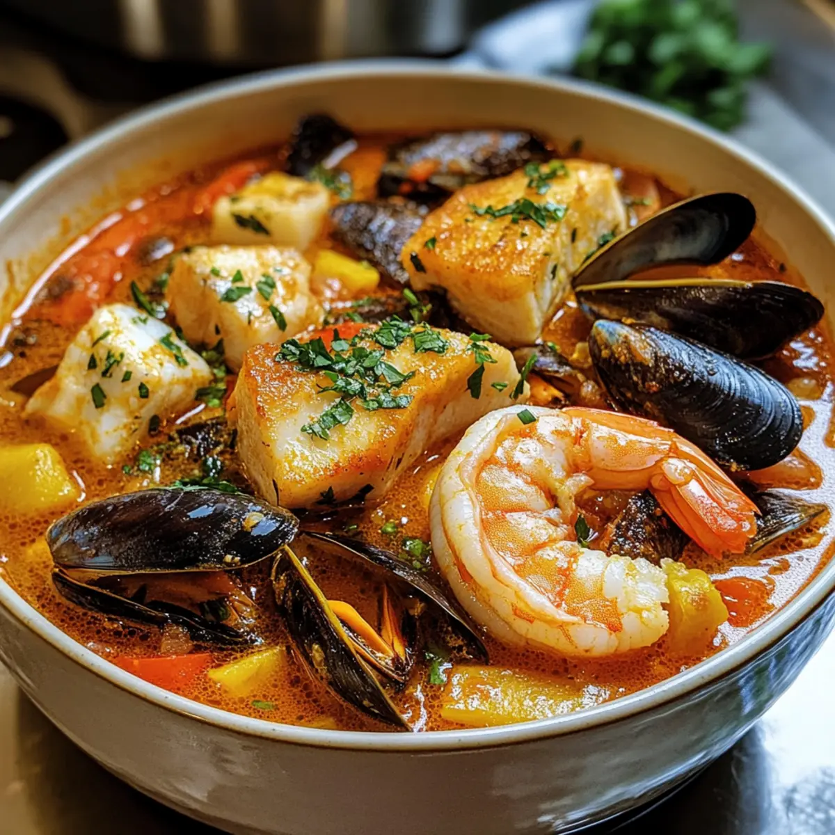 Die sanften Wellen der mediterranen Küste bringen mit jedem Löffel der Bouillabaisse einen Hauch von Zauber auf den Tisch. Diese Fischsuppe, die ihren Ursprung in der pulsierenden Hafenstadt Marseille hat, vereint frische Meeresfrüchte und aromatische Kräuter in einem reichen, goldenen Sud. Was mich immer wieder fasziniert, ist die Variabilität dieses Gerichts – du kannst es ganz nach deinem Geschmack anpassen und mit unterschiedlichsten Meeresfrüchten experimentieren. Ideal für gemütliche Familienabende oder besondere Anlässe, bringt diese Bouillabaisse nicht nur eine warme Umarmung an kalten Tagen, sondern verwandelt auch deinen Esstisch in eine gemütliche mediterrane Auszeit. Welches Meeresfrüchte-Arrangement wirst du als Nächstes ausprobieren? Warum ist Bouillabaisse so besonders? Köstliche Vielseitigkeit: Die Bouillabaisse eignet sich hervorragend für kreative Spielereien in der Küche. Frischer Geschmack: Mit frischen Meeresfrüchten bringst du das Beste der Küste auf den Tisch. Aromatischer Genuss: Der Duft von Kräutern und Gewürzen lässt dir das Wasser im Mund zusammenlaufen. Einfache Zubereitung: Auch als Anfänger in der Küche kannst du diese Fischsuppe mit Leichtigkeit meistern. Geselliges Essen: Perfekt für Familienessen oder festliche Anlässe – einfach in eine Schüssel schöpfen und genießen! Lass dich inspirieren und entdecke auch den Einfachen Pizzakuchen Perfekt oder das Einfaches Erdbeerkuss Dessert, um weitere Geschmackserlebnisse zu kreieren. Bouillabaisse Zutaten • Entdecke die köstlichen Zutaten dieser mediteranen Fischsuppe. Für die Brühe: Olivenöl – Essenziell für das Anbraten; kann durch leichtes Pflanzenöl ersetzt werden. Garnelen- und Hummerschalen – Spenden Tiefe und Aroma für die Brühe; verwende die Schalen von jeder Art von Meeresfrüchten, die du hast. Schwarzer Pfeffer – Fügt Würze hinzu; nach Geschmack anpassen. Weißer Traubensaft – Dient zum Ablöschen und sorgt für Süße; kann durch Weißwein oder Brühe ersetzt werden. Minzgemüse (Zwiebeln, Lauch, Schalotten) – Basisgeschmack der Suppe; gelbe Zwiebeln sind ein guter Ersatz, wenn Schalotten nicht verfügbar sind. Salz – Verstärkt den Geschmack; nach diätetischen Vorlieben anpassen. Muschelsaft und Wasser – Bilden die flüssige Basis der Brühe; Fischfond ist ein geschmacklicher Ersatz. Orangenabrieb – Fügt eine zitrusartige Note hinzu; kann durch Zitronenabrieb ersetzt werden. Knoblauchscheiben – Für aromatischen Geschmack; gehackter Knoblauch sorgt für einen intensiveren Geschmack. Tomatenmark und gewürfelte Tomaten – Fügen der Suppe Reichhaltigkeit und Säure hinzu; ersetze frische Tomaten durch Dosen. Safran – Bringt charakteristische Farbe und Geschmack; verwende Kurkuma als günstigere Alternative. Harissa-Gewürz – Fügt Schärfe und Komplexität hinzu; nach persönlicher Schärfetoleranz anpassen. Miso-Paste – Verleiht umami Geschmack; kann durch Sojasauce ersetzt werden. Für die Meeresfrüchte: Steinbutt (oder anderer fester Fisch) – Hauptbestandteil der Fischsuppe; kann durch Dorsch oder Schnapper ersetzt werden. Tintenfischringe – Bringen eine besondere Textur; können durch Garnelen ersetzt oder weggelassen werden. Hummer-Schwänze, Heilbutt, Jakobsmuscheln und Garnelen – Hauptmeeresfrüchte; nutze jede Kombination von frischen Meeresfrüchten. Miesmuscheln – Fügt Geschmack und schöne Präsentation hinzu; können weggelassen oder durch Muscheln ersetzt werden. Frische Kräuter (Estragon, Thymian, Petersilie) – Für Garnitur und Geschmack; jede Mischung frischer Kräuter passt gut. Die Zutaten für deine Bouillabaisse sind leicht erhältlich und bieten dir die Möglichkeit, diese Fischsuppe ganz nach deinem Geschmack zu gestalten! Schritt-für-Schritt-Anleitung für Bouillabaisse (Fischsuppe) Schritt 1: Olivenöl erhitzen In einem großen Topf erhitzt du bei mittlerer Hitze etwas Olivenöl und brätst die Garnelen- und Hummerschalen zusammen mit schwarzem Pfeffer an, bis sie leicht geröstet sind. Dies dauert etwa 5 Minuten. Die Schalen sollten goldbraun werden, was den Geschmack der Brühe vertieft und die Aromen entfaltet. Schritt 2: Brühe zubereiten Deglaziere die angebratenen Schalen mit weißem Traubensaft und lasse ihn für etwa 2 Minuten köcheln. Füge dann die fein gehackten Zwiebeln, Lauch und Schalotten, Salz, Muschelsaft und Wasser hinzu. Lass die Mischung im Topf 30-45 Minuten sanft köcheln, bis die Brühe reich an Geschmack ist, und siebe sie anschließend durch ein feines Sieb. Schritt 3: Gemüse anbraten Erhitze in einer separaten Pfanne etwas Olivenöl und brate die Zwiebeln, den Lauch und die Schalotten bei mittlerer Hitze an, bis sie weich und leicht transparent sind, das dauert etwa 4-5 Minuten. Achte darauf, sie nicht zu braun werden zu lassen, damit die Süße erhalten bleibt, die der Bouillabaisse (Fischsuppe) einen besonderen Geschmack verleiht. Schritt 4: Weitere Zutaten hinzufügen Gib die sautierten Gemüse in die Brühe und füge den Orangenabrieb, die Knoblauchscheiben, Tomatenmark, gewürfelte Tomaten, Safran, Harissa und die Miso-Paste hinzu. Lass diese Mischung für weitere 3 Minuten unter ständigem Rühren ziehen, wobei sich die Aromen wunderbar entfalten und miteinander verschmelzen. Schritt 5: Fisch hinzufügen Gieße die vorbereitete Fischbrühe in die Gemüse-Mischung und füge den in Würfel geschnittenen Steinbutt hinzu. Reduziere die Hitze auf niedrig und lass alles ca. 30 Minuten sanft köcheln. Der Fisch sollte gar und zart sein, ohne zu zerfallen, was die perfekte Konsistenz der Bouillabaisse gewährleistet. Schritt 6: Tintenfisch und Hummer garen Koche die Tintenfischringe und Hummerschwänze für ca. 3-5 Minuten in der Brühe, bis sie gerade durchgegart sind. Das Fleisch sollte opak und zart sein; überkoche es nicht, um die zarte Textur zu bewahren und das Aroma optimal zu halten. Schritt 7: Garnelen und Jakobsmuscheln braten Brate die Jakobsmuscheln und Garn