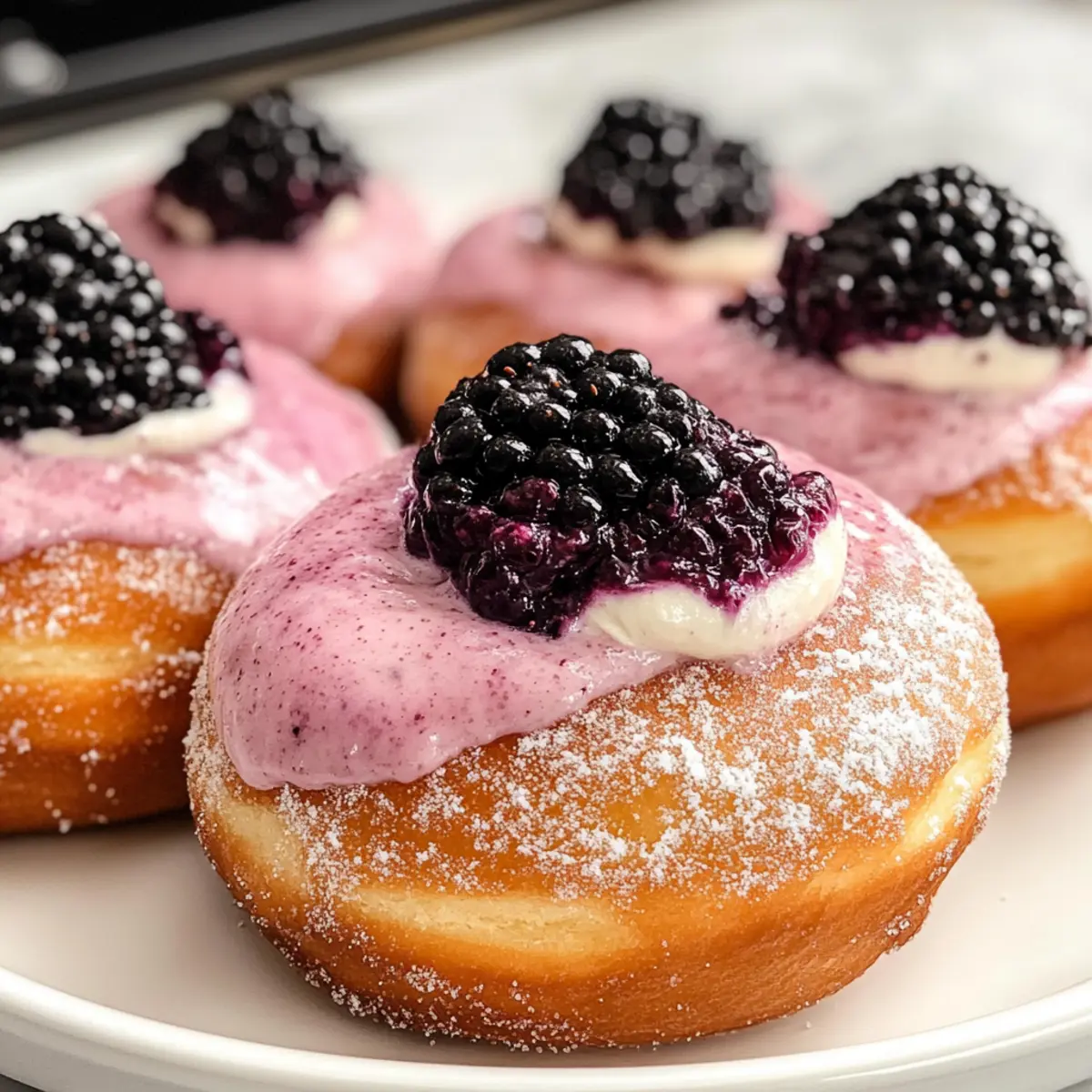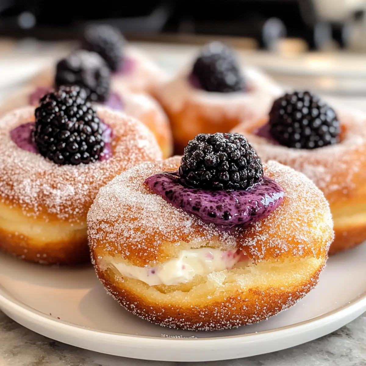 Als ich den ersten Bissen von diesen Brombeer-Käsekuchen-Donuts nahm, war es, als ob die Sonne in meinem Mund aufging. Die Kombination aus dem zarten Teig, überzogen mit einer süßen Zuckerschicht, und der frischen, cremigen Füllung aus Brombeeren ließ mein Herz höherschlagen. Diese leckeren Donuts sind nicht nur ein Traum für alle Dessertliebhaber, sondern auch ein einfaches Rezept, das selbst begeisterte Köche im Handumdrehen zaubern können. Die perfekten Begleiter zu einer Tasse Kaffee oder als süßer Snack für zwischendurch, sie bringen einen Hauch von Luxus in deinen Alltag. Bereit, deinem Gaumen eine Freude zu machen? Lass uns gemeinsam in die Welt der Brombeer-Käsekuchen-Donuts eintauchen! Warum wirst du diese Donuts lieben? Einzigartige Geschmackskombination: Diese Brombeer-Käsekuchen-Donuts vereinen die Frische von Brombeeren mit der Cremigkeit von Käsekuchen, was jeden Biss unwiderstehlich macht. Einfache Zubereitung: Mit einfachen Zutaten und klaren Schritten ist das Rezept auch für Küchenneulinge leicht nachvollziehbar. Perfekte Textur: Der weiche, fluffige Teig kombiniert mit einer leicht knusprigen Zuckerschicht sorgt für ein unvergessliches Geschmackserlebnis. Flexibel und variabel: Du kannst mit verschiedenen Beeren experimentieren oder die Donuts nach Belieben dekorieren, um sie noch einzigartiger zu machen. Jeder wird begeistert sein: Ob als besonderer Snack zum Kaffee oder als Dessert für Gäste, diese Donuts sind garantiert ein Hit! Brombeer-Käsekuchen-Donuts Zutaten Für den Teig • Butter – 50 g, geschmolzen – Fügt dem Teig Reichtum und Feuchtigkeit hinzu; Margarine als Ersatz möglich. • Lauwarmes Wasser – 110 g – Aktiviert die Hefe für das richtige Aufgehen des Teigs; warmes Milch ersetzt bringt kräftigeren Geschmack. • Frische Hefe (25 g) oder Trockenhefe (1 Päckchen) – Sorgt für das Aufgehen; Trockenhefe benötigt vorheriges Blühen in warmer Milch. • Zucker – 25 g für den Teig, 150 g zum Wenden – Süßt den Teig und verbessert den Geschmack; kann auch durch Kokoszucker ersetzt werden. • Weißmehl – 290-305 g – Hauptbestandteil für die Struktur; glutenfreies Mehl kann als Alternative genutzt werden. • Ei – 1, Zimmertemperatur – Bindet die Zutaten und bereichert den Teig; Leinsamenmehl als Ei-Ersatz möglich. • Salz – ½ Teelöffel – Verbessert den Geschmack und kontrolliert die Hefetätigkeit; unbedingt nicht weglassen. • Neutrales Öl – Wird zum Frittieren verwendet; Pflanzen- oder Rapsöl sind empfehlenswert. • Brombeeren – 80 g + Extras zur Dekoration – Gibt der Füllung ihren unverwechselbaren Geschmack; gefrorene Brombeeren sind ebenfalls geeignet. Für die Füllung • Frischkäse – 200 g – Basis für die Käsekuchenfüllung; vegane Alternativen sind auch erhältlich. • Akazienhonig – 30 g oder anderer Honig – Süßt die Füllung mit einer blumigen Note; Ahornsirup als veganer Ersatz. • Vanillepaste – 1 Teelöffel – Verleiht eine tiefe Geschmacksnote; Vanilleextrakt kann auch verwendet werden. • Puderzucker – 100 g – Süßt die Füllung und sorgt für eine cremige Textur; Maisstärke kann als Dickungsmittel dienen. • Schlagsahne – 50 g – Für eine reichhaltige Füllung; vollfette Kokosmilch als milchfreie Option. Tipps zur Zubereitung • Achte darauf, dass das Wasser lauwarm ist – etwa 37ºC für eine korrekte Aktivierung der Hefe. • Frittieren nicht überfüllen – Maximal zwei Donuts auf einmal, um gleichmäßiges Frittieren zu gewährleisten. • Lass die Donuts vollständig abkühlen – Dadurch verhinderst du, dass die Füllung schmilzt. Mit diesen Zutaten kannst du die köstlichen Brombeer-Käsekuchen-Donuts ganz einfach selbst machen und sicherstellen, dass jeder Biss ein Genuss ist! Schritt-für-Schritt-Anleitung für Brombeer-Käsekuchen-Donuts Step 1: Teig vorbereiten Schmelze die Butter und vermische sie mit dem lauwarmen Wasser in einer Schüssel. Bröckele die Hefe hinein und rühre, bis sie vollständig aufgelöst ist. Dies aktiviert die Hefe und sorgt dafür, dass dein Teig später schön aufgeht. Step 2: Zutaten kombinieren Gib nach und nach das Weißmehl, den Zucker und das Salz in die Schüssel und vermische alles gründlich. Knete den Teig, bis er glatt und leicht klebrig ist, was etwa 5–7 Minuten dauern sollte. Der Teig sollte geschmeidig sein, aber nicht an den Händen kleben bleiben. Step 3: Erste Gare Forme den Teig zu einer Kugel und lege ihn in eine leicht geölte Schüssel. Decke die Schüssel mit einem sauberen Küchentuch ab und lasse den Teig an einem warmen Ort für etwa 45 Minuten steigen, bis er sein Volumen verdoppelt hat. Achte darauf, dass er schön aufgeht und luftig wird. Step 4: Donuts formen Knete den aufgegangenen Teig vorsichtig und rolle ihn auf einer bemehlten Fläche etwa 1 cm dick aus. Verwende einen Ausstecher, um Donuts auszustechen, und lege sie auf kleine Stücke Backpapier. Lass die Donuts 30–45 Minuten ruhen, damit sie nochmals leicht aufgehen können. Step 5: Öl erhitzen Erhitze in einem großen Topf neutrales Öl auf 180ºC. Um die richtige Temperatur zu überprüfen, kannst du einen kleinen Teigrest ins Öl geben – wenn er sofort hochkommt und blubbert, ist das Öl bereit. Achte darauf, dass genügend Öl vorhanden ist, um die Donuts vollständig zu bedecken. Step 6: Donuts frittieren Frittiere jeweils zwei Donuts für etwa 2 Minuten pro Seite, bis sie goldbraun sind. Verwende eine Schaumkelle, um die Donuts vorsichtig aus dem Öl zu nehmen, und lass sie auf einem Küchentuch abtropfen. Nach dem Abkühlen wende sie in Zucker, damit sie einen süßen Überzug erhalten. Step 7: Füllung zubereiten Püriere die frischen Brombeeren in einem Mixer, bis sie glatt sind. Vermische das Brombeerpüree dann mit dem Frischkäse, Akazienhonig, Vanillepaste und Puderzucker, bis eine gleichmäßige und cremige Masse entsteht. Diese leckere Füllung bringt den Geschmack deiner Brombeer-Käsekuchen-Donuts 