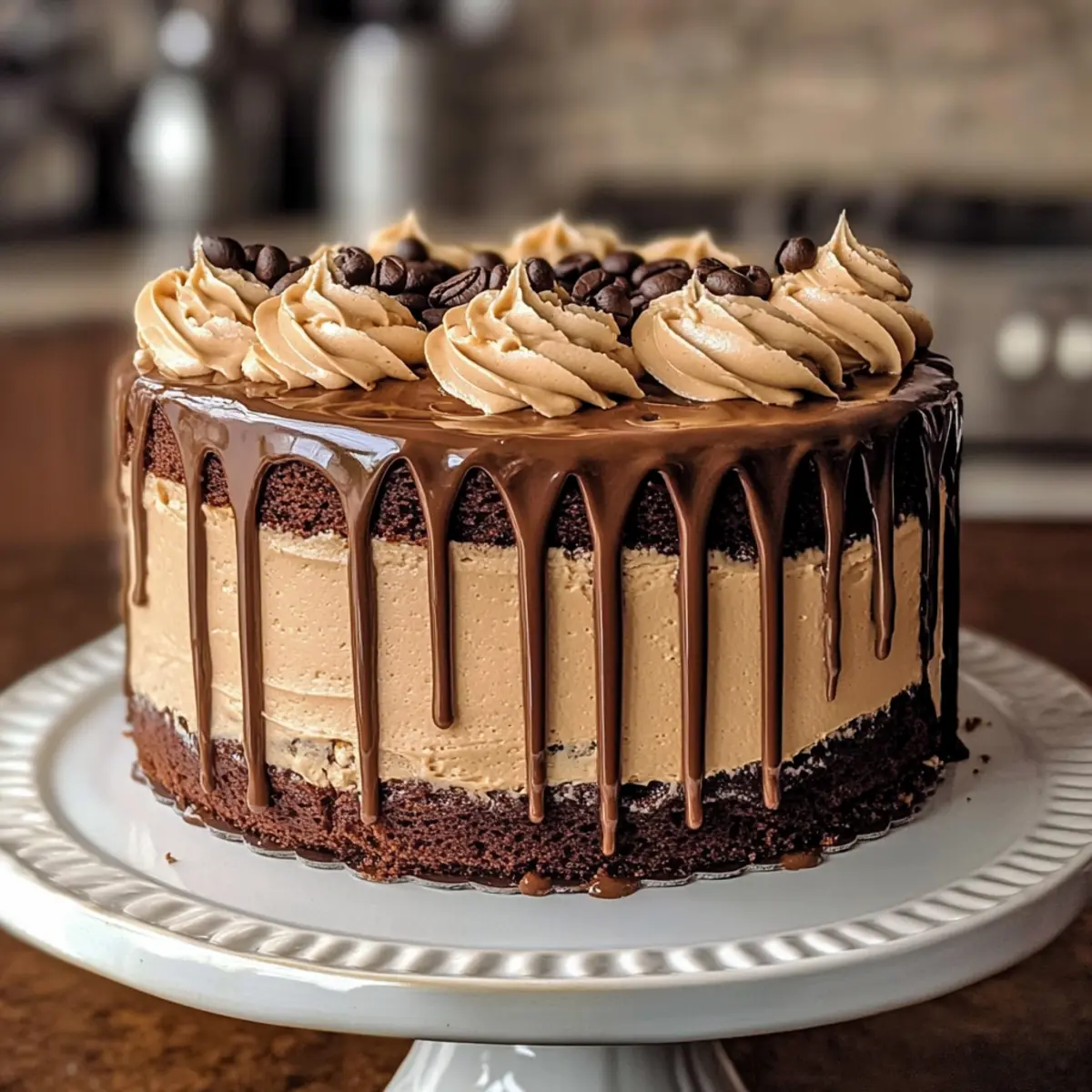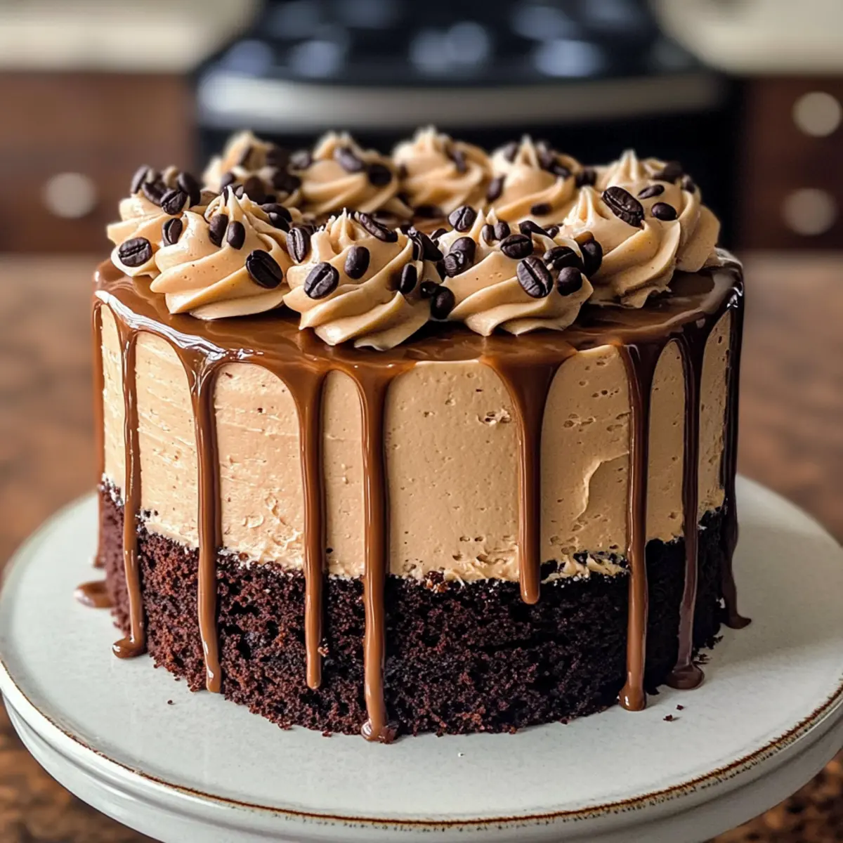 Nachdem die Buttercreme fest ist, nimm den Kuchen aus dem Kühlschrank. Gieße die abgekühlte Ganache gleichmäßig über den oberen Rand des Kuchens, damit sie langsam an den Seiten hinunterläuft. Du kannst den Kuchen nach Belieben mit weiteren Buttercreme-Tupfen und Kakaopulver dekorieren, um den Cappuccino Kuchen noch festlicher zu gestalten.