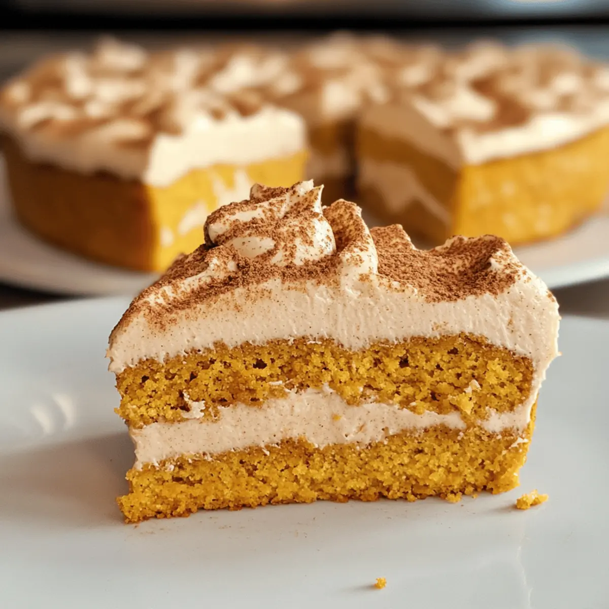Sobald der Kuchen abgekühlt ist, nehmen Sie ihn aus der Form und platzieren ihn auf einem Servierteller. Verteilen Sie die Zimtcreme gleichmäßig auf der Oberfläche und bestäuben Sie sie mit Pumpkin Spice Gewürz für den letzten Schliff. Kühlen Sie den Kuchen bis zum Servieren, damit die Creme fest wird und sich die Aromen verbinden.