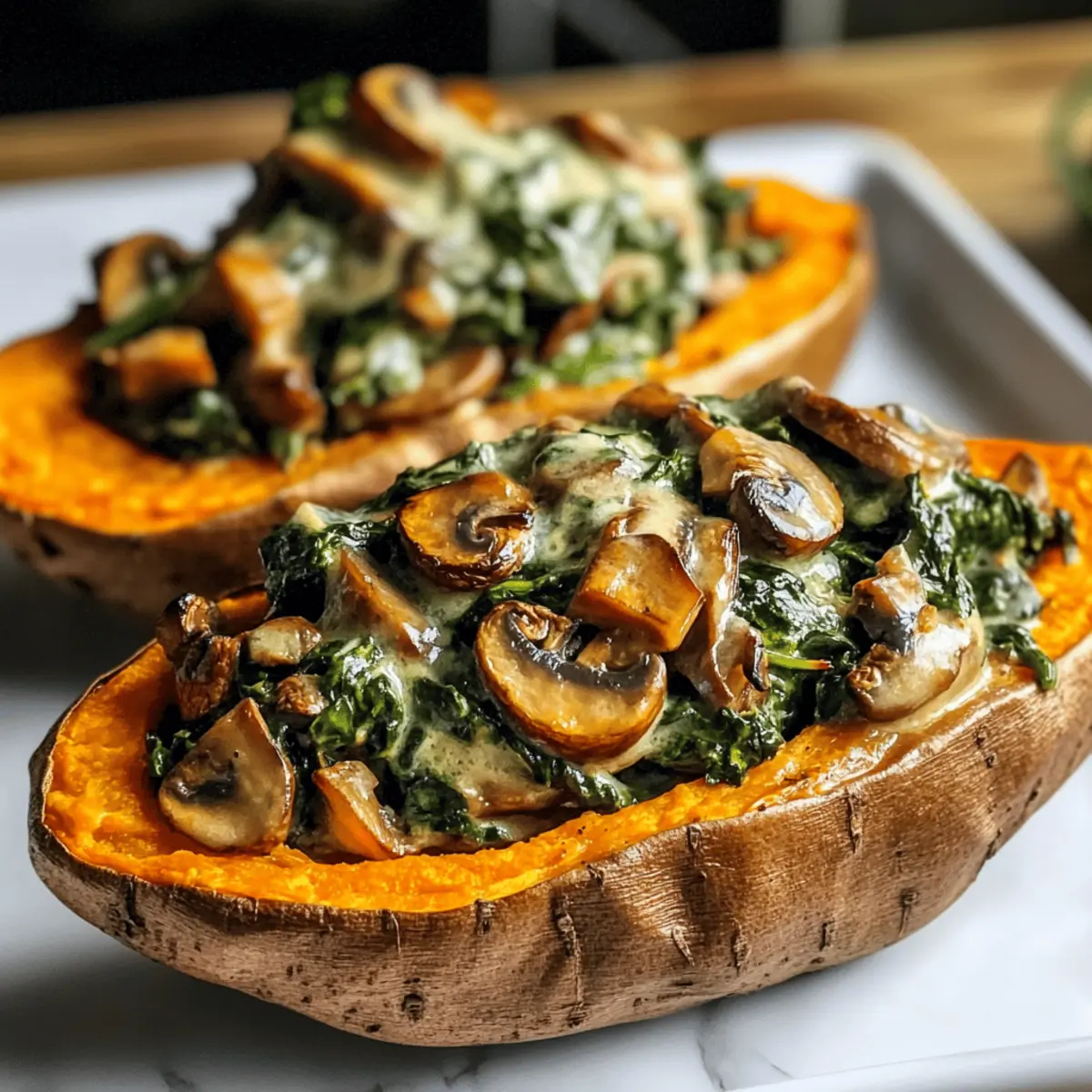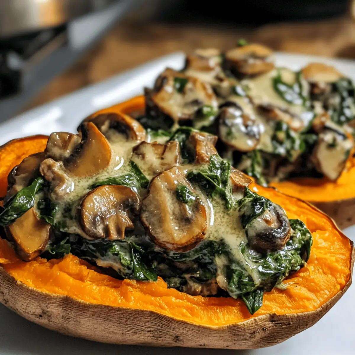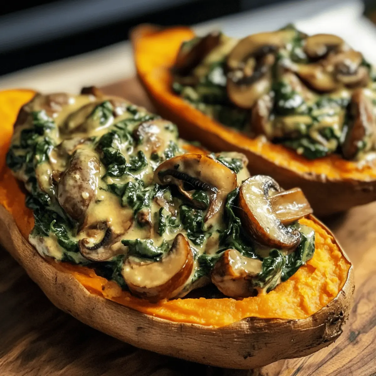 Im Herzen meiner Küche erlebte ich kürzlich einen kleinen Triumph: ein Gericht, das nicht nur sättigt, sondern auch das Herz erwärmt. Diese creamy stuffed sweet potatoes with mushrooms and spinach vereinen die natürliche Süße von gebackenen Süßkartoffeln mit einer cremigen, herzhaften Füllung aus Pilzen und frischem Spinat. Es ist die perfekte Lösung für alle, die schnell eine gesunde Mahlzeit zaubern möchten, ohne dabei auf Geschmack zu verzichten. Dieses vegane und glutenfreie Rezept ist nicht nur eine nahrhafte Option für hektische Abende, sondern auch ein echter Publikumsliebling – selbst die Kleinen werden nicht genug davon bekommen! Neugierig, wie einfach es ist, diesen Wohlfühl-Klassiker zu kreieren? Lass uns gemeinsam in die Zubereitung eintauchen! Warum werden Sie dieses Rezept lieben? Einfachheit: Die Zubereitung ist kinderleicht und benötigt nur grundlegende Kochkenntnisse. Ideal für vielbeschäftigte Tage, wenn die Zeit knapp ist. Gesunde Komfortnahrung: Diese cremigen gefüllten Süßkartoffeln mit Pilzen und Spinat bieten nicht nur eine nahrhafte Basis, sondern sind auch köstlich und sättigend. Vielseitigkeit: Sie können die Pilze mit anderen Gemüsesorten austauschen, wie Zucchini oder Paprika, um neue Geschmäcker zu entdecken. Crowd-Pleaser: Ob beim Familienessen oder einer gemütlichen Einladung, dieses Gericht kommt garantiert gut an und bringt alle zusammen. Werfen Sie auch einen Blick auf unser Rezept für Mini Waffel Sandwich mit Spinat für eine weitere köstliche Idee! Nährstoffreich: Dank der Zutaten sind diese Süßkartoffeln nicht nur lecker, sondern auch voller Vitamine und Ballaststoffe. Perfekt für jede Mahlzeit des Tages! Zutaten für cremige gefüllte Süßkartoffeln • Diese köstlichen, veganen Süßkartoffeln sind nicht nur einfach zuzubereiten, sondern auch gesund und vollgepackt mit Geschmack! Für die Süßkartoffeln Süßkartoffeln – Sie bieten die perfekte Basis mit natürlicher Süße; mediumgroße Kartoffeln lassen sich am besten handhaben. Für die Füllung Pilze – Cremini oder Champignon sorgen für einen herzhaften Umami-Geschmack; jede Pilzsorte passt gut. Frischer Spinat – Gibt dem Gericht eine vitaminreiche Note; kann auch durch Grünkohl ersetzt werden für eine spannende Abwechslung. Tahini – Für eine cremige Konsistenz und nussigen Geschmack; alternativ können Sie auch Cashewcreme verwenden. Nährhefe – Verleiht der Füllung einen käsigen Geschmack, ohne tierische Produkte, und ist eine tolle Ergänzung zu den cremigen gefüllten Süßkartoffeln mit Pilzen und Spinat. Knoblauch und Zwiebel – Für ein aromatisches Fundament; verwenden Sie frische oder pulverisierte Varianten, je nach Vorliebe. Zusätzliche Aromen Rote Paprikaflocken – Für einen extra Kick; einfach in die Füllung mischen, wenn Sie es würziger mögen. Schritt-für-Schritt-Anleitung für cremige gefüllte Süßkartoffeln mit Pilzen und Spinat Step 1: Süßkartoffeln backen Heize den Ofen auf 200°C vor. Steche mit einer Gabel kleine Löcher in die Süßkartoffeln, um Dampf entweichen zu lassen. Lege die Süßkartoffeln auf ein Backblech und backe sie etwa 40 Minuten lang, bis sie weich sind. Du kannst testen, ob sie gar sind, indem du mit einer Gabel hineinstechst – sie sollten leicht durchdringbar sein. Step 2: Füllung zubereiten Erhitze in einer großen Pfanne etwas Öl bei mittlerer Hitze. Füge die fein gehackten Zwiebeln und den Knoblauch hinzu und brate sie, bis sie duften, etwa 2-3 Minuten. Füge dann die gewürfelten Pilze hinzu und brate sie an, bis sie goldbraun sind, was etwa 5-7 Minuten in Anspruch nehmen sollte. Step 3: Spinat hinzufügen Wenn die Pilze schön gebräunt sind, gib den frischen Spinat in die Pfanne. Rühre alles gut um, bis der Spinat wiltingt, was ca. 2-3 Minuten dauert. Die Mischung sollte jetzt aromatisch und bunt sein – das perfekte Vorzeichen für die cremigen gefüllten Süßkartoffeln mit Pilzen und Spinat. Step 4: Cremigkeit erzeugen Sobald der Spinat zusammengefallen ist, reduzieren wir die Hitze und fügen Tahini und Nährhefe zur Mischung hinzu. Rühre alles gut durch, bis eine cremige Konsistenz erreicht ist. Die Füllung sollte schön zusammenhalten und samtig aussehen; dies bringt den herzhaften Geschmack in die cremigen gefüllten Süßkartoffeln. Step 5: Süßkartoffeln füllen Nachdem die Süßkartoffeln aus dem Ofen sind, nimm sie vorsichtig heraus und lasse sie kurz abkühlen. Halbiere jede Süßkartoffel der Länge nach und schüre das Innere ein wenig auf. Fülle jede Hälfte großzügig mit der cremigen Pilz-Spinat-Mischung. Achte darauf, die Füllung gleichmäßig zu verteilen, um die Süßkartoffeln optimal zu genießen. Step 6: Servieren Die gefüllten Süßkartoffeln können warm serviert werden. Sie eignen sich hervorragend als Hauptgericht oder als sättigende Beilage. Du kannst sie nach Belieben mit zusätzlichen Gewürzen oder Kräutern garnieren, um den Geschmack noch zu verstärken und deine Gäste zu beeindrucken! Was passt gut zu cremigen gefüllten Süßkartoffeln mit Pilzen und Spinat? Die perfekte Balance zu diesem herzhaften Gericht kommt durch eine Vielzahl leckerer Beilagen und Getränke, die sowohl Geschmack als auch Textur harmonisch ergänzen. Frische grüne Salate: Ein einfacher grüner Salat mit einem leicht zitronigen Dressing erfrischt und kontrastiert die Cremigkeit der gefüllten Süßkartoffeln. Knuspriges Brot: Ein Stück geröstetes Vollkornbrot eignet sich hervorragend, um die köstliche Füllung aufzutunken. Es sorgt für den perfekten Crunch dazu. Gegrilltes Gemüse: Zucchini und Paprika, gegrillt mit italienischen Kräutern, fügen dem Teller eine schöne Rauchnote hinzu und steigern die Vitamine. Hummus-Dip: Ein käsiger Hummus in verschiedenen Geschmacksrichtungen ergänzt wunderbar die Füllung und bietet eine extra Portion Protein. Zitronen-Ingwer-Tee: Ein warmer, würziger Tee erfrischt den Gaumen und rundet das Essen mit einem zarte, pri