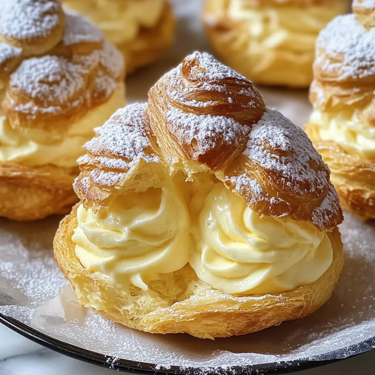 9. Setze die Oberteile wieder auf und bestäube alles mit Puderzucker, um deinem cremigen Windbeutel die besondere Note zu verleihen.