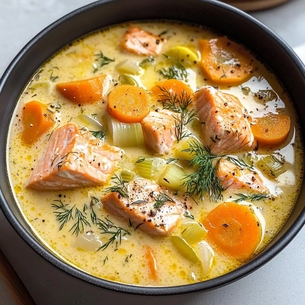 • Zarte Konsistenz: Achte darauf, den Lachs nicht zu lange zu kochen; er sollte zart und flockig bleiben, um die perfekte Textur in deiner cremigen finnischen Lachsuppe mit Dill und Crème Fraîche zu erzielen.