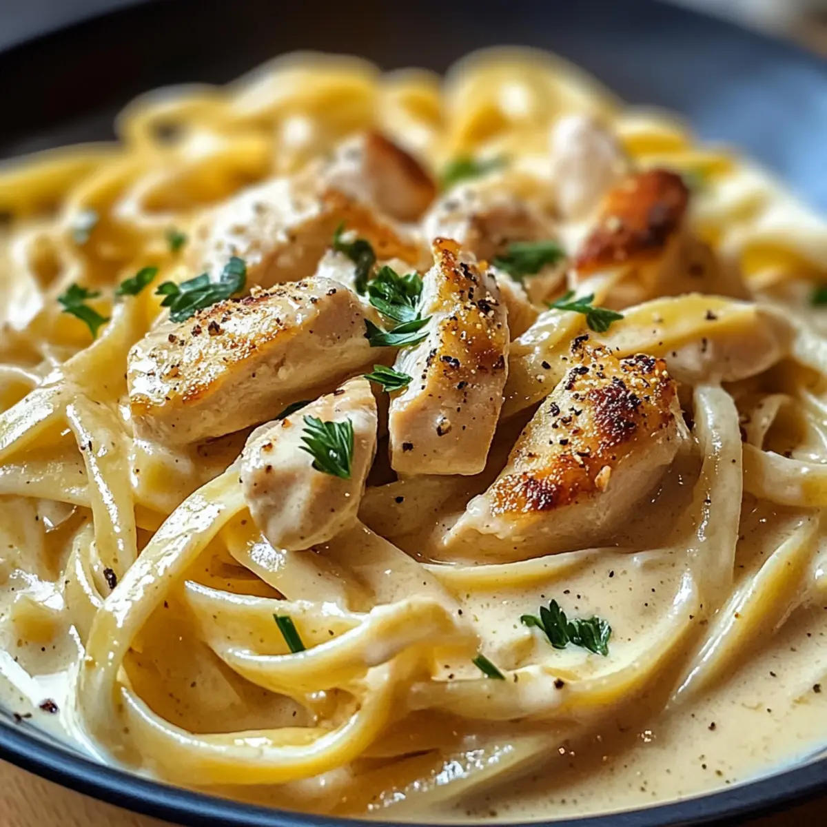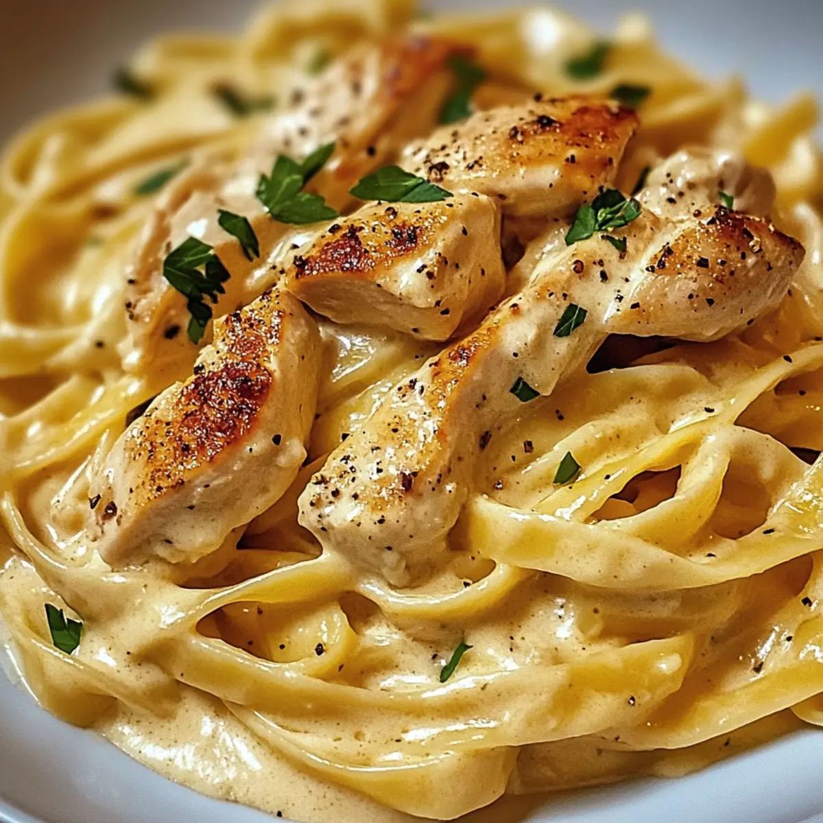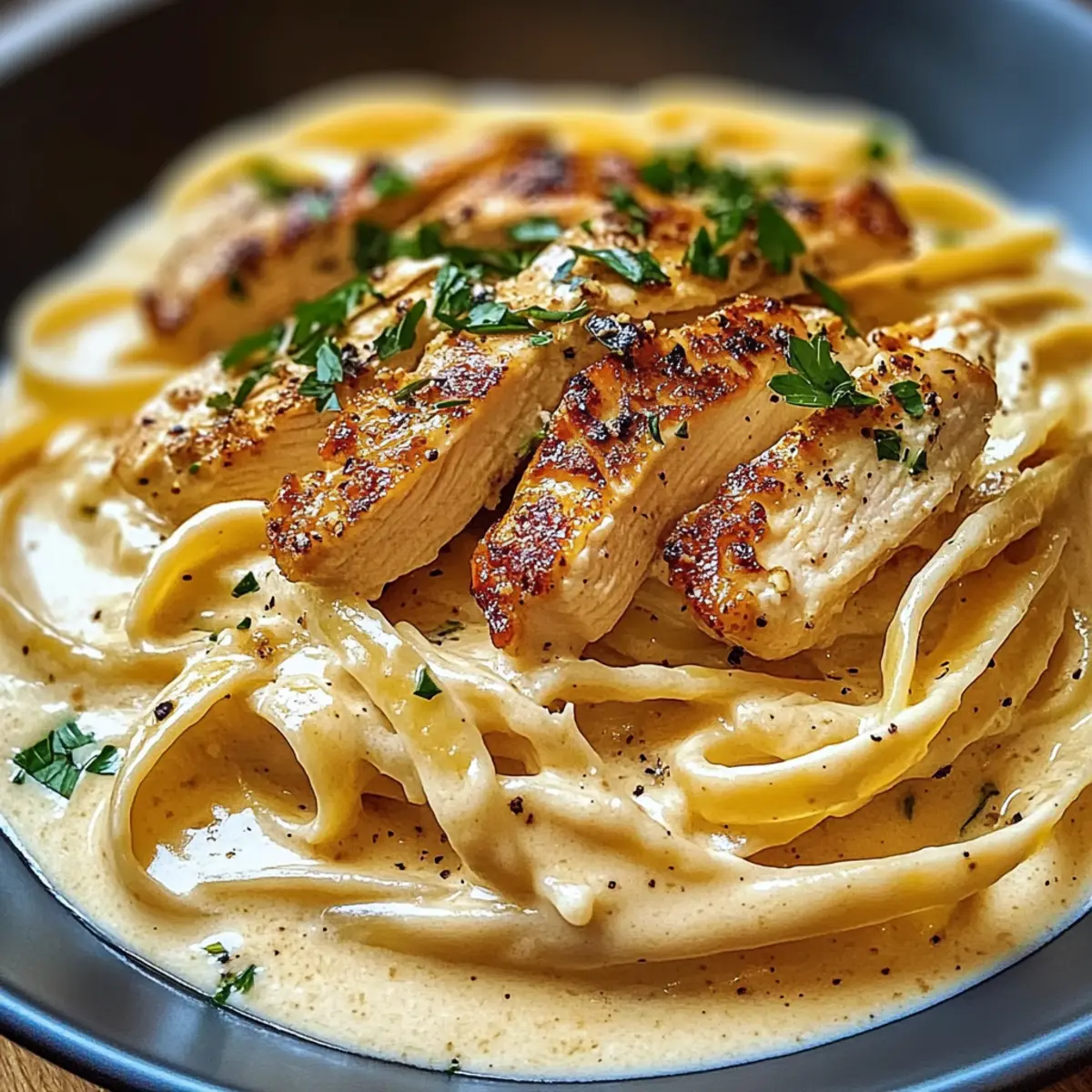 Als ich neulich in meiner Küche stand, überkam mich der unwiderstehliche Duft von frisch geriebenem Parmesan und gebratenem Hähnchen. Ich wusste sofort, dass es Zeit für meine köstlichen Cremigen Hähnchen-Alfredo-Nudeln war! Dieses italienisch inspirierte Gericht ist nicht nur unglaublich einfach zuzubereiten, sondern zaubert auch an hektischen Abenden in kürzester Zeit ein Stück Restaurant-Feeling auf den Tisch. Die Kombination aus cremiger Soße, zartem Hähnchen und al dente Nudeln sorgt für ein Wohlfühlerlebnis, das selbst die anspruchsvollsten Esser begeistert. Perfekt für alle, die eine herzhafte, schnelle Mahlzeit suchen, ohne dabei auf Geschmack verzichten zu müssen. Lasst euch von diesem Rezept verführen – seid ihr bereit, das Geheimnis des perfekten Alfredo zu entdecken? Warum wirst du dieses Rezept lieben? Einfachheit: Die Zubereitung der Cremigen Hähnchen-Alfredo-Nudeln ist kinderleicht und erfordert keine besonderen Fähigkeiten – perfekt für Kochanfänger! Köstlicher Geschmack: Die harmonische Kombination aus frischer Sahne, zartem Hähnchen und aromatischen Gewürzen sorgt für ein Geschmackserlebnis, das euch umhauen wird. Vielseitigkeit: Ihr könnt dieses Rezept nach Belieben anpassen, beispielsweise mit Gemüse wie Brokkoli oder Spinat für eine gesunde Note. Zeitersparnis: In nur 30 Minuten habt ihr ein samtiges Gericht auf dem Tisch, das garantiert auch den schnellsten Feierabend begeistert. Familienfreundlich: Diese Pasta wird selbst die wählerischsten Esser überzeugen und ist perfekt für ein schnelles Abendessen mit der ganzen Familie. Restaurantqualität zu Hause: Mit dieser Rezeptur bringt ihr das Gefühl eines Gourmet-Gerichts direkt in eure heimische Küche – ideal für besondere Anlässe oder einfach nur so! Cremige Hähnchen-Alfredo-Nudeln Zutaten Für die Sauce • Sahne – sorgt für die herrlich cremige Textur. • Frisch geriebener Parmesan – verleiht eine würzige Note und hilft, die Sauce zu binden; frisch ist immer besser! • Knoblauchzehen – bringt ein wunderbares Aroma ins Spiel; frischer Knoblauch ist ideal. • Butter – intensiviert den Geschmack der Sauce. • Salz und Pfeffer – unverzichtbare Gewürze, um das Gericht abzurunden. • Italienische Gewürze – optional, aber perfekt zum Verfeinern der Geschmackstiefe. Für das Hähnchen • Hähnchenbrustfilet – die Hauptquelle für Protein und bietet die nötige Substanz für das Gericht; für eine vegetarische Variante einfach Tofu verwenden. Für die Nudeln • Fettuccine oder andere Nudeln – die Basis für dieses köstliche Gericht; glutenfreie Pasta ist eine tolle Alternative! Für die Garnitur • Frische Petersilie zur Garnitur – verleiht Farbe und Frische; kann weggelassen werden, falls gewünscht. Die Cremigen Hähnchen-Alfredo-Nudeln sind ein Fest für eure Sinne und ideal für alle, die eine schnelle, aber dennoch geschmackvolle Mahlzeit lieben! Schritt-für-Schritt-Anleitung für Cremige Hähnchen-Alfredo-Nudeln Step 1: Nudeln kochen Kocht die Fettuccine oder eure Lieblingsnudeln in einem großen Topf mit sprudelndem Salzwasser, bis sie al dente sind, etwa 8–10 Minuten. Achtet darauf, die Nudeln gelegentlich umzurühren, damit sie nicht zusammenkleben. Sobald sie fertig sind, gießt sie ab und hebt etwas Kochwasser für später auf. Step 2: Hähnchen würzen Während die Nudeln kochen, würzt die Hähnchenbrustfilets großzügig mit Salz und Pfeffer. Dies gibt dem Fleisch von Anfang an Geschmack. Schnitt das Hähnchen in mundgerechte Stücke, sodass es gleichmäßig in der Pfanne braten kann. Step 3: Hähnchen anbraten Erhitzt in einer großen Pfanne bei mittlerer Hitze 2 Esslöffel Butter. Wenn die Butter geschmolzen und leicht schaumig ist, fügt das gewürzte Hähnchen hinzu. Bratet es etwa 5–7 Minuten lang, bis es goldbraun ist und die Innentemperatur 75 °C erreicht, dann nehmt es aus der Pfanne und stellt es beiseite. Step 4: Knoblauch hinzufügen In der gleichen Pfanne, in der das Hähnchen gebraten wurde, gebt den fein gehackten Knoblauch hinzu und bratet ihn für etwa 1 Minute an, bis er duftet. Achtet darauf, dass er nicht anbrennt, da er bitter werden kann. Diese aromatische Basis verleiht der cremigen Sauce zusätzlichen Geschmack. Step 5: Sahne einrühren Für die cremige Sauce die Hitze auf niedrig stellen und die Sahne vorsichtig in die Pfanne gießen. Lasst die Mischung 2–3 Minuten leicht köcheln, während ihr regelmäßig umrührt. Die Sahne sollte beginnen, leicht einzudicken und eine wundervolle, cremige Konsistenz zu entwickeln. Step 6: Parmesan einrühren Fügt den frisch geriebenen Parmesan nach und nach zur Sauce hinzu und rührt stetig um, bis er vollständig geschmolzen ist. Dies wird die Sauce weiter verdicken und ihr eine himmlische Cremigkeit verleihen. Schmeckt die Sauce ab und passt sie mit italienischen Gewürzen, Salz und Pfeffer an. Step 7: Nudeln vermengen Jetzt mixt die vorab gekochten Nudeln vorsichtig mit der cremigen Sauce, bis sie gleichmäßig bedeckt sind. Falls die Sauce zu dick ist, gebt nach Bedarf einen Schuss des aufgehobenen Nudelswassers hinzu, um die gewünschte Konsistenz zu erreichen. Step 8: Anrichten und servieren Lasst die cremigen Hähnchen-Alfredo-Nudeln 1-2 Minuten erhitzen, bis alles gut durchgewärmt ist. Serviert das Gericht heiß und garniert es nach Belieben mit frischer Petersilie für einen zusätzlichen Farbakzent. Guten Appetit! Cremige Hähnchen-Alfredo-Nudeln für eine stressfreie Vorbereitung Die Cremigen Hähnchen-Alfredo-Nudeln sind perfekt für eure Mahlzeitenplanung! Ihr könnt die Hähnchenbrustfilets bereits bis zu 24 Stunden im Voraus marinieren, damit sie den vollen Geschmack aufnehmen. Gekocht könnt ihr die Nudeln und die Sauce ebenfalls bis zu 3 Tage im Voraus zubereiten; bewahrt alles in luftdichten Behältern im Kühlschrank auf, um die Qualität zu bewahren. Beim Aufwärmen einfach etwas Sahne oder Wasser hinzufügen, um die cremige Konsistenz wiederherzustel