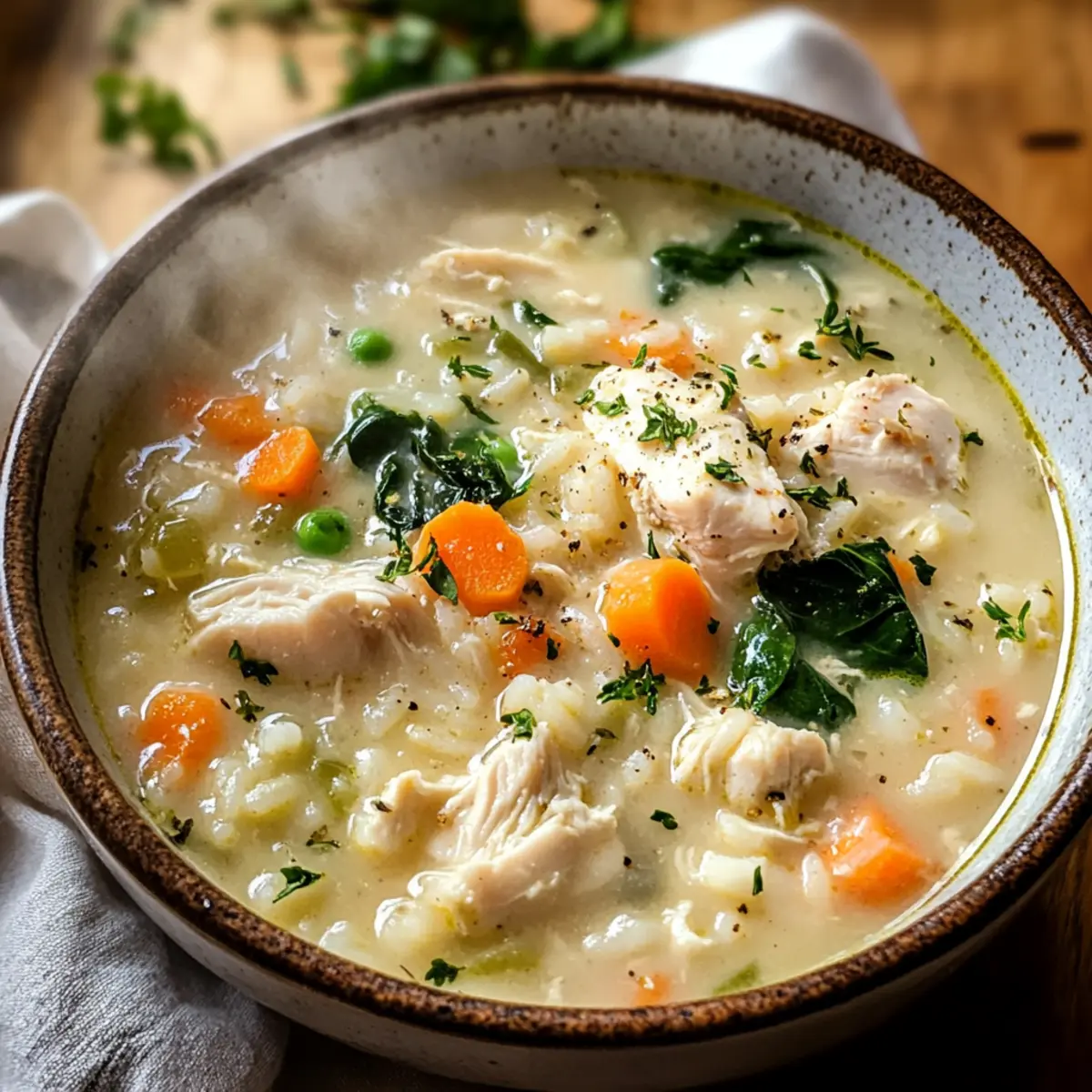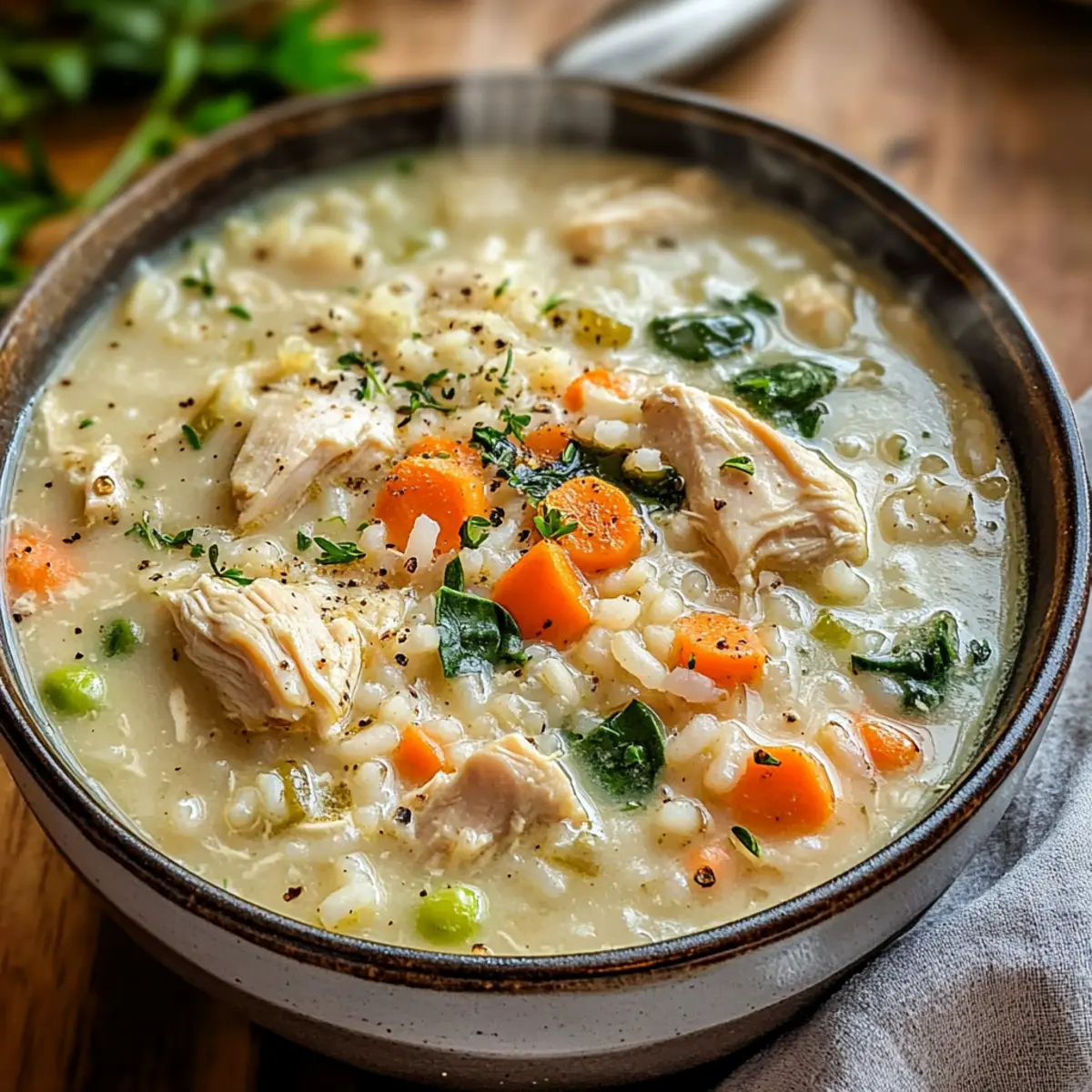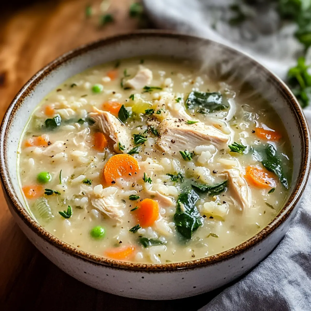 Küche ist Magie – und an kühlen Tagen gibt es nichts Besseres als eine wärmende Schüssel voll von cremiger Hühner-Reis-Suppe. Wenn der Wind draußen pfeift und die Dunkelheit sich langsam über die Stadt legt, ist diese Suppe der Inbegriff von Wohlfühlmahlzeiten, die nicht nur den Bauch, sondern auch die Seele wärmt. Mit saftigem Hühnchen, zartem Reis und einer soft-cremigen Brühe lässt sich diese schnelle und nahrhafte Speise ganz nach Ihrem Geschmack anpassen – ob glutenfrei oder mit einem gesunden Twist! Ideal für Familienessen oder als warme Umarmung an Tagen, an denen man etwas Trost braucht. Neugierig, wie Sie diese einfache, aber köstliche Suppe zubereiten können? Lassen Sie uns gemeinsam in die kulinarische Welt der cremigen Hühner-Reis-Suppe eintauchen! Warum sollten Sie diese Suppe lieben? Wohlige Komfort: Diese cremige Hühner-Reis-Suppe ist das perfekte Seelenfutter, das Sie an kalten Tagen umhüllt. Einfache Zubereitung: Mit nur wenigen Grundzutaten zaubern Sie in kürzester Zeit ein herzhaftes Gericht. Vielseitigkeit: Spielen Sie mit verschiedenen Gemüsesorten oder Reisarten, um Ihrer Familie immer wieder neue Varianten zu präsentieren. Gesunde Wahl: Mit der Möglichkeit, glutenfreie und leichtere Alternativen einzusetzen, bleibt diese Suppe nie langweilig. Crowd-Pleaser: Egal ob für ein Familientreffen oder einen gemütlichen Abend, jeder wird nach einer zusätzlichen Schüssel fragen! Profitieren Sie auch von unseren Tipps für gesunde Mahlzeiten. Cremige Hühner-Reis-Suppe Zutaten Für die Suppe • Hühnchen – sorgt für eine hervorragende Proteinquelle und verleiht der Suppe ihren herzhaften Geschmack. Substitution: Putenfleisch kann verwendet werden. • Reis – macht die Suppe sämig und sättigend. Substitution: Brauner oder Wildreis erhöht den Nährwert. • Milch oder Sahne – gibt der Suppe die cremige, samtige Textur. Substitution: Verwenden Sie fettarme Milch oder pflanzliche Alternativen für eine leichtere Option. • Gemüse (z.B. Karotten, Sellerie, Spinat) – fügt Nährstoffe und Ballaststoffe hinzu. Substitution: Verwenden Sie saisonales Gemüse nach Wahl. • Kräuter und Gewürze – für eine aromatische Vertiefung, wie z.B. frisch gehackte Petersilie oder Thymian. Passen Sie nach Ihrem Geschmack an. Für den perfekten Genuss • Frisches Brot – ideal zum Dippen in die cremige Hühner-Reis-Suppe. • Leichter Salat – bietet einen erfrischenden Kontrast und ergänzt die Suppe perfekt. Schritt-für-Schritt-Anleitung für Cremige Hühner-Reis-Suppe Step 1: Hühnchen anbraten Erhitzen Sie einen großen Topf bei mittlerer Hitze und fügen Sie etwas Öl hinzu. Geben Sie das gewürfelte Hühnchen hinein und braten Sie es etwa 5-7 Minuten lang an, bis es goldbraun und durchgegart ist. Achten Sie darauf, das Hühnchen regelmäßig zu wenden, damit es gleichmäßig brät. Step 2: Gemüse hinzufügen Fügen Sie nun gewaschenes und gewürfeltes Gemüse wie Karotten und Sellerie hinzu und braten Sie es für weitere 3-4 Minuten an, bis es leicht weich ist. Rühren Sie alles gut um, damit sich die Aromen entfalten können und das Gemüse die Farbe des Hühnhens annimmt. Step 3: Reis und Brühe dazugeben Geben Sie den gewählten Reis in den Topf zur Hühnersuppe und vermischen Sie alles gut. Gießen Sie dann die Brühe oder das Wasser hinzu, bis alles gut bedeckt ist. Bringen Sie die Mischung zum Kochen und achten Sie darauf, dass es blubbert, was einen wunderbaren Duft erzeugt. Step 4: Köcheln lassen Reduzieren Sie die Hitze auf niedrig und lassen Sie die Suppe 20-30 Minuten lang köcheln. Überprüfen Sie den Reis zwischendurch und rühren Sie gelegentlich um, bis er zart und geschmackvoll ist. Die Cremige Hühner-Reis-Suppe sollte jetzt eine schöne Konsistenz erreichen. Step 5: Milch oder Sahne hinzufügen Rühren Sie die Milch oder Sahne in die Suppe, um ihr eine cremige Textur zu verleihen. Achten Sie darauf, die Hitze niedrig zu halten, damit die Suppe nicht kocht, da dies die Konsistenz der Milch beeinträchtigen kann. Lassen Sie die Suppe für weitere 5 Minuten sanft erwärmen. Step 6: Mit Kräutern verfeinern Zum Abschluss fügen Sie frisch gehackte Kräuter wie Petersilie oder Thymian hinzu, um der Suppe eine aromatische Tiefe zu verleihen. Rühren Sie alles gut um und lassen Sie die Aromen sich für ein paar Minuten entfalten, bevor Sie die cremige Hühner-Reis-Suppe servieren. Vorbereitung für die Cremige Hühner-Reis-Suppe Diese cremige Hühner-Reis-Suppe kann hervorragend im Voraus zubereitet werden, um Ihnen wertvolle Zeit in der hektischen Woche zu sparen. Bereiten Sie das Hühnchen und das Gemüse bis 24 Stunden vor dem Verzehr vor, indem Sie sie in der Pfanne anbraten und in einem luftdichten Behälter im Kühlschrank aufbewahren. Der Reis lässt sich ebenfalls für bis zu 3 Tage gekocht lagern; fügen Sie ihn einfach während der letzten Schritte der Zubereitung hinzu. Um die Qualität zu bewahren, erwärmen Sie die Suppe sanft und fügen Sie die Milch oder Sahne erst beim Servieren hinzu, damit sie nicht gerinnt. Genießen Sie diese wohltuende Suppe mit minimalem Aufwand! Expert Tips für Cremige Hühner-Reis-Suppe Konsistenz anpassen: Wenn Sie die Suppe dicker mögen, können Sie püriertes Gemüse oder eine Mehl-Butter-Mischung hinzufügen, um mehr Cremigkeit zu erreichen. Sanft erhitzen: Achten Sie darauf, nach dem Hinzufügen von Milch oder Sahne die Suppe nur sanft zu erhitzen, um das Gerinnen zu vermeiden und die cremige Textur zu bewahren. Aromen intensivieren: Lassen Sie die Suppe nach dem Kochen etwas länger ziehen, damit sich die Aromen optimal entfalten können. Dies macht die cremige Hühner-Reis-Suppe besonders geschmackvoll. Variationen ausprobieren: Experimentieren Sie mit anderen Gemüse- und Reisarten, wie Quinoa oder Bulgur, um der Suppe eine neue Note und zusätzliche Nährstoffe zu verleihen. Glutenfrei machen: Verwenden Sie glutenfreie Brühe und Verdickungsmittel, damit auch Menschen mit Glu