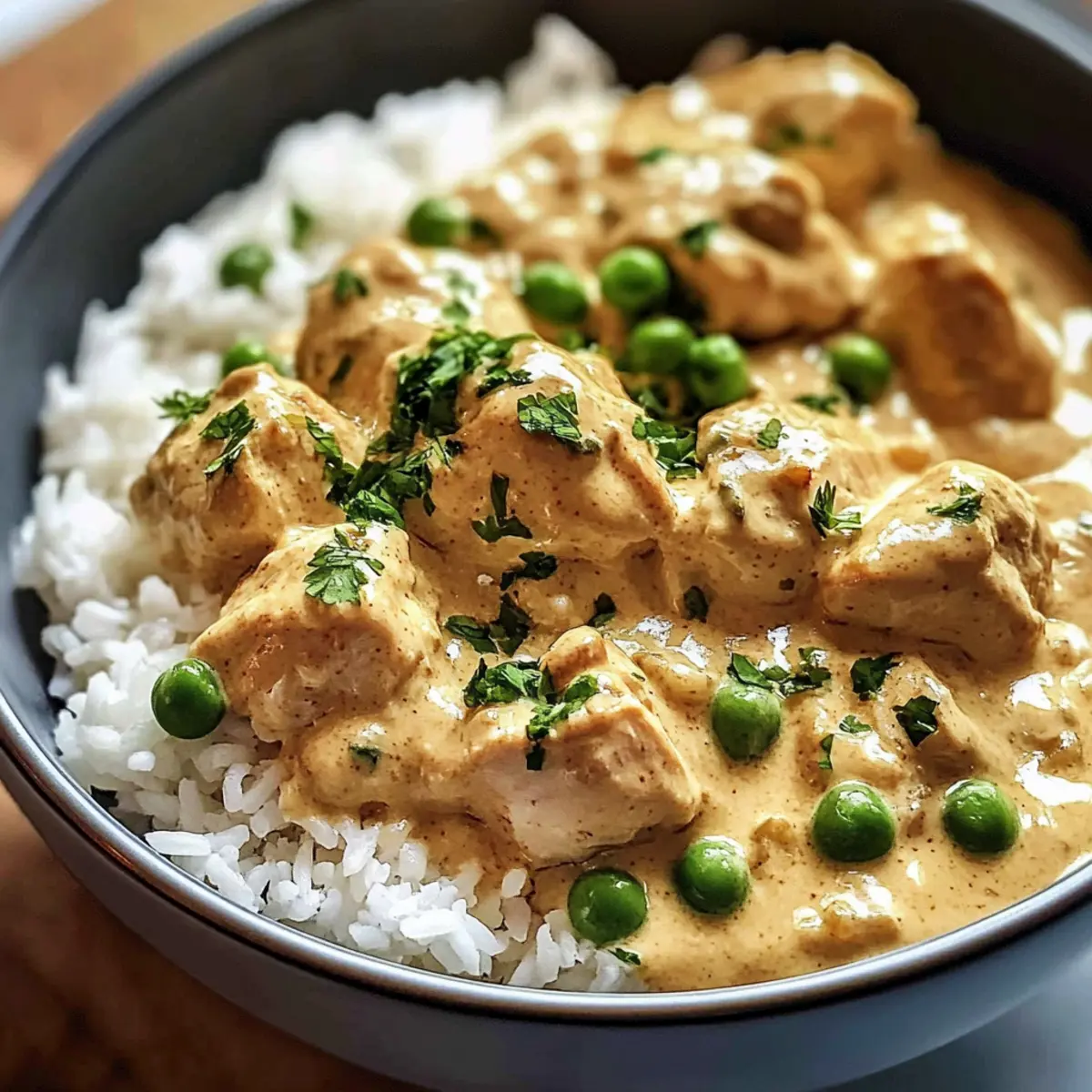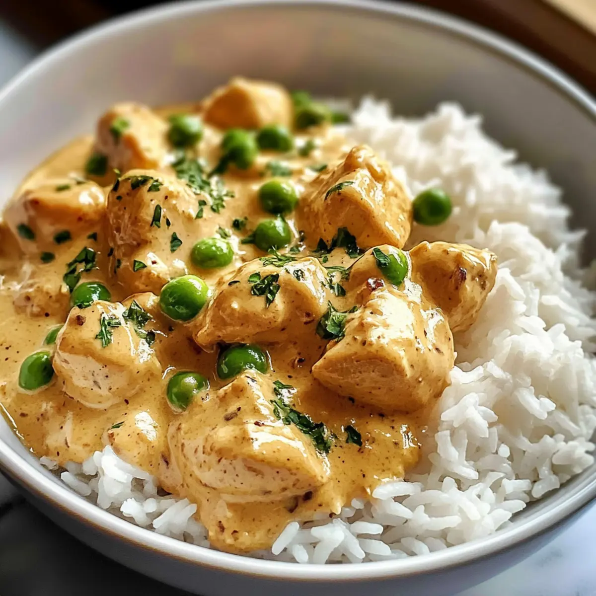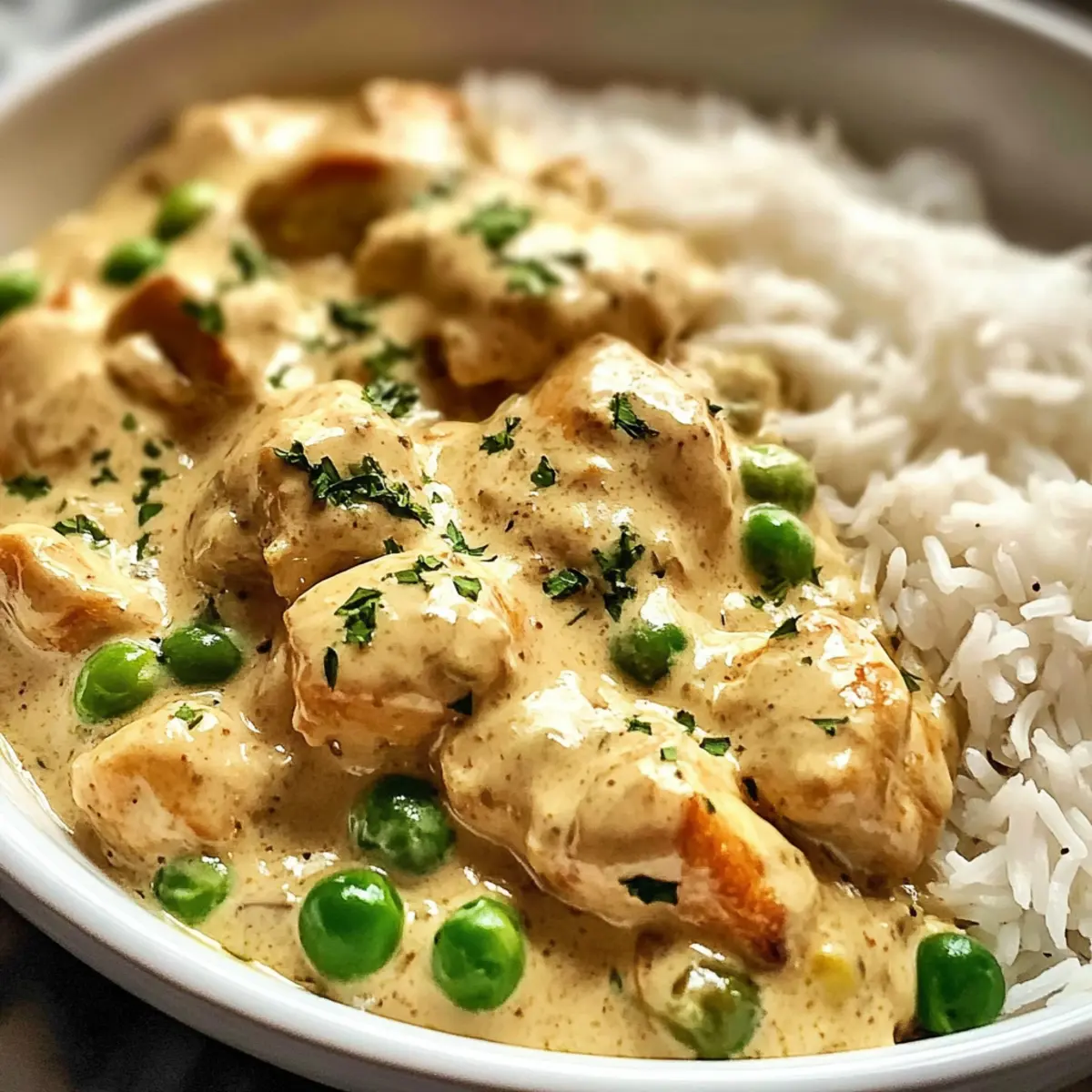 Wussten Sie, dass ein einfaches, aber köstliches Abendessen der Schlüssel zu einem stressfreien Wochentag sein kann? Mit meinem Rezept für cremiges Hähnchen mit Reis wird das Kochen zu einem Genuss, den Sie und Ihre Familie lieben werden! Dieses herzhaft-cremige Gericht kombiniert zarte Hühnerbrust mit einer samtigen Sahnesauce, die perfekt zu fluffigem Reis passt. In nur 45 Minuten zaubern Sie ein Dinner, das sowohl schnell als auch nährend ist—ideal für vielbeschäftigte Abende. Die einfache Zubereitung und die Tatsache, dass es sich um ein echtes Comfort Food handelt, machen dieses Rezept zu einem absoluten Favoriten. Sind Sie bereit, Ihre Küche in einen Ort der Gemütlichkeit zu verwandeln? Warum lieben Sie cremiges Hähnchen mit Reis? Köstlicher Genuss: Zartes Hähnchen kombiniert mit einer samtigen Sahnesauce, die alles perfekt verbindet. Schnell zubereitet: In nur 45 Minuten haben Sie ein herzhaftes Dinner, das auch an hektischen Abenden leicht gelingt. Familienfreundlich: Kinder und Erwachsene werden gleichermaßen begeistert sein – ein echtes Comfort Food! Vielseitige Variationen: Passen Sie das Rezept nach Ihren Wünschen an, indem Sie Gemüse oder Gewürze hinzufügen. Einfache Zubereitung: Mit wenigen, leicht erhältlichen Zutaten schaffen Sie ein Gericht, das die ganze Familie lieben wird. Probieren Sie auch, das Cremige Hähnchen mit Reis mit geröstetem Brokkoli oder einem frischen Salat zu servieren! Cremiges Hähnchen mit Reis Zutaten • Dieses Gericht ist einfach und voller Geschmack! Für das Hähnchen Hähnchenbrustfilets – Zartes, mageres Fleisch, das durch Putenbrust ersetzt werden kann. Für den Reis Reis – Langkornreis (z.B. Basmati) ist ideal, aber Quinoa kann alternativ verwendet werden. Hühnerbrühe – Sorgt für zusätzlichen Geschmack; Gemüsebrühe ist die vegetarische Option. Für die Sauce Sahne – Die Hauptquelle der Cremigkeit; Hafersahne oder Kokosmilch sind pflanzliche Alternativen. Zwiebel – Verleiht der Sauce eine süße Basis; Schalotten können auch verwendet werden. Knoblauch – Fügt eine leckere Tiefe hinzu; frischer oder abgepackter Knoblauch ist geeignet. Für die zusätzliche Frische Gefrorene Erbsen – Bringen Farbe und Nährstoffe, können durch gefrorene Maiskörner ersetzt werden. Paprika – Liefert einen milden, süßen Geschmack; Paprikapulver ist auch eine gute Option. Für das Aroma Thymian – Gibt eine subtile Note; oregan kann als Ersatz genutzt werden. Olivenöl – Ideal zum Braten, kann durch Rapsöl ersetzt werden. Mit diesen Zutaten gelingt Ihnen das cremige Hähnchen mit Reis ganz sicher! Schritt-für-Schritt-Anleitung für Cremiges Hähnchen mit Reis Step 1: Reis vorbereiten Spülen Sie den Reis unter kaltem Wasser, bis das Wasser klar ist, um überschüssige Stärke zu entfernen. Kochen Sie den Reis dann in einer großen Pfanne mit Hühnerbrühe gemäß der Packungsanweisung. Dies dauert in der Regel 15-20 Minuten, bis der Reis gar und leicht fluffig ist. Step 2: Zwiebel anbraten Erhitzen Sie in einer großen Pfanne 2 Esslöffel Olivenöl bei mittlerer Hitze. Fügen Sie die gewürfelte Zwiebel hinzu und braten Sie sie etwa 2-3 Minuten an, bis sie glasig wird und einen appetitlichen Duft verströmt. Dies bildet die aromatische Basis für Ihre cremige Sauce. Step 3: Knoblauch hinzufügen Geben Sie klein gehackten Knoblauch in die Pfanne und braten Sie ihn für ca. 1 Minute mit, bis er zu duften beginnt. Achten Sie darauf, den Knoblauch nicht zu lange zu garen, damit er nicht verbrennt, was den Geschmack der Sauce beeinträchtigen könnte. Step 4: Hähnchen braten Würzen Sie die Hähnchenbrustfilets mit Paprika, Salz, Pfeffer und Thymian. Legen Sie die Filets in die Pfanne und braten Sie sie 5-6 Minuten pro Seite, bis sie goldbraun sind und eine Innentemperatur von 75°C erreicht haben. Das Hähnchen sollte außen knusprig und innen zart sein. Step 5: Sahne hinzufügen Entfernen Sie das gebratene Hähnchen aus der Pfanne und stellen Sie es beiseite. Gießen Sie die Sahne in die verbliebene Zwiebel-Knoblauch-Mischung in der Pfanne und bringen Sie alles zum Köcheln. Rühren Sie gelegentlich, damit die Sauce leicht eindickt und eine cremige Textur erhält. Step 6: Erbsen einrühren Fügen Sie die gefrorenen Erbsen in die köchelnde Sahnesauce hinzu und erhitzen Sie sie weitere 2-3 Minuten. Rühren Sie gut um, damit die Erbsen gleichmäßig verteilt und durchgewärmt werden. Die Sauce sollte nun cremig und einladend aussehen, bereit für das Hähnchen. Step 7: Hähnchen in der Sauce köcheln Legen Sie das gebratene Hähnchen zurück in die Pfanne und lassen Sie es 5 Minuten in der Sauce köcheln. Dadurch nimmt das Hähnchen den köstlichen Geschmack der cremigen Sauce auf und bleibt saftig. Achten Sie darauf, dass die Sauce nicht zu stark kocht. Step 8: Anrichten und servieren Servieren Sie das cremige Hähnchen über dem gekochten Reis und garnieren Sie es nach Belieben mit frischer Petersilie. Diese farbenfrohe Präsentation bringt nicht nur Freude auf den Tisch, sondern macht auch Lust auf mehr. Genießen Sie Ihr herzhaftes Abendessen! Expert Tips für cremiges Hähnchen mit Reis Reis richtig abspülen: Spülen Sie den Reis gründlich, um überschüssige Stärke zu entfernen. Dies sorgt für fluffigen Reis, der die cremige Sauce perfekt aufnimmt. Sahne nicht überhitzen: Achten Sie darauf, die Sahne beim Kochen nicht zu stark zu erhitzen, um Überkochen und eine körnige Konsistenz zu vermeiden. Fleischthermometer nutzen: Verwenden Sie ein Fleischthermometer, um sicherzustellen, dass das Hähnchen die ideale Innentemperatur von 75°C erreicht, um die Saftigkeit zu garantieren. Zwiebel nicht verbrennen: Braten Sie die Zwiebel nur bis sie glasig ist. Verbrannte Zwiebeln können den Geschmack der gesamten Sauce negativ beeinflussen. Variationen ausprobieren: Experimentieren Sie mit verschiedenen Gemüsesorten oder Gewürzen für Ihr cremiges Hähnchen mit Reis, um neue Geschmäcker zu entdecken. Aufbewa