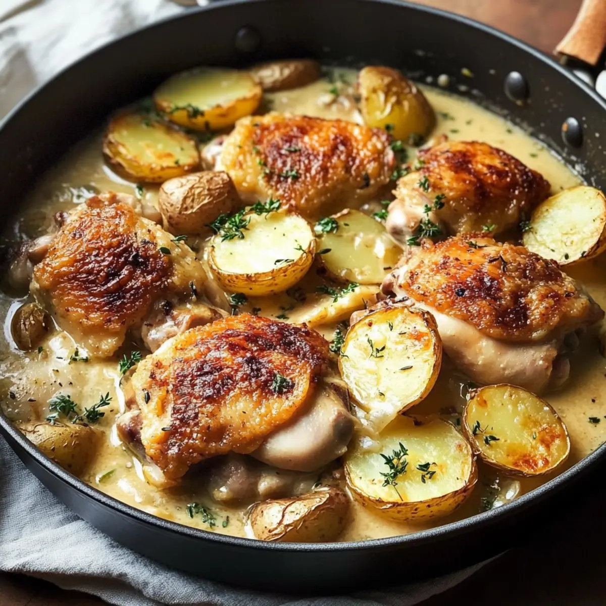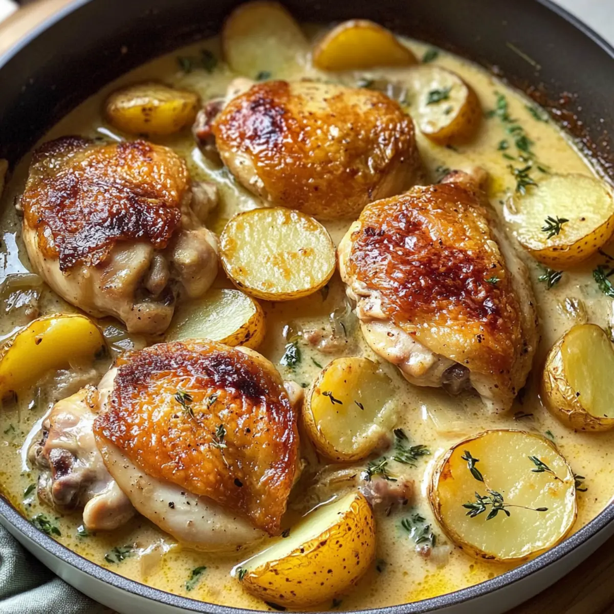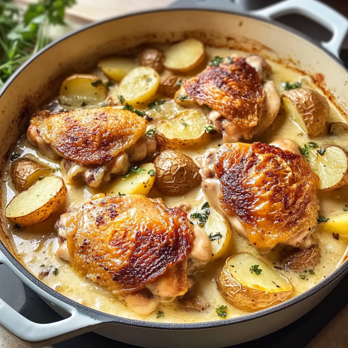 Das Aroma von frisch gebackenem Ofenhähnchen zieht mich sofort in die Küche, und die Vorfreude auf das cremige Ofenhähnchen mit Kartoffeln ist einfach unwiderstehlich. Diese Gericht ist mehr als nur ein Rezept; es ist eine Umarmung für den Gaumen! Mit seiner knusprigen Haut und den zartschmelzenden Kartoffeln ist es eine perfekte Kombination aus Komfort und Geschmack. Zudem lässt sich dieses herzliche One-Pot-Gericht im Handumdrehen zubereiten, was es ideal für stressige Wochentage macht oder wenn Sie Freunde und Familie beeindrucken möchten. Wer könnte da schon widerstehen? Lassen Sie uns gemeinsam in die Welt dieser köstlichen Kreation eintauchen! Warum werden Sie dieses Rezept lieben? Einfachheit: Die Zubereitung ist kinderleicht und benötigt nur grundlegende Kochkenntnisse, sodass es ideal für alle ist, die nach einem schnellen und schmackhaften Abendessen suchen. Herzhafter Geschmack: Die Kombination aus Hähnchen, Sahne und Gewürzen sorgt für ein intensives Aroma, das Ihre Geschmacksknospen verwöhnen wird. Alles in einem Topf: Dieses Rezept spart nicht nur Geschirr, sondern ermöglicht auch, dass sich die Aromen perfekt vermischen und entfalten können. Vielseitigkeit: Experimentieren Sie mit unterschiedlichen Gemüsesorten oder Gewürzen für neue Geschmackserlebnisse! Wenn Sie noch mehr Rezeptideen suchen, lassen Sie sich von unseren Variationen inspirieren! Crowd-Pleaser: Ob für ein Familienessen oder ein festliches Dinner – jeder wird von der cremigen Konsistenz und den zarten Kartoffeln begeistert sein! Cremiges Ofenhähnchen mit Kartoffeln Zutaten Für das Hähnchen Hähnchenschenkel – Hauptprotein, das für Saftigkeit und Geschmack sorgt; Sie können auch Hähnchenkeulen verwenden. Olivenöl – Für das Anbraten des Hähnchens, um eine leckere knusprige Haut zu erreichen; jedes andere mildes Öl ist ebenfalls geeignet. Paprikapulver – Fügt Farbe und subtile Wärme hinzu; geräuchertes Paprikapulver verleiht einen intensiveren Geschmack. Für die Soße Gemüsebrühe – Bietet die flüssige Basis und Geschmack; verwenden Sie selbstgemachte oder natriumarme Brühe. Sahne – Sorgt für die reichhaltige Cremigkeit der Sauce; für eine leichtere Variante können Sie auch Halbrahm oder pflanzliche Sahne nutzen. Zwiebel – Bringt Süße und zusätzliche Geschmacksnuancen; jede gelbe Zwiebel ist gut geeignet. Knoblauch – Verstärkt das Aroma und den Geschmack; frischer Knoblauch hat den besten Geschmack, aber Knoblauchpulver kann auch verwendet werden. Getrockneter Thymian – Ein Gewürz, das hervorragend zu Hähnchen und Kartoffeln passt; frischer Thymian sorgt für noch mehr Geschmack. Für die Kartoffeln Festkochende Kartoffeln – Sorgt für eine gute Konsistenz und Cremigkeit im Gericht; vermeiden Sie mehligkochende Kartoffeln, da sie matschig werden könnten. Salz und Pfeffer – Essentiell zur Würzung; nach Geschmack anpassen. Frische Thymianzweige – Optional für die Garnierung und zusätzlichen Geschmack. Mit diesen Zutaten wird Ihr Cremiges Ofenhähnchen mit Kartoffeln zum absoluten Hochgenuss! Step-by-Step Instructions für Cremiges Ofenhähnchen mit Kartoffeln Step 1: Ofen vorheizen Heizen Sie den Ofen auf 200 °C vor, damit er während der Vorbereitung die richtige Temperatur erreicht. Diese Hitze sorgt dafür, dass das cremige Ofenhähnchen mit Kartoffeln gleichmäßig gart und die Haut richtig knusprig wird. Step 2: Hähnchen vorbereiten Waschen und trocknen Sie die Hähnchenschenkel gründlich mit Küchenpapier, um eine knusprige Haut zu gewährleisten. Würzen Sie sie mit Salz, Pfeffer und Paprikapulver, um dem Hähnchen beim Braten zusätzlichen Geschmack zu verleihen. Achten Sie darauf, den gesamten Umfang gut zu würzen. Step 3: Kartoffeln und Zwiebeln schneiden Schneiden Sie die festkochenden Kartoffeln in 1-1,5 cm dicke Scheiben. Finely schneiden Sie die Zwiebel und zerdrücken Sie den Knoblauch. Diese Zutaten bilden die geschmackvolle Grundlage für die cremige Sauce und sorgen dafür, dass die Kartoffeln die Aromen aufnehmen. Step 4: Hähnchen anbraten Erhitzen Sie das Olivenöl in einem ofenfesten Topf bei mittlerer Hitze. Legen Sie die gewürzten Hähnchenschenkel mit der Hautseite nach unten in den Topf und braten Sie sie 8-10 Minuten an, bis die Haut goldbraun und knusprig ist. Wenden Sie die Stücke kurz, um die andere Seite ebenfalls anzubraten. Step 5: Zwiebeln und Knoblauch anbraten Nehmen Sie das Hähnchen aus dem Topf und stellen Sie es beiseite. Fügen Sie die Zwiebel in den Topf und sautieren Sie sie 3-4 Minuten lang, bis sie weich sind. Geben Sie den zerdrückten Knoblauch und den getrockneten Thymian dazu und braten Sie alles eine weitere Minute an, bis die Aromen freigesetzt werden. Step 6: Sauce deglacieren und würzen Löschen Sie die Zwiebelmischung mit der Gemüsebrühe ab, dabei alle Röststoffe vom Boden des Topfes lösen. Fügen Sie die Sahne hinzu und rühren Sie gut um. Schmecken Sie die Sauce ab und würzen Sie nach Bedarf mit Salz und Pfeffer. Diese Mischung wird die cremige Basis für das Cremige Ofenhähnchen mit Kartoffeln. Step 7: Kartoffeln hinzufügen Mischen Sie die Kartoffelscheiben in die Sauce und stellen Sie sicher, dass sie gleichmäßig bedeckt sind. Legen Sie das Hähnchen mit der Hautseite nach oben auf die Kartoffeln. Decken Sie den Topf mit einem Deckel ab und backen Sie alles für 30 Minuten im Ofen. Step 8: Hähnchen bräunen Entfernen Sie nach der Backzeit den Deckel und backen Sie das Gericht weitere 20-30 Minuten, bis die Haut des Hähnchens schön goldbraun und knusprig ist. Wenn Sie etwas extra Knusprigkeit wünschen, können Sie den Grill für die letzten Minuten aktivieren. Step 9: Anrichten und servieren Lassen Sie das Hähnchen nach dem Backen 5 Minuten ruhen, bevor Sie es servieren. Garniert mit frischen Thymianzweigen, wird das Cremige Ofenhähnchen mit Kartoffeln zu einem echten Hingucker auf dem Tisch und verspricht ein herzhaftes und köstliches Erlebnis für alle Gäste