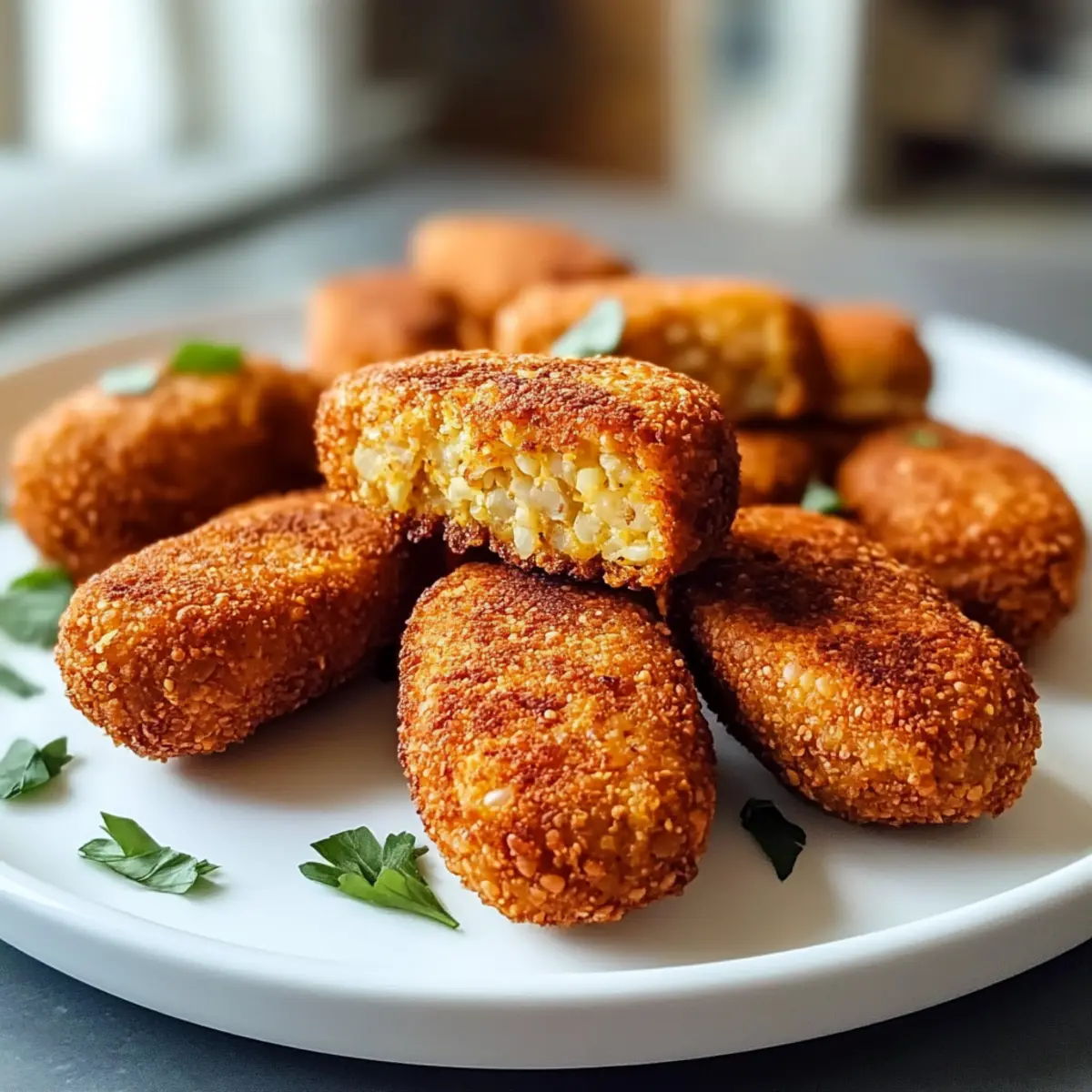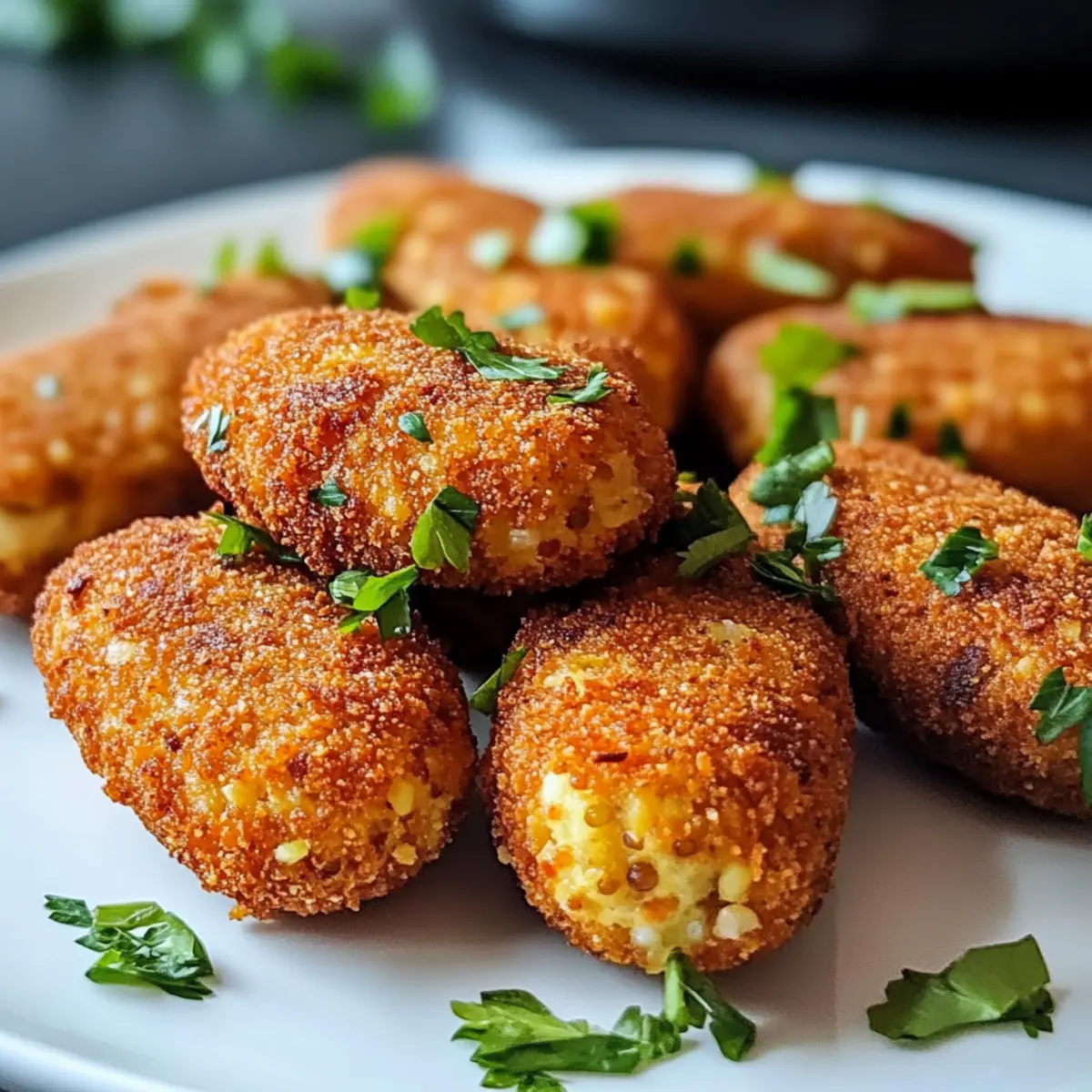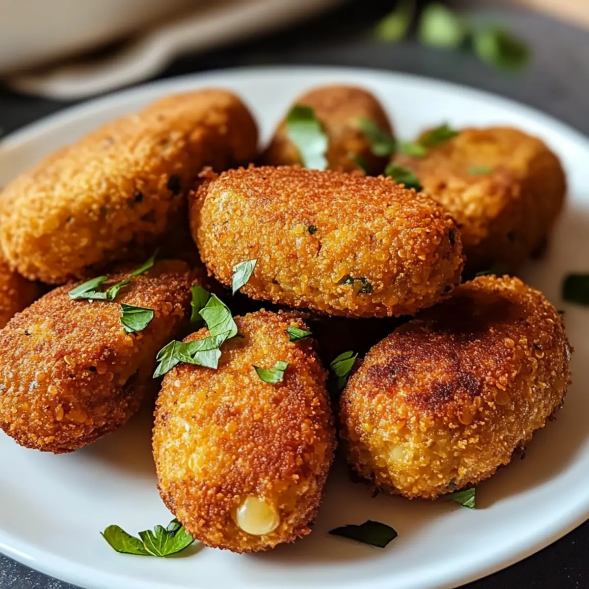 Vor kurzem saß ich im Garten, umgeben von frischen Kräutern und dem Duft der warmen Sonne, als mir die Idee zu den Crispy Linsenkroketten aus der Heißluftfritteuse kam. Diese knusprigen kleinen Köstlichkeiten sind nicht nur ein wahrer Genuss für den Gaumen, sondern auch eine gesunde, pflanzliche Snack-Option, die in nur 30 Minuten zubereitet ist. Hergestellt aus proteinreichen roten Linsen und verfeinert mit aromatischen Gewürzen, sind sie perfekt für geselliges Beisammensein – ob als Beilage oder einfach als nahrhafter Snack für zwischendurch. Außerdem lassen sich diese Kroketten ganz nach Ihrem Geschmack anpassen: von glutenfrei bis hin zur Zugabe von frischem Gemüse. Neugierig, wie sich Ihre nächste Snack-Zeit verwandeln kann? Lassen Sie uns gleich loslegen! Warum sind diese Kroketten so besonders? Vielseitigkeit: Die Crispy Linsenkroketten lassen sich ganz nach Ihren Vorlieben anpassen – genießen Sie sie glutenfrei oder probieren Sie verschiedene Gemüsesorten. Einfachheit: Die Zubereitung ist ein Kinderspiel! Mit nur wenigen Zutaten und in unter 30 Minuten sind diese Kroketten perfekt für einen schnellen Snack. Gesundheit: Vollgepackt mit proteinreichen roten Linsen und aromatischen Gewürzen sind sie nicht nur lecker, sondern auch nahrhaft. Crispy Genuss: Dank der Heißluftfritteuse erhalten Sie eine knusprige Oberfläche, während die Innenseite wunderbar weich bleibt. Probieren Sie sie mit einem Dip oder frischen Salat für ein rundum tolles Geschmackserlebnis! Raffinierte Aromen: Mit der richtigen Gewürzmischung verwandeln sich diese Kroketten in einen echten Gaumenschmaus, den jeder lieben wird. Wenn Sie auf der Suche nach einer gesunden Snack-Option sind, ist dies genau das Richtige für Sie! Crispy Linsenkroketten Zutaten • Hier sind die Zutaten, um Ihre eigenen köstlichen Crispy Linsenkroketten aus der Heißluftfritteuse zuzubereiten. Für die Kroketten Rote Linsen – Diese proteinreiche Hauptzutat sorgt für eine gesunde Basis; kochen Sie sie etwa 10 Minuten, bis sie weich, aber nicht matschig sind. Paniermehl – Bindet die Mischung und verleiht Knusprigkeit; verwenden Sie glutenfreies Paniermehl für eine glutenfreie Option. Gewürze (z.B. Kreuzkümmel, Paprika) – Diese sorgen für tollen Geschmack und können nach Belieben variiert werden; experimentieren Sie mit anderen Gewürzmischungen für mehr Vielfalt. Haferflocken – Dienen als alternative Bindemittel und tragen zur Textur bei; können für eine glutenfreie Version durch Mandelmehl ersetzt werden. Zwiebel – Bringt Feuchtigkeit und Süße; fein gehackt und angebraten sorgt sie für einen intensiveren Geschmack. Optionale Zusätze Feta – Fügen Sie Feta-Käse für eine cremige Note hinzu, die die Kroketten verfeinert. Süßkartoffel – Eine großartige Ergänzung für zusätzliche Textur und Süße; einfach klein schneiden und zur Mischung hinzufügen. Schritt-für-Schritt-Anleitung für Crispy Linsenkroketten aus der Heißluftfritteuse Step 1: Linsen kochen Kochen Sie die roten Linsen in einem Topf mit Wasser für etwa 10 Minuten, bis sie weich, aber nicht matschig sind. Achten Sie darauf, dass die Linsen ihre Form behalten. Gießen Sie das Wasser ab und lassen Sie die Linsen kurz abkühlen, während Sie Ihre weiteren Zutaten vorbereiten. Step 2: Mischung vorbereiten In einer Schüssel die abgekühlten Linsen mit einer Gabel leicht zerdrücken. Fügen Sie die angebratene Zwiebel, Paniermehl, Gewürze und Haferflocken hinzu. Mischen Sie alles gut durch, bis eine gleichmäßige und formbare Masse entsteht, die die Grundlage für die Crispy Linsenkroketten bildet. Step 3: Kroketten formen Nehmen Sie eine Portion der Linsenmasse und formen Sie kleine Bälle oder flache Patties. Achten Sie darauf, dass die Größen gleichmäßig sind, damit sie gleichmäßig garen. Legen Sie die geformten Kroketten auf einen Teller oder ein Backblech, während Sie die Heißluftfritteuse vorbereiten. Step 4: Heißluftfritteuse vorheizen Heizen Sie die Heißluftfritteuse auf 200°C vor. Während die Heißluftfritteuse aufheizt, können Sie den Korb leicht mit Öl besprühen, um sicherzustellen, dass die Kroketten nach dem Frittieren schön knusprig werden. Step 5: Kroketten frittieren Legen Sie die geformten Kroketten in den Korb der Heißluftfritteuse, sodass ausreichend Platz zwischen ihnen bleibt. Frittieren Sie die Kroketten für 12–15 Minuten, bis sie goldbraun und knusprig sind, und drehen Sie sie nach der Hälfte der Zeit um, um eine gleichmäßige Bräunung zu gewährleisten. Step 6: Servieren Lassen Sie die Crispy Linsenkroketten kurz abkühlen und servieren Sie sie warm. Sie passen hervorragend zu Dips wie Hummus oder zu einem frischen Salat. Genießen Sie diese gesunden, pflanzlichen Snacks bei Ihrer nächsten Zusammenkunft! Meal Prep Tipps für Crispy Linsenkroketten aus der Heißluftfritteuse Die Crispy Linsenkroketten aus der Heißluftfritteuse sind perfekt für die Vorbereitung im Voraus! Sie können die Linsen-Mischung bis zu 3 Tage im Voraus zubereiten und im Kühlschrank aufbewahren, um Zeit während hektischer Wochentage zu sparen. Achten Sie darauf, die Mischung gut abgedeckt zu lagern, um eine Austrocknung zu verhindern und die Aromen frisch zu halten. Wenn Sie bereit sind, Ihre köstlichen Kroketten zuzubereiten, formen Sie einfach die Kroketten und frittieren Sie sie bei 200°C für 12-15 Minuten, bis sie goldbraun sind. So haben Sie eine gesunde Snack-Option mit minimalem Aufwand und maximalem Geschmack! Was passt gut zu Crispy Linsenkroketten aus der Heißluftfritteuse? Bereiten Sie sich auf ein Geschmackserlebnis vor, das Ihre köstlichen Kroketten perfekt ergänzt und jeden Bissen zum Genuss macht. Frischer Gurkensalat: Der knackige, erfrischende Gurkensalat bringt Leichtigkeit und eine angenehme Textur, die wunderbar mit den knusprigen Kroketten harmoniert. Cremiger Hummus: Ein klassischer Dip, der die Aromen Ihrer Kroketten perfekt ergänzt und ihnen eine schmeichelhafte, cremig
