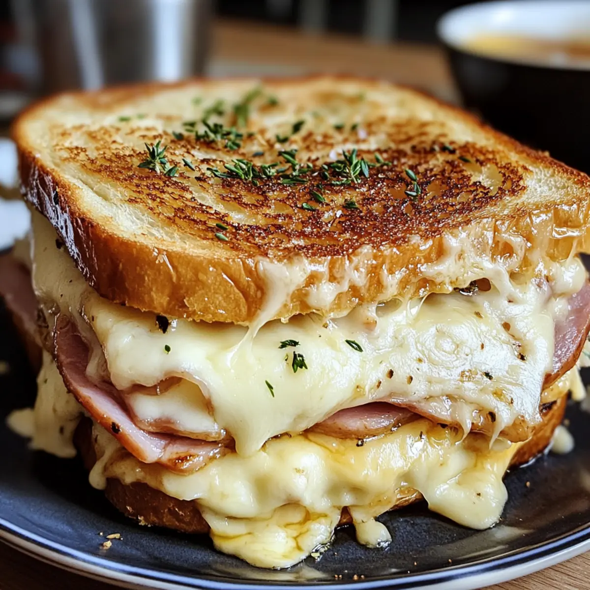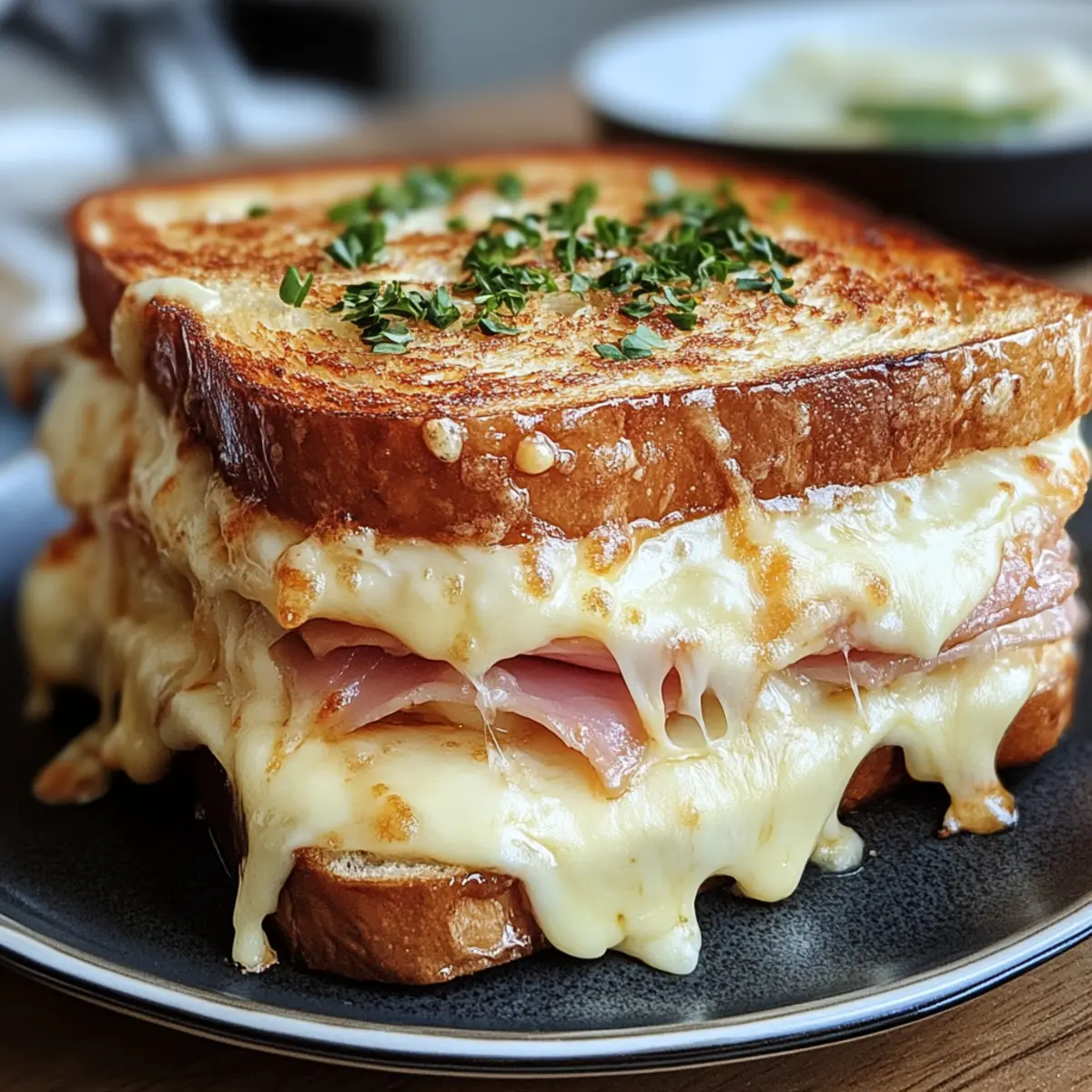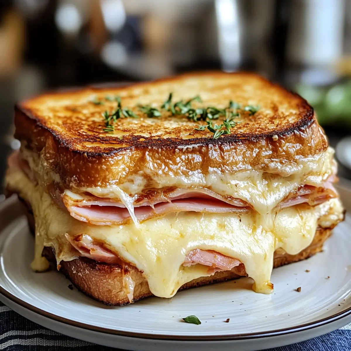 Wusstest du, dass der Croque Monsieur nicht nur ein Sandwich ist, sondern eine kleine Reise in die charmanten Cafés von Paris? Diese klassischen französischen Köstlichkeit vereint knuspriges, goldbraunes Brot mit dem delikaten Geschmack von geschmolzenem Gruyère-Käse und zartem Schinken, alles verfeinert mit einer luxuriösen Béchamelsauce. Perfekt für ein schnelles Mittagessen oder als gemütlicher Snack, bringt er die Atmosphäre eines Bistro direkt auf deinen Esstisch. Egal, ob du Freunde beeindrucken oder einfach nur eine kleine Auszeit vom Alltag nehmen möchtest, dieser Croque Monsieur ist der ideale Begleiter. Bist du bereit, diese bistrotypische Köstlichkeit in deiner Küche zum Leben zu erwecken? Warum wirst du diesen Croque Monsieur lieben? Einfachheit: Die Zubereitung ist schnell und unkompliziert, sodass du in weniger als 30 Minuten ein köstliches Gericht auf den Tisch zaubern kannst. Leckere Aromen: Die Kombination aus reichhaltigem Gruyère-Käse und zartem Schinken sorgt für ein Geschmackserlebnis, das dich in die Cafés von Paris entführt. Vielfältig: Ob als schnelles Mittagessen oder verfeinert mit einem Ei als Croque Madame – dieses Rezept lässt Raum für kreative Variationen. Schnell & sättigend: Ideal für hungrige Gaumen, die von schnelllebigem Fast Food genug haben und sich nach einem herzhaften, selbstgemachten Mahl sehnen. Beeindruckend: Mit seiner goldbraunen Kruste und der cremigen Füllung ist dieser Croque Monsieur ein echter Hingucker und wird deine Gäste begeistern! Kombiniere ihn mit einem frischen Salat für ein rundum gelungenes Essen. Croque Monsieur Zutaten • Hinweis: Für diesen klassischen Croque Monsieur benötigst du frische und hochwertige Zutaten, um das beste Geschmackserlebnis zu erzielen. Für das Brot Brot – Verwende robustes Weiß- oder Sauerteigbrot für den perfekten Crunch. Für die Füllung Gruyère-Käse – Verleiht dem Sandwich seinen nussigen Geschmack und schmilzt herrlich. Alternativ kannst du Emmental verwenden. Schinken – Sorgt für die herzliche Würze; traditionelle Optionen sind Dijon oder Parisian Schinken. Für die Béchamelsauce Béchamel-Sauce – Diese cremige Sauce bindet die Zutaten perfekt; alternativ kannst du eine fertige Käsesauce verwenden. Butter – Zum Toasten, verbessert den Geschmack und sorgt für eine knusprige Kruste. Mit diesen Zutaten zauberst du ein köstliches Croque Monsieur, das sowohl dich als auch deine Gäste begeistern wird! Schritt-für-Schritt-Anleitung für Croque Monsieur Step 1: Béchamel zubereiten In einem kleinen Topf bei mittlerer Hitze die Butter schmelzen. Das Mehl unter ständigem Rühren einstreuen, bis eine glatte Paste entsteht. Langsam die Milch hinzufügen und weiter rühren, bis die Mischung dick und cremig wird. Etwa 5 Minuten köcheln lassen, dann den geriebenen Gruyère-Käse einrühren, bis er vollständig geschmolzen ist. Die Béchamel sauce ist nun bereit. Step 2: Sandwich belegen Eine Scheibe Brot auf eine saubere Arbeitsfläche legen und eine großzügige Schicht der Béchamelsauce auf einer Seite verteilen. Eine Scheibe Schinken und eine Schicht Gruyère-Käse darauflegen und dann eine zweite Scheibe Brot auf die Füllung legen. Drücke sanft, sodass die Zutaten gut haften. Wiederhole diesen Vorgang mit den verbleibenden Zutaten, um mehrere Croque Monsieur zuzubereiten. Step 3: Sandwiches toasten Eine große Pfanne auf mittlere Hitze erhitzen und etwas Butter darin schmelzen. Die vorbereiteten Sandwiches vorsichtig in die Pfanne legen und etwa 3-4 Minuten braten, bis sie goldbraun und knusprig sind. Dann die Sandwiches vorsichtig umdrehen und die andere Seite ebenfalls braten, bis sie die gleiche goldene Farbe erreicht hat. Step 4: Finaler Schliff Die Croque Monsieur-Sandwiches aus der Pfanne nehmen und auf ein mit Backpapier belegtes Blech legen. Die restliche Béchamelsauce gleichmäßig auf die Oberseite der Sandwiches verteilen und mit einer zusätzlichen Schicht Gruyère-Käse bestreuen. Das Blech in den vorgeheizten Ofen (Grillfunktion) geben und 2-3 Minuten broil, bis der Käse sprudelnd und goldbraun ist. Step 5: Servieren Die heißen Croque Monsieur-Sandwiches aus dem Ofen nehmen und leicht abkühlen lassen. In der Mitte diagonal halbieren, um die köstliche Füllung zu präsentieren. Ideal serviert mit einem frischen Salat oder knusprigen Pommes frites für eine komplette Mahlzeit, genieße diesen klassischen Genuss! Croque Monsieur Variationen & Alternativen Entdecke, wie du diesen klassischen Croque Monsieur ganz nach deinem Geschmack anpassen kannst! Dairy-Free: Tausche den Käse gegen pflanzlichen Käse und verwende eine Milchalternative für die Béchamel. Vegetarisch: Ersetze den Schinken durch sautierte Zucchini oder Spinat für eine leichte, aber schmackhafte Variante. Schärfe: Füge eine Prise Cayennepfeffer in die Béchamel hinzu, um dem Gericht einen würzigen Kick zu verleihen. Mediterraner Twist: Gib getrocknete Tomaten und Oliven in die Füllung für einen Hauch von mediterraner Frische. Croque Madame: Toppe deinen Croque Monsieur mit einem perfekt gebratenen Ei, um ihn zum Croque Madame zu machen. Vollkorn: Verwende Vollkornbrot, um das Sandwich nahrhafter und ballaststoffreicher zu gestalten. Komfort Food: Ergänze die Béchamel mit zusätzlich geschmolzenem Käse für ein besonders cremiges Erlebnis. Süß-Sauer: Probiere einige dünne Scheiben Äpfel oder Birnen in der Füllung für eine süße Überraschung – eine perfekte Balance zu dem herzhaften Schinken! Für weitere Ideen, wie du dein Gericht verfeinern kannst, schau dir auch mein Rezept für Käse-Sandwiches mit Spinatsalat an. Diese kreativen Akzente können dir helfen, die Dinge abwechslungsreich zu halten. Und wenn du nach einer anderen Art von Snack suchst, könnte auch mein Rezept für schnelle Quiche interessant sein! Effiziente Vorbereitungen für deinen Croque Monsieur Der Croque Monsieur ist ideal für Meal Prep und lässt sich wunderbar im Voraus zube