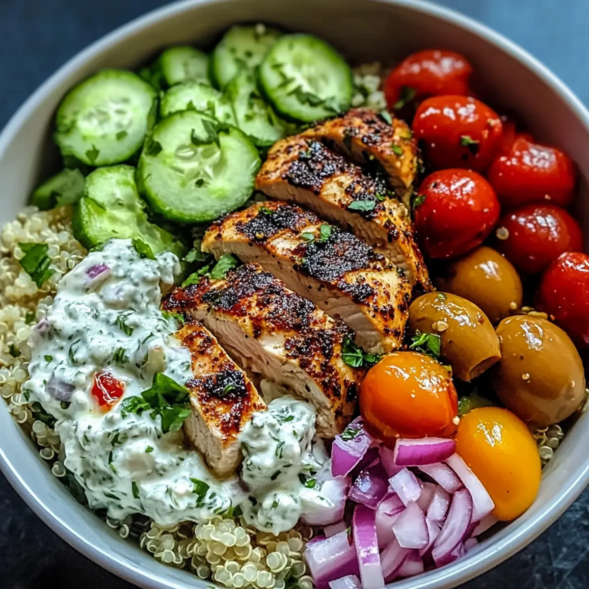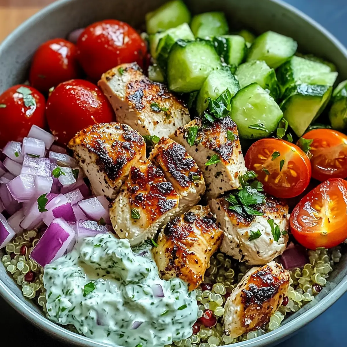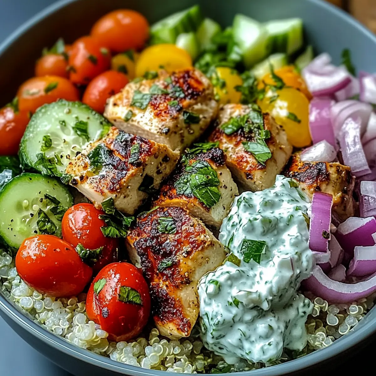Die Aromen des Mittelmeers sind nicht nur ein Fest für die Geschmacksknospen, sie sind auch ein Ausdruck von Genuss und Gesundheit. In meinem besten Griechischen Schüssel Rezept vereinen sich zart mariniertes Hühnchen, fluffige Quinoa und eine erfrischende, hausgemachte Tzatziki-Sauce zu einer unwiderstehlichen Kombination. Dieses Gericht ist perfect für ein schnelles Abendessen unter der Woche oder zur Essensvorbereitung und bietet dabei unendliche Anpassungsmöglichkeiten, um jedem Geschmack gerecht zu werden. Ob ihr frisches Gemüse, verschiedene Proteinquellen oder spezielle Gewürze hinzufügt, der Spaß beim Kochen ist garantiert! Ich kann es kaum erwarten, mit euch die mediterranen Genüsse zu teilen – welche Variationen werdet ihr ausprobieren? Warum ist dieses Rezept ein Muss? Vielfalt: Dieses Rezept lässt sich ganz nach euren Vorlieben anpassen! Ob mit zartem Hühnchen, cremigem Tofu oder herzhaften Kichererbsen – eurer Kreativität sind keine Grenzen gesetzt. Frische Aromen: Die Mischung aus Zitronensaft, frischen Kräutern und aromatischem Knoblauch bringt den Geschmack des Mittelmeers direkt zu euch nach Hause. Einfache Zubereitung: Mit übersichtlichen Schritten und wenigen Zutaten ist es in kürzester Zeit bereit – ideal für geschäftige Wochentage. Gesund und Nahrhaft: Mit einer ausgewogenen Kombination aus Protein, gesunden Fetten und Ballaststoffen ist diese Schüssel nicht nur lecker, sondern auch gesund. Perfekt zum Vorrat: Die einzelnen Komponenten lassen sich gut vorbereiten und im Kühlschrank aufbewahren – so habt ihr immer ein schnelles, gesundes Abendessen parat. Vergesst nicht, auch andere köstliche Rezepte wie mein Bete Dip Rezept oder die Schwedischen Blaubeer Schnecken zu entdecken! Das Beste Griechische Schüssel Rezept Zutaten • Dieses köstliche Rezept ist vollgepackt mit frischen Zutaten, die eine wahre Geschmacksexplosion garantieren! Für die Marinade Hähnchen Oberschenkel – sorgen für zartes und saftiges Fleisch; ihr könnt sie auch durch Hähnchenbrust oder Tofu ersetzen. Griechischer Joghurt – wesentlich für die Marinade und die Tzatziki; für eine milchfreie Variante, verwendet einfach pflanzlichen Joghurt. Zitronensaft & -schale – verleihen Frische und Säure; frisch gepresst ist immer am besten! Knoblauch – bringt aromatische Tiefe; für einen milderen Geschmack, reduziert die Menge. Frischer Oregano – verstärkt das mediterrane Aroma; getrockneter Oregano ist ein guter Ersatz. Olivenöl – sorgt für die nötige Reichhaltigkeit; verwendet immer hochwertiges Extra Natives Olivenöl. Für die Schüssel Quinoa – ist die nährstoffreiche Basis; könnt ihr auch durch Reis oder Couscous ersetzen, wenn gewünscht. Hühnerbrühe – intensiviert den Geschmack der Quinoa; in Notfällen kann auch Wasser verwendet werden. Englische Gurke – bringt Frische in den Salat; Persische Gurken sind eine knusprige Alternative. Kirschtomaten – fügen Süße und Farbe hinzu; können durch gewürfelte normale Tomaten ersetzt werden. Rote Zwiebel – sorgt für Schärfe im Salat; grüne Zwiebeln sind auch eine gute Option. Kalamata-Oliven – bieten einen salzigen Geschmack; grüne Oliven sind eine milde Alternative. Frische Petersilie und Dill – verleihen Frische; könnt ihr auch mit anderen Kräutern wie Minze kombinieren. Feta-Käse – als krümeliger Topping für zusätzliche Cremigkeit; für eine milchfreie Option einfach weglassen oder veganen Feta nutzen. Für die Tzatziki Gurke – für Tzatziki, raspeln und gut abtropfen lassen; das reduziert überschüssige Flüssigkeit. Dill – ergänzt den Geschmack in der Tzatziki; auch frische Minze passt hervorragend! Mit all diesen Zutaten seid ihr bereit, eine unvergessliche griechische Schüssel zuzubereiten – das Beste Griechische Schüssel Rezept wird eure Familie begeistern! Schritt-für-Schritt-Anleitung für Das Beste Griechische Schüssel Rezept Step 1: Hähnchen marinieren Für das Marinieren der Hähnchenoberschenkel mischt ihr griechischen Joghurt, Zitronensaft und -schale, Olivenöl, gehackten Knoblauch, frischen Oregano, Salz und Pfeffer in einer Schüssel. Die Hähnchen oberschenkel gleichmäßig mit der Marinade bestreichen und mindestens 30 Minuten im Kühlschrank ziehen lassen. Dies sorgt dafür, dass das Hähnchen zart und aromatisch wird. Step 2: Quinoa kochen Während das Hähnchen mariniert, spült ihr die Quinoa gründlich unter kaltem Wasser ab. Kocht die Quinoa dann in einem Topf mit Hühnerbrühe, etwas Salz und einem Lorbeerblatt für etwa 15 Minuten bei mittlerer Hitze, bis sie fluffig und das Wasser vollständig aufgesogen ist. Ihr erkennt den richtigen Gargrad, wenn die Quinoa leicht aufploppt und weich ist. Step 3: Gemüse vorbereiten Schneidet die englische Gurke und Kirschtomaten in kleine Würfel und dünnt die rote Zwiebel in feine Ringe. Vermischt alles in einer großen Schüssel mit den Kalamata-Oliven, frischen Kräutern, einem Schuss Olivenöl und Zitronensaft. Diese knackige Mischung bringt zusätzliche Frische in euer Das Beste Griechische Schüssel Rezept und sorgt für einen bunten Salat. Step 4: Tzatziki zubereiten Für die Tzatziki raspelt ihr die Gurke und lasst sie für 20 Minuten in einem Sieb abtropfen, um überschüssige Flüssigkeit zu entfernen. Vermischt dann die abgetropfte Gurke mit griechischem Joghurt, gehacktem Knoblauch, frischem Dill, Zitronensaft und einer Prise Salz. Die Tzatziki sollte schön cremig und frisch sein, bereit, euer Gericht zu verfeinern. Step 5: Hähnchen garen Heizt den Grill oder eine Grillpfanne auf mittelhohe Temperatur vor. Grillt die marinierten Hähnchen oberschenkel etwa 6-7 Minuten pro Seite, bis sie durchgegart sind und eine Innentemperatur von 75 °C erreicht haben. Lasst das Hähnchen danach für ein paar Minuten ruhen, damit die Säfte erhalten bleiben und das Fleisch zart bleibt. Step 6: Schüsseln zusammenstellen Jetzt könnt ihr die Bowls zusammenstellen. Beginnt mit einer Basis aus fluff