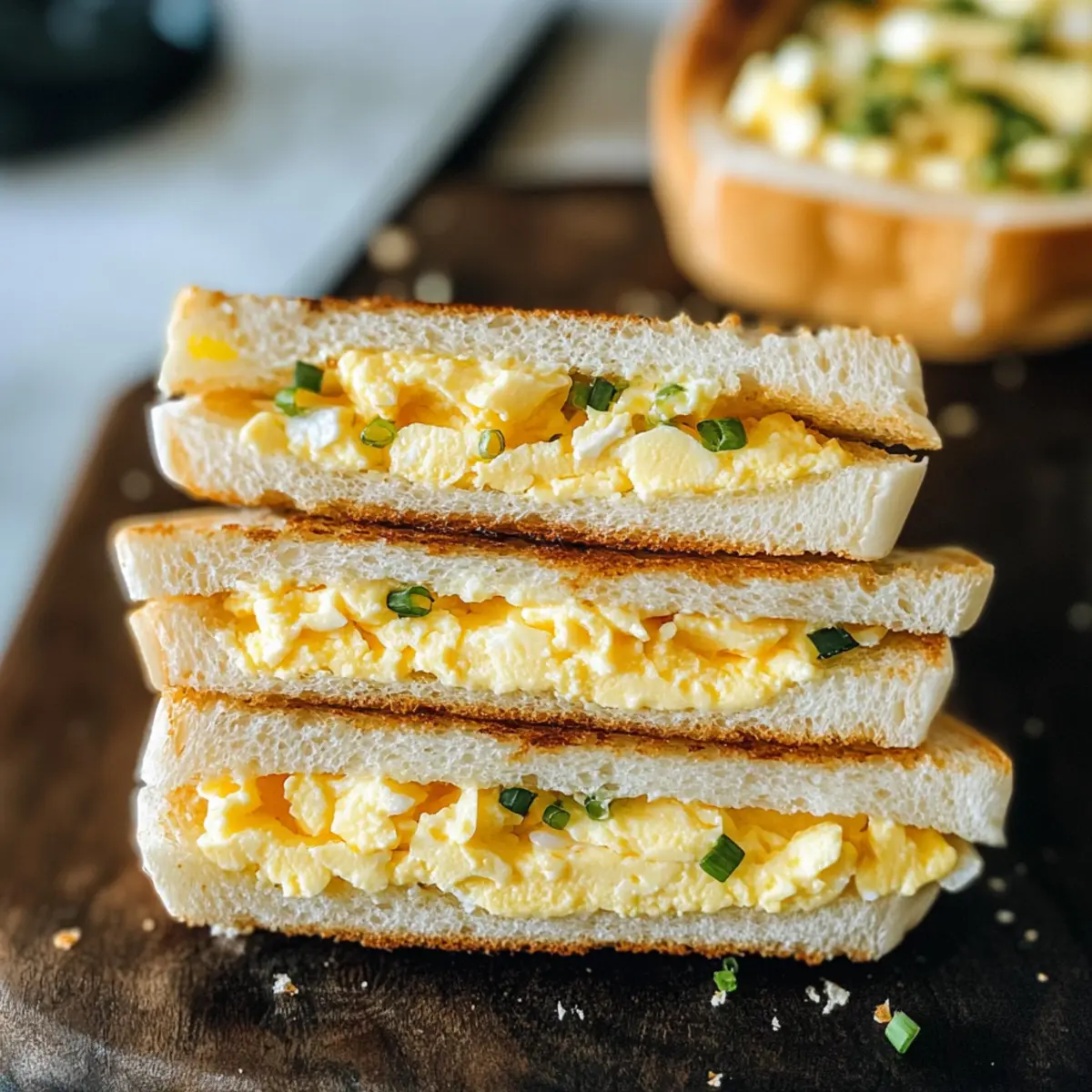 Wussten Sie, dass in Japan das Eiersandwich, auch bekannt als Tamago Sando, für viele eine kleine kulinarische Freude ist? Ich erinnere mich noch an meinen ersten Bissen – das Zusammenspiel von cremigem Ei-Salat und dem luftigen, süßlichen japanischen Milchbrot hat mich sofort verzaubert. Dieses Rezept für ein cremiges japanisches Eiersandwich ist nicht nur unfassbar leicht und schnell zuzubereiten, sondern auch ein Hit bei Kindern und Erwachsenen gleichermaßen. Die Verwendung von qualitativ hochwertigen, biologischen Eiern sorgt für eine geschmackliche Tiefe, die jedes Sandwich zu etwas Besonderem macht. Bereit, die Aromen Japans in Ihre Küche zu bringen? Lassen Sie uns gemeinsam in die Welt des Tamago Sando eintauchen! Warum ist das Eiersandwich so besonders? Einfachheit im besten Sinne: Die Zubereitung ist kinderleicht und benötigt nur grundlegende Kochskills. Vielfältige Variationen: Ob Sie sich für weich- oder hartgekochte Eier entscheiden, dieses Rezept lässt viel Spielraum für persönliche Vorlieben. Reichhaltiger Geschmack: Mit cremigem japanischem Mayo und frischen Kräutern wird jedes Bissen zum Geschmackserlebnis, das die Geschmacksknospen erfreut. Perfekte Mitnahme: Ideal für Lunchboxen oder Picknicks, dieses Sandwich schmeckt sowohl kalt als auch bei Raumtemperatur großartig. Familienfreundlich: Kinder werden die süße Note des Milchbrots und den milden Geschmack des Eier-Salats lieben. Probieren Sie auch unsere Tipps für kreative Füllungen für noch mehr Abwechslung! Eiersandwich Zutaten • Bereiten Sie sich auf das beste Eiersandwich vor! Für den Ei-Salat Eier – Hochwertige Pete and Gerry’s Organic Eggs sorgen für einen reichhaltigen Ei-Salat. Substitution: Standard-Eier sind möglich, aber der Geschmack variiert. Zucker – 1/4 Teelöffel, um die Aromen im Ei-Salat auszubalancieren; keine direkte Alternative nötig. Salz – 1/4 Teelöffel, verstärkt den Geschmack; nach persönlichem Geschmack anpassen. Schwarzer Pfeffer – 1/4 Teelöffel, sorgt für etwas Wärme; kann durch weißen Pfeffer ersetzt werden, wenn ein milderer Geschmack gewünscht ist. Milch (optional) – 1-2 Teelöffel, um den Ei-Salat feucht zu halten; verwenden Sie jede Pflanzenmilch für eine milchfreie Option. Japanische Mayonnaise – 4 Esslöffel, bietet einen reichhaltigeren Geschmack und cremigere Textur im Vergleich zu amerikanischer Mayo; reguläre Mayo kann verwendet werden, aber das Geschmacksprofil wird anders sein. Für das Sandwich Japanisches Milchbrot – 4 Scheiben, leichte und luftige Textur ideal für das Sandwich; kann durch hochwertiges Weißbrot ersetzt werden, falls nicht verfügbar. Ungesalzene Butter – 2 Esslöffel, weich, für Geschmack und Feuchtigkeit auf dem Brot; kann für eine milchfreie Version weggelassen werden. Schnittlauch (optional) – Zur Garnierung; bringt eine frische Note; kann durch Frühlingszwiebeln ersetzt oder weggelassen werden. Schritt-für-Schritt-Anleitung für Eiersandwich mit cremigem japanischem Ei-Salat Step 1: Eisbad vorbereiten Füllen Sie eine große Schüssel mit Eiswasser und stellen Sie sie beiseite. Dieses Eisbad ist wichtig, um den Garprozess der Eier zu stoppen, sodass Sie perfekt weichgekochte Eier für Ihr Eiersandwich erzielen. Step 2: Eier kochen Bringen Sie in einem mittleren Topf ausreichend Wasser zum Kochen. Senken Sie die Eier vorsichtig ins kochende Wasser und lassen Sie sie für 7 Minuten sanft köcheln. Nach der Zeit sollte das Eiweiß fest, das Eigelb jedoch noch leicht cremig sein. Step 3: Eier ins Eisbad transferieren Schalten Sie den Herd aus und lassen Sie die Eier noch eine Minute im heißen Wasser ruhen. Dann nehmen Sie die Eier sofort aus dem Wasser und legen Sie sie in das vorbereitete Eisbad. Lassen Sie sie 2 Minuten im Eisbad abkühlen, damit sie sich leichter schälen lassen. Step 4: Eier schälen Nehmen Sie die Eier aus dem Eisbad und schälen Sie sie vorsichtig, während sie noch lauwarm sind. Halten Sie dabei die Schale unter fließendem Wasser, wenn nötig, um die Arbeit zu erleichtern und Brüche zu vermeiden. Step 5: Eier zerdrücken Legen Sie die geschälten Eier in eine Schüssel und zerdrücken Sie sie mit einer Gabel. Achten Sie darauf, dass die Stückchen nicht größer als eine Erbse sind, um eine cremige Textur für den Ei-Salat im Eiersandwich zu erreichen. Step 6: Zutaten mischen Fügen Sie den Zucker, das Salz, den Pfeffer und die japanische Mayonnaise (und ggf. die Milch) zu den zerdrückten Eiern hinzu. Rühren Sie alles gut um, bis eine gleichmäßige und cremige Mischung entsteht, die perfekt für Ihr Eiersandwich ist. Step 7: Brot vorbereiten Nehmen Sie die Scheiben des japanischen Milchbrots und bestreichen Sie jede Scheibe großzügig mit der zarten, ungesalzenen Butter. Dies sorgt nicht nur für Geschmack, sondern schützt auch das Brot vor dem Durchweichen vom Ei-Salat. Step 8: Sandwich zusammenstellen Verteilen Sie eine großzügige Menge des Ei-Salats gleichmäßig auf einer der gebutterten Brotscheiben. Legen Sie dann die zweite Scheibe mit der gebutterten Seite nach unten darauf, um Ihr köstliches Eiersandwich zu schließen. Step 9: Sandwich schneiden und servieren Schneiden Sie die Ränder des Sandwiches ab, um eine saubere Präsentation zu gewährleisten. Teilen Sie das Sandwich in der Mitte, um zwei perfekte Hälften zu schaffen, die zum Servieren bereit sind. Genießen Sie Ihr Eiersandwich! Eiersandwich Variationen Jetzt können Sie Ihr Eiersandwich ganz nach Ihrem Geschmack anpassen und neue, spannende Aromen entdecken! Hartgekochte Eier: Tauschen Sie die weichgekochten Eier gegen hartgekochte aus, für eine festere Textur. Diese Variante hat einen leicht nussigen Geschmack und ist ebenso befriedigend! Gemüse hinzufügen: Fügen Sie gehackte Gurken oder Tomaten hinzu, um zusätzliche Frische und Knackigkeit zu erhalten. Dies gibt nicht nur eine schöne Farbe, sondern steigert auch den Nährwert. Glutenfreies Brot: Verwenden Sie glutenfreies Brot anstelle
