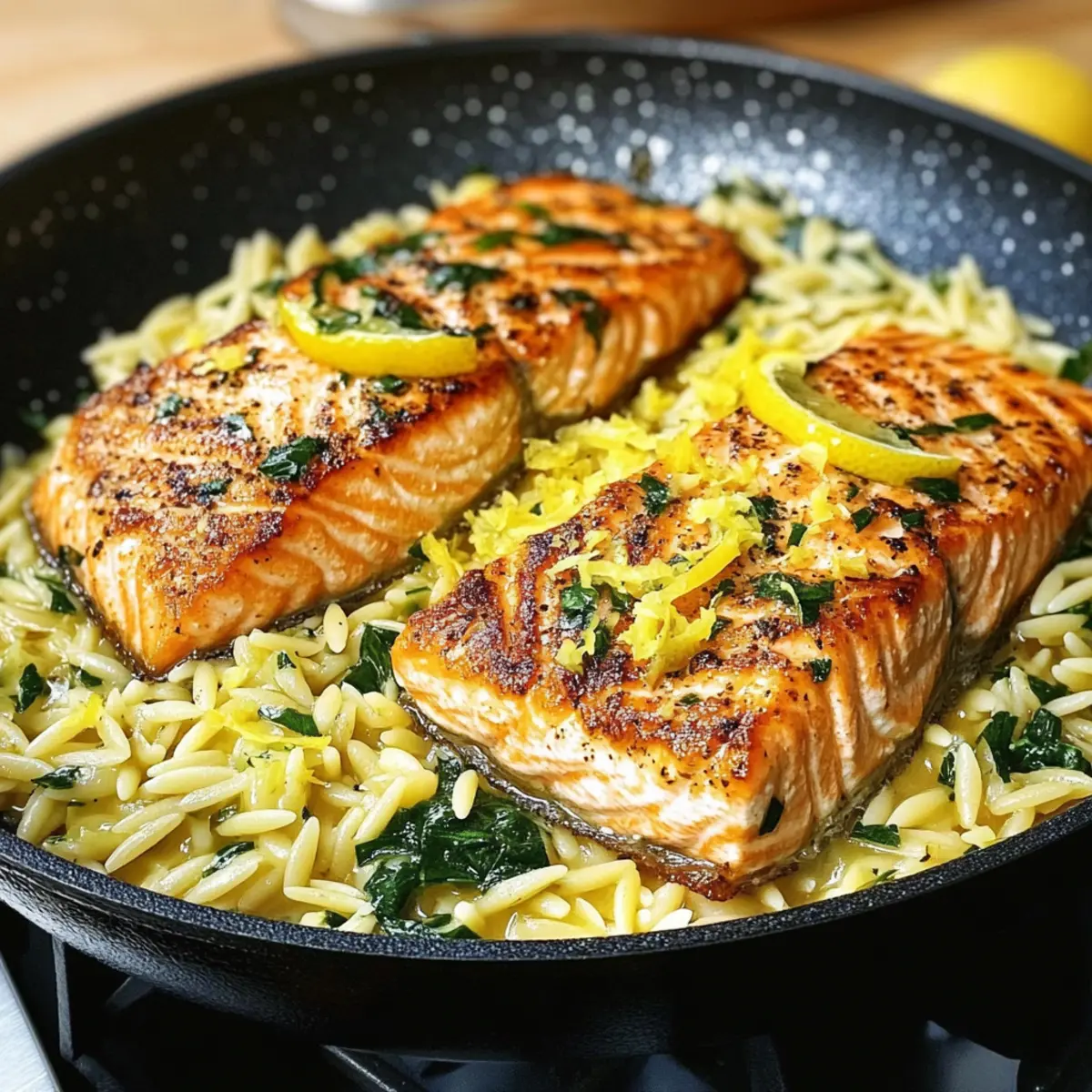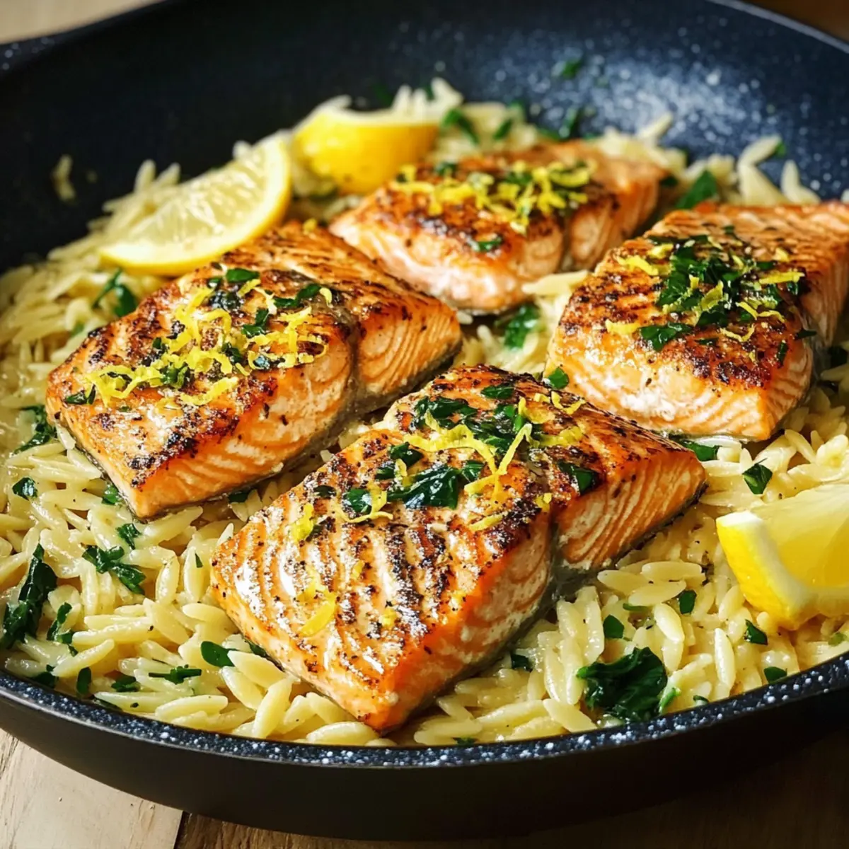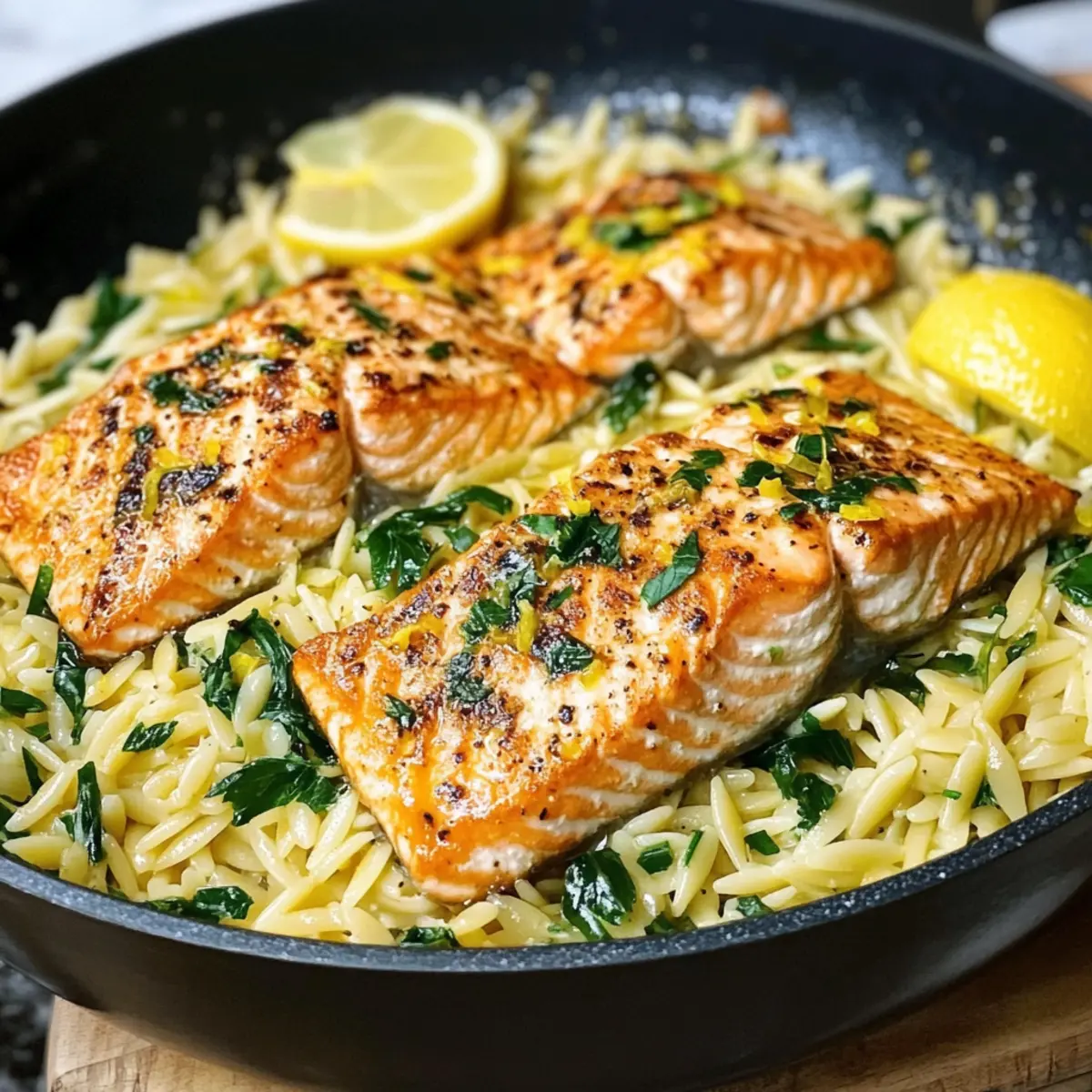 Kürzlich bin ich auf eine App gestoßen, die mir alle möglichen Rezepte versprach – aber nichts konnte mich so sehr faszinieren wie die Idee vom Ein-Pfannen-Lachs mit Zitronen-Orzo. In nur 30 Minuten zaubert man mit diesem Rezept ein helles, geschmackvolles Abendessen, das nicht nur schnell, sondern auch unglaublich vielseitig ist. Der zarte Lachs gepaart mit cremigem Orzo und einem spritzigen Zitrusgeschmack ist nicht nur ein wahrer Gaumenschmaus, sondern auch perfekt für hektische Wochentage. Diese Kombination sorgt für eine entspannende Atmosphäre, während der köstliche Duft von Knoblauch und Zitrone durch die Küche zieht. Und das Beste? Du kannst die Zutaten nach Belieben anpassen – für jeden Geschmack ist etwas dabei! Bist du bereit, dein nächstes Lieblingsgericht kennenzulernen? Warum ist dieses Rezept ein Hit? Einfache Zubereitung: Mit nur einer Pfanne und wenigen Zutaten ist dieses Gericht schnell und unkompliziert, perfekt für stressige Abende. Aromatische Vielfalt: Der frische Zitrusgeschmack des Zitronen-Orzo kombiniert sich harmonisch mit dem zarten Lachs und zaubert eine Geschmacksexplosion auf deinen Teller. Familienfreundlich: Ideal für die ganze Familie – selbst die Kleinsten werden von diesem Gericht begeistert sein! Vielseitige Anpassungsmöglichkeiten: Ob du gerne etwas Gemüse hinzufügst oder die Pasta durch Alternative wie Ditalini ersetzt – der Kreativität sind keine Grenzen gesetzt. Zeitsparend: In nur 30 Minuten ist das Essen servierfertig – damit bleibt genug Zeit, um den Abend zu genießen. Vergiss nicht, dazu einen leichten Salat, wie den Birnensalat mit Balsamico, zu servieren! Ein-Pfannen-Lachs Zutaten • Entdecke die wichtigsten Zutaten für dieses köstliche Gericht! Für den Lachs Lachsfilet – Das Hauptprotein; verwende Filets mit Haut für zusätzlichen Biss. Tipp: Gefrorener Lachs ist ebenfalls geeignet; auftauen und trocken tupfen. Für den Orzo Orzo – Diese reisähnliche Pasta nimmt Aromen wunderbar auf und sorgt für eine cremige Konsistenz. Tipp: Alternativen wie Ditalini oder Perlcouscous können verwendet werden. Für die frische Zitronennote Zitrone – Sie bringt frische Säure und Aroma ins Gericht; sowohl Saft als auch Schale erhellen das Essen. Tipp: Weißweinessig oder eingelegte Zitrone können als Ersatz dienen. Für die Aromengrundlage Knoblauch – Gibt einen aromatischen Geschmack und dient als hervorragende Basis. Zwiebel – Versorgt das Gericht mit Süße und Tiefe. Für die Cremigkeit Brühe – Hühner- oder Gemüsebrühe sorgt für reichhaltigen Geschmack, unerlässlich zum Kochen des Orzo. Tipp: Knochenbrühe verleiht dem Gericht zusätzliche Tiefe. Sahne – Macht die Sauce besonders samtig. Tipp: Kokoscreme für eine milchfreie Version verwenden. Für den letzten Schliff Parmesankäse – Der krönende Abschluss, der den Geschmack intensiviert. Tipp: Nährhefe für eine vegane Option nutzen. Mit diesen einfachen Zutaten kannst du das tolle Rezept für Ein-Pfannen-Lachs mit Zitronen-Orzo nachkochen. Lass die Küche duften! Schritt-für-Schritt-Anleitung für Ein-Pfannen-Lachs mit Zitronen-Orzo: Ein helles, geschmackvolles Abendessen in nur 30 Minuten Step 1: Lachs vorbereiten Lass das Lachsfilet 15 Minuten bei Raumtemperatur ruhen, damit es gleichmäßiger gart. Dies hilft, den Lachs zart und saftig zu halten. Währenddessen kannst du die anderen Zutaten bereiten und deine Skillet (am besten aus Gusseisen oder Edelstahl) bereitstellen. Step 2: Lachs anbraten Erhitze die Pfanne bei mittlerer bis hoher Temperatur und füge einen Esslöffel Öl hinzu. Lege das Lachsfilet mit der Hautseite nach unten in die heiße Pfanne. Brate den Lachs 4–5 Minuten lang, bis sich eine goldene Kruste gebildet hat. Achte darauf, ihn nicht zu bewegen, damit er schön knusprig wird. Step 3: Lachs wenden Wende den Lachs vorsichtig mit einem Fischwender und brate ihn weitere 2–3 Minuten, bis das Filet in der Mitte gerade noch opak ist. Sobald er fertig ist, nimm den Lachs aus der Pfanne und lege ihn beiseite. Diese Zubereitung ist wichtig, um die Saftigkeit des Ein-Pfannen-Lachs zu bewahren. Step 4: Zwiebeln und Knoblauch anbraten Im verbliebenen Öl in der Pfanne die fein gehackten Zwiebeln und den Knoblauch 2–3 Minuten anbraten, bis sie weich und duftend sind. Dies bildet die aromatische Basis für deinen Zitronen-Orzo und sorgt für einen köstlichen Geschmack. Step 5: Orzo hinzufügen Füge den Orzo in die Pfanne hinzu und rühre ihn kurz um, um ihn in den Aromen des Knoblauchs und der Zwiebel zu rösten. Dies verstärkt den Geschmack und sorgt dafür, dass der Orzo während des Kochens die Brühe gut aufnimmt. Step 6: Brühe einfüllen Gieße nun die Brühe in die Pfanne, sodass der Orzo vollständig bedeckt ist. Bring die Mischung zum Kochen und reduziere die Hitze auf mittlere Stufe. Lass den Orzo 10–12 Minuten köcheln, wobei du gelegentlich umrührst. Achte darauf, dass er al dente bleibt und nicht zu weich wird. Step 7: Zitronen hinzufügen Füge in den letzten 3 Minuten der Kochzeit den Zitronensaft und die Zitronenschale hinzu. Diese frischen Aromen heben den Geschmack des Ein-Pfannen-Lachs mit Zitronen-Orzo und verleihen dem Gericht eine spritzige Note. Step 8: Lachs zurück in die Pfanne Lege den gebratenen Lachs zurück in die Pfanne, um ihn kurz zu erwärmen, etwa 1–2 Minuten lang. So können sich die Aromen des Orzo mit dem Lachs verbinden und der Lachs bleibt warm und saftig. Step 9: Anrichten und servieren Nimm die Pfanne vom Herd und serviere den Ein-Pfannen-Lachs mit Zitronen-Orzo sofort. Du kannst das Gericht mit Parmesan, frischen Kräutern oder einem Spritzer Olivenöl garnieren. Genieß dein schnelles, geschmackvolles Abendessen! Lagerungstipps für Ein-Pfannen-Lachs mit Zitronen-Orzo Raumtemperatur: Bis zu 2 Stunden nach der Zubereitung kann das Gericht bei Raumtemperatur aufbewahrt werden, um die Qualität zu erhalten. Kühlschrank: Bewahre Reste in luftdichten Behältern im Kühlschrank au