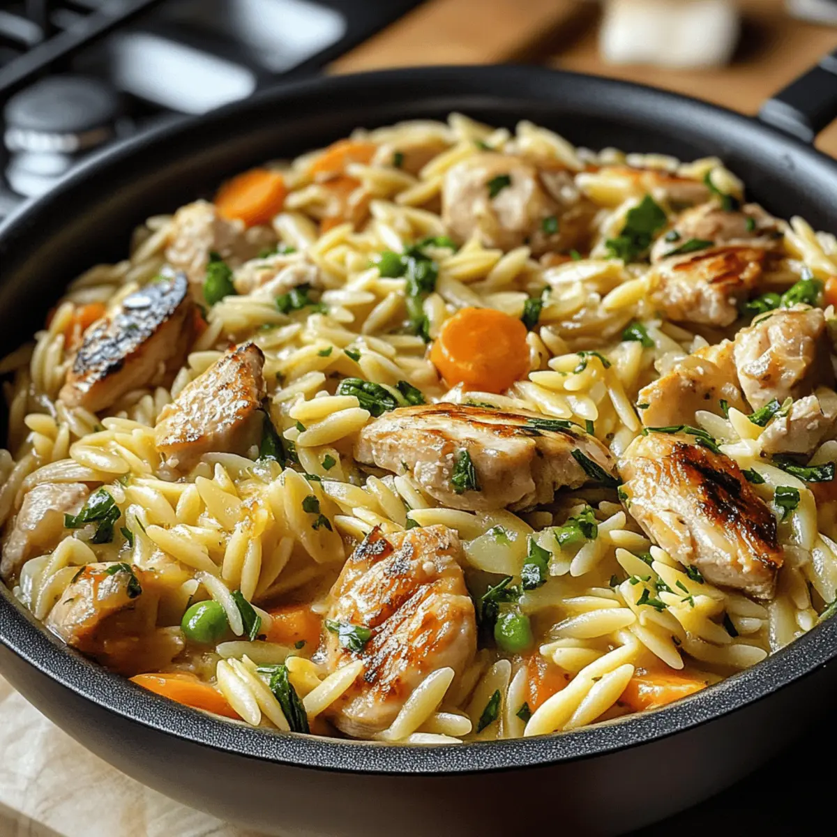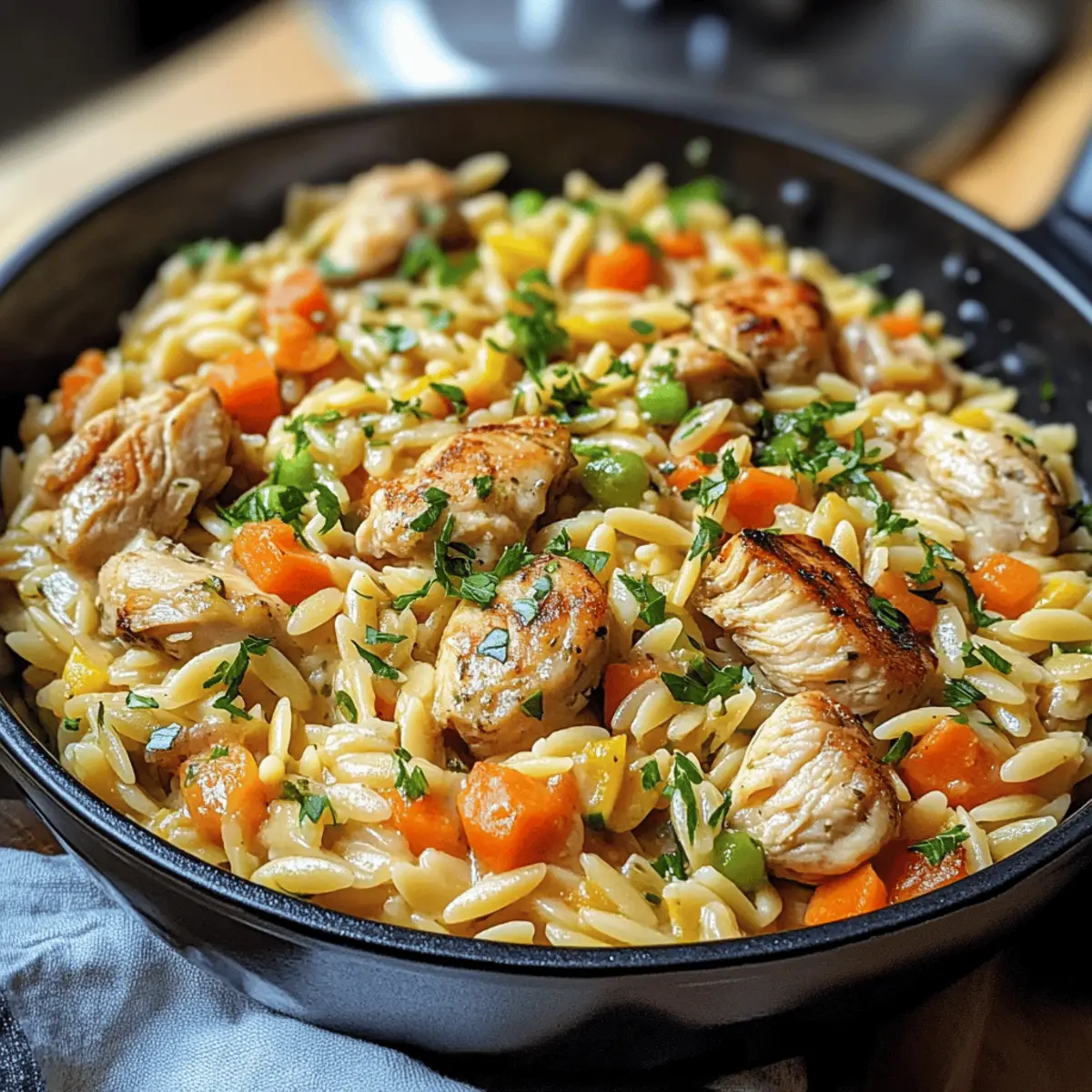 Achte darauf, dass das Hähnchen frisch und ohne sichtbare Anzeichen von Zähigkeit oder Verfärbungen ist. Bei Gemüse solltest du knackige und lebendig gefärbte Stücke wählen, da diese nicht nur optisch ansprechend sind, sondern auch mehr Nährstoffe enthalten. Idealerweise sollten die Orzo-Nudeln gleichmäßig groß sein, um beim Kochen durchgängig zu garen.