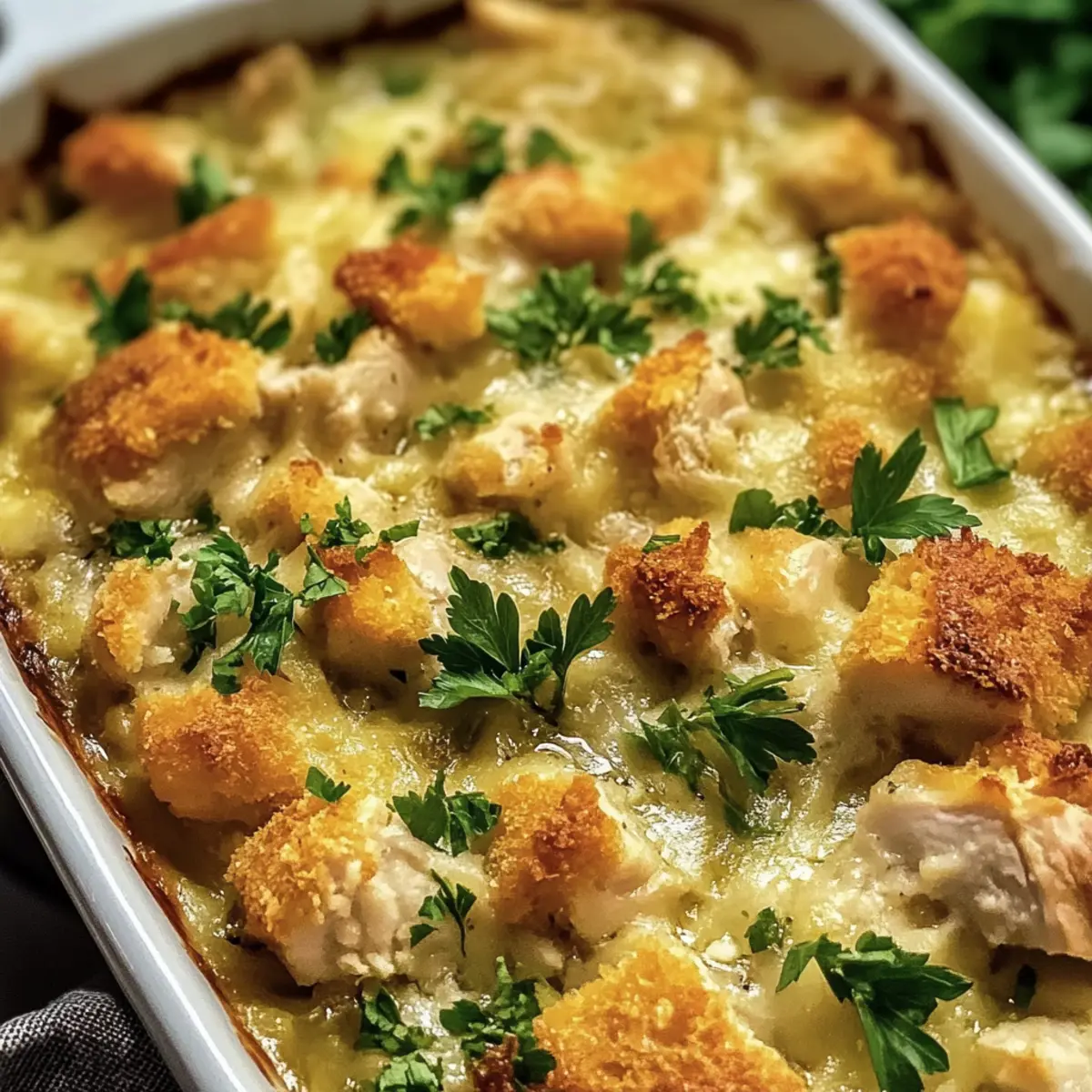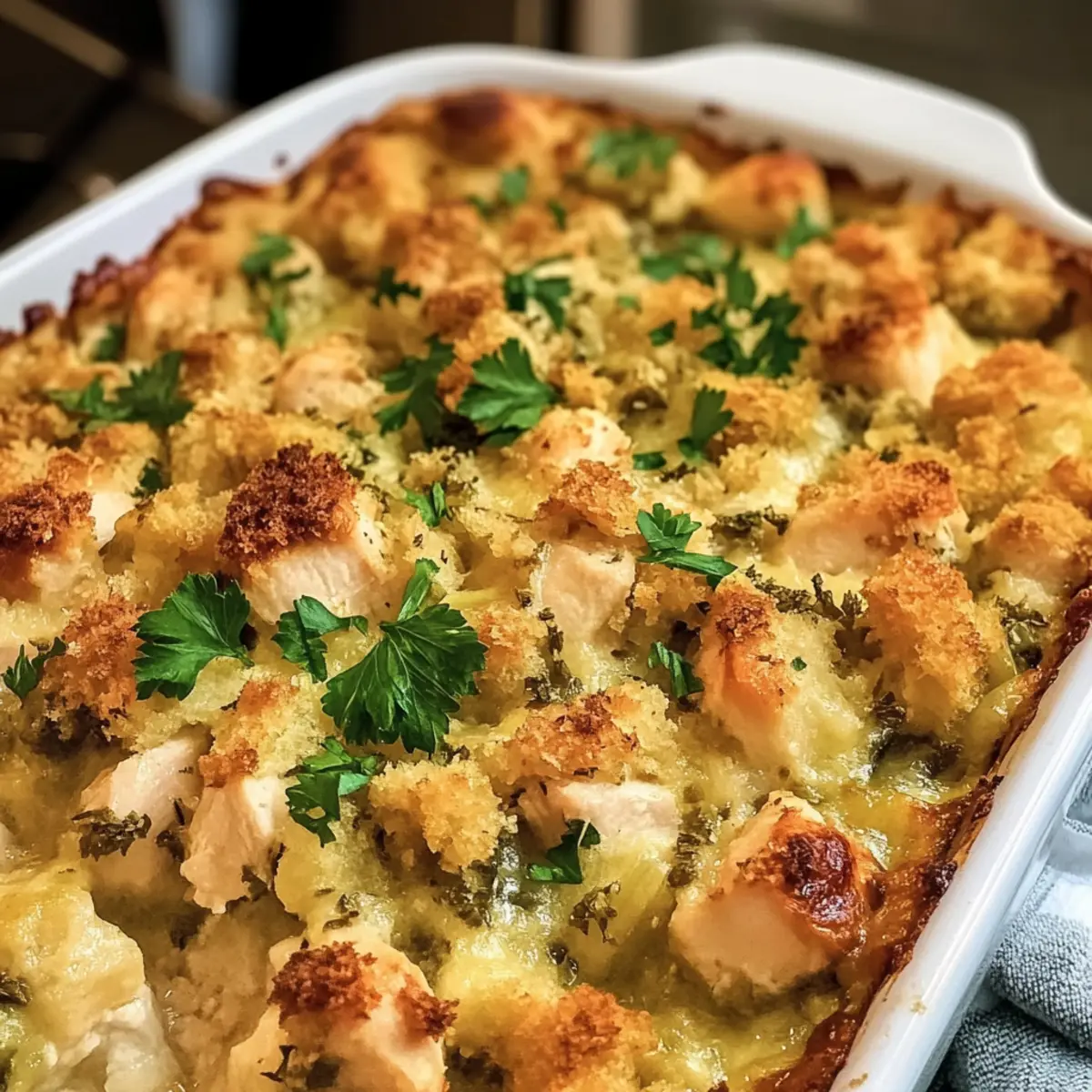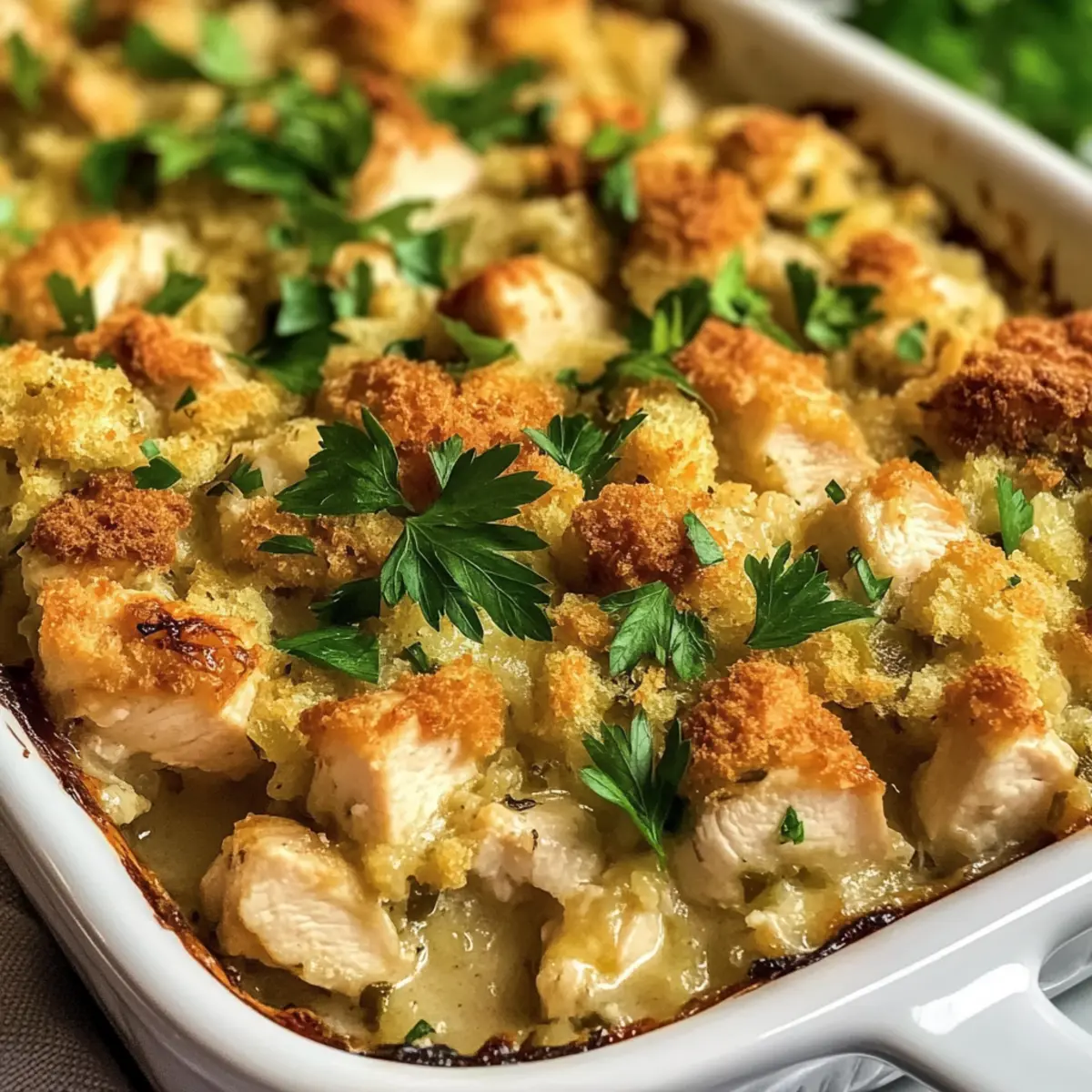 Wenn der Abend naht und der Hunger laut wird, greift mein Herz sofort zu einem Klassiker: dem einfachen Hähnchen- und Füllauflauf. Dieser köstliche Auflauf kombiniert das Beste aus Komfortessen in nur einer Pfanne – genau das, was man nach einem langen Tag braucht. Mit seiner cremigen Textur und dem verführerischen Aroma wird er schnell zum Favoriten in unserer Familie. Die Zubereitung ist kinderleicht, perfekt für all jene, die Reste von Hähnchen verwerten oder einfach eine schmackhafte, nahrhafte Mahlzeit im Handumdrehen zaubern wollen. Und das Beste daran? Dieser Auflauf ist nicht nur ein echter Genuss, sondern lässt sich auch ganz nach deinem Geschmack abwandeln. Bist du bereit, das Geheimnis eines herzlichen Abendessens zu entdecken? Warum wirst du diesen Auflauf lieben? Einfache Zubereitung: Du benötigst nur wenige Zutaten und minimalen Aufwand, um diese köstliche Mahlzeit auf den Tisch zu bringen. Herzhafter Geschmack: Die Kombination aus zartem Hühnchen, cremiger Sauce und knusprigem Füllmix sorgt für ein Geschmackserlebnis, das du lieben wirst. Vielseitigkeit: Du kannst mit den Zutaten spielen und Reste kreativ verwerten, ohne Kompromisse beim Genuss einzugehen. Familienfreundlich: Dieser Auflauf kommt bei Groß und Klein gleichermaßen gut an und ist perfekt für gesellige Abendessen. Ideal für Eilige: Mit nur 10 Minuten Vorbereitungszeit und einer einzigen Auflaufform sparst du Zeit in der Küche und kannst dich auf das Wesentliche konzentrieren. Köstlicher Komfort: Er bietet die perfekte Lösung für alle, die sich nach einer herzlichen, geborgenen Mahlzeit sehnen. Einfache Hähnchen- und Füllauflauf Zutaten Hinweis: Diese Zutatenliste für den einfachen Hähnchen- und Füllauflauf ist klar strukturiert und hilft dir, schnell zur schmackhaften Vorbereitung zu kommen. Für das Hühnchen • Hähnchenbrustfilets – Die Hauptproteinquelle sorgt für einen herzhaften Grundgeschmack. Du kannst auch auf Hähnchenschenkel oder Putenfilets ausweichen, wenn du etwas Abwechslung möchtest. Für die Soße • Cremesuppe mit Sellerie – Sie verleiht der Mischung eine cremige Textur und zusätzlichen Geschmack. Alternativ kannst du eine selbstgemachte weiße Soße mit 2 Tassen Milch, 4 EL Butter, 4 EL Mehl und angebratenem Gemüse verwenden. • Cremesuppe mit Hähnchen – Fügt eine reichhaltige Tiefe hinzu. Ein hausgemachter Ersatz ist ebenfalls möglich. • Milch – Verdünnt die Soße und sorgt für die richtige Konsistenz. Greife zu fettarmer oder pflanzlicher Milch, wenn du das wünschst. Für die Füllung • Stove Top Hähnchenfüllung – Die Basis des Auflaufs, die die Aromen aufnimmt. Homemade Semmelbrösel mit Geflügelgewürzen sind eine hervorragende Alternative (4 Tassen gewürztes, gewürfeltes Toastbrot). • Hühnerbrühe – Sorgt für Feuchtigkeit und Geschmack. Wähle eine natriumarme Variante für eine gesündere Option. Für die Würze • Koscheres Salz und schwarzer Pfeffer – Grundgewürze für den Geschmacksboost. Passe die Menge nach deinem Geschmack an. • Petersilie (optional) – Frisch oder getrocknet als Garnitur. Für eine Abwechslung eignen sich auch Schnittlauch oder Thymian. Schritt-für-Schritt-Anleitung für den Einfachen Hähnchen- und Füllauflauf Step 1: Ofen vorheizen Heize deinen Ofen auf 190°C vor. Diese Temperatur sorgt dafür, dass der Auflauf gleichmäßig gar wird und die Oberseite schön goldbraun wird. Während der Ofen vorheizt, kannst du dich um die Vorbereitungen des Auflaufs kümmern. Step 2: Backform vorbereiten Sprühe eine 28×18 cm große Auflaufform mit Kochspray ein, um ein Ankleben des Auflaufs zu verhindern. Achte darauf, dass die gesamte Fläche gut bedeckt ist. Dadurch wird die Reinigung nach dem Essen einfacher und der Auflauf lässt sich besser herausnehmen. Step 3: Hähnchen vorbereiten Schneide die Hähnchenbrustfilets in mundgerechte Stücke und lege sie gleichmäßig in die vorbereitete Auflaufform. Die Stücke sollten gleichmäßig verteilt sein, damit sie während des Kochens gleichmäßig garen und die Aromen gut in das Hähnchen einziehen können. Step 4: Würzen Würze das Hähnchen großzügig mit koscherem Salz und schwarzem Pfeffer. Verwende deine Hände oder einen Löffel, um die Gewürze gleichmäßig zu verteilen. So erhält das Hähnchen bereits in dieser Phase einen herzhaften Geschmack, der sich im gesamten Auflauf entfaltet. Step 5: Soße vorbereiten In einer Schüssel mische die Cremesuppe mit Sellerie, die Cremesuppe mit Hähnchen und die Milch, bis die Mischung schön glatt ist. Diese cremige Kombination sorgt für eine reichhaltige Basis im Auflauf. Gieße die Soße gleichmäßig über das Hähnchen in der Auflaufform. Step 6: Füllmix hinzufügen Streue die Hähnchenfüllung gleichmäßig über die Hähnchen-Soßen-Mischung. Diese Schicht nimmt die Aromen auf und bildet eine knusprige Kruste während des Backens. Achte darauf, dass der Füllmix alle Flüssigkeit bedeckt, damit er gleichmäßig durchweichen kann. Step 7: Brühe hinzugeben Gieße die Hühnerbrühe gleichmäßig über die Füllung. Diese Flüssigkeit sorgt dafür, dass der Auflauf saftig bleibt und der Füllmix optimal durchzieht. Überprüfe, dass alles gut benetzt ist, um ein Austrocknen zu verhindern. Step 8: Backen Decke die Auflaufform mit Aluminiumfolie ab und backe den Auflauf für 40-45 Minuten im vorgeheizten Ofen. Achte darauf, dass die Innentemperatur des Hähnchens mindestens 74°C erreicht, um sicherzustellen, dass es vollständig gegart ist. Nach 30 Minuten kannst du durch die Folie einen Blick darauf werfen, um das Aroma zu genießen. Step 9: Bräunung abschließen Entferne die Folie und backe den Auflauf weitere 5 Minuten, bis die Oberseite schön goldbraun und knusprig ist. Diese letzte Backzeit verleiht dem Auflauf eine appetitliche Textur und macht das Gericht noch einladender. Step 10: Garnieren und servieren Nimm den Auflauf aus dem Ofen und lasse ihn vor dem Servieren einige Minuten ruhen.