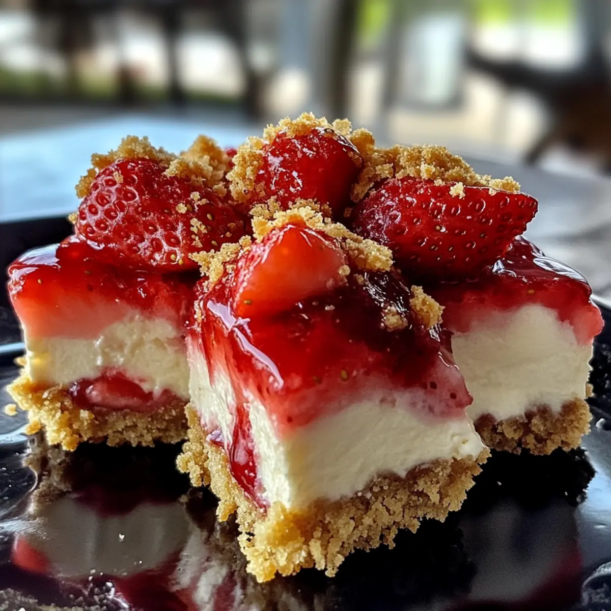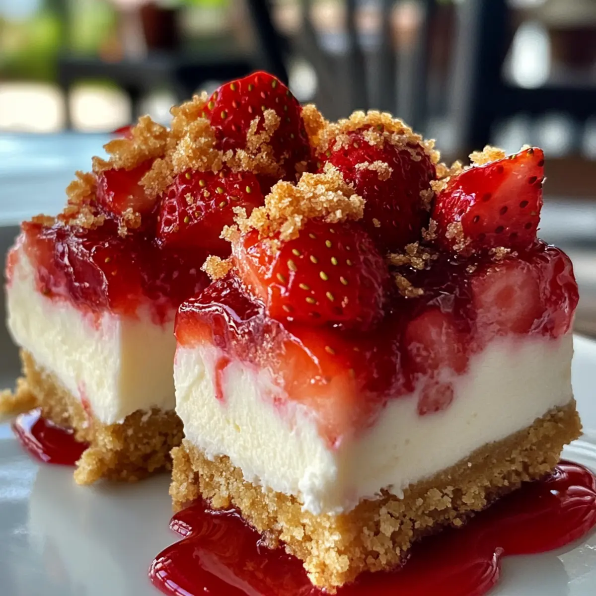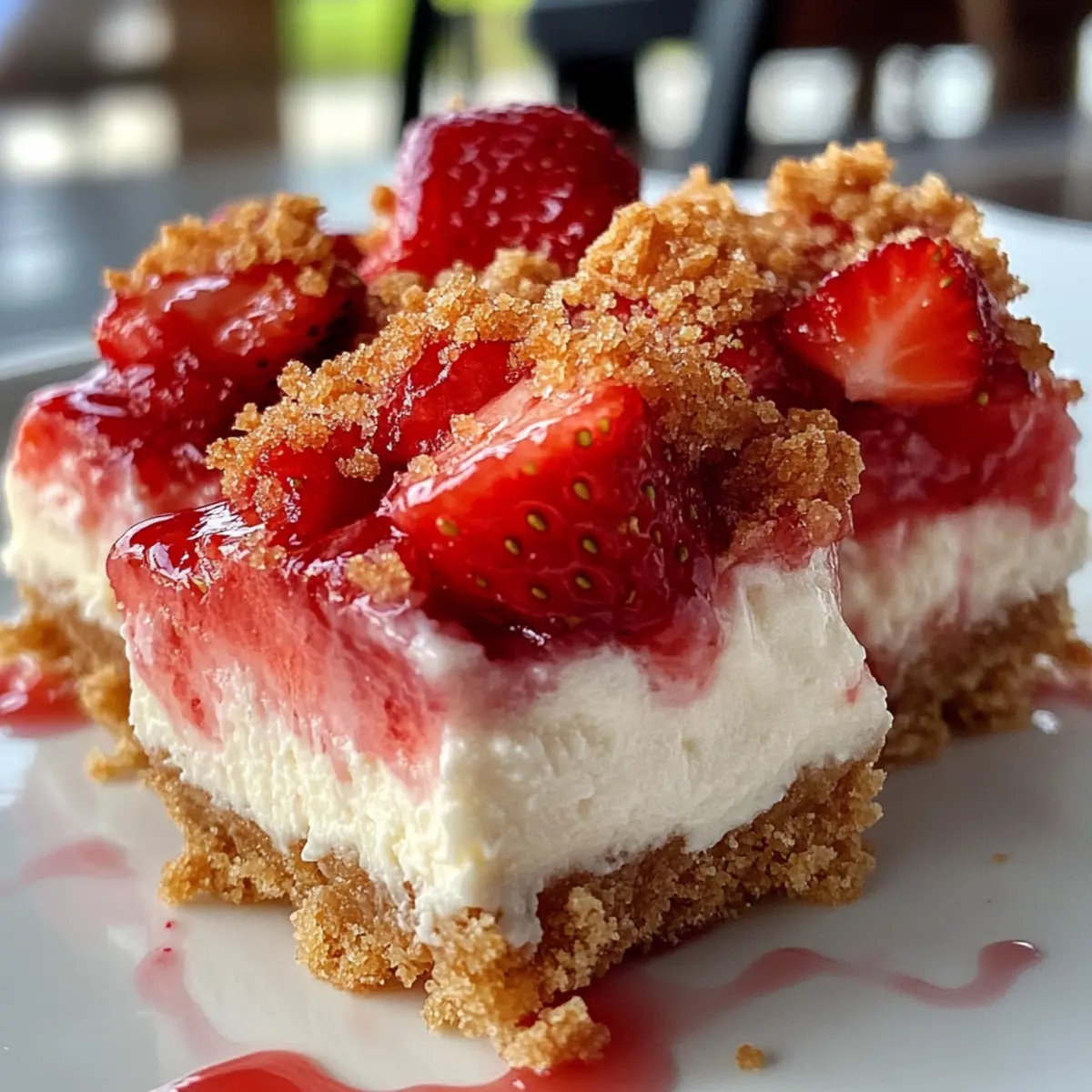 Eines der besten Dinge am Sommer ist die Möglichkeit, frische, saftige Erdbeeren in unsere Desserts einzubauen. Dies ist der perfekte Anlass, um die köstlichen Erdbeer-Crunch-Käsekuchen-Bissen zu zaubern, die nicht nur köstlich, sondern auch kinderleicht zuzubereiten sind. Diese No-Bake-Leckereien sind die ideale Wahl für alle, die auf der Suche nach schnellen, beeindruckenden Desserts sind – perfekt für Ihre nächste Gartenparty oder einfach nur, um sich selbst zu verwöhnen. Sie kombinieren die cremige Textur von Käsekuchen mit einem knackigen Erdbeer-Topping, das eine süß-saure Erfrischung bietet. Machen Sie Platz in Ihrem Kühlschrank, denn diese kleinen Genüsse werden nicht lange überleben! Wer würde sich nicht über eine solche Versuchung freuen? Warum sind Erdbeer-Crunch-Käsekuchen-Bissen ein Hit? Einfachheit: Die Zubereitung ist mühelos und benötigt keine Backkenntnisse, sodass Sie sich ganz auf den Spaß konzentrieren können. Unwiderstehlicher Geschmack: Die Kombination aus cremigem Käsekuchen und süß-sauren Erdbeeren wird Ihre Geschmacksknospen begeistert! Vielseitigkeit: Diese Bissen können leicht angepasst werden – probieren Sie verschiedene gefriergetrocknete Früchte für neuen Schwung. Perfekt für Partys: Egal, ob Geburtstag oder Gartenfeier, diese Leckereien sind immer ein Publikumsmagnet und verschwinden schnell vom Tisch. Zeitersparnis: Da sie ohne Backen auskommen, können Sie viel Zeit sparen und sich auf andere Aktivitäten konzentrieren, während die Bissen im Kühlschrank fest werden. Erdbeer-Crunch-Käsekuchen-Bissen Zutaten • Entdecken Sie die köstlichen Zutaten für diese No-Bake-Leckerei! Für den Boden Gemahlene Goldene Oreo-Kekse (1 1/2 Tassen) – Ideal als Grundlage für den Crust; für einen traditionellen Geschmack können Sie auch Graham-Cracker verwenden. Ungesalzene Butter (5 Esslöffel, geschmolzen) – Bindet die Bodenbestandteile; darauf achten, dass sie geschmolzen ist für eine gleichmäßige Mischung. Feines Meersalz (Prise) – Verstärkt den Geschmack des Bodens. Für den Crunch Gemahlene Goldene Oreo-Kekse (1 Tasse) – Fügt eine süße Textur und einen knusprigen Topping hinzu; eine tolle Alternative sind gefriergetrocknete Himbeeren für einen neuen Geschmack. Gefriergetrocknete Erdbeeren (1 Tasse) – Liefert intensiv fruchtigen Geschmack ohne zusätzliche Feuchtigkeit; frische Erdbeeren können matschig werden. Geschmolzene Butter (3 Esslöffel) – Hilft, die Crunch-Mischung zusammenzuhalten. Für die Füllung Vollfett-Frischkäse (16 Unzen, weich) – Der Hauptbestandteil der Käsekuchenfüllung; sollte Zimmertemperatur haben für eine glatte Mischung. Puderzucker (3/4 Tasse) – Süßt die Käsekuchen-Schicht. Reiner Vanilleextrakt (1 Teelöffel) – Fügt ein tolles Aroma hinzu. Frischer Zitronensaft (2 Esslöffel) – Bringt einen herrlichen Frischekick; ein tolles Gleichgewicht zur Süße. Sauerrahm (1/4 Tasse) – Verleiht Cremigkeit und einen Hauch von Säure. Kaltes Schlagsahne (1 Tasse) – Geschlagen für Leichtigkeit in der Füllung. Fein gehackte frische Erdbeeren (1 Tasse) – Bringt fruchtige Akzente in die Käsekuchenfüllung. Diese Erdbeer-Crunch-Käsekuchen-Bissen sind nicht nur einfach zuzubereiten, sondern bieten auch eine erfrischende und köstliche Abwechslung zu herkömmlichen Desserts. Perfekt für Ihre nächste Feier oder als süße Belohnung! Schritt-für-Schritt-Anleitung für Erdbeer-Crunch-Käsekuchen-Bissen Step 1: Backform vorbereiten Legen Sie eine 20 cm (8 Zoll) große quadratische Backform mit Backpapier aus und lassen Sie einen Überstand. Sprühen Sie die Form leicht mit einem Antihaftbeschichtungsspray ein, damit sich die Erdbeer-Crunch-Käsekuchen-Bissen später besser herauslösen lassen. Step 2: Boden zubereiten Vermischen Sie in einer Schüssel die zerdrückten Goldenen Oreo-Kekse mit der geschmolzenen Butter und einer Prise Salz. Rühren Sie die Mischung gut um, bis alles gleichmäßig vermengt ist, und drücken Sie die Mischung fest auf den Boden der vorbereiteten Backform. Lassen Sie den Boden optional für etwa 10 Minuten im Kühlschrank fest werden. Step 3: Sahne schlagen Schlagen Sie die kalte Schlagsahne in einer kaltgelegten Schüssel, bis sich steife Spitzen bilden. Dies dauert etwa 3-5 Minuten. Stellen Sie die geschlagene Sahne anschließend in den Kühlschrank, während Sie die Käsekuchenfüllung zubereiten. Step 4: Käsekuchenfüllung vorbereiten Schlagen Sie den weichen Frischkäse in einer großen Schüssel glatt. Fügen Sie den Puderzucker, Vanilleextrakt, Zitronensaft und Sauerrahm hinzu und mixen Sie alles gut durch, bis eine seidige Konsistenz erreicht ist. Step 5: Erdbeeren hinzufügen Falten Sie vorsichtig die fein gewürfelten frischen Erdbeeren in die Käsekuchenfüllung. Stellen Sie sicher, dass sich die Erdbeeren gleichmäßig verteilen, ohne die Luftigkeit der Mischung zu beeinträchtigen. Step 6: Geschlagene Sahne einarbeiten Fügen Sie die geschlagene Sahne in zwei Portionen zur Käsekuchenfüllung hinzu und heben Sie sie vorsichtig unter. Achten Sie darauf, die Luftigkeit zu bewahren, damit die Käsekuchenfüllung leicht wird. Step 7: Füllung in den Boden geben Verteilen Sie die Käsekuchenfüllung gleichmäßig auf dem vorbereiteten Keksboden und glätten Sie die Oberfläche mit einem Spatel. Decken Sie die Backform fest mit Frischhaltefolie ab und kühlstellen, damit die Mischung mindestens 4 Stunden oder bis zum Festwerden bleibt. Step 8: Topping zubereiten Vermischen Sie die restlichen zerdrückten Goldenen Oreo-Kekse, die gefriergetrockneten Erdbeeren, die geschmolzene Butter und eine Prise Salz in einer Schüssel. Verteilen Sie die Mischung auf einem Blech, sodass sie für einige Minuten trocknen kann. Step 9: Zusammenbauen Heben Sie den fest gewordenen Käsekuchen aus der Form und streuen Sie die Crunch-Mischung gleichmäßig über die Oberfläche. Drücken Sie sie leicht an, damit sie gut haftet. Step 10: Schneiden und servieren Schn