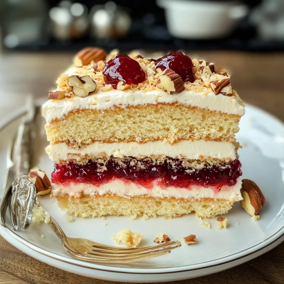 7. Obere Schicht mit Buttercreme und Krokant dekorieren, Belegkirschen hinzufügen.