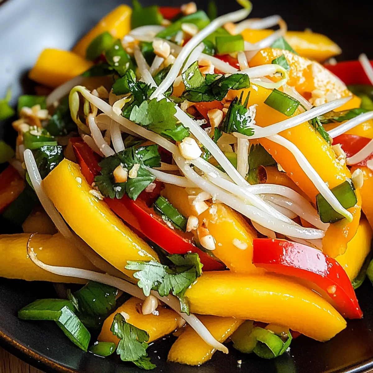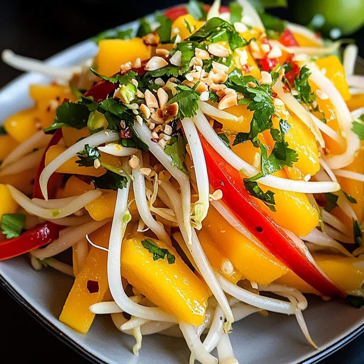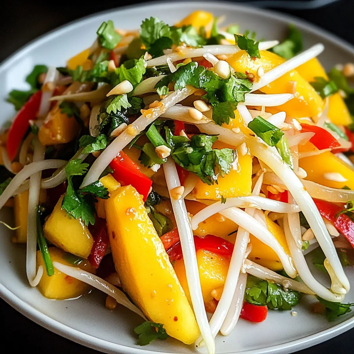 Die Sonne brennt auf meiner Haut, während ich in den lebhaften Straßen Bangkoks schlendere, und der verlockende Duft von frisch zubereitetem Thai-Mango-Salat zieht mich in eine kleine Garküche. Genau diesen Geschmack möchte ich heute mit dir teilen: mein Rezept für einen frischen Thai-Mango-Salat mit zesty Chili-Limetten-Dressing. Dieser Salat vereint süße, saftige Mango mit knackigen Gemüse und aromatischen Kräutern – und das alles in weniger als 10 Minuten! Er ist nicht nur eine schnelle und einfache Ergänzung zu jedem Sommer-BBQ, sondern lässt sich auch wunderbar anpassen, ganz nach deinem Geschmack. Egal, ob du ihn als leichte Mahlzeit oder erfrischende Beilage servierst, ich verspreche dir, dass jeder Bissen ein wenig Urlaub auf deinem Teller sein wird. Bereit, den asiatischen Flair in deine Küche zu bringen? Lass uns anfangen! Warum wirst du diesen frischen Salat lieben? Einfachheit: Die Zubereitung ist kinderleicht und erfordert keine komplizierten Kochtechniken. Frische Aromen: Die Kombination aus süßer Mango, knackigem Gemüse und aromatischen Kräutern bringt ein Stück Thailand direkt auf deinen Tisch. Vielfältig: Ob als leichte Hauptspeise oder erfrischende Beilage, dieser Salat passt sich perfekt deinem Geschmack an – du kannst ihn sogar mit Protein wie gegrilltem Hühnchen oder Tofu anreichern! Schnell gemacht: In weniger als 10 Minuten bist du fertig, ideal für einen schnellen Snack oder eine unerwartete Gäste. Gesund: Hoch in Vitaminen und Ballaststoffen, ist dies die perfekte Wahl für gesundheitsbewusste Genießer. Und falls du noch mehr spannende Salatvariationen entdecken möchtest, schau dir auch unsere Empfehlung für saisonale Salate an! Frischer Thai-Mango-Salat Zutaten • Ein leichter und gesunder Genuss! Für den Salat Mango – bringt Süße und eine saftige Textur; ersetze sie durch grüne oder halbreife Mangos für mehr Säure. Grüne Zwiebel – fügt einen scharfen, knusprigen Biss hinzu; kann durch Schnittlauch ersetzt werden. Süßer roter Paprika – sorgt für Farbe und Süße; tausche ihn gegen gelbe Paprika oder Gurken aus, wenn du möchtest. Frische Sojabohnensprossen – geben Knusprigkeit und Nährstoffe; ersetze sie mit geriebenem Kohl für eine ähnliche Textur. Frischer Koriander – bringt Frische und einen charakteristischen Geschmack; frisch gehackte Petersilie oder Minze sind gute Alternativen. Für das Dressing Süße Chilisauce – sorgt für Süße und milde Schärfe; für eine gesündere Variante verwende selbstgemachte oder Honig als Ersatz. Limettensaft und -schale – fügen einen erfrischenden, säuerlichen Geschmack hinzu; ersetze sie bei Bedarf durch Zitronensaft. Frisch geriebener Ingwer – bringt Wärme und Gewürz; getrockneter Ingwer kann verwendet werden, aber weniger ist mehr. Gehackter Knoblauch – verstärkt den Geschmack; Knoblauchpulver kann auch verwendet werden, wenn nötig. Fischsauce oder helle Sojasauce – fügt Umami hinzu; verwende Sojasauce für eine vegane Option. Gewürze Salz und Pfeffer – verstärken den Gesamtgeschmack; nach Geschmack anpassen. Mit diesen frischen Zutaten für deinen Frischen Thai-Mango-Salat kannst du sicherstellen, dass jeder Bissen voller Geschmack und gesundem Genuss ist! Schritt-für-Schritt-Anleitung für Frischer Thai-Mango-Salat Step 1: Dressing vorbereiten In einer kleinen Schüssel die süße Chilisauce, den Limettensaft und die Limettenschale, den frisch geriebenen Ingwer, den gehackten Knoblauch sowie die Fischsauce oder Sojasauce gut miteinander verquirlen. Achte darauf, dass alle Zutaten gut vermischt sind und die Konsistenz des Dressings leicht dickflüssig ist. Beiseite stellen, damit sich die Aromen entfalten können. Step 2: Salatzutaten mischen In einer großen Schüssel die in Streifen geschnittene Mango, die frischen Sojabohnensprossen, den gehackten süßen roten Paprika, den frischen Koriander und die geschnittenen grünen Zwiebeln miteinander vermengen. Achte darauf, dass alle Zutaten gleichmäßig verteilt sind und die Farben schön leuchten, um den appetitlichen Anblick des frischen Thai-Mango-Salats zu genießen. Step 3: Alles kombinieren und servieren Das vorbereitete Dressing gleichmäßig über den gemischten Salat gießen. Vorsichtig mit zwei Gabeln alles vermengen, bis der Salat gleichmäßig mit dem Dressing überzogen ist. Dabei darauf achten, dass die Mango-Stücke nicht zerdrückt werden. Nach Geschmack mit Salz und Pfeffer würzen. Um die frischesten Aromen zu genießen, sofort servieren. Meal Prep für Frischen Thai-Mango-Salat Der Frische Thai-Mango-Salat eignet sich hervorragend für die Meal Prep! Du kannst die geschnittenen Zutaten wie Mango, Gemüse und Kräuter bis zu 24 Stunden im Voraus vorbereiten und in einem luftdichten Behälter im Kühlschrank aufbewahren, um maximale Frische zu gewährleisten. Achte darauf, das Dressing getrennt zu lagern, um zu verhindern, dass der Salat matschig wird. Vor dem Servieren einfach das Dressing über die Salatzutaten geben, vorsichtig vermengen und mit Salz und Pfeffer abschmecken. So hast du in wenigen Minuten eine leckere, gesunde Mahlzeit, die geschmacklich ebenso gut ist wie frisch zubereitet! Lagerungstipps für Frischen Thai-Mango-Salat Kühlschrank: Halte den Salat ohne Dressing für bis zu 1 Tag im Kühlschrank frisch, um die knackige Textur der Zutaten zu bewahren. Airtight-Behälter: Verwende einen luftdichten Behälter, um den frischen Thai-Mango-Salat vor anderen Gerüchen im Kühlschrank zu schützen. Dressing separat lagern: Bewahre das Dressing separat auf und füge es erst kurz vor dem Servieren hinzu, um ein Durchweichen der Zutaten zu vermeiden. Genießen: Serviere den Salat idealerweise frisch, um die Aromen und Texturen voll zu erleben. Variationen für frischen Thai-Mango-Salat Lass deiner Kreativität freien Lauf und passe dieses Rezept nach deinem Geschmack an! Vegan: Ersetze Fischsauce durch Sojasauce für eine vegane Variante. Das bleibt lecker und umami-gelad