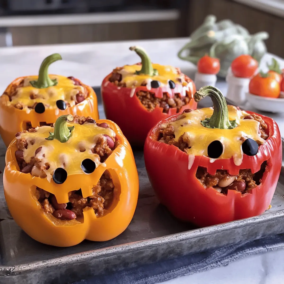 Leckere gefüllte Halloween Paprika mit Chili con Carne für eine festliche Gelegenheit.