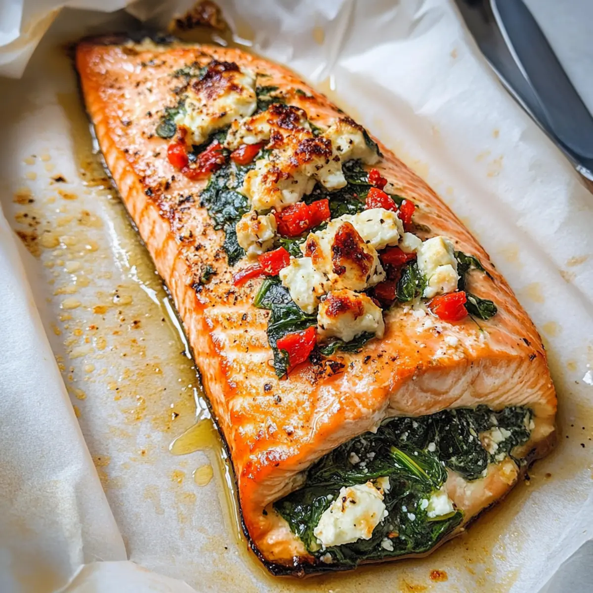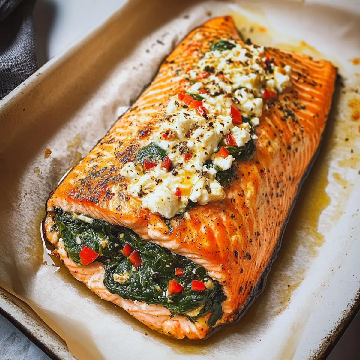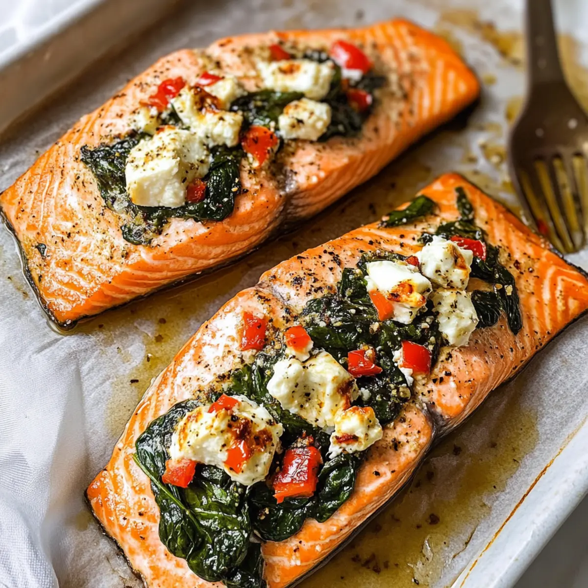 Wenn der Duft von frisch gebackenem Lachs deine Küche erfüllt, könnte das schon der erste Schritt zu einem besonderen Abendessen sein. Dieses Rezept für gefüllten Lachs mit Spinat und Feta bietet dir nicht nur eine gesunde Option, die in nur 30 Minuten zubereitet ist, sondern verwandelt jede Mahlzeit in ein mediterranes Festmahl. Der schmelzende Feta und die zarte Frische des Spinats sorgen für eine harmonische Geschmackskombination, die sowohl die Familie als auch Gäste begeistert. Egal, ob du ein schnelles Abendessen unter der Woche suchst oder eine leckere Speise für dein nächstes Dinner-Event planst – dieser gefüllte Lachs wird dir mit Sicherheit helfen, die Herzen (und den Hunger) aller zu gewinnen. Neugierig, wie du dieses köstliche Gericht zubereitest? Lass uns gemeinsam loslegen! Warum wirst du gefüllten Lachs lieben? Vielfalt: Dieses Rezept ist nicht nur schnell und einfach, sondern auch extrem anpassungsfähig. Du kannst das Füllungsmaterial je nach Saison oder Vorlieben variieren, zum Beispiel mit Sonnengetrockneten Tomaten oder anderen Käsesorten experimentieren. Gesundheitlich vorteilhaft: Mit frischem Spinat, Feta und proteinreichem Lachs ist es eine fantastische Wahl für gesunde Mahlzeiten, die Körper und Geist nähren. Schnelligkeit: In nur 30 Minuten auf dem Tisch – perfekt für hektische Wochentage, an denen du dennoch ein festliches Gericht genießen möchtest. Einladende Präsentation: Der gefüllte Lachs sieht nicht nur beeindruckend aus, sondern schmeckt auch so. Die bunten Farben der Füllung verleihen deinem Teller einen mediterranen Flair. Familienfreundlich: Diese Kombination aus köstlichen Aromen wird garantiert bei Familie und Freunden gut ankommen, ideal für Dinner-Events oder gemütliche Abende zu Hause. Wenn du nach weiteren leckeren Gerichten suchst, wie dem Knoedel Selbst Machen oder dem Kirsch Pistazien Cheesecake, wirst du hier fündig! Gefüllter Lachs mit Spinat und Feta Zutaten Für den Lachs Lachs – Frische Filets bieten die beste Textur und den besten Geschmack. Olivenöl (2 EL) – Ideal zum Bestreichen des Lachses und Sautieren des Spinats. Avocadoöl ist ein guter Ersatz. Salz & Pfeffer – Nach Geschmack würzen, um die Aromen zu betonen. Für die Füllung Babyspinat (3 Tassen, gepackt) – Bringt Nährstoffe und Volumen in die Füllung. Italienische Gewürzmischung (1 TL) – Verleiht dem Gericht ein mediterranes Flair; alternativ können gleiche Teile Oregano, Basilikum und Thymian verwendet werden. Paprika (1/2 TL) – Sorgt für subtile Farbe und Wärme, verwende geräucherte Paprika für intensiveren Geschmack. Cayennepfeffer – Fügt eine leichte Würze hinzu; je nach Vorliebe anpassen. Feta-Käse (ca. 150 g) – Cremige, würzige Komponente, die beim Backen schmilzt. Schafskäse für besten Geschmack verwenden. Parmesan (1/4 Tasse, frisch gerieben) – Bringt Tiefe in den Geschmack; empfehlenswert: Parmigiano-Reggiano. Geröstete rote Paprika (1/4 Tasse, gehackt) – Süße, saure Ergänzung; kann durch sonnengereifte Tomaten ersetzt werden. Viel Freude beim Zubereiten des gefüllten Lachses mit Spinat und Feta! Dieses Gericht wird nicht nur sättigen, sondern auch das Herz jeder Mahlzeit erwärmen. Schritt-für-Schritt-Anleitung für gefüllten Lachs mit Spinat und Feta Step 1: Ofen vorheizen Heize deinen Ofen auf 200 °C vor und lege ein Backblech mit Backpapier aus. Diese Vorarbeit sorgt dafür, dass der gefüllte Lachs gleichmäßig und perfekt gart. Während der Ofen aufheizt, kannst du dich auf die Vorbereitung der anderen Zutaten konzentrieren. Step 2: Lachs vorbereiten Schneide jeden Lachsfilet längs ein, sodass sie am Ende noch verbunden sind. Bestreiche die Außenseite mit 1 EL Olivenöl und würze sie großzügig mit Salz und Pfeffer. Diese Schritte verleihen dem gefüllten Lachs mit Spinat und Feta schon beim Würzen viel Geschmack und sorgen für eine köstliche Kruste. Step 3: Spinat sautieren Erhitze in einer großen Pfanne das restliche Olivenöl bei mittlerer Hitze. Gib den Babyspinat zusammen mit der italienischen Gewürzmischung, Paprika, Cayenne, Salz und Pfeffer hinein. Koche die Mischung unter gelegentlichem Rühren für etwa 2 Minuten, bis der Spinat zusammengefallen ist und eine leuchtend grüne Farbe annimmt. Step 4: Füllung mischen Schalte die Hitze aus und rühre die gehackten gerösteten roten Paprika, den Feta-Käse und den frisch geriebenen Parmesan unter den Spinat. Mische alles gut, bis die Zutaten gleichmäßig verteilt sind und eine cremige Füllung entsteht, die perfekt im gefüllten Lachs zur Geltung kommt. Step 5: Lachs füllen Verwende einen Löffel, um die Spinat-Feta-Mischung vorsichtig in die Einschnitte des Lachsfilets zu füllen. Achte darauf, dass die Füllung gleichmäßig verteilt ist, damit jeder Bissen eine köstliche Kombination aus Spinat und Feta bietet. Du kannst die Füllung leicht andrücken, damit nichts herausfällt. Step 6: Backen Lege den gefüllten Lachs mit Spinat und Feta auf das Backblech und schiebe es in den vorgeheizten Ofen. Backe den Lachs für 12 bis 17 Minuten, bis er durchgegart ist. Der Lachs sollte im Inneren undurchsichtig erscheinen, was ein Zeichen dafür ist, dass er perfekt gegart ist. Step 7: Servieren Nehme den gefüllten Lachs aus dem Ofen und lasse ihn kurz ruhen. Serviere ihn heiß, am besten mit Beilagen wie einem leichten Salat oder Quinoa, um ein ausgewogenes und köstliches Essen zu genießen. Dieses Gericht wird sicher alle am Tisch begeistern! Aufbewahrungstipps für gefüllten Lachs mit Spinat und Feta Raumtemperatur:: Gefüllter Lachs sollte nicht länger als 2 Stunden bei Raumtemperatur gelagert werden, um die Frische und Sicherheit zu gewährleisten. Kühlschrank:: Bewahre die Reste in einem luftdichten Behälter im Kühlschrank auf, wo sie bis zu 3 Tage haltbar sind. Gefriertruhe:: Wenn du den gefüllten Lachs einfrieren möchtest, verpacke ihn gut in Frischhaltefolie und/oder einem Gefrierbeutel. Er hält sich bis zu 3