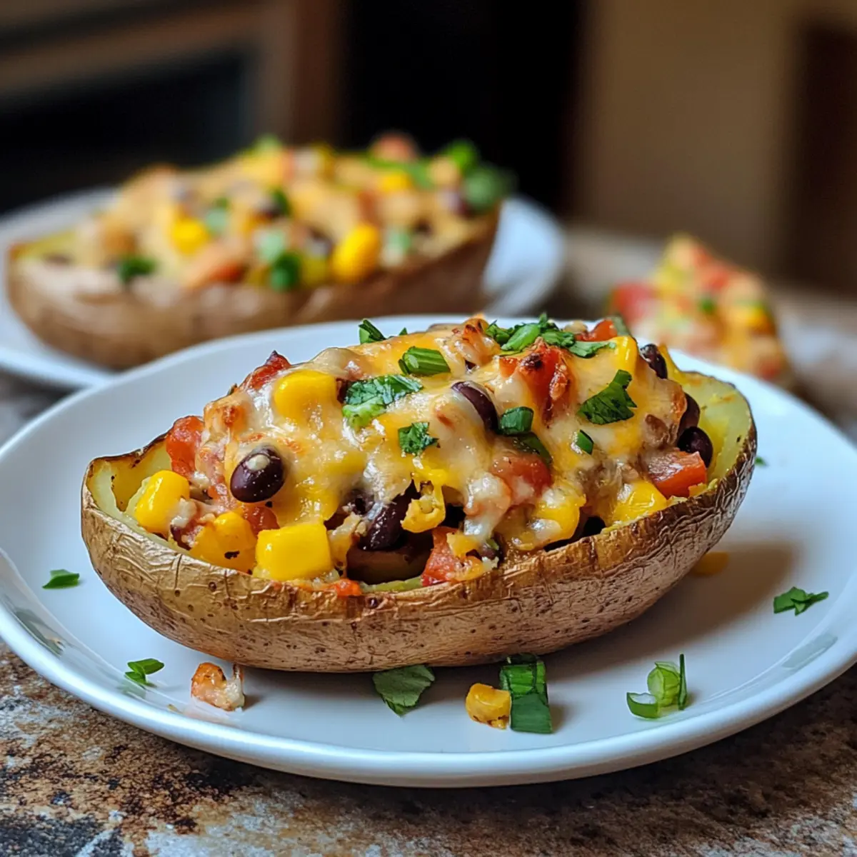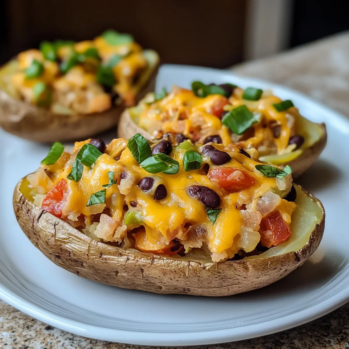 Die Ofenwärme strömt durch die Küche und bringt Erinnerungen an gemütliche Familienessen zurück. Gefüllte Ofenkartoffeln sind das perfekte Beispiel für ein Gericht, das nicht nur gut schmeckt, sondern auch einfach zuzubereiten ist. In dieser Version vereinen sich die Aromen von frischem Gemüse und veganem Käse zu einer köstlichen Füllung, die selbst die skeptischsten Esser begeistern wird. Ob du ein schnelles Abendessen oder ein sättigendes Mittagessen planst, diese gefüllten Ofenkartoffeln sind nicht nur gesund und nahrhaft, sondern auch ein wahrer Hingucker auf dem Teller. Lass dich überraschen, wie viel Freude dir das Ausprobieren dieser Variante bereiten kann – und wer weiß, vielleicht entdeckst du bald deinen neuen Lieblingssnack? Warum sind gefüllte Ofenkartoffeln so beliebt? Gesundheitsbewusst und nahrhaft: Mit frischem Gemüse und Bohnen sind diese gefüllten Ofenkartoffeln nicht nur lecker, sondern auch reich an Nährstoffen. Einfach zubereitet: Der unkomplizierte Prozess macht es jedem leicht, in der eigenen Küche zu experimentieren. Vielseitigkeit pur: Variiere mit verschiedenen Bohnen oder Gemüsesorten, um jede Portion einzigartig zu gestalten. Perfekte Textur: Außen knusprig, innen cremig – ein Genuss für die Sinne! Probiere auch unsere anderen veganen Rezepte für mehr Inspiration. Crowd-Pleaser: Diese geschmackvollen Kartoffeln sind ideal für Dinnerpartys, da sie bei Jung und Alt gleichermaßen beliebt sind. Gefüllte Ofenkartoffeln Zutaten Hinweis: Diese gefüllten Ofenkartoffeln sind ein füllendes und gesundes Gericht, das mit Bodenständigkeit überzeugt. Für die Kartoffeln Kartoffeln – Die leckerste Grundlage für die Füllung und am besten eignen sich festkochende Sorten. Öl – Einpinseln der Schale sorgt für eine knusprige und goldbraune Haut. Pflanzliches Butter oder Olivenöl sind ebenfalls geeignet. Für die Füllung Zwiebel – Verleiht der Füllung Süße und Geschmack; Schalotten sind ein guter Ersatz. Knoblauchzehen – Für extra Geschmack, aber Knoblauchpulver kann ebenfalls verwenden werden. Mais – Bietet eine süße Textur und kann durch Tiefkühl- oder Konservendosenmais ersetzt werden. Schwarze Bohnen oder Kidneybohnen – Proteinreich und sättigend; auch weiße Bohnen funktionieren gut. Vegane saure Sahne oder Crème Fraîche – Sorgt für Cremigkeit; pflanzliche Joghurtalternativen sind ebenfalls eine Option. Zwiebelpulver, Räucherpaprika und Kreuzkümmel – Gewürze, die dem Gericht Tiefe und Aroma verleihen. Meersalz, schwarzer Pfeffer & Chilipaste – Nach Geschmack würzen, um das Gericht abzurunden. Hefeflocken (optional) – Für einen käsigen Geschmack in der Füllung. Veganer Käse – Zum Überbacken, sorgt für eine köstliche, geschmolzene Oberseite. Frische Kräuter (z.B. Schnittlauch) – Frische Garnitur, die den Geschmack zusätzlich hebt. Mit dieser Kombination von Zutaten sind gefüllte Ofenkartoffeln ein echtes Highlight auf jedem Tisch! Schritt-für-Schritt-Anleitung für Gefüllte Ofenkartoffeln mit Gemüsefüllung und veganem Käse Step 1: Ofen vorbereiten Heize den Ofen auf 200 Grad Celsius vor. Dies sorgt für eine gleichmäßige Hitze, während die gefüllten Ofenkartoffeln ihre perfekte Konsistenz erreichen. Während der Ofen aufheizt, kannst du die Kartoffeln gründlich waschen, um Schmutz und Rückstände zu entfernen, die beim Backen zurückbleiben könnten. Step 2: Kartoffeln backen Steche mit einer Gabel mehrmals in jede Kartoffel, um Dampf entweichen zu lassen. Bepinsle die Schale mit etwas Öl, um eine knusprige Textur zu erhalten, und lege sie auf ein Backblech. Backe die Kartoffeln 45-60 Minuten, bis sie weich sind und bei Druck leicht nachgeben. Die ideale Konsistenz ist außen knusprig und innen weich. Step 3: Gemüsefüllung zubereiten Während die Kartoffeln im Ofen sind, erhitze etwas Öl in einer Pfanne bei mittlerer Hitze. Brate die Zwiebeln für etwa 5 Minuten an, bis sie glasig sind, und füge dann den Mais und die gewünschten Gewürze hinzu. Rühre den Knoblauch für eine weitere Minute unter und schalte dann den Herd aus, um die Füllung vorzubereiten. Step 4: Kartoffeln aushöhlen Nehme die gebackenen Kartoffeln vorsichtig aus dem Ofen und lasse sie etwas abkühlen, damit du dich nicht verbrennst. Halbiere jede Kartoffel längs und schöpfe das Innere heraus, wobei du einen Rand von ca. 1 cm stehen lässt, um Stabilität zu gewährleisten. Das Innere kannst du in einer Schüssel aufbewahren. Step 5: Füllung vermengen Zerdrücke das Innere der Kartoffeln in der Schüssel und vermische es mit der zuvor vorbereiteten Gemüsefüllung. Schmecke die Mischung mit Meersalz, Pfeffer und optional Hefeflocken ab, um den gewünschten Geschmack zu erreichen. Achte darauf, alles gut zu vermengen, sodass jede Portion gleichmäßig gewürzt ist. Step 6: Überbacken Fülle jede halbe Kartoffel mit der Gemüsefüllung und streue großzügig veganen Käse darüber. Platziere die gefüllten Kartoffeln anschließend auf ein Backblech und backe sie für weitere 5 Minuten im Ofen, bis der Käse geschmolzen und leicht goldbraun ist. Diese zusätzliche Backzeit sorgt dafür, dass die Gefüllten Ofenkartoffeln besonders schmackhaft sind. Step 7: Servieren Nach dem Überbacken nimm die gefüllten Ofenkartoffeln aus dem Ofen und lasse sie kurz abkühlen. Garniere sie mit frischen Kräutern wie Schnittlauch oder Petersilie für einen zusätzlichen Frischekick. Serviere die gefüllten Ofenkartoffeln heiß und genieße diese köstliche, gesunde Mahlzeit! Expertentipps für gefüllte Ofenkartoffeln Ideale Kartoffelauswahl: Wähle festkochende Sorten, um die Textur der gefüllten Ofenkartoffeln zu optimieren. Sie behalten beim Backen ihre Form besser. Dampf entweichen lassen: Steche die Kartoffeln vor dem Backen mit einer Gabel ein. Das verhindert, dass sie im Ofen aufplatzen. Würzen ist der Schlüssel: Achte darauf, die Füllung gut abzuschmecken und die Gewürze gleichmäßig zu verteilen. So wer
