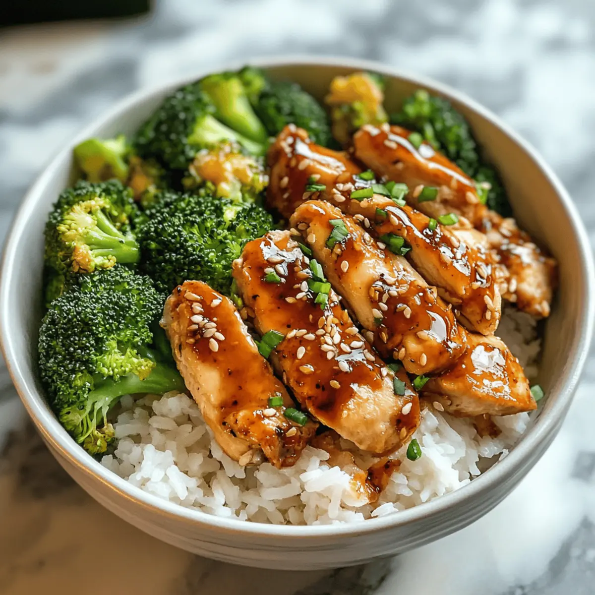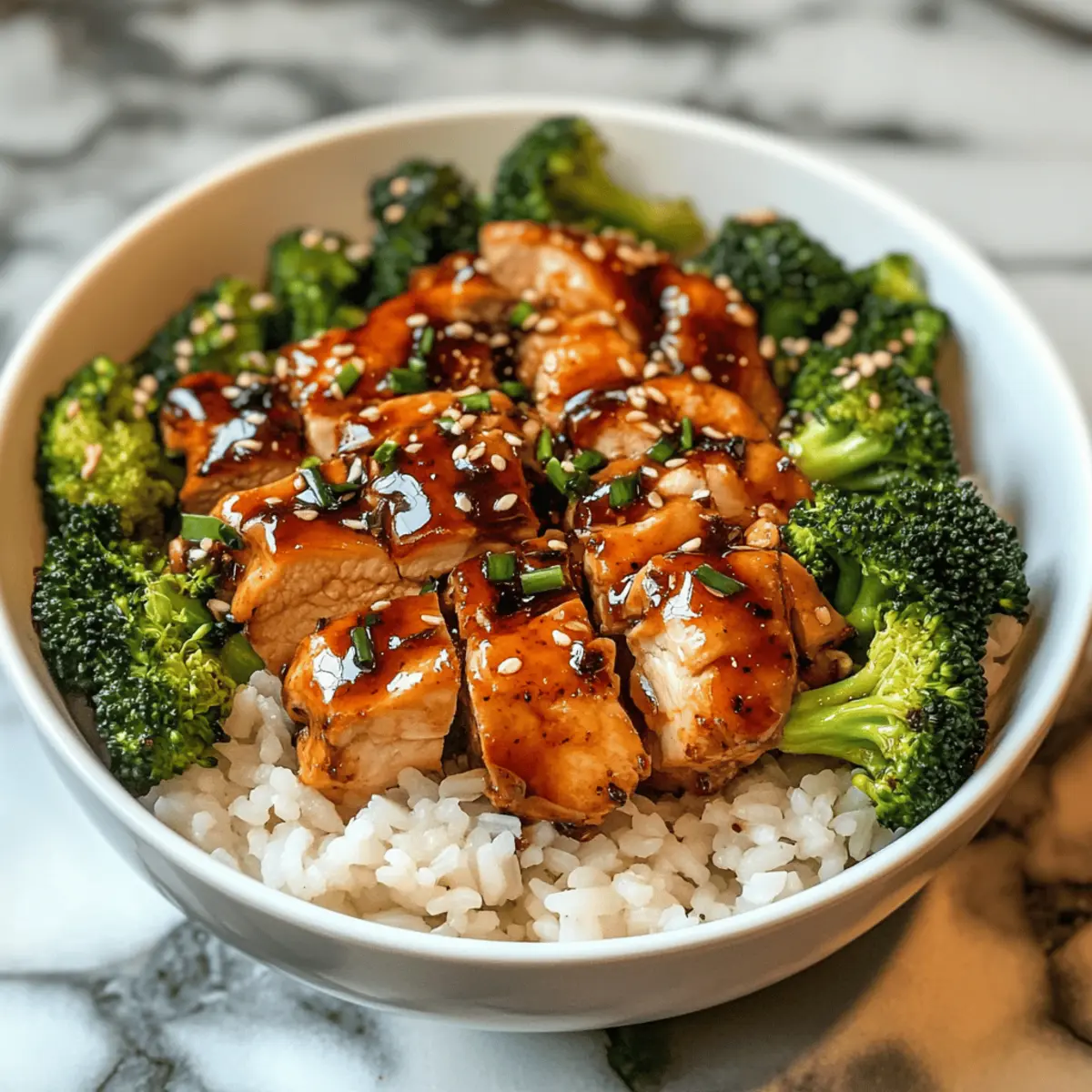 Einmalige Kombination: Diese Gesunde Klebrige Hähnchen-Schalen vereinen süße und herzhafte Aromen in perfekter Harmonie. Jeder Bissen ist ein Fest der Texturen, von zartem Hähnchen bis zu knusprigem Brokkoli.