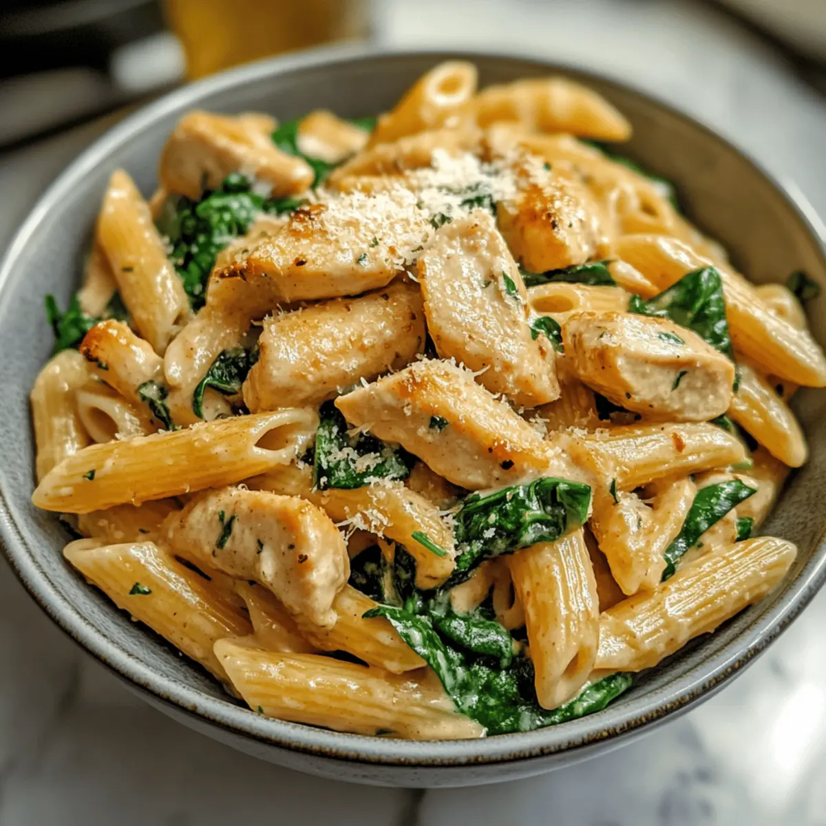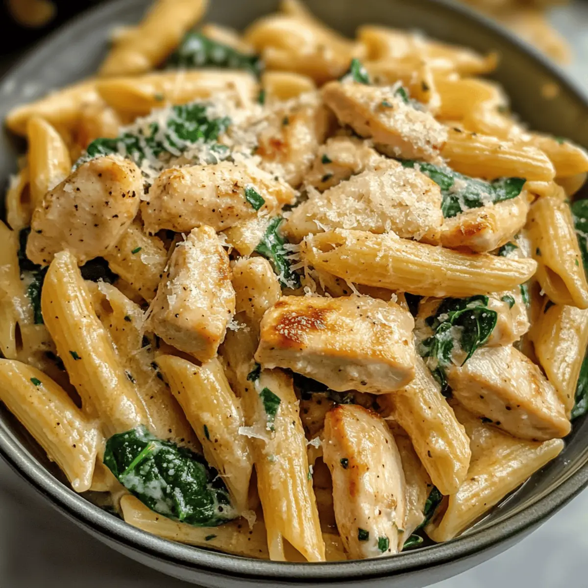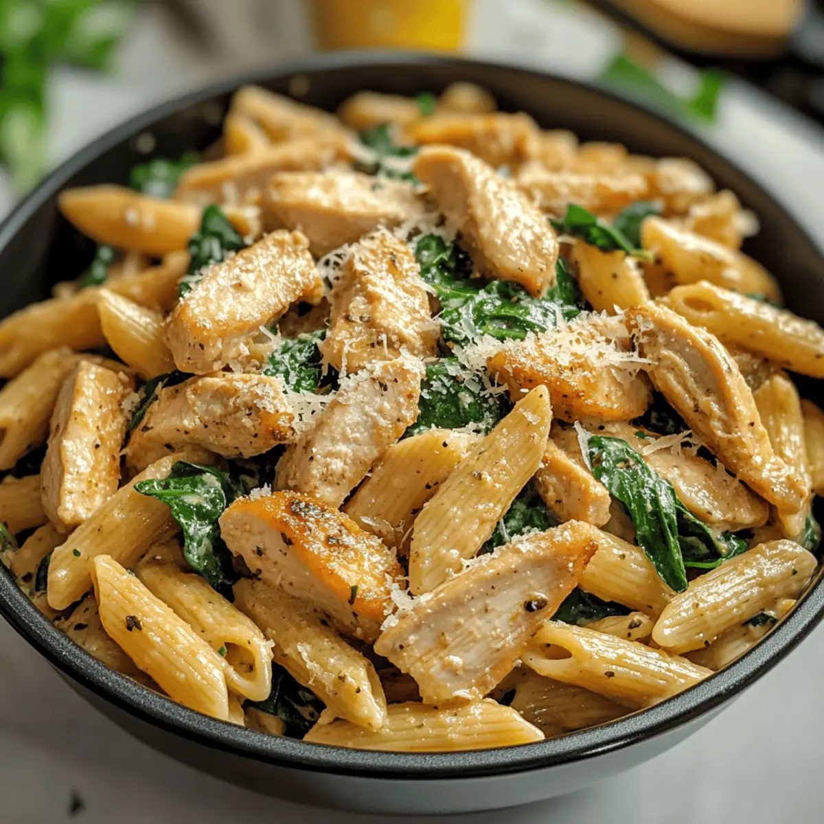 5. Gib das Hühnchen, die gekochte Pasta und den optionalen Spinat in die Pfanne. Tossiere alles gut und serviere heiß, garniert mit Petersilie und extra Parmesan.