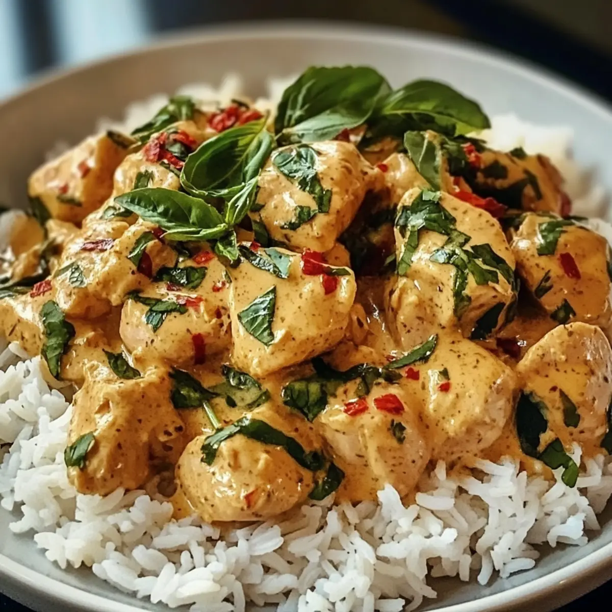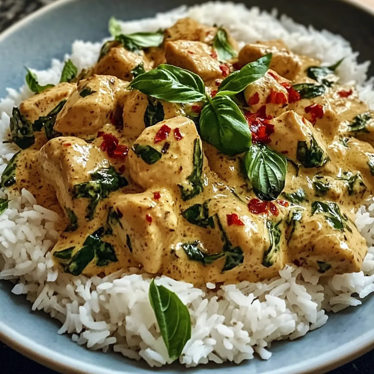 Als ich letztens durch die Straßen meiner Nachbarschaft schlenderte, nahm ich einen verführerischen Duft wahr, der mich direkt in die Küche einer fremden Heimat entführte. Heute möchte ich euch mein Rezept für Gewürztes Kokosnuss-Basilikum-Hühnchen und Reis vorstellen, ein Gericht, das nicht nur eure Geschmacksknospen verzaubert, sondern auch ein schnelles, glutenfreies Abendessen für hektische Wochentage bietet. Mit zartem Hühnchen, das in einer cremigen Kokosmilchsauce mit warmen Gewürzen und frischem Basilikum köchelt, bringt dieses Rezept ein Stück Thai-Küche direkt auf euren Tisch. Egal, ob ihr Familie, Freunde oder einfach nur euch selbst verwöhnen wollt, diese aromatische Kombination sorgt für Begeisterung und ist unglaublich anpassbar – ihr könnt sie sogar ganz einfach dairy-free zubereiten! Wer kann bei diesem Komfortessen schon widerstehen? Lasst uns gemeinsam in die Zubereitung eintauchen! Warum ist dieses Rezept so besonders? Einfachheit: Die Zubereitung dieses Gerichts ist unkompliziert und erfordert nur grundlegende Kochkenntnisse. Würzige Aromen: Die Kombination aus Kokosmilch, frischem Basilikum und warmen Gewürzen sorgt für eine geschmackliche Explosion, die niemanden unberührt lässt. Vielfältig anpassbar: Ihr könnt die Proteine leicht austauschen, indem ihr Tofu oder Kichererbsen verwendet, um es vegetarisch zu gestalten. Schnell zubereitet: In nur 30 Minuten ist dieses glutenfreie Gericht servierbereit und eignet sich somit perfekt für hektische Wochentage. Wenn ihr nach weiteren köstlichen Rezepten sucht, schaut euch auch mal meine Mini Schweinerouladen Rotkohl oder die Rinderrouladen Tacos Mit an! Gewürztes Kokosnuss-Basilikum-Hühnchen Zutaten Hier sind die Zutaten, die ihr für das Gewürzte Kokosnuss-Basilikum-Hühnchen und Reis benötigt: Für das Hühnchen • Hühnchenbrust oder -schenkel – Eine großartige Proteinquelle; könnt ihr durch Tofu oder Kichererbsen für eine vegetarische Option ersetzen. • Frische Basilikumblätter – Sie verleihen dem Gericht eine helle Note; bei fehlendem frischem Basilikum könnt ihr getrockneten verwenden, aber in Maßen. • Frischer Ingwer – Fügt eine wunderbare Wärme hinzu; verwenden Sie frischen Ingwer für den besten Geschmack, pulverisierter eignet sich für einen schnellen Ersatz. • Knoblauch – Sorgt für ein intensives Aroma; frischer Knoblauch ist am besten für den Geschmack. • Zwiebel – Eine aromatische Basis für das Gericht; Schalotten können eine süßere Geschmacksrichtung geben. Für die Sauce • Kokosmilch (Vollfett) – Macht die Sauce schön cremig; vermeidet leichte Varianten für mehr Reichtum, denkt daran, dass sie nicht so dick wird. • Chili-Flocken – Geben dem Gericht eine angenehme Schärfe; passt die Menge an, um die Schärfe nach eurem Geschmack zu regulieren. • Sojasauce oder Tamari – Sorgt für Tiefe und Umami; Tamari ist eine glutenfreie Alternative. • Limettensaft – Verstärkt den Geschmack und gleicht die Reichhaltigkeit der Kokosmilch aus; unverzichtbar für das Gleichgewicht. Für das Reisbett • Gekochter weißer Reis – Der perfekte Träger für die Sauce; Jasmin- oder Basmati-Reis sind ideal für die beste Textur. Step-by-Step Instructions für Gewürztes Kokosnuss-Basilikum-Hühnchen und Reis Step 1: Hühnchen vorbereiten Schneidet das Hühnchen in mundgerechte Stücke und würzt es großzügig mit Salz und Pfeffer. Lasst die Gewürze kurz einziehen, während ihr eine große Pfanne bei mittlerer bis hoher Hitze mit etwas Öl erhitzt. Das Hühnchen wird gleich in die Pfanne gegeben und von allen Seiten goldbraun angebraten, was etwa 5–7 Minuten dauert. Step 2: Aromaten anbraten Nehmt das angebratene Hühnchen aus der Pfanne und stellt es beiseite. In derselben Pfanne fügt ihr die gewürfelte Zwiebel, den gehackten Knoblauch und den geriebenen Ingwer hinzu. Bratet alles für 3–4 Minuten an, bis die Zwiebel weich und durchsichtig ist. Gebt nun die Chili-Flocken hinzu und rührt gut um, um die Aromen zu entfalten. Step 3: Sauce zubereiten Legt das Hühnchen zurück in die Pfanne und gießt die Kokosmilch darüber. Fügt die Sojasauce oder Tamari hinzu und bringt alles zum Köcheln. Lasst die Mischung unbedeckt bei mittlerer Hitze für etwa 10–15 Minuten köcheln, bis die Sauce eindickt und das Hühnchen durchgegart ist. Rührt während des Kochens gelegentlich um, damit nichts anbrennt. Step 4: Frische Aromen einfügen Sobald das Hühnchen fertig ist und die Sauce die gewünschte Konsistenz erreicht hat, hebt frisch gehacktes Basilikum sowie den Limettensaft unter. Probiert die Sauce und passt die Gewürze nach eurem Geschmack an; mehr Chili für Schärfe oder mehr Salz können hinzugefügt werden, falls nötig. Step 5: Anrichten und servieren Serviert das Gewürzte Kokosnuss-Basilikum-Hühnchen heiß, indem ihr eine Portion darüber gebt auf ein Bett aus dampfendem weißen Reis. Garniert das Gericht nach Belieben mit zusätzlichen Basilikumblättern und einer Prise Chili-Flocken für den letzten Schliff. Es ist ein farbenfrohes und duftendes Gericht, das sich wunderbar für jede Gelegenheit eignet. Was passt gut zu Gewürztem Kokosnuss-Basilikum-Hühnchen und Reis? Genießt eine vollmundige Mahlzeit, die sowohl den Gaumen als auch die Sinne verwöhnt und perfekt zu diesem aromatischen Gericht passt. Cremige Kartoffelpüree: Diese samtige Beilage bringt eine herrliche Textur, die die reichhaltige Kokossauce wunderbar ergänzt. Frischer Gurkensalat: Knackige Gurken in einer zarten Vinaigrette sorgen für eine erfrischende Kontrastnote und balancieren die Aromen. Warm gebackenes Naan: Das weich-fluffige Naan ist ideal, um die köstliche Sauce aufzutunken und macht jede Bissen zu einem Genuss. Leicht gesalzenes Brokkoli: Dieses Gemüse bringt eine feine Bissfestigkeit und hebt die Frische der Basilikumnoten hervor. Süße Mango-Sorbets: Nach dem herzhaften Hauptgericht wird das cremige und fruchtige Sorbet als erfrischender Absch