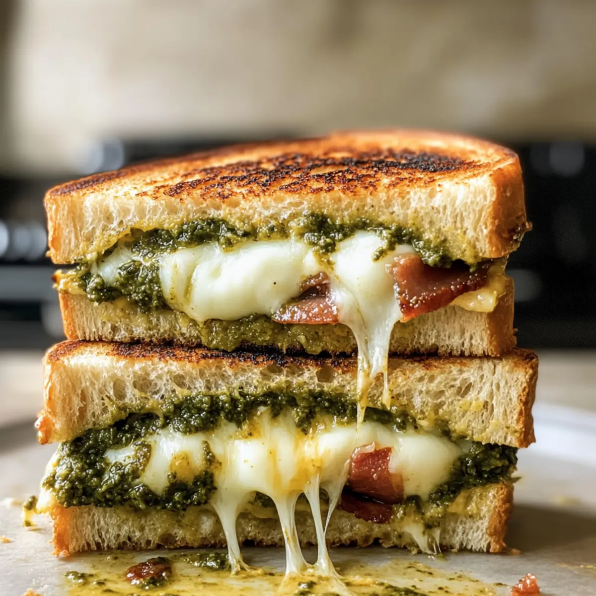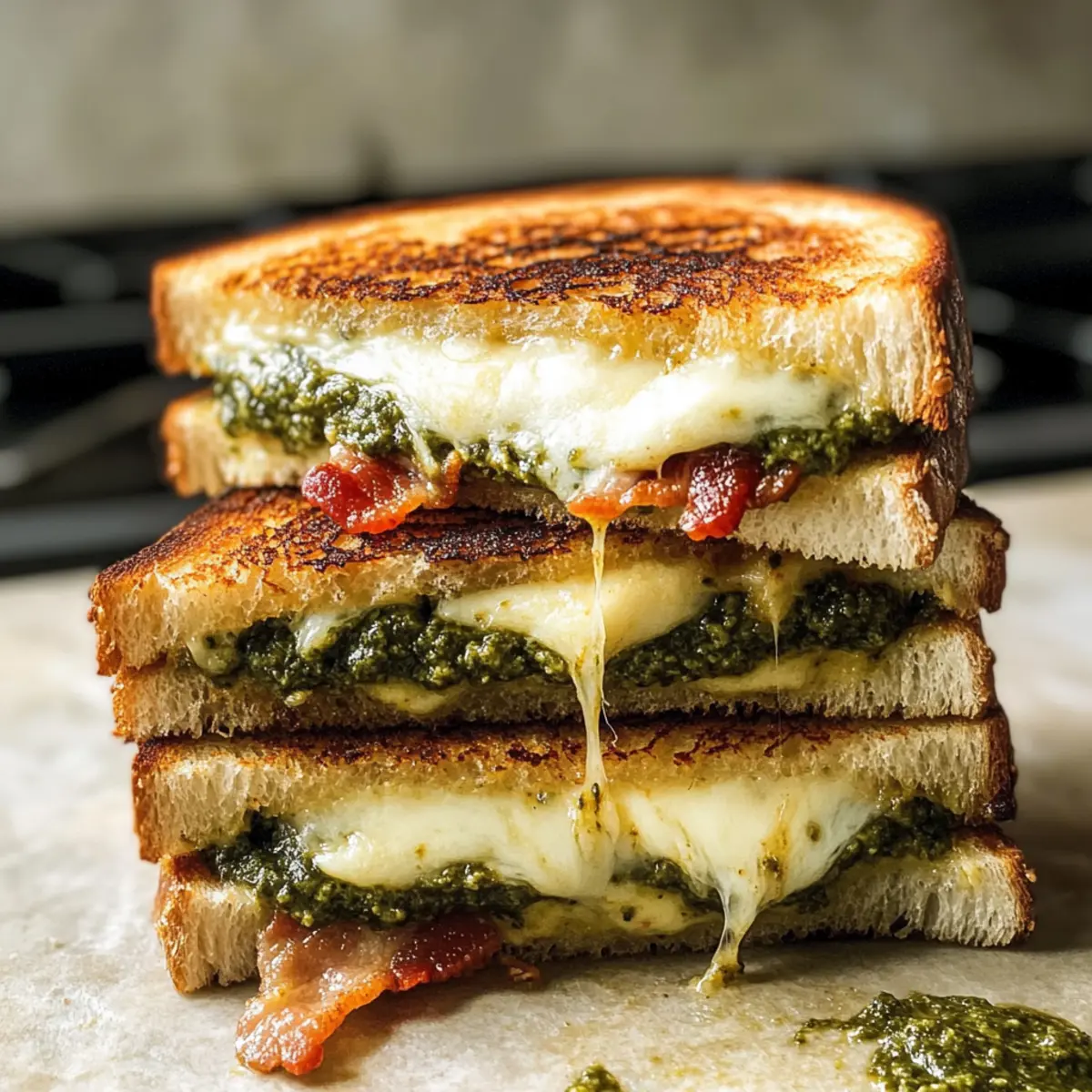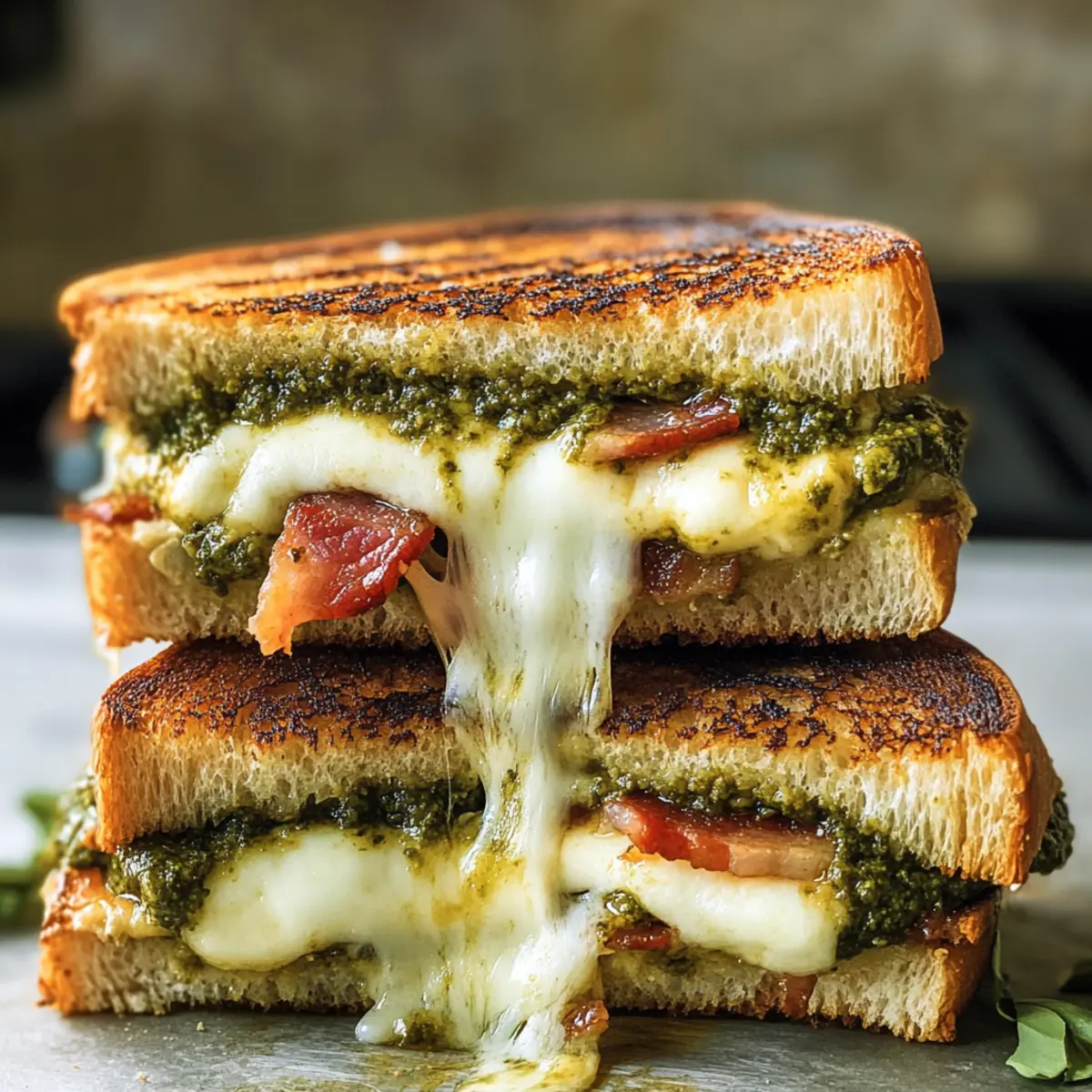 Als ich das letzte Mal in einem kleinen Café war, schwebte der verführerische Duft von frisch gegrilltem Käse durch die Luft und ließ mir das Wasser im Mund zusammenlaufen. Heute lade ich euch ein, euren eigenen Komfort mit einem köstlichen „Grilled Cheese mit Sourdough und Pesto“ zu kreieren. Diese herzhafte Köstlichkeit kombiniert goldbraunes, knuspriges Sourdough-Brot mit schmelzendem Mozzarella und aromatischem Basilikumpesto – eine himmlische Kombination! Dieses Rezept ist perfekt für einen schnellen Snack im Alltag und wird schnell zu eurer neuen Lieblingsspeise. Egal, ob ihr es klassisch haltet oder mit leckeren Variationen anpasst, dieser Sandwich ist nicht nur für Käseliebhaber ein Muss! Welchen Twist würdet ihr zu diesem Rezept hinzufügen? Warum ist dieses Rezept ein Muss? Einfachheit: Die Zubereitung ist denkbar leicht und erfordert nur grundlegende Kochkenntnisse. Vielseitig: Verändert die Zutaten nach Geschmack, sei es mit Bacon, sonnengetrockneten Tomaten oder veganen Alternativen. Herzhafter Geschmack: Die Kombination aus frischem Sourdough, cremigem Mozzarella und aromatischem Pesto sorgt für ein einzigartiges Geschmackserlebnis. Perfekte Wahl für jede Gelegenheit: Ob zum Mittagessen oder für einen Snack – dieser gegrillte Käse bringt Gemütlichkeit in euren Tag. Entdeckt außerdem leckere Variationen für euer gegrilltes Käsebrot, um immer wieder neue Geschmackserlebnisse zu schaffen. Grilled Cheese mit Sourdough und Pesto Zutaten • Für das Brot: Sourdough-Brot – Wählt frisches, dick geschnittenes Sourdough, etwa ½ Zoll dick, für die beste Textur. Vermeidet zu luftige Sorten, um ein Durchweichen zu verhindern. • Für die Füllung: Mozzarella-Käse – Dieser Käse verleiht Cremigkeit und Schmelz; patzt ihn trocken, um überschüssige Feuchtigkeit zu entfernen. Basilikumpesto – Dieses Pesto sorgt für einen lebendigen Kräutergeschmack; verwendet es sparsam, um Sogginess zu vermeiden. Sonnengetrocknete Tomaten – Perfekt für einen zusätzlichen Geschmack und Textur; optional für ein wenig mehr Flair. Bacon – Für einen rauchigen, herzhaften Akzent; kocht ihn vorab zur einfachen Verarbeitung. • Für das Grillen: Butter – Unverzichtbar für das Grillen; sorgt für eine goldbraune Kruste. Großzügig auf die Außenseite des Brotes auftragen. Dieses Rezept für Grilled Cheese mit Sourdough und Pesto verspricht, eure Geschmacksknospen zu begeistern! Step-by-Step Instructions for Grilled Cheese mit Sourdough und Pesto Step 1: Zutaten vorbereiten Beginnt damit, das Sourdough-Brot in gleichmäßige Scheiben von etwa ½ Zoll Dicke zu schneiden. Legt die Mozzarella-Käse in ein Küchentuch und patzt sie trocken, um überschüssige Feuchtigkeit zu entfernen. Dies ist wichtig, um ein matschiges Sandwich zu vermeiden. Stellt sicher, dass ihr alles liebt, um effizient weiterzumachen. Step 2: Sandwich zusammenstellen Nehmt zwei Scheiben des vorbereiteten Sourdoughs und bestreicht eine Seite jeder Scheibe großzügig mit Butter. Legt eine Scheibe mit der Butterseite nach unten in eine Pfanne. Belegt das Brot mit einer Schicht Mozzarella, gefolgt von etwas Basilikumpesto und optional mit sonnengetrockneten Tomaten und Bacon. Deckt das Sandwich mit der zweiten Scheibe Brot ab, die ebenfalls buttrig ist. Step 3: Pfanne erhitzen Erhitzt die Pfanne bei mittlerer bis niedriger Hitze. Dies ist entscheidend, damit der Käse gleichmäßig schmilzt und das Brot goldbraun wird. Wartet etwa 2-3 Minuten, bis die Pfanne warm ist, und überprüft gelegentlich, ob sie nicht zu heiß ist, um ein Anbrennen zu vermeiden. Step 4: Sandwich grillen Legt das Sandwich in die vorgeheizte Pfanne und grillt es für etwa 4-5 Minuten, bis die Unterseite goldbraun und knusprig ist. Öffnet vorsichtig die Pfanne und schaut, ob der Käse bereits zu schmelzen beginnt. Wenn ja, dreht das Sandwich um und grillt die andere Seite für weitere 3-4 Minuten, bis der Käse vollständig geschmolzen und das Brot goldbraun ist. Step 5: Servieren Nehmt das gegrillte Sandwich aus der Pfanne und lasst es für etwa 1-2 Minuten auf einem Schneidebrett abkühlen. Dies hilft, die Füllung zu setzen und macht das Schneiden einfacher. Schneidet das Sandwich diagonal in zwei Hälften und genießt es warm, idealerweise mit einer Seite von Tomatensuppe oder einem frischen Salat. Meal Prep Tipps für Grilled Cheese mit Sourdough und Pesto Diese leckeren Grilled Cheese mit Sourdough und Pesto eignen sich hervorragend für die Vorbereitung und sparen euch wertvolle Zeit! Ihr könnt die Sandwiches bis zu 24 Stunden im Voraus zusammenstellen; am besten wickelt ihr sie in Frischhaltefolie, um die Frische zu erhalten. Die vorbereiteten Sandwiches können bis zu 2 Tage im Kühlschrank aufbewahrt werden, jedoch solltet ihr sie vor dem Grillen in der Pfanne bei mittlerer Hitze vorsichtig aufwärmen, um den Käse gleichmäßig zum Schmelzen zu bringen. Um die beste Qualität zu gewährleisten, empfiehlt es sich, die Mozzarella vor dem Zusammenstellen gut abzutrocknen, um ein Durchweichen zu vermeiden. Wenn es dann Zeit ist, das Sandwich zu genießen, grillt es, bis das Brot goldbraun und knusprig ist – so bringt ihr auch an hektischen Tagen den Komfort eines frisch zubereiteten Sandwiches auf den Tisch! Expertentipps für Grilled Cheese mit Sourdough und Pesto Mozzarella trocken tupfen: Tupft den Mozzarella mit Küchenpapier trocken, um überschüssige Feuchtigkeit zu entfernen und ein matschiges Sandwich zu vermeiden. Mittlere Hitze verwenden: Grillt das Sandwich auf mittlerer bis niedriger Hitze, damit der Käse gleichmäßig schmilzt, ohne dass das Brot verbrennt. Zutaten nicht überladen: Vermeidet es, zu viele Füllungen hinzuzufügen. Halte die Schichten dünn, um ein Auslaufen der Zutaten zu verhindern. Butter großzügig auftragen: Bestreicht die Außenseiten des Brotes großzügig mit Butter für eine schön goldbraune und knusprige Textur beim Grillen. Sandwich vor dem Servieren abkühlen lassen: