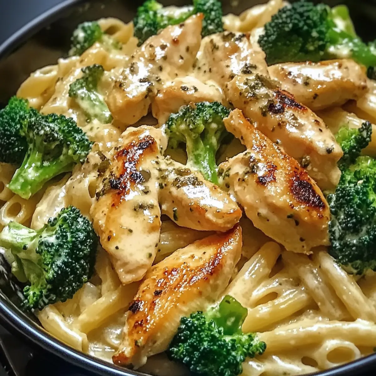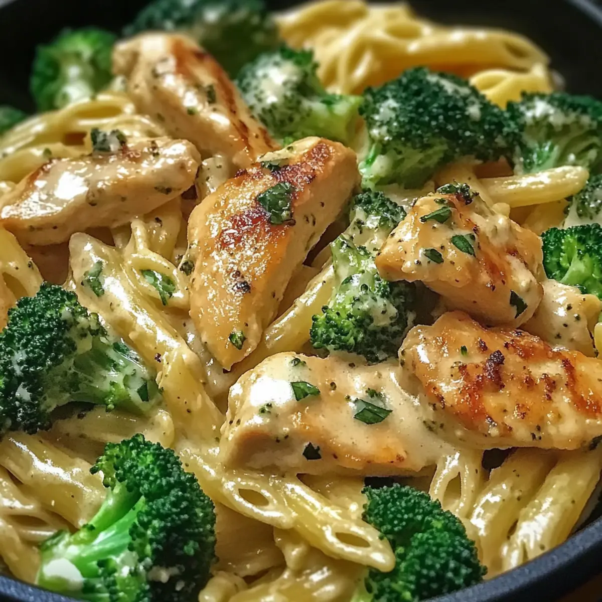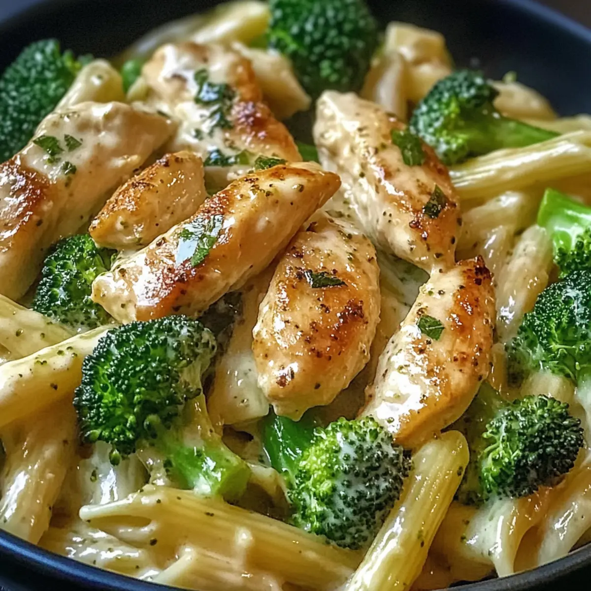 Wenn ich an schnelle Abendessen denke, die gleichzeitig auch noch lecker sind, fällt mir sofort meine Hähnchen-Brokkoli-Pasta ein. Diese köstliche Kombination aus saftigem Hähnchen, knackigem Brokkoli und einer cremigen Parmesan-Sauce verleiht völlig neuem Schwung auf dem Tisch. In nur 30 Minuten zaubert man ein Gericht, das nicht nur den Hunger stillt, sondern auch Herzen erobert. Die einfache Zubereitung macht es zu einem perfekten Wochenendessen für vielbeschäftigte Menschen, und es bietet gleichzeitig den Komfort eines Hausgemachten Gerichts. Wer kann da schon widerstehen? Lass uns gemeinsam herausfinden, wie einfach es ist, dieses cremige Pastawunder zu kreieren! Warum wirst du dieses Rezept lieben? Einfachheit: Die Zubereitung dieser Hähnchen-Brokkoli-Pasta ist kinderleicht und erfordert keine speziellen Kochkünste. Perfekt für Wochenabende! Wohlschmeckende Aromen: Die Kombination aus saftigem Hähnchen, frischem Brokkoli und cremiger Parmesan-Sauce sorgt für einen vollmundigen Geschmack, der jeden begeistert. Vielseitigkeit: Fühle dich frei, mit verschiedenen Gemüsesorten oder Pasta-Varianten zu experimentieren, um dein persönliches Lieblingsgericht zu kreieren. Zeitersparnis: In nur 30 Minuten hast du ein köstliches Essen auf dem Tisch, was es zu einer idealen Wahl für alle macht, die wenig Zeit haben. Komfort auf dem Teller: Diese Pasta ist nicht nur ein schnelles Gericht, sondern auch ein echtes Soulfood, das für Wohlbefinden sorgt. Einfach lecker: Egal, ob du für dich selbst kochst oder Gäste bewirten möchtest, dieses Rezept wird die Herzen deiner Liebsten im Sturm erobern! Hähnchen-Brokkoli-Pasta Zutaten Für die Pasta • Pasta – sorgt für die Grundlage des Gerichts; du kannst auch glutenfreie Pasta verwenden, wenn gewünscht. Für das Hähnchen • Hähnchenbrustfilet – liefert wertvolles Eiweiß und ist schnell zuzubereiten; alternativ kannst du Truthahn oder Tofu verwenden. Für das Gemüse • Frischer Brokkoli – verleiht dem Gericht Farbe und Nährstoffe; du kannst auch gefrorenen Brokkoli verwenden, achte nur auf die Blanchierzeit. • Knoblauch – liefert einen intensiven Geschmack; fein gehackt für das beste Aroma. Für die Sauce • Olivenöl – ideal zum Anbraten und zur Geschmackssteigerung; Gemüseöl oder Butter sind ebenfalls anwendbar. • Gemüsebrühe – sorgt für Feuchtigkeit und Tiefe, du kannst auch Hühnerbrühe oder gewürztes Wasser verwenden. • Parmesan – sorgt für eine cremige Konsistenz und umami Geschmack; verwende zur veganen Variante Nährhefe. • Salz und Pfeffer – wichtig zum Abschmecken, damit alle Aromen zur Geltung kommen. • Chili-Flocken – optional für etwas Schärfe, kann weggelassen werden, wenn du es milder magst. Diese Hähnchen-Brokkoli-Pasta ist eine fantastische Wahl für einen schnellen, einfachen und geschmackvollen Abendessen! Schritt-für-Schritt-Anleitung für Hähnchen-Brokkoli-Pasta Step 1: Pasta kochen Bringe einen großen Topf mit Wasser zum Kochen, füge eine Prise Salz hinzu und gib die Pasta hinein. Koche sie gemäß den Anweisungen auf der Verpackung, bis sie al dente ist (ca. 8-10 Minuten). Wenn die Pasta fertig ist, gieße sie in ein Sieb ab und stelle sie beiseite. Step 2: Brokkoli blanchieren Während die Pasta kocht, schneide den frischen Brokkoli in Röschen. Bringe einen weiteren Topf mit Wasser zum Kochen, füge die Brokkoliröschen hinzu und blanchiere sie 2-3 Minuten, bis sie leuchtend grün sind. Gieße den Brokkoli ab und lasse ihn ebenfalls beiseite. Step 3: Hähnchen anbraten Erhitze in einer großen Pfanne 2 Esslöffel Olivenöl bei mittlerer Hitze. Füge die gewürfelten Hähnchenbruststücke hinzu und würze sie mit Salz und Pfeffer. Brate das Hähnchen 6-8 Minuten an, bis es goldbraun und durchgegart ist. Rühre regelmäßig um, um eine gleichmäßige Bräunung zu gewährleisten. Step 4: Knoblauch hinzufügen Sobald das Hähnchen gar ist, füge 2-3 fein gehackte Knoblauchzehen hinzu. Brate den Knoblauch etwa 1 Minute lang an, bis er aromatisch ist, und achte darauf, dass er nicht verbrennt. Step 5: Gemüsebrühe einrühren Gieße jetzt 250 ml Gemüsebrühe in die Pfanne und rühre gut um. Füge den blanchierten Brokkoli hinzu und lasse alles 2-3 Minuten leicht köcheln, damit sich die Aromen verbinden und die Brühe etwas reduziert. Step 6: Pasta kombinieren Füge die abgetropfte Pasta direkt in die Pfanne mit der Hähnchen-Brokkoli-Mischung hinzu. Schwenke alles gut, sodass die Pasta die Sauce aufnimmt und gleichmäßig umhüllt ist. Bei Bedarf kannst du zusätzlich Olivenöl, Salz und Pfeffer nach Geschmack hinzufügen. Step 7: Mit Parmesan verfeinern Nehme die Pfanne vom Herd und rühre 100 g frisch geriebenen Parmesan unter die Pasta, bis er schmilzt und eine cremige Konsistenz entsteht. Optional kannst du auch Chili-Flocken hinzugeben, falls du etwas Schärfe bevorzugst. Step 8: Anrichten und servieren Verteile die Hähnchen-Brokkoli-Pasta auf Tellern und bestreue sie nach Belieben mit zusätzlichem Parmesan. Serviere das Gericht sofort und genieße die wohlige, cremige Mischung aus Aromen! Was passt perfekt zur Hähnchen-Brokkoli-Pasta? Eine köstliche Beilage rundet dein Gericht ab und bringt Freuden für die Sinne mit! Frischer grüner Salat: Mit einem leichten Dressing als Begleiter bleibt dein Gericht frisch und hebt die Aromen der Pasta hervor. Die knackigen Blätter schaffen einen wunderbaren Kontrast zur Cremigkeit der Hähnchen-Brokkoli-Pasta. Knoblauchbrot: Die butterartige Knoblauchnote ergänzt die Pasta optimal und bietet eine himmlische Textur. Perfekt zum Eintunken in die cremige Sauce! Gerösteter Gemüse-Mix: Kombination aus saisonal variierten Gemüsesorten sorgt für zusätzliche Nährstoffe und harmoniert wunderbar mit den herzhaften Aromen der Pasta. Weißwein: Ein Glas trockener Weißwein wie Sauvignon Blanc verleiht dem Abendessen eine elegante Note. Die Säure des Weins balanciert die Cremigkeit der Sauce perfekt. Zitronen-Basali
