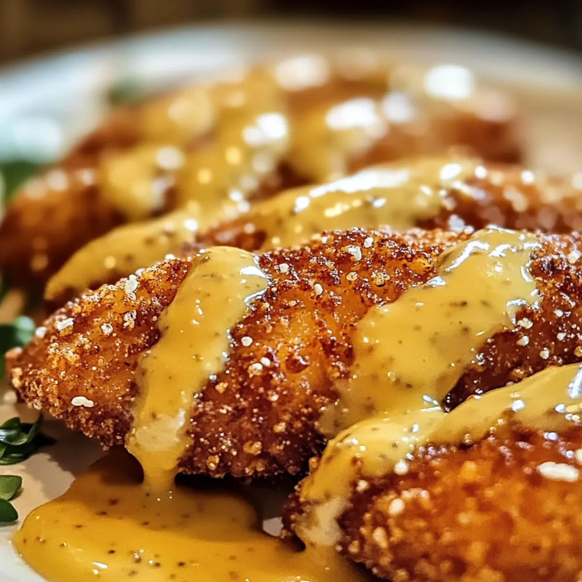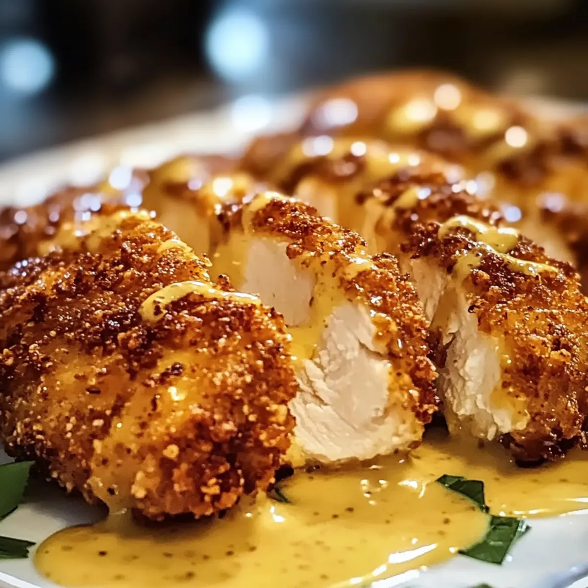 Jeder Biss in dieses Hähnchen mit Brezelkruste und Honig-Senf-Sauce ist wie ein urlaubserinnerung an die gemütlichen Biergärten Deutschlands. Ich liebe es, wie der knusprige, salzige Brezelüberzug perfekt mit der süß-sauren Senfsauce harmoniert – ein wahres Fest für die Geschmacksnerven! Diese Rezeptidee macht nicht nur eine schmackhafte Mahlzeit, sondern bietet auch schnelle Zubereitung, sodass du mehr Zeit mit deinen Liebsten verbringen kannst. Egal, ob du ein schnelles Abendessen unter der Woche planst oder etwas Besonderes für Gäste zubereiten möchtest, dieses Rezept wird garantiert jeden begeistern. Bist du bereit, dich auf eine köstliche Reise in die deutsche Küche zu begeben? Warum wirst du dieses Rezept lieben? Einfachheit: Die Zubereitung ist unkompliziert und erfordert nur grundlegende Kochfähigkeiten – perfekt für jeden, der ein schnelles Gericht zaubern möchte. Knuspriger Genuss: Der brezelige Überzug sorgt für einen einmaligen Crunch, der im Mund zergeht und an die besten Zeiten in deutschen Biergärten erinnert. Vielseitigkeit: Dieses Gericht lässt sich problemlos anpassen – experimentiere mit scharfen Gewürzen oder anderen Senfsorten, um deinen eigenen Twist hinzuzufügen. Familienfreundlich: Sowohl Kinder als auch Erwachsene lieben den Mix aus salzig und süß, was es zu einer großartigen Wahl für das Familienessen macht. Zeitersparnis: In weniger als 40 Minuten kannst du ein beeindruckendes Gericht servieren, das genauso gut aussieht, wie es schmeckt. Versuche auch unsere anderen köstlichen Rezepte, um deine Kochkünste weiter zu verfeinern und deine Liebsten zu verwöhnen! Hähnchen mit Brezelkruste und Honig-Senf-Sauce Zutaten Hinweis: Diese Zutaten sind die Grundlage für dein köstliches Hähnchen mit Brezelkruste und Honig-Senf-Sauce! Für das Hähnchen • Hähnchenbrustfilets – Liefert die proteinreiche Basis dieses Gerichts; sorge dafür, dass sie gleichmäßig geklopft sind, um eine uniforme Garung zu gewährleisten. • Zerbröselte Brezeln – Sorgt für den einzigartigen Crunch und Geschmack; ersetze sie durch Panko-Brösel für eine glutenfreie Option. • Allzweckmehl – Dient als Haftgrundlage, damit sich Eier und Brezelbrösel perfect anlagern; glutenfreies Mehl kann verwendet werden. • Paprikapulver – Verleiht einen warmen, rauchigen Geschmack; geräuchertes Paprikapulver kann den rauchigen Geschmack verstärken. • Knoblauchpulver – Bringt den charakteristischen Knoblauchgeschmack; frischer, gehackter Knoblauch kann auch genutzt werden. • Pfeffer – Intensiviert den Gesamtgeschmack; frisch gemahlener schwarzer Pfeffer sorgt für ein stärkeres Aroma. • Eier – Binden die Beschichtung; ersetze sie durch ein „Flax-Ei“ für eine vegane Alternative. • Milch – Gibt der Eiermischung Feuchtigkeit; pflanzliche Milch kann ebenfalls verwendet werden. Für die Honig-Senf-Sauce • Honig – Fügt der Sauce Süße hinzu; Ahornsirup kann für eine vegane Variante verwendet werden. • Dijon-Senf – Sorgt für eine pikante Tiefe der Sauce; körniger Senf ist eine ausgezeichnete Alternative. • Apfelessig – Balanciert die Süße mit Säure; kann durch weißen Essig ersetzt werden. • Salz – Verstärkt den Geschmack; vergiss nicht, nach Geschmack anzupassen. Schritt-für-Schritt-Anleitung für Hähnchen mit Brezelkruste und Honig-Senf-Sauce Step 1: Ofen vorheizen Heize deinen Ofen auf 200°C (390°F) vor und lege ein Backblech mit Backpapier aus. Dies sorgt dafür, dass das Hähnchen mit Brezelkruste gleichmäßig und knusprig gart. Während der Ofen aufheizt, kannst du die vorbereitenden Schritte für die Hähnchenbrust und die Beschichtung beginnen. Step 2: Brezeln zerkleinern Nimm die zerbröselten Brezeln und gib sie in eine große Schüssel. Achte darauf, dass sie gleichmäßig zerbröselt sind, um eine knusprige Kruste zu gewährleisten. Stelle die Schüssel mit den Brezelbröseln beiseite, während du die nächsten Schritte ausführst. Step 3: Mehlmischung vorbereiten Mische in einer separaten Schüssel das Allzweckmehl, Paprikapulver, Knoblauchpulver, Pfeffer und eine Prise Salz gut miteinander. Diese Mischung dient als erste Schicht für das Hähnchen. Achte darauf, dass alle Zutaten gleichmäßig verteilt sind, damit jedes Stück Hähnchen die richtige Würze erhält. Step 4: Eier und Milch verquirlen In einer dritten Schüssel verquirlst du die Eier und die Milch, bis die Mischung gut kombiniert ist. Diese egg-basierte Flüssigkeit wird helfen, die Mehl- und Brezelkruste gut am Hähnchen haften zu lassen. Sorge dafür, dass die Mischung luftig ist, bevor du mit dem Panieren beginnst. Step 5: Hähnchen panieren Nimm je ein Hähnchenbrustfilet und wende es zuerst in der Mehlmischung, dann in der Eier-Milch-Mischung und schließlich in den zerbröselten Brezeln. Drücke die Brezelkruste kräftig an, damit sie gut haftet. Platziere die panierte Hähnchenbrust gleichmäßig auf dem vorbereiteten Backblech. Step 6: Hähnchen backen Schiebe das Backblech in den vorgeheizten Ofen und backe das Hähnchen für 25-30 Minuten, bis es goldbraun und durchgegart ist. Achte darauf, dass die Außenseite schön knusprig wird und das Innere eine Temperatur von 75°C (165°F) erreicht hat, um sicherzustellen, dass es perfekt gegart ist. Step 7: Honig-Senf-Sauce zubereiten Während das Hähnchen im Ofen ist, kannst du die Honig-Senf-Sauce vorbereiten. Vermische in einer kleinen Schüssel den Honig, Dijon-Senf und Apfelessig gut miteinander, bis eine homogene und cremige Sauce entsteht. Probiere die Sauce und passe gegebenenfalls die Süße oder den Senfgeschmack nach deinem Belieben an. Step 8: Servieren Sobald das Hähnchen mit Brezelkruste golden und knusprig ist, nimm es aus dem Ofen. Serviere es heiß, großzügig mit der Honig-Senf-Sauce beträufelt. Diese Kombination aus knusprigem Hähnchen und der süß-sauren Sauce wird deine Liebsten begeistern und jeden Biss zu einem Genuss machen. Hähnchen mit Brezelkruste u