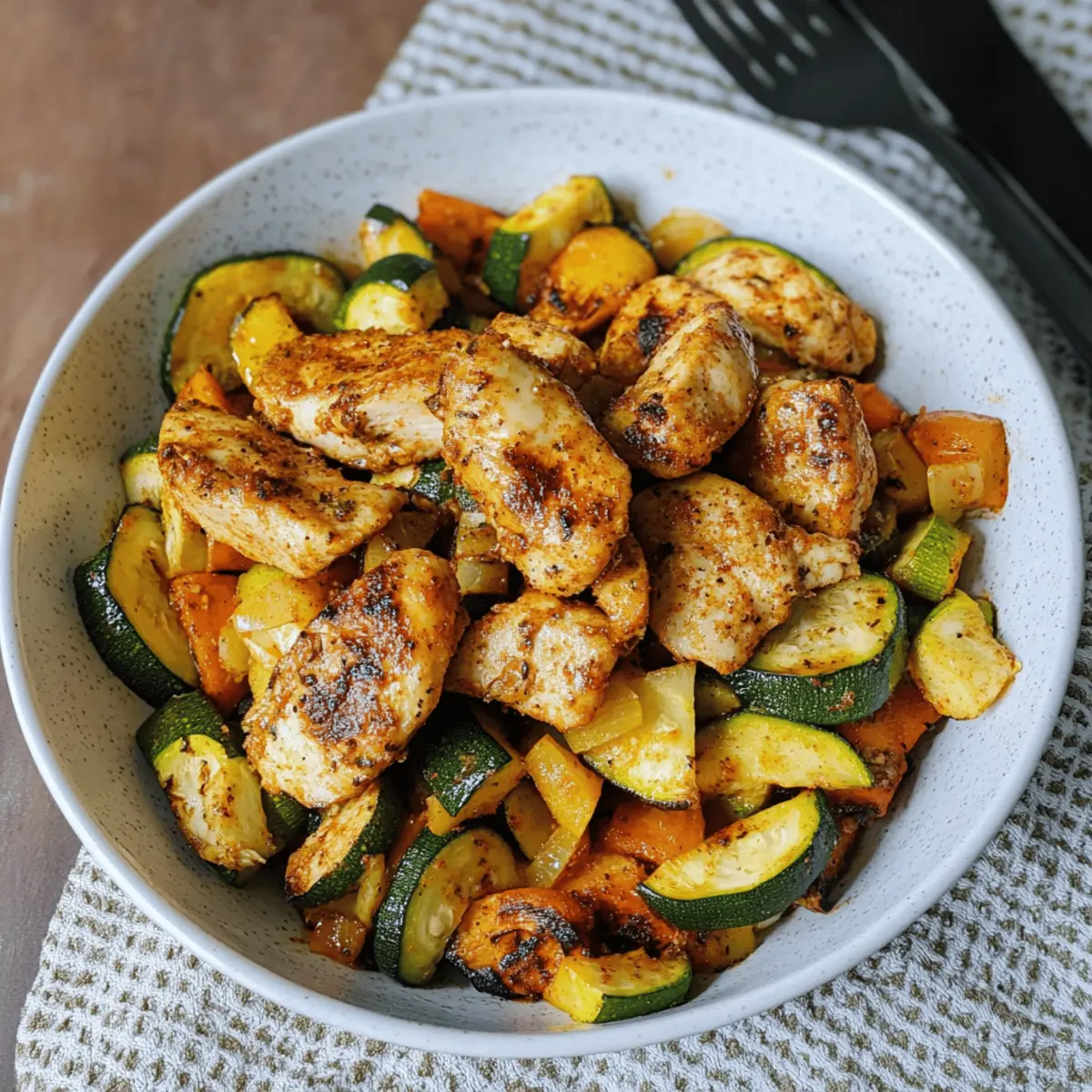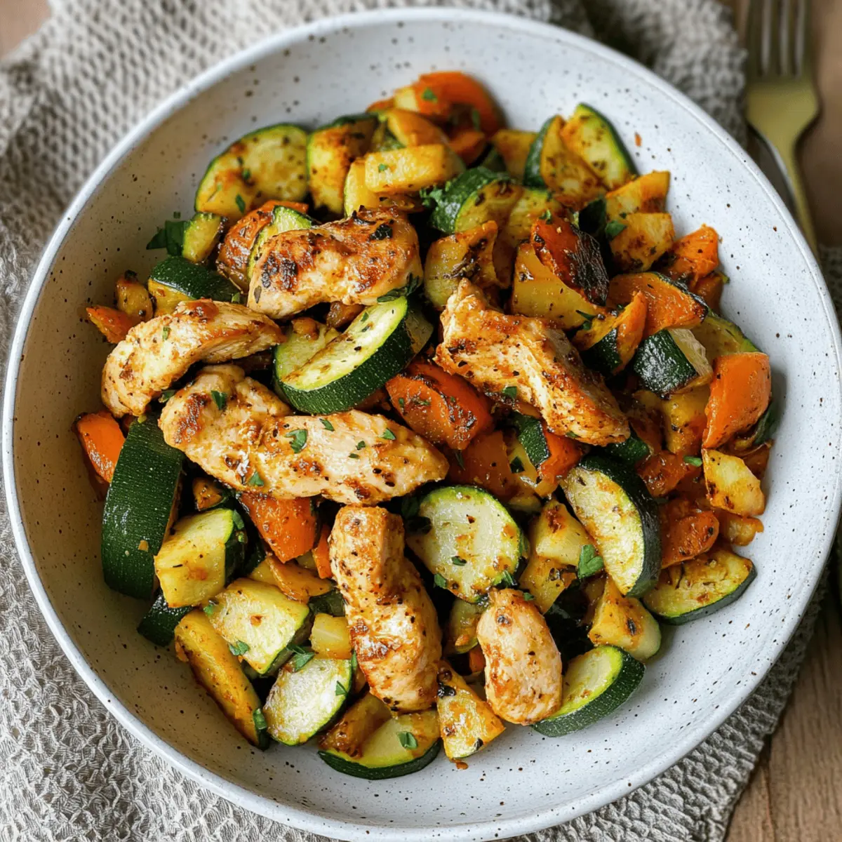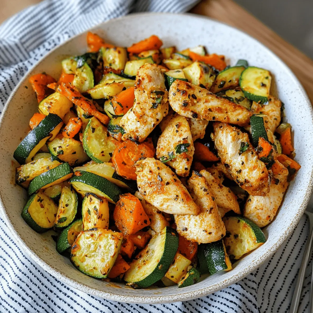 „Weißt du, was ich an Luftfritteusen liebe? Sie zaubern aus den einfachsten Zutaten ein wahres Festmahl, ganz ohne das Gefühl, in der Küche stundenlang schuften zu müssen.“ Das brachte mich zu diesem leckeren Rezept für Hähnchen mit Gemüse. In nur 15 Minuten erhältst du eine schmackhafte, nährstoffreiche Mahlzeit, die nicht nur proteinreich, sondern auch kalorienarm ist. Die Kombination aus zartem Hähnchen und buntem, geröstetem Gemüse macht dieses Gericht nicht nur zu einem gesunden Genuss, sondern sorgt auch für eine wunderbare Krisenbewältigung an hektischen Tagen. Egal ob du dich nach einer schnelle Feierabendküche sehnst oder etwas Gesundes für die Familie zaubern möchtest, du wirst die Vielseitigkeit dieses Rezepts lieben. Bereit, deinen Luftfritteusen-Hunger zu stillen? Lass uns loslegen! Warum ist Hähnchen mit Gemüse so besonders? Einfachheit: Mit nur wenigen Zutaten ist dieses Rezept unkompliziert und ideal für Kochanfänger. Vielseitigkeit: Du kannst die Gemüsesorten und Proteine anpassen, um immer wieder neue Variationen zu genießen! Schnelligkeit: In nur 15 Minuten zauberst du ein schmackhaftes Gericht, perfekt für hektische Abende. Gesundheit: Low Carb und proteinreich, unterstützt es deine Fitnessziele ohne Verzicht auf Geschmack. Knuspriger Genuss: Die Luftfritteuse sorgt für eine perfekte Textur – außen knusprig, innen saftig. Dieses Rezept ist das perfekte Beispiel für eine gesunde und leckere Mahlzeit, die die ganze Familie lieben wird. Probiere auch mein Rezept für einen frischen Salat, um das Gericht zu ergänzen und deinen Teller noch bunter zu gestalten: frischer Salat. Hähnchen mit Gemüse Zutaten • Hier sind die Zutaten, die du brauchst, um dieses köstliche Hähnchen mit Gemüse im Air Fryer zuzubereiten: Für das Hähnchen Hähnchengeschnetzeltes – Hauptproteinquelle, die essentielle Nährstoffe liefert. Du kannst es durch Schweinefleisch ersetzen oder für eine vegetarische Option ganz weglassen. Für das Gemüse Paprika – Fügt Süße, Farbe und einen milden Crunch hinzu. Jede Paprika-Variante kann verwendet werden. Zucchini – Bringt einen frischen, milden Geschmack und Feuchtigkeit ins Gericht. Kann durch Aubergine oder gelbe Zucchini ersetzt werden. Zwiebel – Verbessert den Gesamtgeschmack und das Aroma. Verwende Schalotten oder Lauch für einen anderen Geschmack. Für die Würzung Öl – Hilft, eine goldene Textur zu erreichen und verbindet die Gewürze. Olivenöl wird empfohlen, andere Pflanzenöle sind jedoch ebenfalls geeignet. Paprika edelsüß – Sorgt für eine subtile Süße. Ersetze es durch geräuchertes Paprika für ein anderes Geschmacksprofil. Italienisches Hähnchengewürz – Würzmischung, die den Hähnchengeschmack ergänzt. Du kannst auch jedes andere universelle Hähnchen-Gewürz verwenden. Salz – Verbessert alle Aromen; nach Geschmack anpassen. Dieses Rezept für Hähnchen mit Gemüse ist einfach und macht jede Mahlzeit zu einem Genuss! Schritt-für-Schritt-Anleitung für Hähnchen mit Gemüse im Air Fryer Step 1: Gemüse vorbereiten Wasche zuerst die Paprika und Zucchini gründlich. Schäle die Zwiebel und schneide sie zusammen mit der Paprika und Zucchini in mundgerechte Stücke. Achte darauf, dass alle Stücke gleich groß sind, damit das Gemüse gleichmäßig gart. Die Farben sollten lebhaft und einladend sein, damit du weißt, dass dein Gericht bald köstlich aussieht. Step 2: Alles vermengen In einer großen Schüssel kombinierst du das Hähnchengeschnetzelte mit dem vorbereiteten Gemüse. Füge das Öl, das süße Paprikapulver und das italienische Hähnchengewürz hinzu. Mische alles gründlich mit deinen Händen oder einem Löffel, bis jedes Stück Hähnchen und Gemüse gleichmäßig mit den Gewürzen bedeckt ist. Der Duft sollte jetzt schon verlockend sein! Step 3: In die Luftfritteuse geben Lege die Mischung aus Hähnchen und Gemüse vorsichtig in den Korb der Luftfritteuse. Achte darauf, dass die Zutaten nicht zu eng gepackt sind, damit die heiße Luft zirkulieren kann. Die Farben der Gemüsestücke sollten eine ansprechende Mischung aus Grün, Rot und Gelb sein, was darauf hindeutet, dass du eine farbenfrohe Mahlzeit zubereitest. Step 4: Garzeit einstellen Stelle die Luftfritteuse auf 190°C ein und lasse die Mischung für 10-15 Minuten garen. Schüttle den Korb nach der Hälfte der Zeit, um sicherzustellen, dass alles gleichmäßig bräunt. Die Oberflächen sollten golden und knusprig aussehen, während das Hähnchen innen zart bleibt. Step 5: Gargrad überprüfen Nach 10-15 Minuten nimmst du den Korb aus der Luftfritteuse und überprüfst das Hähnchen auf Garheit. Es sollte durchgegart sein und eine Innentemperatur von mindestens 75°C haben. Das Gemüse sollte weich präsentierbar, mit einer leichten Röstung an den Rändern, was auf den perfekten Garprozess hinweist. Step 6: Servieren und genießen Wenn das Hähnchen und Gemüse fertig sind, serviere sie schnell auf einem Teller. Du kannst es über einem Bett aus frischem Salat oder Quinoa anrichten, um eine bunte und nahrhafte Mahlzeit zu kreieren. Die Aromatik von Hähnchen mit Gemüse wird deine Gäste begeistern und die ganze Familie zusammenbringen! Lagerungstipps für Hähnchen mit Gemüse Kühlschrank: Bewahre Reste in einem luftdichten Behälter im Kühlschrank auf, wo sie bis zu 3 Tage haltbar sind. Achte darauf, dass sie vollständig abgekühlt sind, bevor du sie einlagerst. Gefrierfach: Für eine längere Haltbarkeit kannst du das Hähnchen mit Gemüse portioniert in Gefrierbeuteln oder -behältern einfrieren. Dort bleibt es bis zu 3 Monate frisch. Wiederehitzen: Du kannst die Reste einfach in der Luftfritteuse bei 180°C für etwa 5-7 Minuten aufwärmen, um die Knusprigkeit zurückzubringen. So schmeckt das Hähnchen mit Gemüse wie frisch zubereitet. Raumtemperatur: Lass das Hähnchen und Gemüse nach dem Kochen nicht länger als 2 Stunden bei Raumtemperatur stehen, um die Lebensmittelsicherheit zu gewährleis