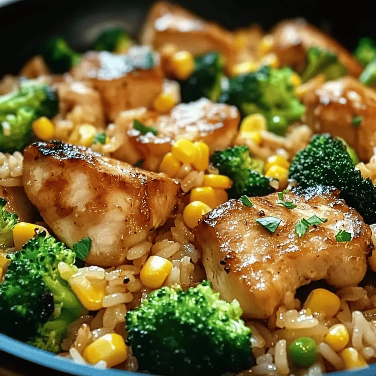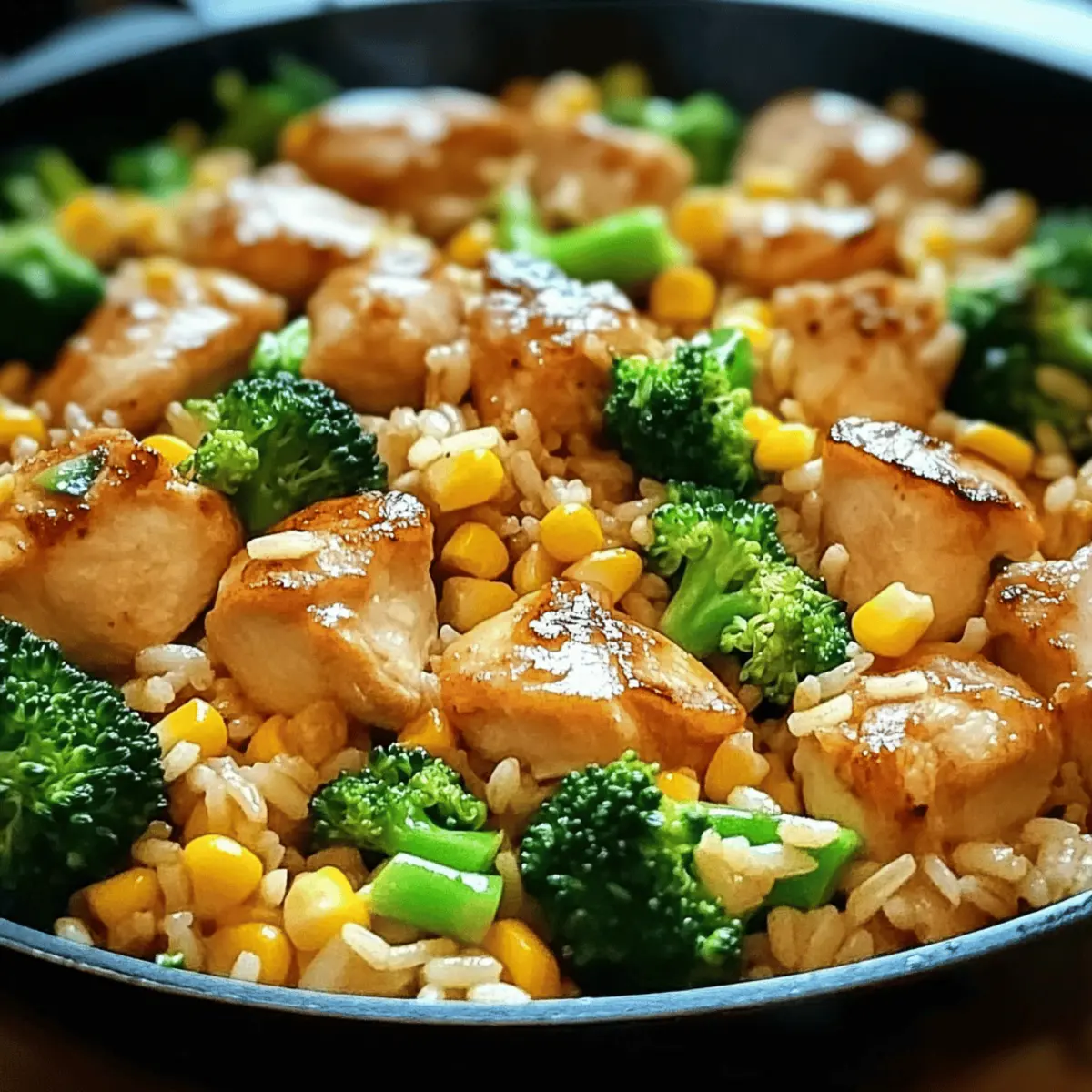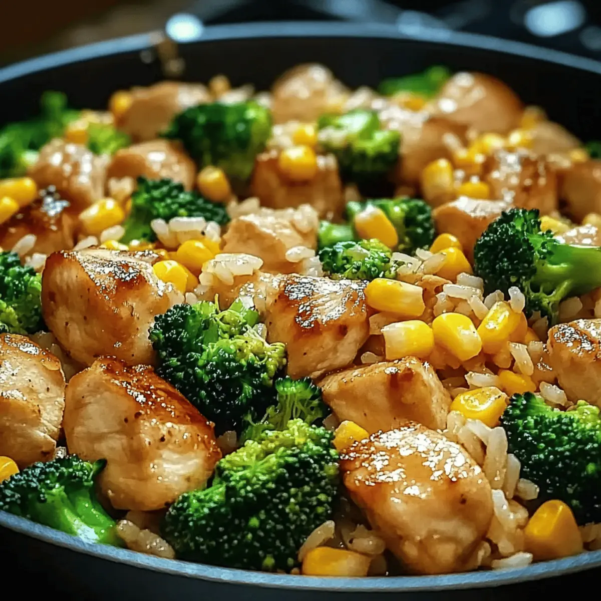 Zwischen dem hektischen Alltag und den täglichen Verpflichtungen kann es eine echte Herausforderung sein, gesunde und köstliche Mahlzeiten auf den Tisch zu bringen. Hier kommt meine Hähnchen-Reis-Pfanne mit Brokkoli und Mais ins Spiel! Dieses schnelle, einfache Rezept vereint zarte Hühnchenbrust, nussigen Basmatireis und frisches Gemüse in einem einzigen Pfanne und bietet damit alles, was man für ein gelungenes Abendessen benötigt – und das in nur 30 Minuten. Perfekt für gesellige Familienabende oder stressige Wochentage, ist dieses Gericht nicht nur lecker, sondern auch eine nahrhafte Option voller Proteine und Vitamine. Bist du bereit, dein Abendessen in ein farbenfrohes und geschmackvolles Erlebnis zu verwandeln? Lass uns loslegen! Warum ist dieses Rezept so besonders? Einfachheit: Dieses köstliche Gericht ist in nur 30 Minuten fertig, was es ideal für hektische Wochentage macht. Vielfältige Zutaten: Die Kombination aus zarter Hähnchenbrust, nussigem Basmatireis und knackigem Brokkoli bietet nicht nur tolle Aromen, sondern auch eine Vielzahl an Nährstoffen. In nur einer Pfanne: Weniger Geschirr bedeutet weniger Aufräumarbeiten – perfekter für alle, die unkompliziert kochen möchten! Familienfreundlich: Mit seinem bunten und appetitlichen Aussehen spricht es garantiert die ganze Familie an; serviere es gleich mit einem frischen Birnensalat mit Balsamico für ein rundum gelungenes Abendessen. Kreativität: Du kannst die Zutaten ganz nach deinem Geschmack abwandeln; probiere es doch mal mit Pfifferlingen mit Spinat oder füge Gewürze hinzu für eine zusätzliche Geschmacksnote! Gute Vorbereitung: Lasse dich nicht von der schnellen Zubereitung abhalten – die Berührung von frischen Zutaten und delikatem Umami macht jede Biss zu einem besonderen Erlebnis! Hähnchen-Reis-Pfanne Zutaten • Bereite die Grundlage für dein schnelles und einfaches Gericht vor! Für das Hähnchen Hähnchenbrustfilet – sorgt für zarte Textur und lässt sich leicht würzen. Du kannst es auch durch Putenbrust ersetzen. Salz – hebt die Aromen hervor und ist unverzichtbar für den Geschmack. Verwende für eine gesündere Variante Niedrig-Natrium-Salz. Pfeffer – bringt eine milde Schärfe ins Spiel und balanciert die Geschmäcker. Weißer Pfeffer kann ebenfalls verwendet werden. Für den Reis Basmatireis – hat ein nussiges Aroma und fluffige Konsistenz; ideal zum Absorbieren der Aromen. Du kannst ihn auch durch Jasminreis oder Quinoa ersetzen. Hühnerbrühe – gibt dem Reis einen köstlichen Geschmack; Gemüsebrühe ist eine gute vegetarische Alternative. Für das Gemüse Frischer Brokkoli – fügt Crunch und Farbe hinzu und ist reich an Vitaminen. Tiefkühl-Brokkoli ist im Notfall eine gute Wahl. Mais – sorgt für Süße und Textur; passt hervorragend zu Brokkoli. Canned Corn kann eine praktische Option sein. Zwiebel – sorgt für ein aromatisches Basisaroma; mit Schalotten erhältst du einen milderen Geschmack. Knoblauch – sorgt für ein pikantes Grundaroma; frischer Knoblauch ist optimal, aber Knoblauchpulver funktioniert auch. Für die Würze Sojasauce – bringt Umami und Salzgehalt in die Mischung. Tamari ist eine glutenfreie Option. Paprikapulver – fügt eine milde Wärme und Farbe hinzu, ideal um das Hähnchen zu verfeinern. Geräuchertes Paprikapulver kann zusätzlich Tiefe verleihen. Olivenöl – perfekt zum Anbraten von Hähnchen und Gemüse; Avocadoöl ist auch geeignet. Genieße deine Hähnchen-Reis-Pfanne mit Brokkoli und Mais und entdecke die köstlichen Aromen, die dich erwarten! Schritt-für-Schritt-Anleitung für die Hähnchen-Reis-Pfanne mit Brokkoli und Mais Step 1: Zutaten vorbereiten Schneide die Zwiebel und den Knoblauch fein und teile den Brokkoli in kleine Röschen. Diese Vorbereitungen sind wichtig, um sicherzustellen, dass alle Zutaten gleichmäßig garen. Lege alles griffbereit, damit du die Hähnchen-Reis-Pfanne mit Brokkoli und Mais effizient zubereiten kannst. Step 2: Hähnchen zubereiten Würfle das Hähnchenbrustfilet in gleichmäßige Stücke und würze es mit Salz, Pfeffer und Paprikapulver. Erhitze eine große Pfanne bei mittlerer Hitze und füge etwas Olivenöl hinzu. Brate das Hähnchen für etwa 5-7 Minuten, bis es goldbraun und durchgegart ist, dann nimm es aus der Pfanne und stelle es beiseite. Step 3: Reis kochen Bringe in einem Topf Hühnerbrühe zum Kochen und füge den Basmatireis hinzu. Koche den Reis gemäß den Anweisungen auf der Verpackung, in der Regel etwa 10-15 Minuten, bis das Wasser absorbiert ist und der Reis fluffig aussieht. Während der Reis kocht, kannst du die Gemüse zubereiten. Step 4: Gemüse anbraten In der gleichen Pfanne, in der du das Hähnchen gebraten hast, füge bei Bedarf etwas mehr Olivenöl hinzu. Sauté die Zwiebel und den Knoblauch bei mittlerer Hitze etwa 2-3 Minuten, bis sie weich und leicht durchsichtig sind. Füge dann den Brokkoli und den Mais hinzu und brate alles weiter, bis der Brokkoli schön grün und bissfest ist, ungefähr 4-5 Minuten. Step 5: Alles kombinieren Gib das gebratene Hähnchen und den gekochten Reis zurück in die Pfanne mit dem Gemüse. Gieße die Sojasauce darüber und mische alles gründlich, sodass die Aromen gleichmäßig verteilt sind. Koche diese Mischung für weitere 2-3 Minuten bei niedriger Hitze, damit sich die Geschmäcker gut vermischen. Step 6: Servieren Verteile die Hähnchen-Reis-Pfanne mit Brokkoli und Mais auf Teller und garniere sie nach Belieben mit frischen Kräutern. Serviere das Gericht warm und genieße die Kombination aus zartem Hähnchen, fluffigem Reis und dem knackigen Gemüse – ein echter Genuss für die ganze Familie! Tipps zur Vorbereitung der Hähnchen-Reis-Pfanne mit Brokkoli und Mais Eine Hähnchen-Reis-Pfanne mit Brokkoli und Mais ist perfekt für die Vorausplanung! Du kannst das Hähnchen bis zu 24 Stunden im Voraus marinieren und im Kühlschrank aufbewahren, um die Aromen zu intensivieren. Auch den Reis kannst du bereits am Vortag kochen un
