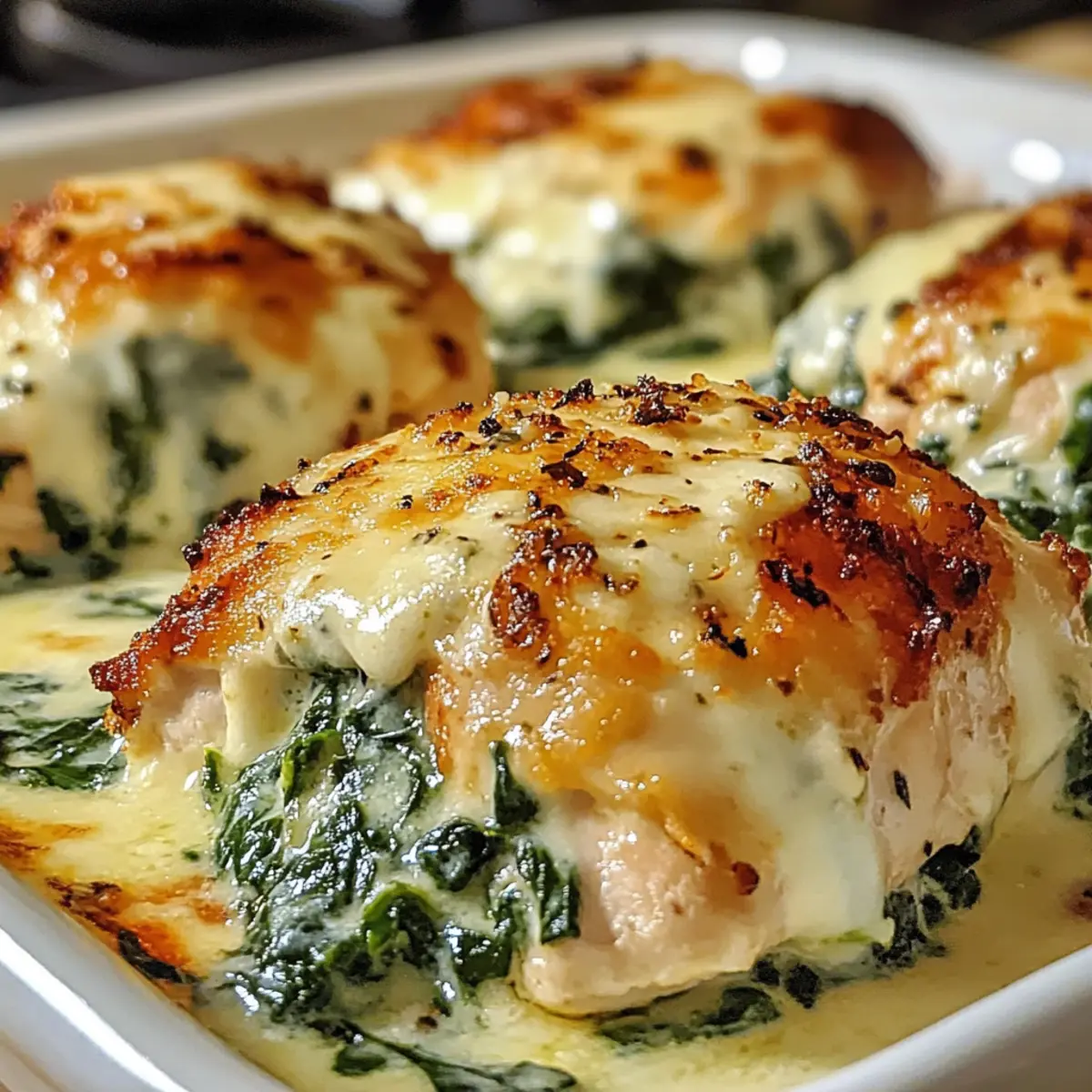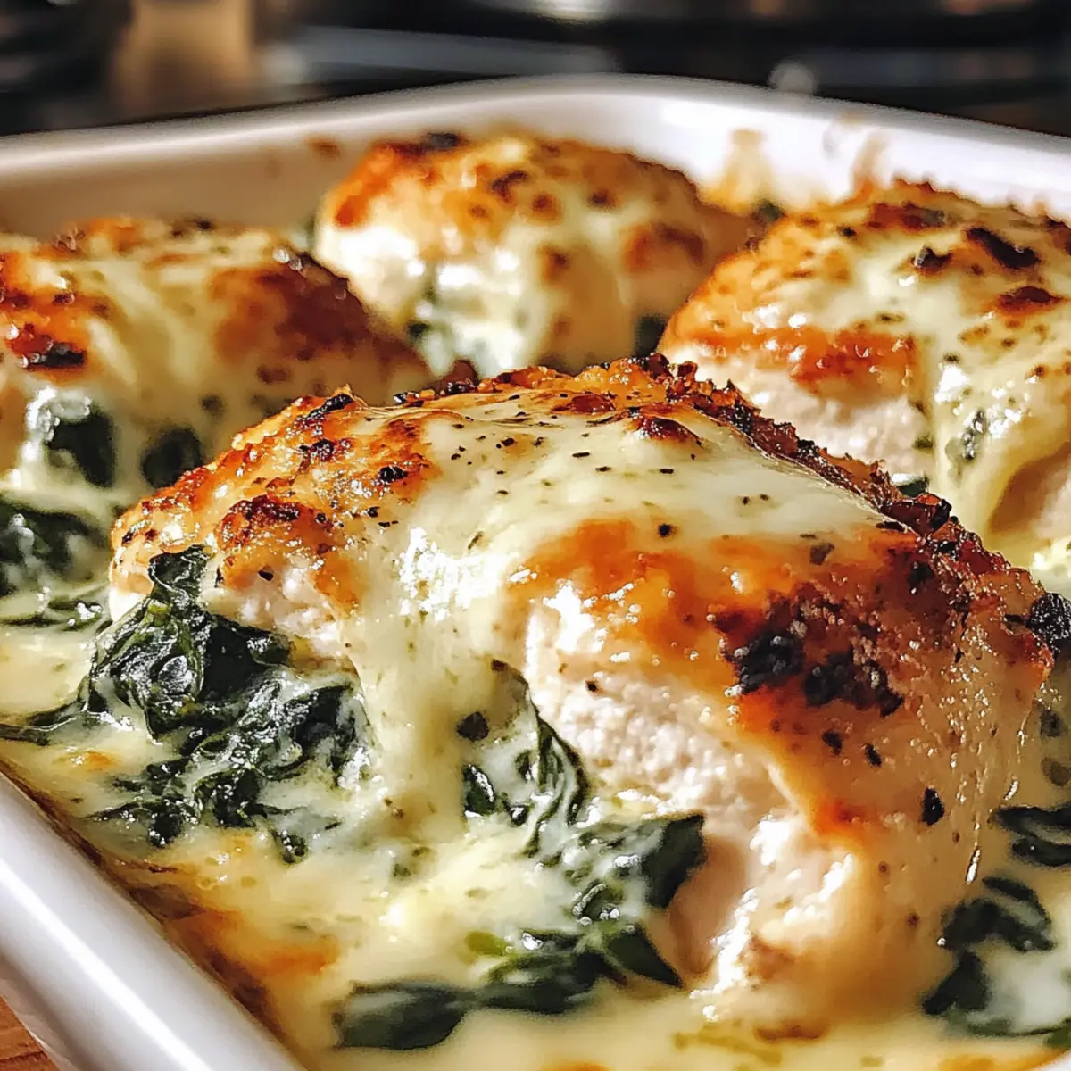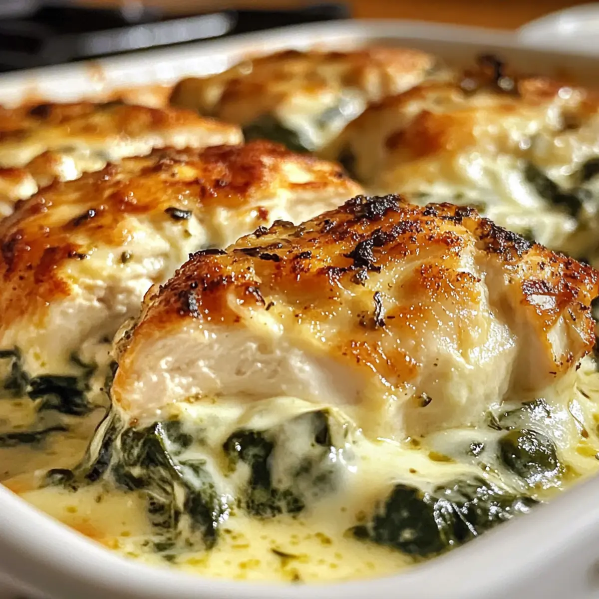 Neulich beim Kochen hatte ich diesen fantastischen Aha-Moment: Ein Hähnchen Spinat Frischkäse Auflauf, der nicht nur lecker ist, sondern auch blitzschnell zubereitet werden kann! Wenn du nach einem Gericht suchst, das deiner Familie am Tisch ein Lächeln ins Gesicht zaubert und gleichzeitig gesund ist, dann bist du hier genau richtig. Dieses Rezept kombiniert zarte Hähnchenbrust mit einer cremigen Füllung aus Frischkäse und frischem Spinat – eine schmackhafte Umarmung jeder Gabel! Und das Beste daran? Du kannst die Zutaten ganz einfach anpassen: Probier verschiedene Käsesorten oder Gemüse aus, um deine persönliche Note hinzuzufügen. Lust auf eine köstliche Reise in die Welt der herzhaften Aufläufe? Lass uns gemeinsam starten! Warum wird dieser Auflauf Ihr Favorit? Schnelligkeit & Einfachheit: Der Hähnchen Spinat Frischkäse Auflauf ist im Handumdrehen zubereitet. Mit nur wenigen Grundzutaten entsteht ein Gericht, das keinen großen Aufwand erfordert. Kreative Anpassungsoptionen: Variiere die Käsesorten oder Gemüse, um jeden Biss ganz nach deinem Geschmack zu gestalten. Egal, ob du Käse-Liebhaber oder Veggie-Fan bist, dieses Rezept passt sich deinen Vorlieben an. Gesund & Nahrhaft: Die Kombination aus Hähnchen und frischem Spinat sorgt für eine nährstoffreiche Mahlzeit, die nicht nur köstlich, sondern auch gesund ist. Perfekt für eine ausgewogene Ernährung! Familienfreundlich: Dieser Auflauf begeistert die ganze Familie und eignet sich hervorragend für gemeinsame Abende. Mit einer goldbraunen Käsekruste wird jeder Biss zum Genuss. Weniger Abfall: Verwende Reste aus dem Kühlschrank, um deinem Auflauf Vielfalt zu verleihen. Ideal, um Reste kreativ zu verwerten und gleichzeitig ein köstliches Essen zu zaubern! Lass dich von den verschiedenen Möglichkeiten inspirieren und genieße das Erlebnis, deine eigene Version dieses leckeren Auflaufs zu kreieren! Hähnchen Spinat Frischkäse Auflauf Zutaten Für die Füllung Hähnchenbrust – Hauptproteinquelle, die Geschmack und Saftigkeit bietet; kann durch Hähnchenschenkel oder Putenbrust ersetzt werden. Frischkäse – Sorgt für eine cremige Konsistenz in der Füllung; griechischer Joghurt kann für einen säuerlichen Geschmack hinzugefügt werden. Frischer Spinat – Bietet Nährstoffe und Textur; kann auch durch Grünkohl oder gefrorenen Spinat (gut entwässern!) ersetzt werden. Mozzarella Käse – Schmilzt hervorragend und fügt Reichtum hinzu; kann mit Provolone oder Cheddar variiert werden. Parmesan Käse (optional) – Verleiht der Oberseite einen salzigen, nussigen Geschmack. Für die Marinade Olivenöl – Fügt Feuchtigkeit hinzu und hilft beim Anbraten; nach Bedarf verwenden, um das Hähnchen zu beschichten. Knoblauch – Verstärkt den Geschmack; frischer Knoblauch wird empfohlen, kann aber auch durch Knoblauchpulver ersetzt werden. Italienische Gewürze – Sorgen für ein würziges Geschmacksprofil; gekaufte Mischungen sind praktisch oder selber mit Oregano und Basilikum mischen. Salz – Betont die Aromen; nach Belieben anpassen, je nach Zutaten. Schwarzer Pfeffer – Sorgt für eine leichte Schärfe; nach Geschmack anpassen. Tipps: Lass dich von der Vielfalt der Zutaten inspirieren und experimentiere mit verschiedenen Käsesorten. Verpasse auf keinen Fall, den Hähnchen Spinat Frischkäse Auflauf zu kreieren! Schritt-für-Schritt-Anleitung für Hähnchen Spinat Frischkäse Auflauf Step 1: Ofen vorheizen Heize den Ofen auf 200°C vor und fette eine Auflaufform (23×33 cm) leicht ein. Diese Vorbereitung sorgt dafür, dass dein Hähnchen Spinat Frischkäse Auflauf gleichmäßig gart und nicht anklebt. Während der Ofen vorheizt, kannst du die Hähnchenbrust für die Zubereitung vorbereiten. Step 2: Hähnchenbrust schneiden und klopfen Halbiere die Hähnchenbrust horizontal, um zarte Schnitzel zu erhalten. Klopfe sie dann sanft, damit sie gleichmäßig dick sind. So gart das Hähnchen gleichmäßiger im Auflauf und bleibt saftig. Achte darauf, die Stücke nicht zu dünn zu machen, um ein Austrocknen zu vermeiden. Step 3: Marinade vorbereiten In einer Schüssel vermischst du Olivenöl, den fein gehackten Knoblauch, italienische Gewürze, Salz und Pfeffer. Diese Marinade gibt deinem Hähnchen Spinat Frischkäse Auflauf wunderbare Aromen. Lege die Hähnchenstücke in die Marinade und lass sie für 15 bis 30 Minuten im Kühlschrank ziehen, damit die Aromen gut einziehen können. Step 4: Spinat sautieren Erhitze eine Pfanne bei mittlerer Hitze und füge den frischen Spinat hinzu. Sauté diesen für etwa 2-3 Minuten, bis er verwelkt ist. Dieser Schritt gibt deinem Auflauf eine köstliche, nahrhafte Basis. Lass den Spinat nach dem Sautieren kurz abkühlen und stelle ihn beiseite. Step 5: Füllung zubereiten In einer anderen Schüssel verrührst du den Frischkäse, bis er schön cremig ist. Füge dann den abgekühlten Spinat und die Hälfte des Mozzarella hinzu und vermenge alles gut. Diese Füllung sorgt für die cremige Textur, die dein Hähnchen Spinat Frischkäse Auflauf so besonders macht und damit jeder Biss ein Genuss wird. Step 6: Hähnchen anbraten (optional) Wenn du möchtest, kannst du die marinierten Hähnchenstücke kurz in einer heißen Pfanne anbraten. Brate sie für etwa 1-2 Minuten pro Seite an, bis sie eine goldene Farbe annehmen. Dieser Schritt ist optional, verleiht dem Gericht aber zusätzliches Aroma und eine schöne Textur. Step 7: Schichten des Auflaufs Lege die Hähnchenstücke gleichmäßig in die vorbereitete Auflaufform. Verteile dann die cremige Füllung großzügig über das Hähnchen. Alles sollte gut abgedeckt sein, damit es beim Backen saftig bleibt. Streue dann den restlichen Mozzarella gleichmäßig darüber, um eine schöne goldene Kruste zu erzeugen. Step 8: Backen Backe den Hähnchen Spinat Frischkäse Auflauf für 20-30 Minuten im vorgeheizten Ofen, bis das Hähnchen eine Innentemperatur von 75°C erreicht und der Käse eine goldene Farbe hat. Achte darauf, dass der Käse nich