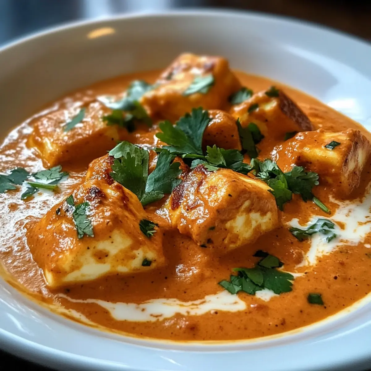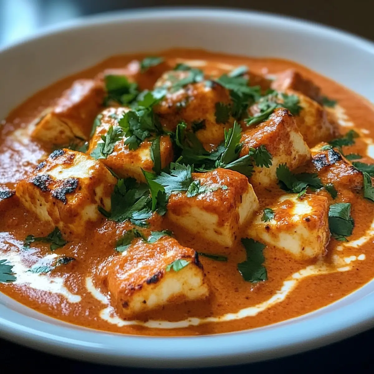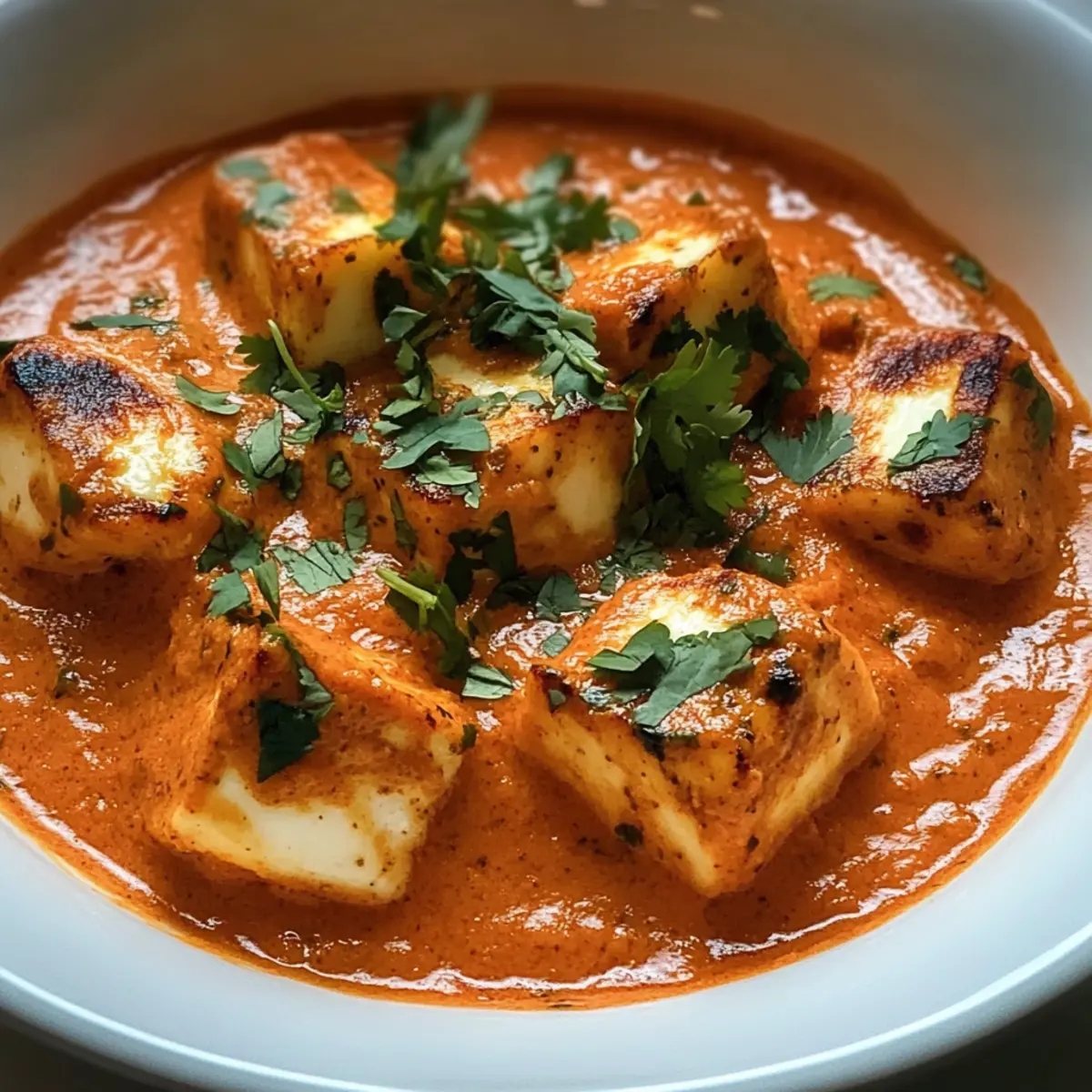 Wenn ich den ersten Biss von meinem Halloumi Makhani nehme, entfaltet sich eine Geschmacksexplosion, die mir das Gefühl gibt, ich sei in einem kleinen indischen Restaurant in einem belebten Markt. Diese köstliche, cremige Kombination aus vollmundiger Tomatensauce und dem herzhaften Halloumi-Käse bringt auf wunderbare Weise die Aromen der indischen Küche in mein Zuhause. Die Zubereitung dieses vegetarischen Gerichts ist nicht nur schnell und unkompliziert, sondern es zaubert auch ein Lächeln auf die Gesichter von Freunden und Familie. Perfekt für stressige Wochentage oder besondere Anlässe, überzeugt Halloumi Makhani mit seiner samtigen Textur und lockt selbst die wählerischsten Esser an den Tisch. Möchtest du wissen, wie du diese köstliche Fusion selbst nach Hause bringst? Warum wirst du dieses Rezept lieben? Einfachheit: Die Zubereitung ist denkbar einfach und benötigt keine besonderen Kochkünste – ein perfektes Gericht für Anfänger und Profis. Reiche Aromen: Die Kombination aus Gewürzen und cremiger Tomatensauce sorgt für einen unvergleichlich reichhaltigen Geschmack, der alle begeistert. Vielfältig: Halloumi Makhani lässt sich wunderbar abwandeln – probiere es mit Tofu oder serviere es über Quinoa für einen bunten Twist. Rasche Zubereitung: In weniger als 30 Minuten auf dem Tisch, ist es ideal für schnelle Wochentagsgerichte, die dennoch Eindruck machen. Gemütlich: Diese vegane Köstlichkeit bringt die Gemütlichkeit eines indischen Restaurants direkt in dein zuhause! Halloumi Makhani Zutaten • Hier sind die Zutaten, die du für dieses köstliche Halloumi Makhani Rezept benötigst: Für den Halloumi Halloumi-Käse – Verleiht dem Gericht einen herzhaften Geschmack; Paneer kann als Alternative verwendet werden. Öl (Pflanzenöl oder Ghee) – Zum Braten des Halloumi; jede Art von Kochöl funktioniert. Für die Sauce Zwiebel – Fügt Süße und Tiefe hinzu; fein gehackt für gleichmäßiges Garen. Knoblauch – Verstärkt den Geschmack; frischer, fein gehackter Knoblauch ist am besten. Frischer Ingwer – Bringt eine würzige Note; frisch geriebener Ingwer sorgt für ein intensives Aroma. Gemahlener Kreuzkümmel – Verleiht eine erdige Note; geriebener Koriander kann als Ersatz dienen, verändert jedoch den Geschmack. Gemahlener Koriander – Fügt citrusartige Noten hinzu, die das Gericht ausbalancieren. Garam Masala – Bietet eine Vielzahl traditioneller indischer Gewürze. Paprika – Fügt milde Schärfe und Farbe hinzu; für weniger Schärfe einfach reduzieren oder weglassen. Zerdrückte Tomaten – Bildet die Basis der Sauce; frische gewürfelte Tomaten können als Alternative genutzt werden. Schlagsahne – Sorgt für eine cremige Textur; kann für eine milchfreie Version durch Kokosmilch ersetzt werden. Zucker – Balanciert die Säure der Tomaten aus; kann weggelassen werden, wenn gewünscht. Salz und Pfeffer – Zum Abschmecken nach Geschmack. Frischer Koriander – Für die Garnierung, bringt Farbe und ein frisches Aroma. Schritt-für-Schritt-Anleitung für Halloumi Makhani Step 1: Halloumi vorbereiten Schneide den Halloumi-Käse in 2 cm große Würfel. Erhitze eine große Pfanne bei mittlerer bis hoher Hitze und füge etwas Öl hinzu. Brate die Halloumi-Würfel für etwa 5–7 Minuten, bis sie goldbraun und knusprig sind. Achte darauf, die Würfel regelmäßig zu wenden, damit sie gleichmäßig bräunen. Danach die gebratenen Halloumi-Stücke auf einen Teller legen und beiseite stellen. Step 2: Zwiebeln anbraten In der gleichen Pfanne, in der du den Halloumi gebraten hast, reduziere die Hitze auf mittel. Füge die fein gehackten Zwiebeln hinzu und brate sie für etwa 4–5 Minuten, bis sie weich und glasig sind. Rühre gelegentlich um, damit sie nicht anbrennen und eine süße, aromatische Basis für die Sauce bilden. Step 3: Knoblauch und Ingwer hinzufügen Füge den gehackten Knoblauch und den geriebenen Ingwer zu den Zwiebeln hinzu. Rühre alles gut um und lasse es für etwa 1 Minute anbraten, bis die Aromen freigesetzt werden und der Knoblauch leicht goldbraun ist. Achte darauf, dass der Knoblauch nicht anbrennt, da er sonst bitter werden kann. Step 4: Gewürze hinzufügen Streue den gemahlenen Kreuzkümmel, gemahlenen Koriander, Garam Masala und Paprika über die Zwiebelmischung. Röste die Gewürze für etwa 1–2 Minuten, während du ständig rührst. Diese kurze Röstzeit wird die Aromen intensivieren und die Grundlage für das köstliche Halloumi Makhani schaffen. Step 5: Tomaten einrühren Gieße die zerdrückten Tomaten in die Pfanne und rühre alles gut durch. Lasse die Mischung bei schwacher bis mittlerer Hitze für etwa 10 Minuten köcheln, bis die Sauce etwas eindickt und die Aromen sich entfalten. Während des Kochens leicht umrühren, damit nichts am Boden der Pfanne anhaftet. Step 6: Sahne hinzufügen Reduziere die Hitze auf niedrig und gieße die Schlagsahne unter ständigem Rühren in die Sauce. Lasse alles sanft köcheln für etwa 3–5 Minuten, bis die Sauce cremig wird. Achte darauf, dass die Hitze niedrig bleibt, um ein Gerinnen der Sahne zu verhindern. Step 7: Halloumi einarbeiten Füge die zuvor gebratenen Halloumi-Würfel vorsichtig in die Sauce ein und mische sie sanft unter. Lasse das Ganze für weitere 5 Minuten köcheln, damit der Halloumi die verwöhnenden Aromen des Halloumi Makhani aufnehmen kann. Der Käse sollte weiterhin seine Form behalten, aber schön saucig sein. Step 8: Abschmecken und Garnieren Schmecke das Halloumi Makhani mit Salz, Pfeffer und Zucker ab. Lasse die Aromen sich noch einmal für 2–3 Minuten entfalten. Vor dem Servieren mit frisch gehacktem Koriander garnieren, um dem Gericht einen frischen Duft und eine schöne Farbe zu verleihen. Was passt zu Halloumi Makhani? Halloumi Makhani bringt eine Symphonie aus Aromen auf den Teller und erfordert köstliche Begleiter, um ein perfektes Menü zu schaffen. Basmati-Reis: Leicht und luftig, absorbiert er die wunderbare Sauce und ergänzt die Gesc