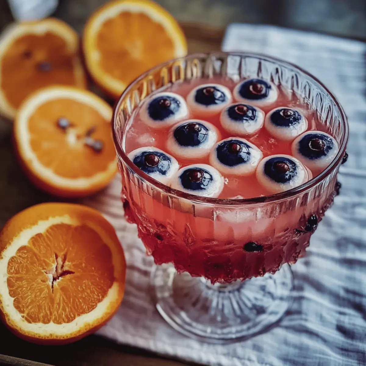 Die Halloween Bowle mit toten Augen ist ideal für stressfreies Vorbereiten! Du kannst die Fruchtbasis, bestehend aus Orangensaft, Campari und den geschnittenen Bio-Orangen und -Zitronen, bis zu 24 Stunden im Voraus mixen und im Kühlschrank kühlen, damit sich die Aromen gut entfalten. Die spooky „Augen“ aus Litschi und Heidelbeeren lassen sich ebenfalls bereits am Vortag zubereiten; einfach die Heidelbeeren in die Litschis stecken und im Kühlschrank aufbewahren, um die Frische zu erhalten. Am Tag der Feier musst du nur noch den Muskateller Frizzante sanft unterheben und die „Augen“ hinzufügen – so hast du im Handumdrehen ein bewundertes Getränk, das hervorragend schmeckt und deine Gäste begeistert!
