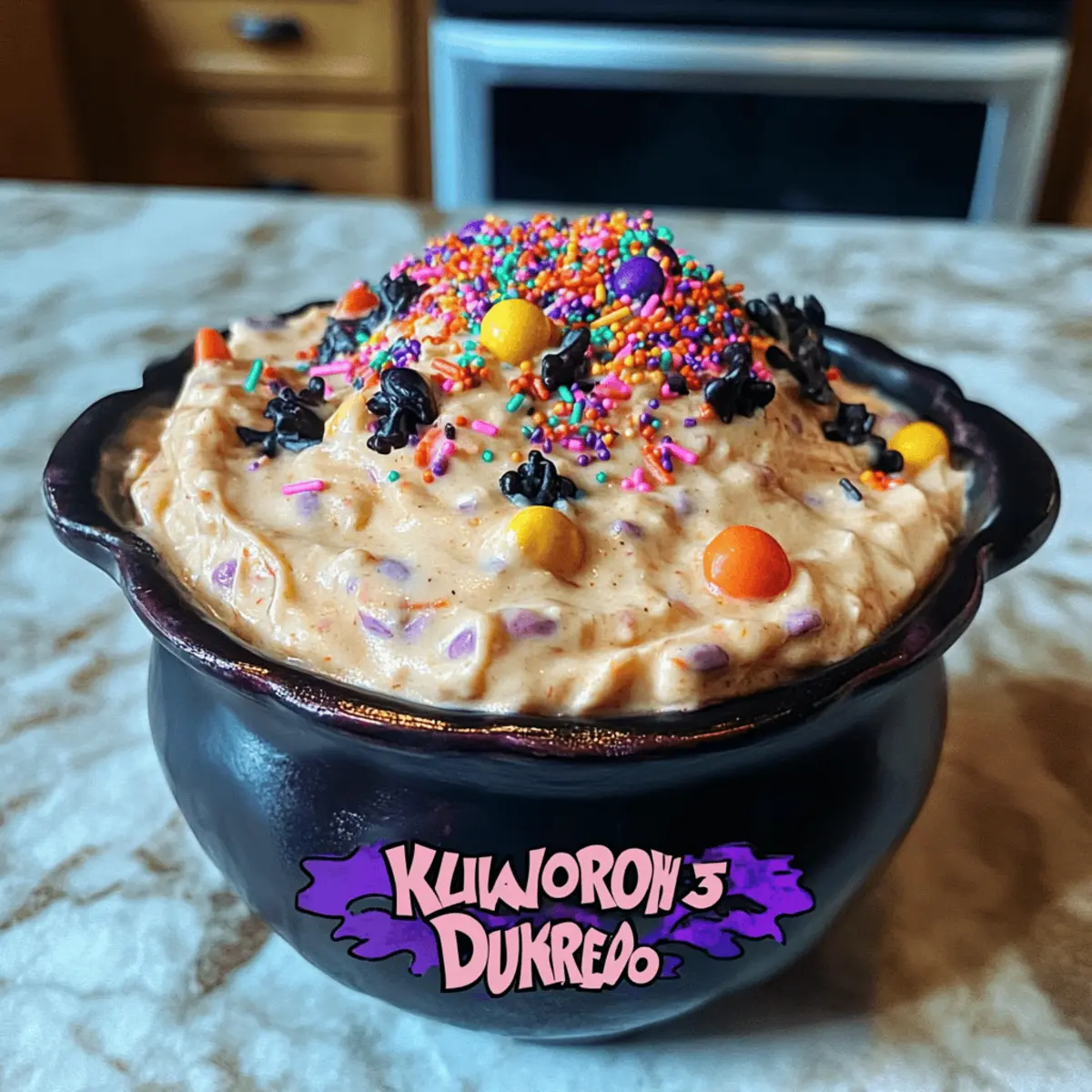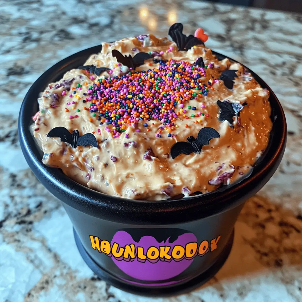5. Übertrage den Dip in eine Servierschüssel und dekoriere mit Halloween-Streuseln und Toppings.
