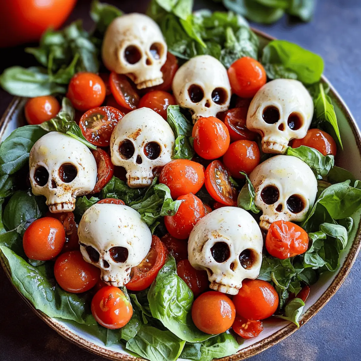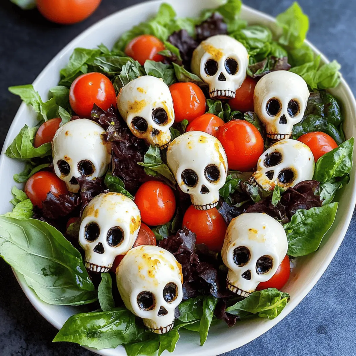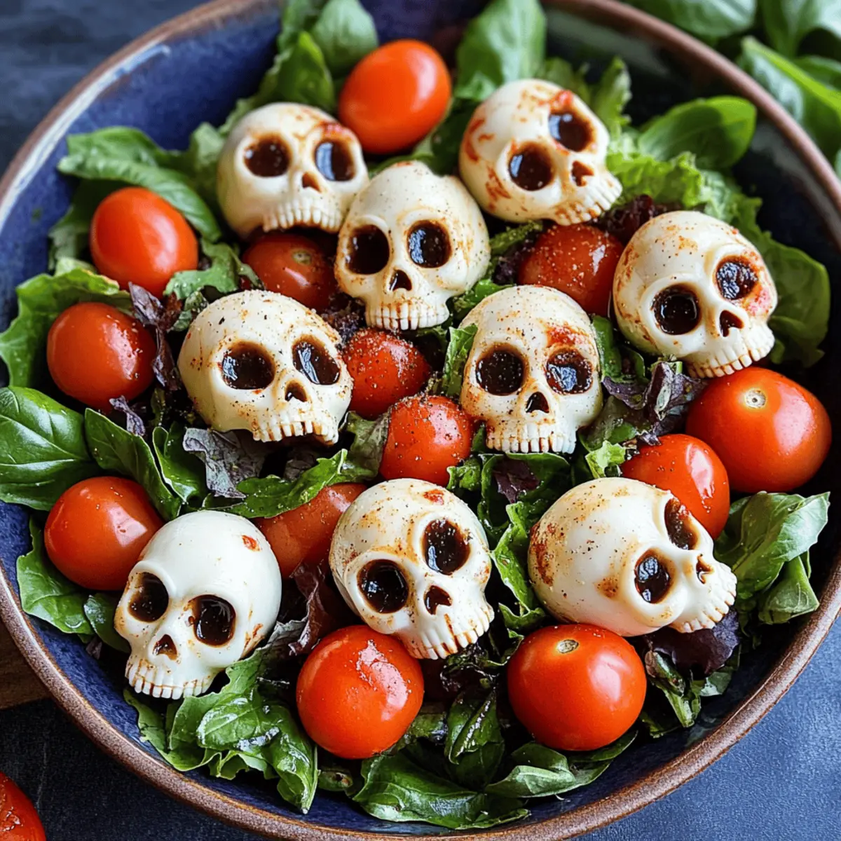 Als ich letzte Woche in den Supermarkt ging, fiel mein Blick sofort auf die leuchtenden Farben der Herbstgemüse und die vielen Kürbisse, die die Regale zierten. Diese Jahreszeit ist nicht nur perfekt für Kürbissuppe und schaurige Desserts, sondern auch für gesunde, kreative Gerichte wie meinen Halloween Salat. Mit frisch gepflückten Cherrytomaten, aromatischem Basilikum und den absolut entzückenden Mozzarella-Schädeln wird dieser Salat garantiert zum Highlight jeder Halloween-Feier. Er bietet nicht nur einen gesunden Genuss, sondern ist auch einfach zuzubereiten und eignet sich hervorragend für die ganze Familie. Wer hätte gedacht, dass ein Salat so viel Spaß machen kann? Lass uns gemeinsam in die schaurige Welt des kreativen Kochens eintauchen! Warum wird dieser Halloween Salat ein Hit? Einzigartig und spaßig: Der Halloween Salat begeistert mit seinen lustigen Mozzarella-Schädeln, die den klassischen Caprese-Twist perfekt ergänzen. Diese kreative Präsentation bringt Spaß auf den Tisch und ist bei Kindern und Erwachsenen gleichermaßen beliebt. Köstliche Frische: Mit frischen Cherrytomaten und aromatischem Basilikum verbindet dieses Rezept gesunde Zutaten und macht es einfach zu einem nährstoffreichen Highlight. Superschnell zubereitet: In wenigen Schritten hast du diesen Salat gezaubert! Ideal für die stressigen Vorbereitungen zu Halloween oder als schneller Snack. Vielseitig kombinierbar: Ob als Beilage oder Hauptgericht — dieser Salat lässt sich hervorragend mit gegrilltem Hähnchen oder Kichererbsen anpassen, um den Hunger zu stillen. Perfekte Partyoption: Du suchst nach einer schmackhaften Vorspeise für deine Halloween-Party? Dieser Salat ist nicht nur köstlich, sondern auch ein echter Augenschmaus! Halloween Salat Zutaten • Dieser Halloween Salat ist gesund und einfach zuzubereiten! Für die Mozzarella-Schädel Mozzarella-Bällchen – Sie bieten eine cremige Textur; alternative große Mozzarella-Kugel in Würfel schneiden. Für die Salatbasis Gemischte Salatblätter – Sorgen für Frische; Rucola oder Spinat sind großartige Alternativen. Süße Cherrytomaten – Fügen Süße und Farbe hinzu; bei Bedarf mit Traubentomaten ersetzen. Frischer Basilikum – Verleiht Aroma; kann durch Petersilie ersetzt werden, um einen neuen Geschmack zu kreieren. Für das Dressing Olivenöl – Bringt Reichtum und verbindet die Zutaten; ein hochwertiges Öl ist ideal, Avocadoöl ist eine milde Alternative. Balsamico-Glasur – Bietet Süße und Säure; für einen intensiveren Geschmack eine hausgemachte Reduktion von Balsamico-Essig ausprobieren. Flockiges Meersalz – Verstärkt den Geschmack; eventuell reguläres Salz verwenden, wenn nichts anderes vorhanden ist. Frisch gemahlener schwarzer Pfeffer – Für eine milde Schärfe; bei Vorliebe kann auch weißer Pfeffer verwendet werden. Zitrone (optional) – Fügt Helligkeit hinzu; kann weggelassen oder mit Limette ersetzt werden. Schritt-für-Schritt-Anleitung für den Halloween Salat mit Mozzarella-Schädeln Step 1: Mozzarella-Schädel vorbereiten Heize den Ofen auf 175°C vor. Fülle die Silikon-Schädel-Formen mit je einer Mozzarella-Bällchen. Backe sie etwa 6 Minuten lang, bis sie weich, aber nicht geschmolzen sind. Nimm sie heraus, drücke die Käse-Bällchen vorsichtig in die Form, um Details zu erzeugen, und stelle die Formen für 10-15 Minuten in den Kühlschrank, damit die Schädel fest werden. Step 2: Salatbasis zusammenstellen Nehme eine große Schüssel und gib die gemischten Salatblätter hinein. Träufele ein wenig Olivenöl sowie optional etwas Zitronensaft über die Blätter. Mische alles vorsichtig, bis die Blätter gleichmäßig mit dem Öl bedeckt sind und eine frische, glänzende Textur erhalten. Step 3: Toppings hinzufügen Schnappe dir die vorgebackenen Mozzarella-Schädel und die geschnittenen Cherrytomaten. Verteile die Tomaten gleichmäßig über den grünen Salat und platziere die Schädel ansprechend darauf. Um eine zusätzliche Geschmacksnote zu erzielen, füge noch etwas Olivenöl und Balsamico-Glasur hinzu. Step 4: Würzen und servieren Streue eine Prise flockiges Meersalz und frisch gemahlenen schwarzen Pfeffer über den Salat. Überprüfe den Geschmack und passe die Gewürze bei Bedarf an. Serviere den Halloween Salat sofort, um die Frische und die lebendigen Farben optimal zur Geltung zu bringen. Halloween Salat Variationen & Alternativen Kreiere deinen eigenen, schaurig-leckeren Halloween Salat und lasse deiner Kreativität freien Lauf! Proteinreich: Füge gegrilltes Hähnchen oder Kichererbsen hinzu, um den Salat nahrhafter zu gestalten. Diese Ergänzungen machen den Salat zu einer vollwertigen Mahlzeit. Käse-Variationen: Nutze Frischkäse oder Feta anstelle der Mozzarella-Schädel für einen würzigeren Geschmack. Feta bringt eine salzige Note, die köstlich zu den süßen Tomaten passt. Vegan: Ersetze die Mozzarella durch vegane Käsealternativen, um den Salat für pflanzliche Esser zugänglich zu machen. So bleibt der Salat ganz im Halloween-Geist, ohne auf Genuss zu verzichten. Crunchy: Integriere Nüsse oder geröstete Samen wie Sonnenblumenkerne für einen zusätzlichen Crunch. Diese knusprige Textur hebt den Salat auf das nächste Level. Würzig: Streue einige rote Pfefferflocken über den Salat, um ihm eine scharfe Note zu verleihen. Diese kleine Ergänzung sorgt für den richtigen Kick, ideal für Schärfeliebhaber! Fruchtig: Biete hinzu geschnittene Äpfel oder Birnen an, um eine süß-saure Komponente zu erhalten. Das süße, fruchtige Element harmoniert perfekt mit dem herzhafteren Käse und den Tomaten. Kräuter-Upgrade: Kombiniere die frischen Kräuter oder ergänze mit Minze für einen erfrischenden Twist. Minze bringt eine unerwartete Frische, die den Salat belebt. Denk daran, dass Variationen wie der gefüllte Hähnchensalat oder der Quinoa-Salat ebenfalls tolle Begleiter für deine Halloween-Feier sein können. Lass deiner Fantasie freien Lauf! Was passt gut zum Hall