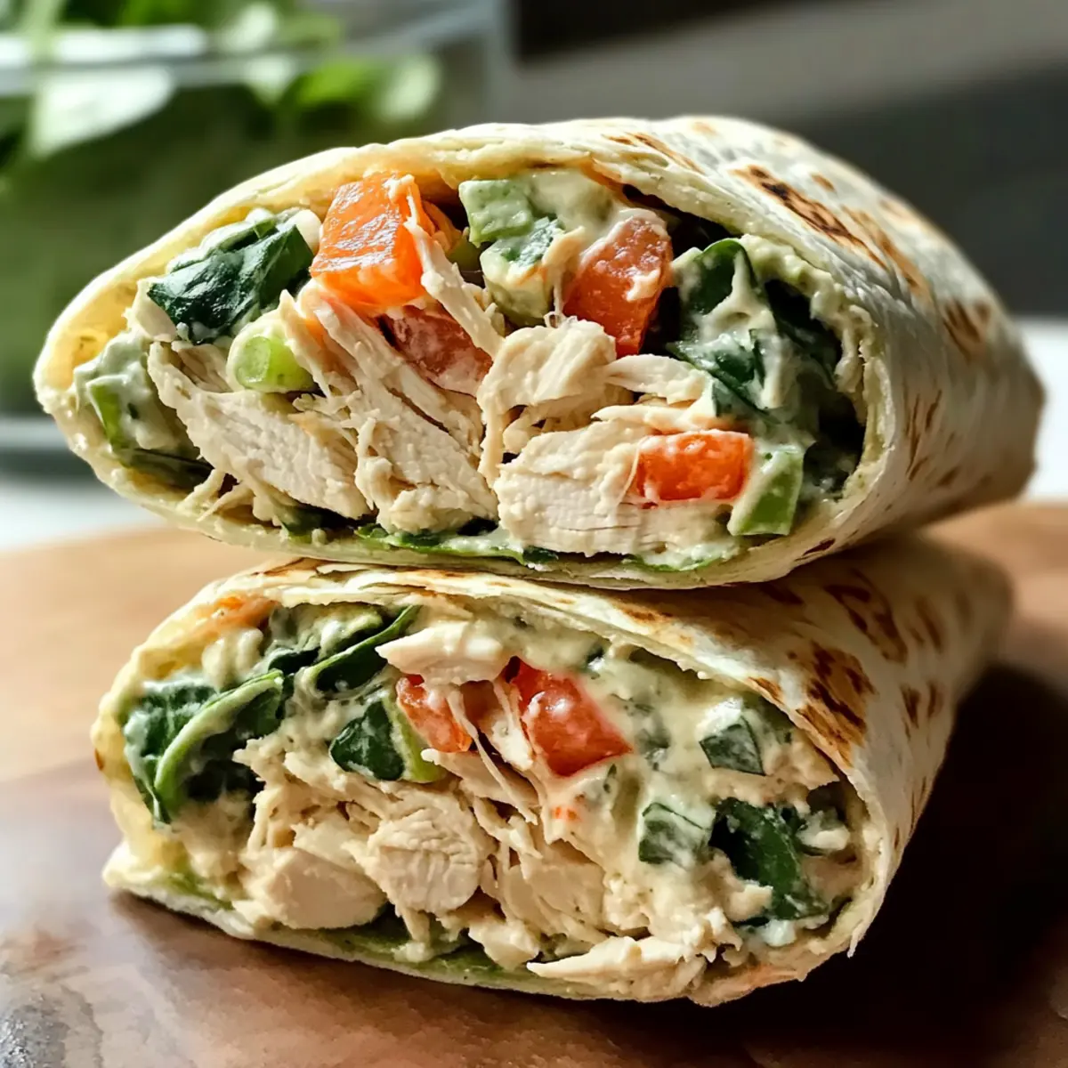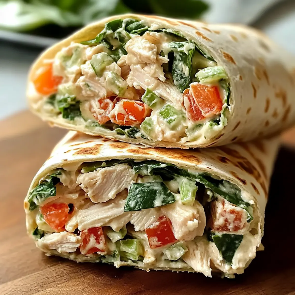 Stellt euch vor, ihr kommt nach einem langen Tag nach Hause und wollt etwas Schnelles, Gesundes und dennoch Heißgeliebtes auf den Tisch bringen. Herzhafte Hühnchen-Salat-Wraps für schnellen, gesunden Mittagsgenuss sind die Antwort auf euer Dilemma! Diese Wraps kombinieren zartes Hühnchen mit einem würzigen Joghurt-Mayo-Dressing und einer bunten Auswahl knuspriger Gemüse. Sie sind perfekt für die Mittagspause oder als Meal Prep – und das Beste: Ihr könnt sie ganz nach euren Vorlieben gestalten! Egal, ob man sich vegan ernährt, die mediterrane Variante ausprobieren oder ihm eine fruchtige Note verleihen möchte, der Kreativität sind keine Grenzen gesetzt. Ich kann es kaum erwarten, euch zu zeigen, wie ihr diese köstlichen Wraps zubereitet! Welche spannende Variation werdet ihr ausprobieren? Warum sind diese Wraps so beliebt? Gesundheit trifft Geschmack: Diese herzhaften Hühnchen-Salat-Wraps sind nicht nur köstlich, sondern auch gesund. Einfach zuzubereiten: Mit nur wenigen Zutaten und schnellen Schritten seid ihr im Handumdrehen fertig. Individualisierbar: Egal, ob ihr eine vegetarische Version oder eine fruchtige Abwandlung wählt, der Rezept kann leicht angepasst werden. Perfekt für Meal Prep: Bereitet die Füllung vor und genießt sie in den nächsten Tagen! Verlockend frisch: Mit knusprigem Gemüse und einer cremigen Sauce wird jeder Biss zum Erlebnis. Probiert sie auch in Kombination mit Schnellen Kasebrotchen für einen zusätzlichen Snack! Hühnchen-Salat-Wraps Zutaten • Für eurer Kochen, hier sind die Zutaten! Für den Salat Gekochtes Hühnchen – Zerkleinertes Brathühnchen oder pochiertes Hühnchen für eine gesunde Proteinquelle. Frühlingszwiebeln – Dünn geschnittene, grüne Teile sorgen für einen milden Zwiebelgeschmack. Naturjoghurt – Kann durch griechischen Joghurt ersetzt werden, um mehr Eiweiß zu erhalten. Dient als Basis für das Dressing. Mayonnaise – Wählt eure Lieblingsmarke für eine cremige Konsistenz im Dressing. Dijon-Senf – 1,5 TL für einen pikanten Akzent, gelber Senf kann auch verwendet werden. Karotte – ½ Karotte, fein geraspelt, bringt Crunch und Süße in den Salat. Spinat – 1,5 oz grob gehackt, liefert Nährstoffe und Farbe. Tomaten – 1 oz gewürfelt, verleiht Frische. Sellerie – 1 Stange, fein gewürfelt, für einen knackigen Biss. Zitrone (Zeste & Saft) – Schale und Saft von ½ Zitrone bringen Helligkeit ins Gericht. Parmesan-Käse – 1 oz, fein gerieben; kann für eine milchfreie Version weggelassen werden. Schwarzer Pfeffer – Eine Prise, nach Geschmack anpassen, um das Aroma zu verstärken. Getrockneter Dill – ½ TL; frischer Dill kann ebenfalls verwendet werden für ein frisches Aroma. Tortillas – 6 Mehl- oder Vollweizentortillas als Basis für die Wraps. Für optionale Variationen Mediterrane Version – Ersetzt die Mayonnaise durch Hummus und fügt Oliven oder Feta hinzu. Vegetarische Option – Nutzt Kichererbsen anstelle von Hühnchen für eine köstliche Alternative. Fruchtige Note – Integriert gewürfelte Äpfel oder Trauben für eine süße Abwechslung. Würzige Variante – Diced Jalapeños oder scharfe Sauce hinzufügen für einen Kick. Nussiger Crunch – Slivered Mandeln oder Walnüsse für zusätzliche Textur einfügen. Kräuterboost – Frische Kräuter wie Basilikum oder Koriander hinzufügen für mehr Geschmack. Currypulver – Mische Currypulver für eine einzigartige Geschmacksrichtung. Diese herzhafte Hühnchen-Salat-Wraps sind ein wahrhaft gesundes und köstliches Erlebnis! Schritt-für-Schritt-Anleitung für Herzhafte Hühnchen-Salat-Wraps für schnellen, gesunden Mittagsgenuss Step 1: Gemüse vorbereiten Zuerst das Gemüse für die herzhafte Hühnchen-Salat-Wraps vorbereiten. Sellerie und Tomaten fein würfeln, die Frühlingszwiebeln in dünne Ringe schneiden, die Karotte fein raspeln und den Spinat grob hacken. Zum Schluss die Zeste der Zitrone abreiben, um dem Salat eine frische Note zu verleihen. Bereitet alles auf einem Schneidebrett vor, damit ihr einen perfekten Überblick habt. Step 2: Dressing anrühren In einer großen Schüssel den Naturjoghurt, die Mayonnaise und den Dijon-Senf glatt verrühren. Mit einem Schneebesen für etwa 1–2 Minuten kräftig umrühren, bis eine cremige Konsistenz erreicht ist. Danach den Zitronensaft, den Dill, den schwarzen Pfeffer und den Parmesan hinzufügen und alles gut vermischen. Das Dressing sollte gleichmäßig und gut verbunden sein. Step 3: Hühnchen und Gemüse kombinieren Nun das zerkleinerte Hühnchen und das vorbereitete Gemüse vorsichtig in die Dressing-Mischung geben. Mit einem Spatel sanft unterheben, bis alles gut durchmischt ist. Achte darauf, dass das Gemüse gleichmäßig verteilt ist und der Salat nicht zu stark zerdrückt wird. Der Salat sollte jetzt eine wunderbar cremige Textur aufweisen. Step 4: Tortillas erwärmen Heize eine Pfanne auf mittlerer Stufe oder verwende die Mikrowelle, um die Tortillas leicht zu erwärmen. Lege sie für 15–30 Sekunden in die Mikrowelle oder in die Pfanne, bis sie weich und biegsam sind. Dieser Schritt ist wichtig, damit die Tortillas sich beim Wickeln nicht brechen und eine schöne, geschmeidige Textur haben. Step 5: Wraps zusammenstellen Lege jeweils eine Tortilla flach auf die Arbeitsfläche. Platziere etwa 1 bis 1,5 Tassen der Hühnchen-Salat-Mischung leicht seitlich auf der Tortilla. Klappe die Seiten ein und rolle die Tortilla dann straff auf, sodass eine schöne, kompakte Form entsteht. Achte darauf, dass die Füllung nicht herausquillt, während du die Tortilla rollst. Step 6: Optionales Toasten Falls gewünscht, die Rollen in einer Pfanne bei mittlerer Hitze für 1-2 Minuten auf jeder Seite toasten, bis sie goldbraun sind. Dies verleiht den Wraps einen knusprigen Biss und verstärkt die Aromen. Regelmäßig wenden, um ein Anbrennen zu vermeiden. Diese Option macht die selbstgemachten herzhafte Hühnchen-Salat-Wraps noch köstlicher! Step 7: Servieren und genießen Die herzhaften