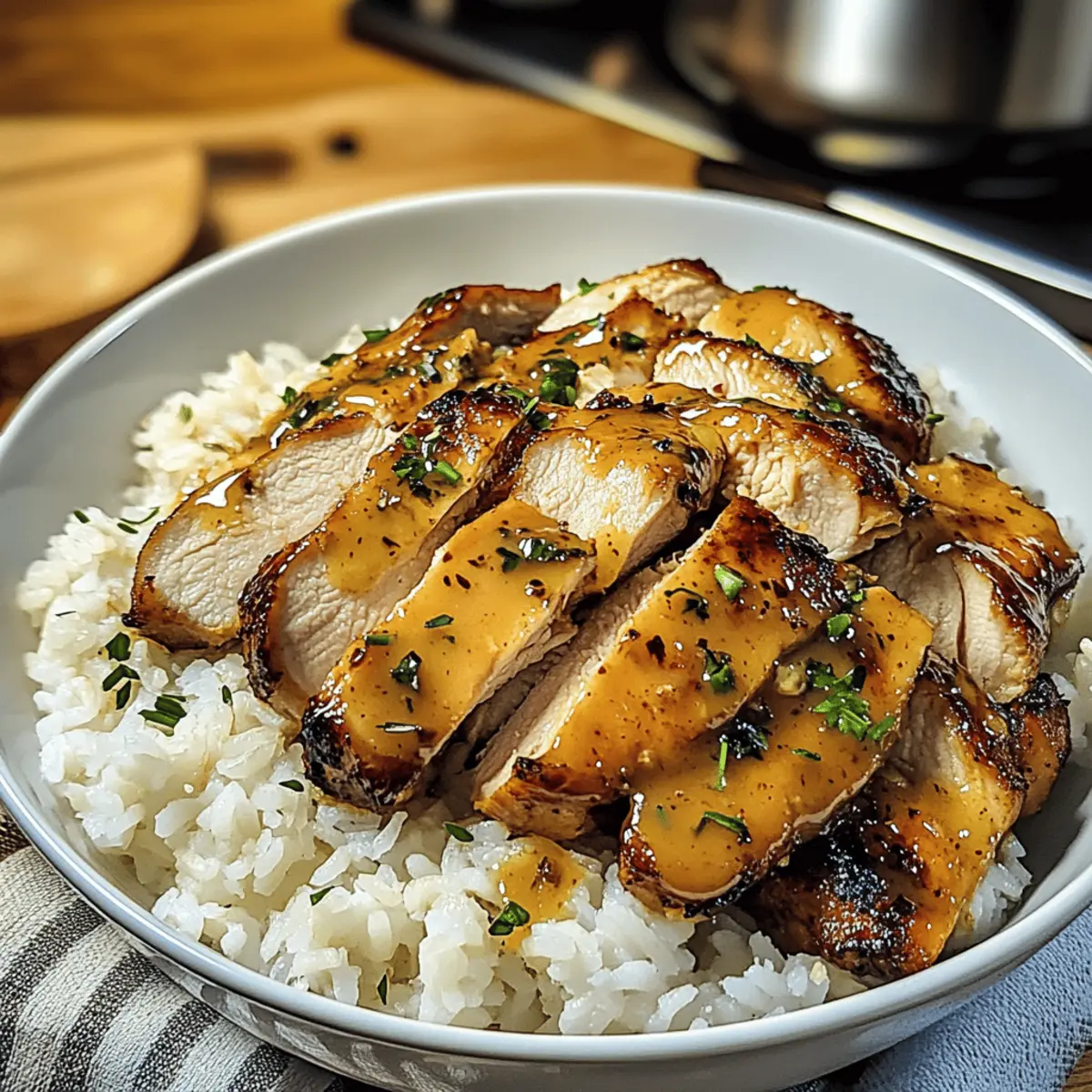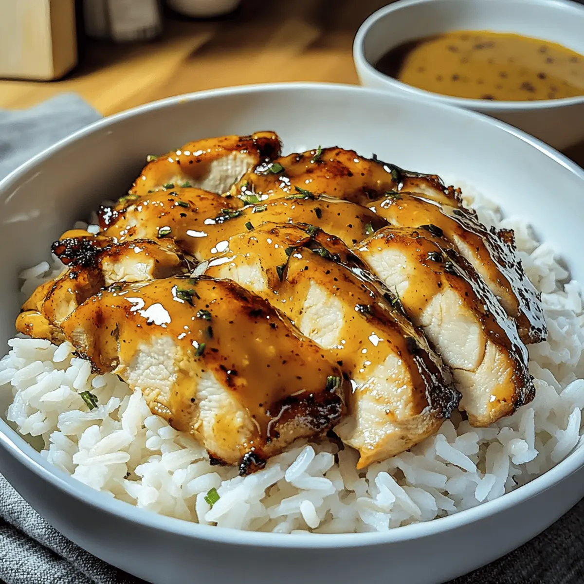 Ein köstliches und schnelles Gericht, das Hähnchen mit einer süßen Honig-Senf-Glasur kombiniert und perfekt mit Reis serviert wird.