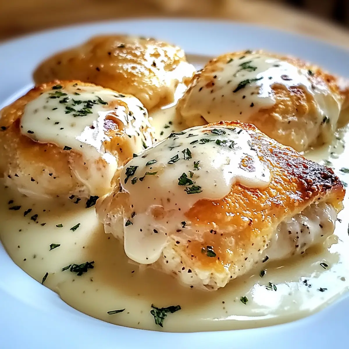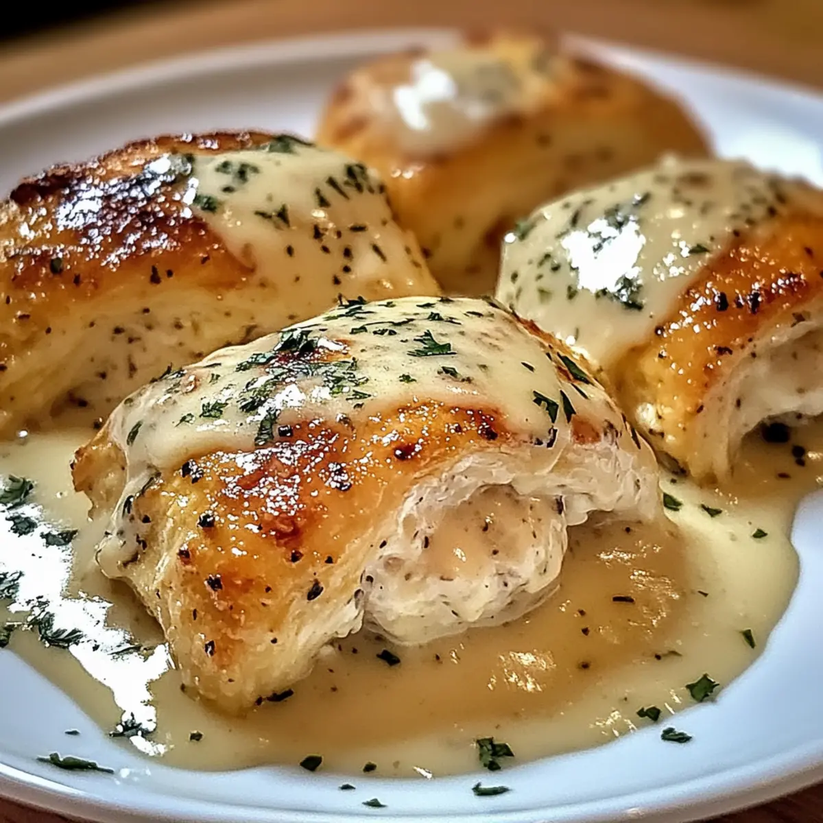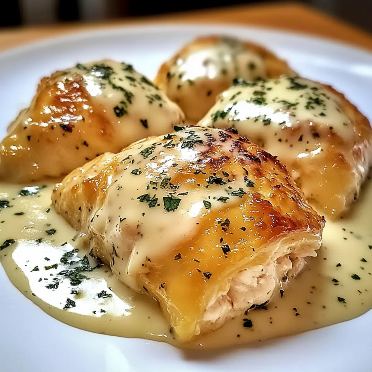 Wenn ich in meine Küche gehe, wird es sofort aufregend—die Vorstellung, dass ich gleich etwas Leckeres zaubern kann, bringt ein Lächeln auf mein Gesicht. Heute teile ich mit euch ein Rezept für Hühnchenkissen mit cremiger Parmesansoße, das nicht nur super lecker, sondern auch schnell zuzubereiten ist. Die warmen, goldbraunen Kissen, gefüllt mit einer unwiderstehlichen, käsigen Mischung, sind der Inbegriff von Komfortessen und eine perfekte Wahl für geschäftige Wochentage. Mit jedem Bissen erwarten euch knuspriger Teig und die reiche, cremige Sauce, die eure Familie garantiert lieben wird. Das Beste daran? Ihr könnt die Füllung ganz nach eurem Geschmack anpassen! Seid ihr bereit, eure Küche in ein kleines Restaurant zu verwandeln? Warum wirst du dieses Rezept lieben? Einfachheit, die begeistert: Die Zubereitung der Hühnchenkissen ist denkbar einfach und erfordert keine besonderen Kochkünste – ideal für jeden, der schnell ein köstliches Gericht zaubern möchte. Reiche, herzliche Aromen: Die cremige Füllung, kombiniert mit dem Geschmack von Parmesan, sorgt für ein Geschmackserlebnis, das jeden Bissen zu einem Genuss macht. Vielseitigkeit: Ob mit frischem Spinat oder scharfen Jalapeños – dieses Rezept kann nach Belieben angepasst werden, um den persönlichen Vorlieben gerecht zu werden. Schnell & praktisch: Diese Hühnchenkissen sind ein perfektes Gericht für geschäftige Wochentage; einfach vorbereiten und in kürzester Zeit fertigstellen. Entdeckt auch Tipps zur Aufbewahrung und Zubereitung im Voraus, damit ihr immer ein köstliches Gericht zur Hand habt, indem ihr eure Füllung ganz nach Belieben anpasst. Familienfreundlich: Jeder in der Familie wird diese Hühnchenkissen lieben, und sie sind ideal, um kleine, wählerische Esser zu überzeugen! Hühnchenkissen mit cremiger Parmesansoße Zutaten • Für die Füllung: Gekochtes Hühnchen – sorgt für das Hauptprotein; kann auch durch Rotisserie-Hühnchen ersetzt werden, um Zeit zu sparen. Frischkäse – sorgt für die cremige Konsistenz und bindet die Füllung; kann durch Mascarpone für eine leichtere Variante ersetzt werden. Geriebener Cheddarkäse – bietet Geschmack und Reichhaltigkeit; probiert Mozzarella für eine andere Geschmacksnote. Knoblauchpulver – liefert eine herzhafte Tiefe; frisch gehackter Knoblauch ist eine großartige Alternative für mehr Geschmack. Zwiebelpulver – fügt subtile Süße hinzu; frisch gehackte Zwiebeln können ebenfalls verwendet werden. Getrocknete Petersilie – verleiht der Füllung einen frischen Kräutergeschmack; frische Petersilie kann noch mehr Frische hinzufügen. Crescent-Roll-Teig – bildet die äußere Schicht; kann durch Blätterteig ersetzt werden, wenn gewünscht. • Für die Sauce: Schlagsahne – sorgt für eine reichhaltige Sauce; halb und halb kann die Sauce leichter machen. Geriebener Parmesan – bringt einen scharfen, käsigen Geschmack in die Sauce; Pecorino Romano kann ebenfalls verwendet werden, um eine andere Schärfe zu erreichen. Salz und Pfeffer – essentielles Gewürz zur Geschmackssteigerung; nach persönlichem Geschmack anpassen. • Für die Garnitur: Frische Petersilie (zum Garnieren) – verleiht eine schöne Farbe und Frische; optional, aber verbessert die Präsentation. Schritt-für-Schritt-Anleitung für Hühnchenkissen mit cremiger Parmesansoße Step 1: Ofen vorheizen Heizt euren Ofen auf 190 °C (375 °F) vor und fettiert ein Backblech leicht mit etwas Öl oder Butter, damit die Hühnchenkissen nicht ankleben. Während der Ofen aufheizt, könnt ihr die Füllung vorbereiten, damit alles flott geht. Step 2: Füllung zubereiten In einer großen Schüssel vermischt ihr das gekochte Hühnchen, den Frischkäse, den geriebenen Cheddar, das Knoblauchpulver, das Zwiebelpulver sowie die getrocknete Petersilie. Mit Salz und Pfeffer würzen und alles gut durchrühren, bis eine cremige und homogene Masse entsteht. Step 3: Teig vorbereiten Legt den Crescent-Roll-Teig auf eine bemehlte Arbeitsfläche und rollt ihn vorsichtig aus. Trennt den Teig in gleichmäßige Dreiecke auf. Diese werden später die Kissen formen, also sorgt dafür, dass sie gleichmäßig sind, um eine schöne Form zu erhalten. Step 4: Füllung einfüllen Nehmt einen Esslöffel der Hühnchenfüllung und platziert ihn am breiten Ende jedes Teigdreiecks. Achtet darauf, nicht zu viel Füllung zu verwenden, um ein Überlaufen zu vermeiden. Somit könnt ihr sicherstellen, dass die Hühnchenkissen später gut zusammenhalten. Step 5: Kissen rollen Beginnt, die Teigstücke vom breiten Ende bis zur Spitze hin aufzurollen. Drückt die Ränder gut zusammen, um die Füllung dicht zu verschließen. Dies ist wichtig, damit während des Backens nichts ausläuft und eure Hühnchenkissen ihre Form behalten. Step 6: Kissen anordnen Platziert die gerollten Hühnchenkissen auf dem vorbereiteten Backblech und lasst genügend Platz zwischen ihnen, damit sie beim Backen nicht aneinanderkleben. Die Kissen sollten gleichmäßig verteilt sein, um eine optimale Hitzeverteilung zu gewährleisten. Step 7: Backen Backt die Hühnchenkissen für 20-25 Minuten im vorgeheizten Ofen, bis sie goldbraun und knusprig sind. Ein schöner, goldfarbener Farbton zeigt an, dass sie fertig sind. Der Duft wird sicherlich eure Vorfreude steigern! Step 8: Sauce zubereiten Während die Kissen backen, erhitzt ihr in einem kleinen Topf die Schlagsahne und den geriebenen Parmesan bei mittlerer Hitze. Rührt, bis die Sauce glatt und cremig ist, und schmeckt sie mit Salz und Pfeffer ab. Lasst die Sauce sanft köcheln, während ihr die Kissen aus dem Ofen holt. Step 9: Anrichten Nachdem die Hühnchenkissen fertig gebacken sind, lasst sie etwa 5 Minuten abkühlen, bevor ihr sie anrichtet. Beträufelt sie mit der warmen Parmesansauce und garniert sie nach Belieben mit frischer Petersilie. Dies verleiht nicht nur Geschmack, sondern auch eine schöne Präsentation. Aufbewahrungstipps für Hühnchenkissen mit cremiger Parmesansoße Ra